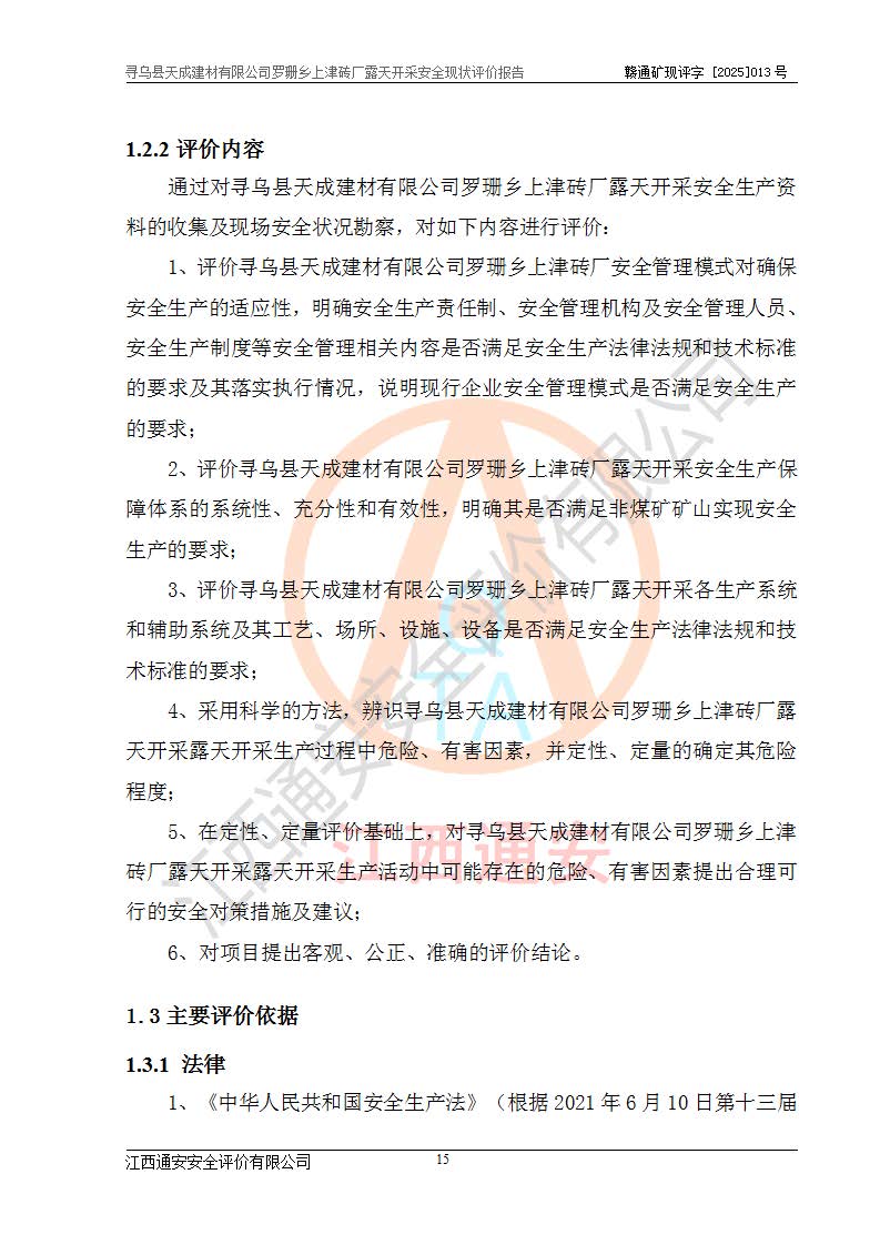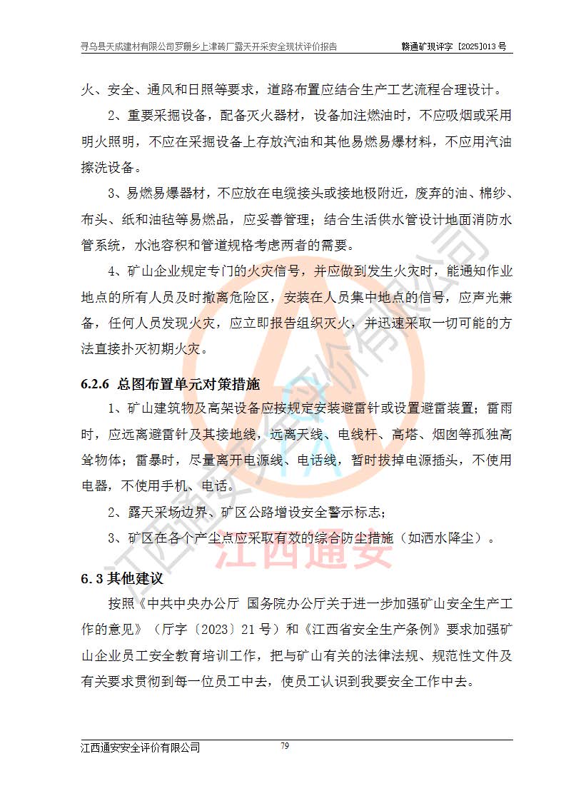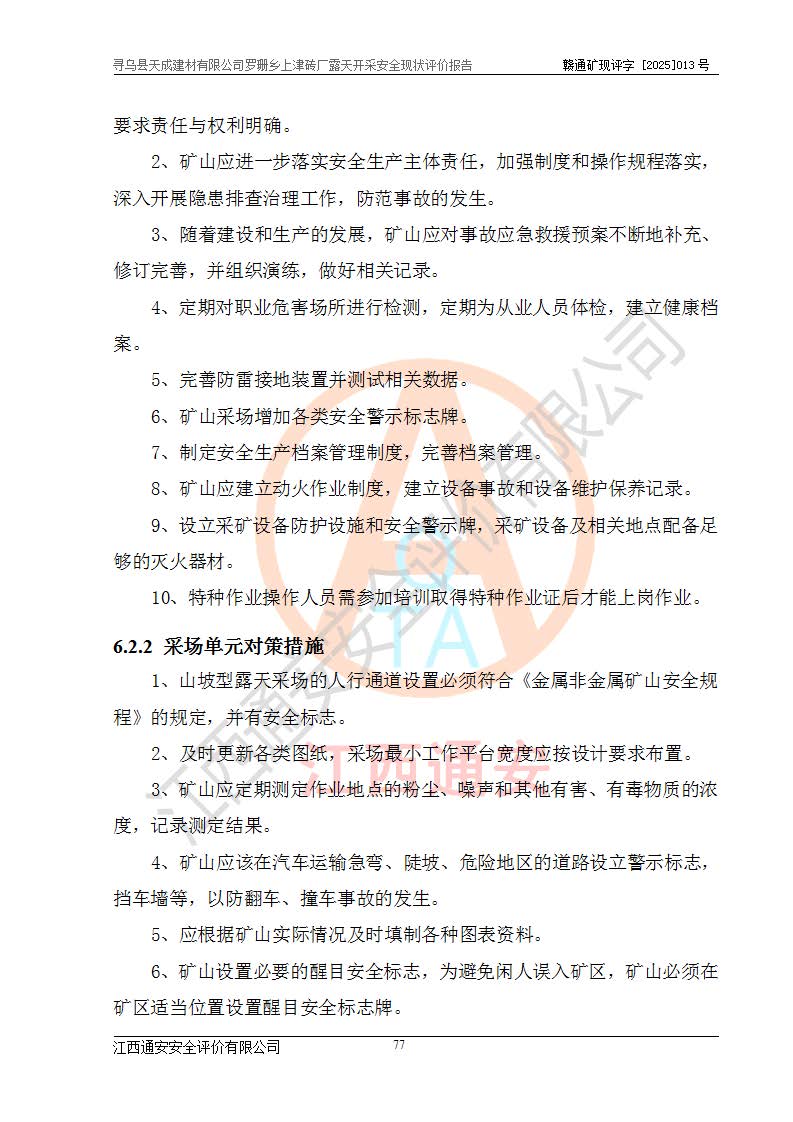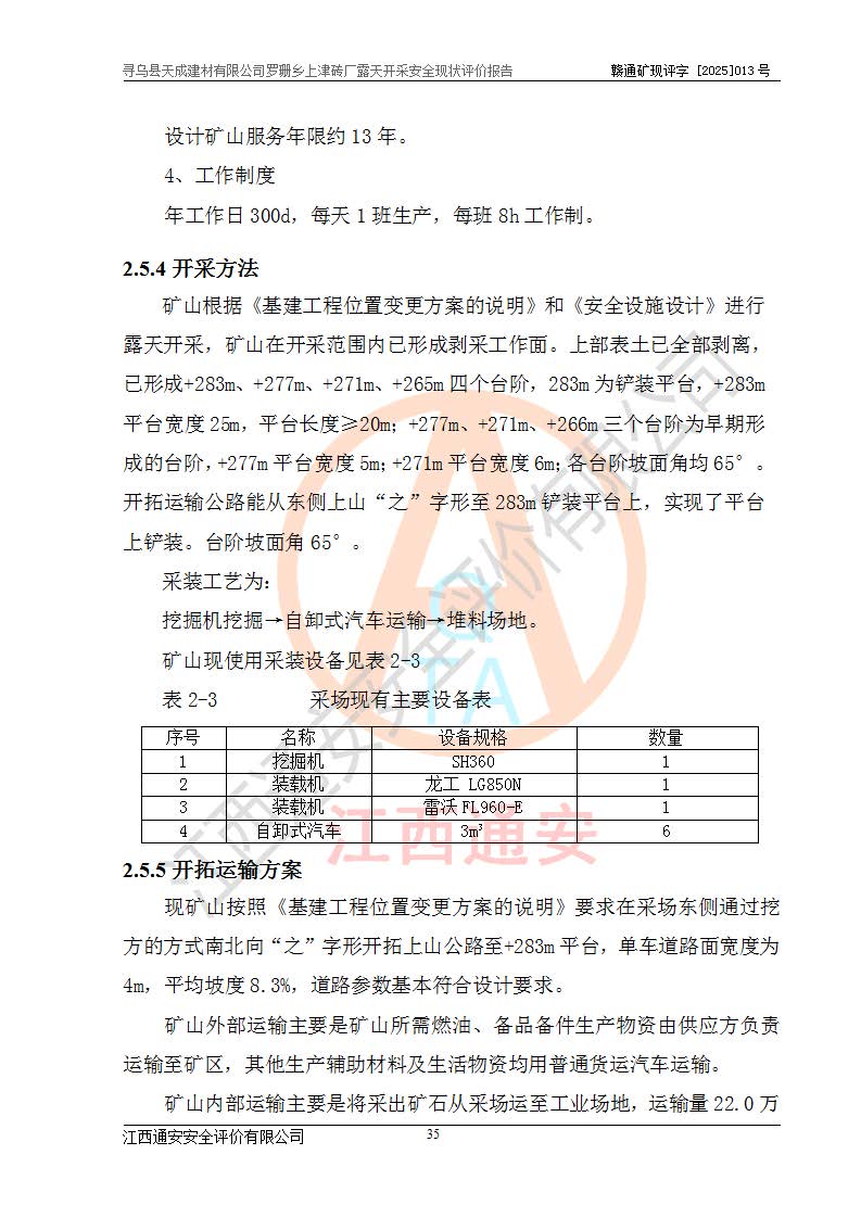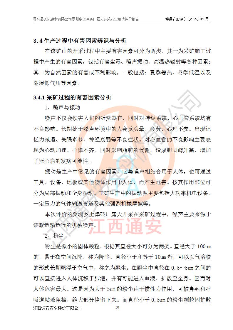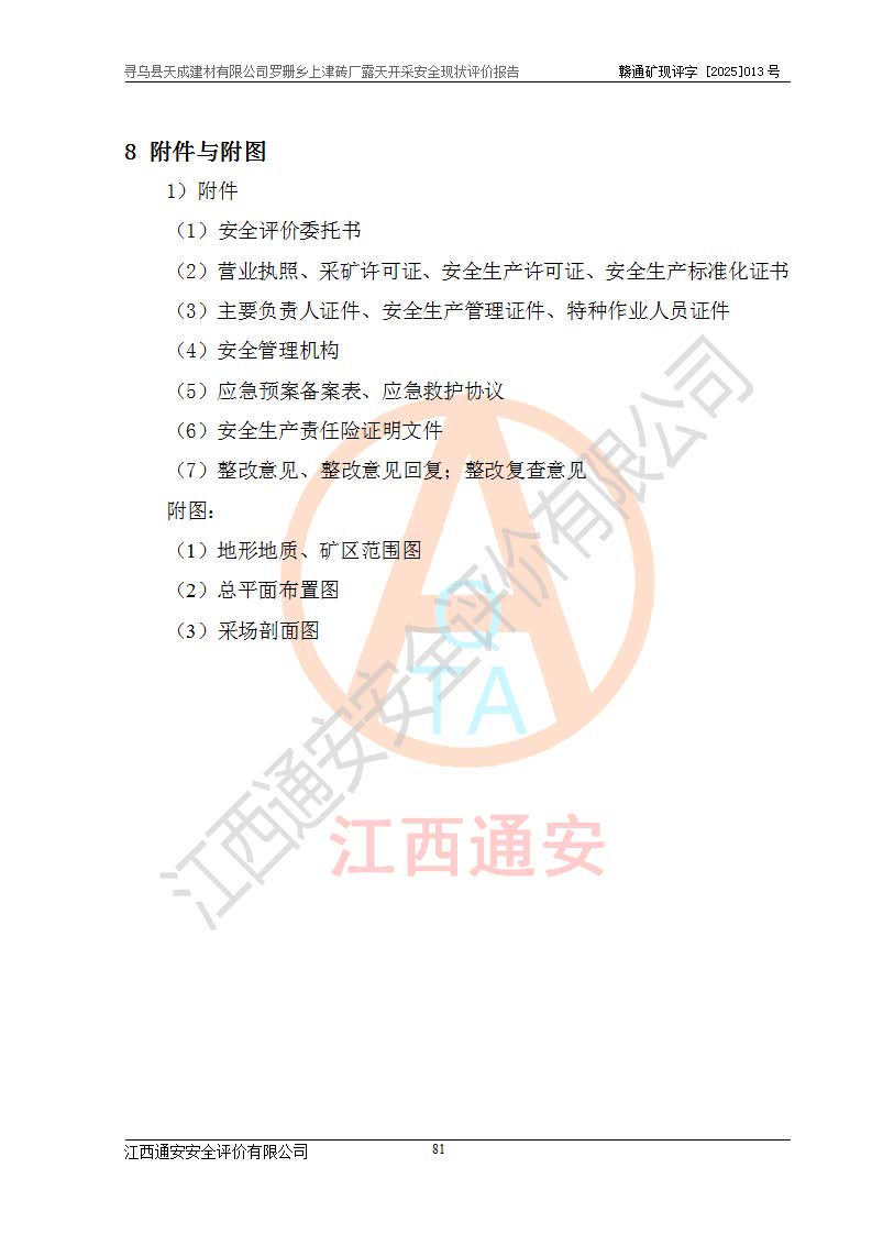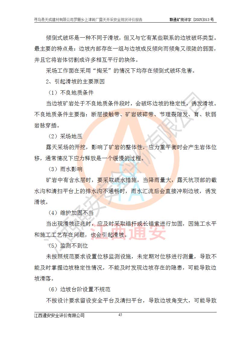 尋烏縣天成建材有限公司羅珊鄉(xiāng)上津磚廠是尋烏縣天成建材有限公司下屬露天開采頁巖礦山,礦區(qū)位于尋烏縣縣城31°方位,直線距離約28**,屬尋烏縣羅珊鄉(xiāng)上津村行政管轄。礦區(qū)中心地理坐標(biāo)范圍為東經(jīng):115°46′52″~115°47′09″,北緯: 25°09′30″~25°09′41″。 尋烏縣天成建材有限公司注冊地在尋烏縣長寧鎮(zhèn)城北長安大道,法定**人林盛煌,統(tǒng)一社會(huì)信用代碼:91360734MA37TDN68P。 2019年12月07日,江西博元礦業(yè)技術(shù)服務(wù)有限公司編制了《尋烏縣羅珊鄉(xiāng)上津磚廠磚瓦用頁巖礦資源儲量核實(shí)報(bào)告》。2020年1月江西省地礦資源勘查開發(fā)有限公司編制了《尋烏縣天成建材有限公司羅珊鄉(xiāng)上津磚廠礦山礦產(chǎn)資源開發(fā)利用、地質(zhì)環(huán)境恢復(fù)治理與土地復(fù)墾方案》。 2021年1月礦山委托遼寧時(shí)越市政工程設(shè)計(jì)有限公司編制了《尋烏縣天成建材有限公司羅珊鄉(xiāng)上津磚廠露天開采項(xiàng)目初步設(shè)計(jì)》及《尋烏縣天成建材有限公司羅珊鄉(xiāng)上津磚廠露天開采項(xiàng)目安全設(shè)施設(shè)計(jì)》,該礦《安全設(shè)施設(shè)計(jì)》由尋烏縣應(yīng)急管理局組織評審并通過,準(zhǔn)予礦山進(jìn)行建設(shè)。礦山在準(zhǔn)備按照《安全設(shè)施設(shè)計(jì)》基建時(shí),因?yàn)樾枰饔玫V區(qū)內(nèi)+290m標(biāo)高以上的林地,尋烏縣天成建材有限公司即向縣主管部門提交了林地征用申請報(bào)告,但由于辦理林地征用的程序復(fù)雜,延續(xù)的時(shí)間較長,未能及時(shí)獲得林地征用批復(fù)。為延續(xù)生產(chǎn),及時(shí)組織基建工程施工,尋烏縣天成建材有限公司經(jīng)認(rèn)真研究后,決定變更《尋烏縣天成建材有限公司羅珊鄉(xiāng)上津磚廠露天開采項(xiàng)目安全設(shè)施設(shè)計(jì)》中的基建工程施工位置,委托原設(shè)計(jì)單位編制了《尋烏縣天成建材有限公司羅珊鄉(xiāng)上津磚廠露天開采項(xiàng)目基建工程位置變更方案》。變更的內(nèi)容有:+315m剝離平臺、+308m首采平臺及運(yùn)輸公路。變更后將剝離、首采平臺設(shè)置在+283m平臺。運(yùn)輸公路由采區(qū)西側(cè)265m至315m變更為采區(qū)東側(cè)273m至283m。 2021年6月,尋烏縣天成建材有限公司羅珊鄉(xiāng)上津磚廠露天開采項(xiàng)目通過露天開采安全設(shè)施驗(yàn)收。2021年7月14日,礦山取得了贛州市行政審批局頒發(fā)的安全生產(chǎn)許可證,編號:(贛)FM安許證字[2021]B0029號,贛市行審證(3)字[2021]第251號。單位名稱:尋烏縣天成建材有限公司羅珊鄉(xiāng)上津磚廠露天開采,主要負(fù)責(zé)人:曾進(jìn)斌,單位地址:羅珊鄉(xiāng)上津村,經(jīng)濟(jì)類型:有限責(zé)任公司,許可范圍:磚瓦用頁巖露天開采。**期:2021年7月14日至2024年7月13日。2024年6月由于采礦許可證和安全生產(chǎn)許可證先后到期,礦山停產(chǎn)至今。 2025年6月26日取得尋烏縣自然資源局換發(fā)的采礦許可證號,證號:C3607342014037130133465,礦區(qū)面積為0.105km2,生產(chǎn)規(guī)模22.00萬噸/年,開采深度:由+315m~+265m標(biāo)高,礦區(qū)由5個(gè)拐點(diǎn)圈定。**期至2033年10月28日。 尋烏縣天成建材有限公司羅珊鄉(xiāng)上津磚廠采用山坡露天開采方式,水平臺階自上而下分臺階開采,挖掘機(jī)直接挖掘取土、自卸汽車運(yùn)礦。 根據(jù)《安全生產(chǎn)法》、《礦山安全法》、《安全生產(chǎn)許可證條例》、《非煤礦礦山企業(yè)安全生產(chǎn)許可證實(shí)施辦法》和原江西省安全生產(chǎn)監(jiān)督管理局《關(guān)于做好非煤礦礦山企業(yè)安全生產(chǎn)許可證延期換證工作的通知》的要求,尋烏縣天成建材有限公司委托江西通安安全評價(jià)有限公司對羅珊鄉(xiāng)上津磚廠露天開采進(jìn)行安全現(xiàn)狀評價(jià)。 |