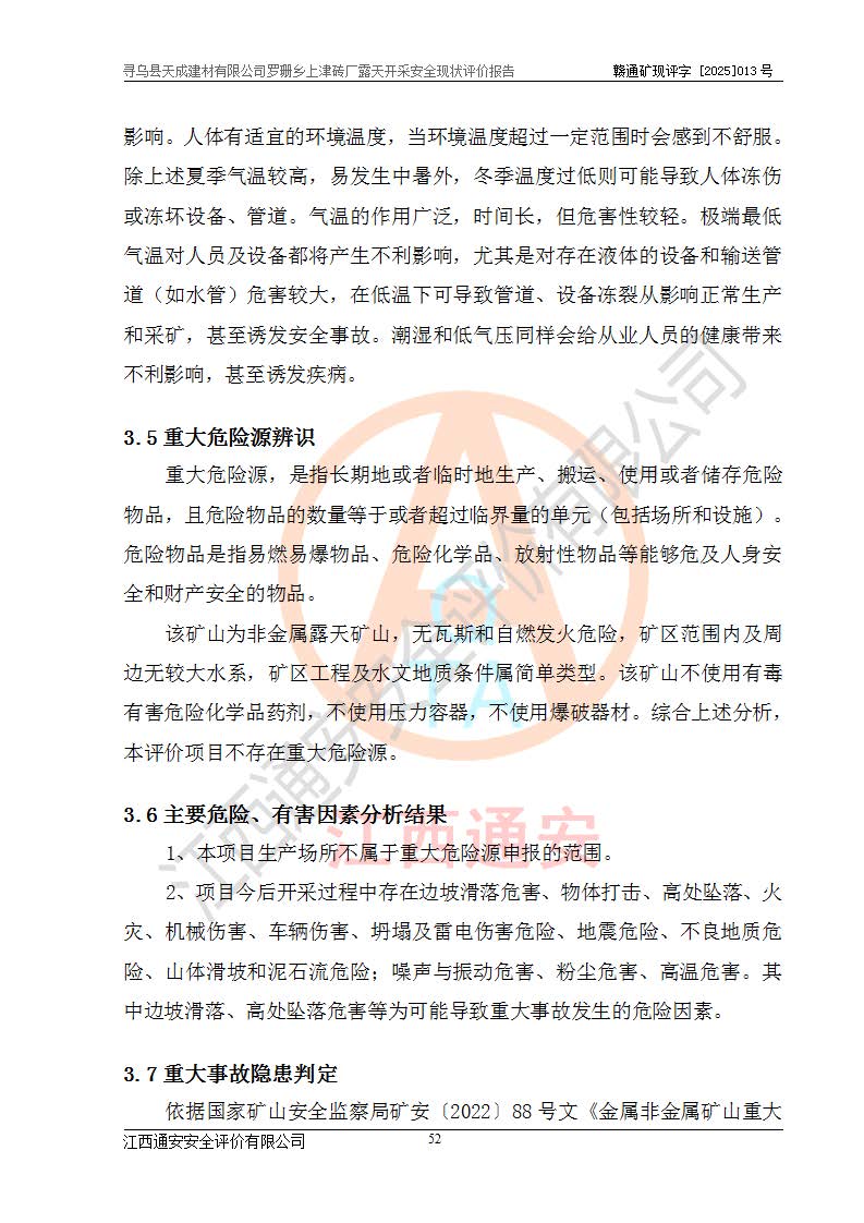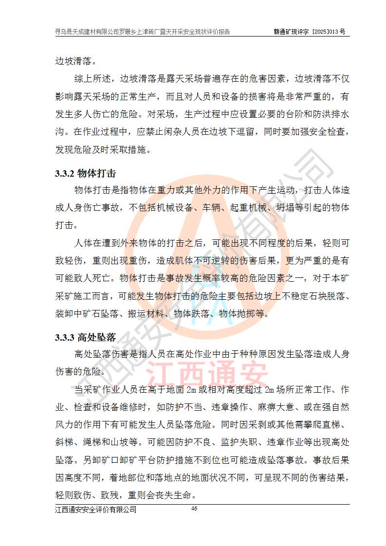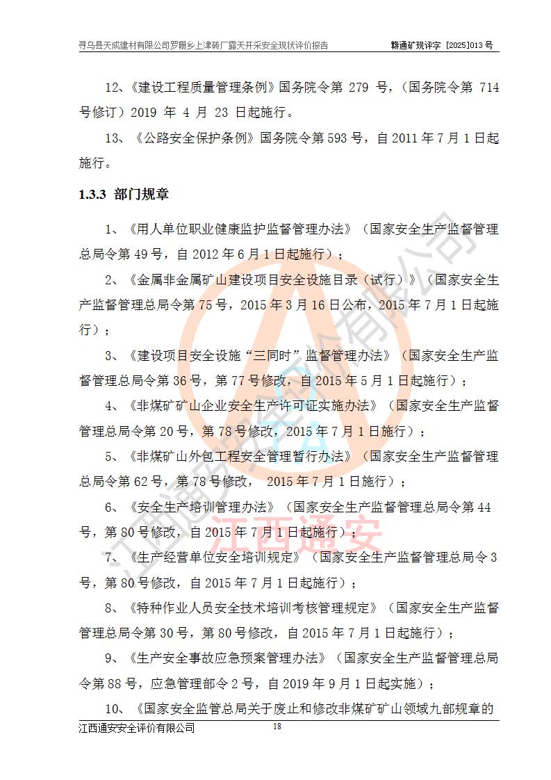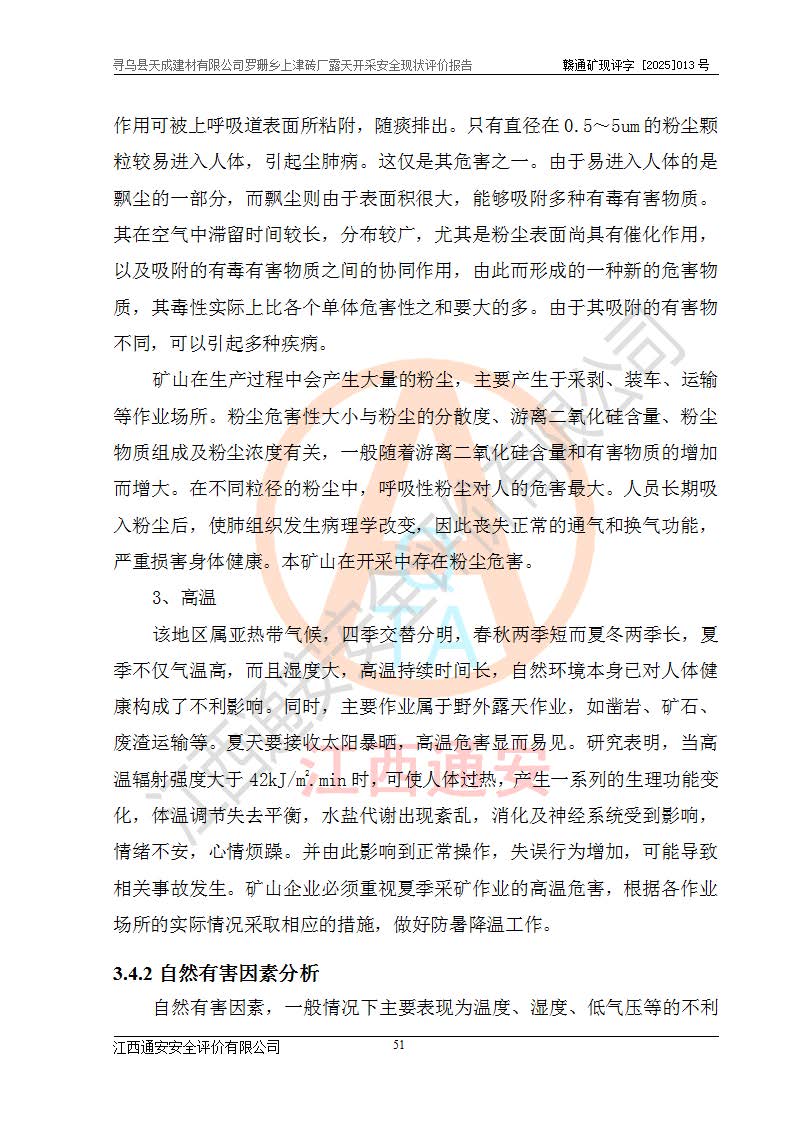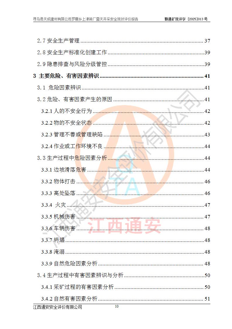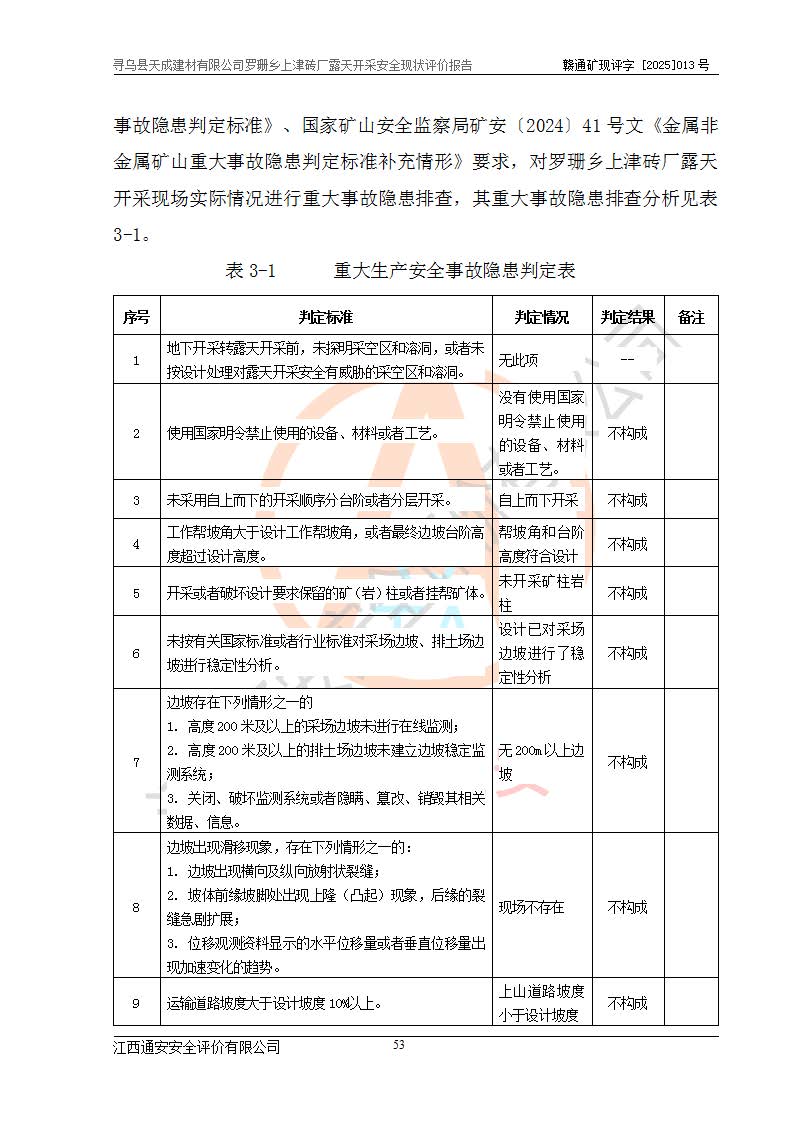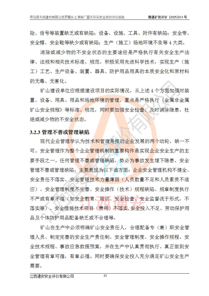 尋烏縣天成建材有限公司羅珊鄉(xiāng)上津磚廠是尋烏縣天成建材有限公司下屬露天開采頁巖礦山,礦區(qū)位于尋烏縣縣城31°方位,直線距離約28**,屬尋烏縣羅珊鄉(xiāng)上津村行政管轄。礦區(qū)中心地理坐標(biāo)范圍為東經(jīng):115°46′52″~115°47′09″,北緯: 25°09′30″~25°09′41″。 尋烏縣天成建材有限公司注冊地在尋烏縣長寧鎮(zhèn)城北長安大道,法定**人林盛煌,統(tǒng)一社會(huì)信用代碼:91360734MA37TDN68P。 2019年12月07日,江西博元礦業(yè)技術(shù)服務(wù)有限公司編制了《尋烏縣羅珊鄉(xiāng)上津磚廠磚瓦用頁巖礦資源儲量核實(shí)報(bào)告》。2020年1月江西省地礦資源勘查開發(fā)有限公司編制了《尋烏縣天成建材有限公司羅珊鄉(xiāng)上津磚廠礦山礦產(chǎn)資源開發(fā)利用、地質(zhì)環(huán)境恢復(fù)治理與土地復(fù)墾方案》。 2021年1月礦山委托遼寧時(shí)越市政工程設(shè)計(jì)有限公司編制了《尋烏縣天成建材有限公司羅珊鄉(xiāng)上津磚廠露天開采項(xiàng)目初步設(shè)計(jì)》及《尋烏縣天成建材有限公司羅珊鄉(xiāng)上津磚廠露天開采項(xiàng)目安全設(shè)施設(shè)計(jì)》,該礦《安全設(shè)施設(shè)計(jì)》由尋烏縣應(yīng)急管理局組織評審并通過,準(zhǔn)予礦山進(jìn)行建設(shè)。礦山在準(zhǔn)備按照《安全設(shè)施設(shè)計(jì)》基建時(shí),因?yàn)樾枰饔玫V區(qū)內(nèi)+290m標(biāo)高以上的林地,尋烏縣天成建材有限公司即向縣主管部門提交了林地征用申請報(bào)告,但由于辦理林地征用的程序復(fù)雜,延續(xù)的時(shí)間較長,未能及時(shí)獲得林地征用批復(fù)。為延續(xù)生產(chǎn),及時(shí)組織基建工程施工,尋烏縣天成建材有限公司經(jīng)認(rèn)真研究后,決定變更《尋烏縣天成建材有限公司羅珊鄉(xiāng)上津磚廠露天開采項(xiàng)目安全設(shè)施設(shè)計(jì)》中的基建工程施工位置,委托原設(shè)計(jì)單位編制了《尋烏縣天成建材有限公司羅珊鄉(xiāng)上津磚廠露天開采項(xiàng)目基建工程位置變更方案》。變更的內(nèi)容有:+315m剝離平臺、+308m首采平臺及運(yùn)輸公路。變更后將剝離、首采平臺設(shè)置在+283m平臺。運(yùn)輸公路由采區(qū)西側(cè)265m至315m變更為采區(qū)東側(cè)273m至283m。 2021年6月,尋烏縣天成建材有限公司羅珊鄉(xiāng)上津磚廠露天開采項(xiàng)目通過露天開采安全設(shè)施驗(yàn)收。2021年7月14日,礦山取得了贛州市行政審批局頒發(fā)的安全生產(chǎn)許可證,編號:(贛)FM安許證字[2021]B0029號,贛市行審證(3)字[2021]第251號。單位名稱:尋烏縣天成建材有限公司羅珊鄉(xiāng)上津磚廠露天開采,主要負(fù)責(zé)人:曾進(jìn)斌,單位地址:羅珊鄉(xiāng)上津村,經(jīng)濟(jì)類型:有限責(zé)任公司,許可范圍:磚瓦用頁巖露天開采。**期:2021年7月14日至2024年7月13日。2024年6月由于采礦許可證和安全生產(chǎn)許可證先后到期,礦山停產(chǎn)至今。 2025年6月26日取得尋烏縣自然資源局換發(fā)的采礦許可證號,證號:C3607342014037130133465,礦區(qū)面積為0.105km2,生產(chǎn)規(guī)模22.00萬噸/年,開采深度:由+315m~+265m標(biāo)高,礦區(qū)由5個(gè)拐點(diǎn)圈定。**期至2033年10月28日。 尋烏縣天成建材有限公司羅珊鄉(xiāng)上津磚廠采用山坡露天開采方式,水平臺階自上而下分臺階開采,挖掘機(jī)直接挖掘取土、自卸汽車運(yùn)礦。 根據(jù)《安全生產(chǎn)法》、《礦山安全法》、《安全生產(chǎn)許可證條例》、《非煤礦礦山企業(yè)安全生產(chǎn)許可證實(shí)施辦法》和原江西省安全生產(chǎn)監(jiān)督管理局《關(guān)于做好非煤礦礦山企業(yè)安全生產(chǎn)許可證延期換證工作的通知》的要求,尋烏縣天成建材有限公司委托江西通安安全評價(jià)有限公司對羅珊鄉(xiāng)上津磚廠露天開采進(jìn)行安全現(xiàn)狀評價(jià)。 |