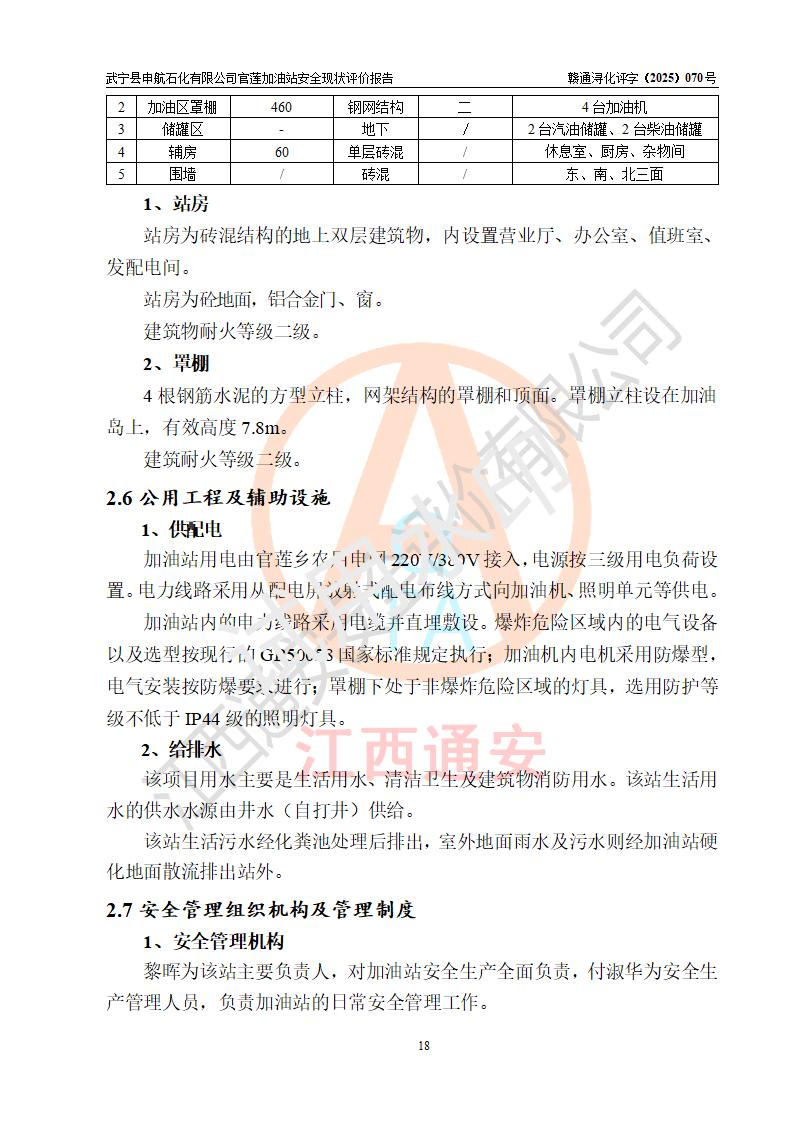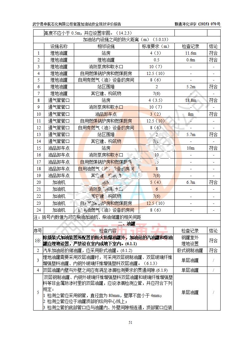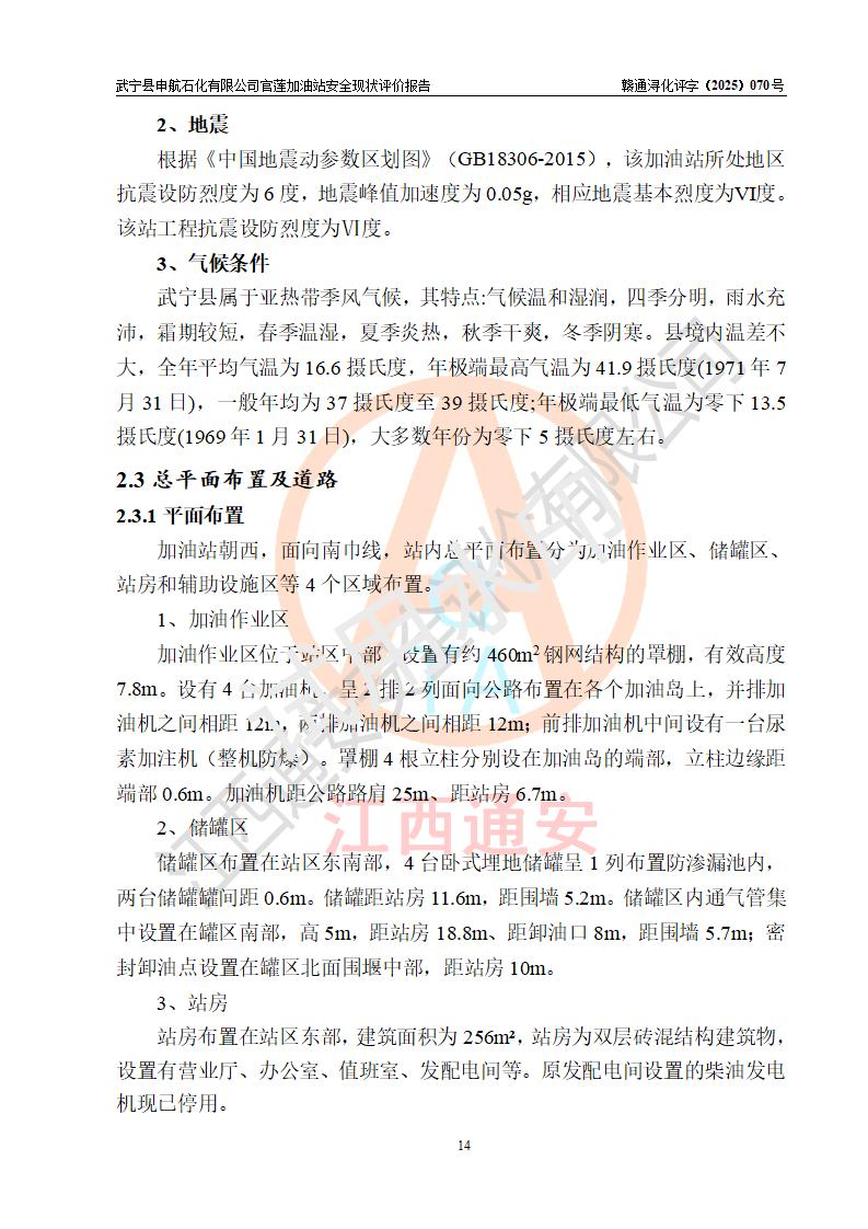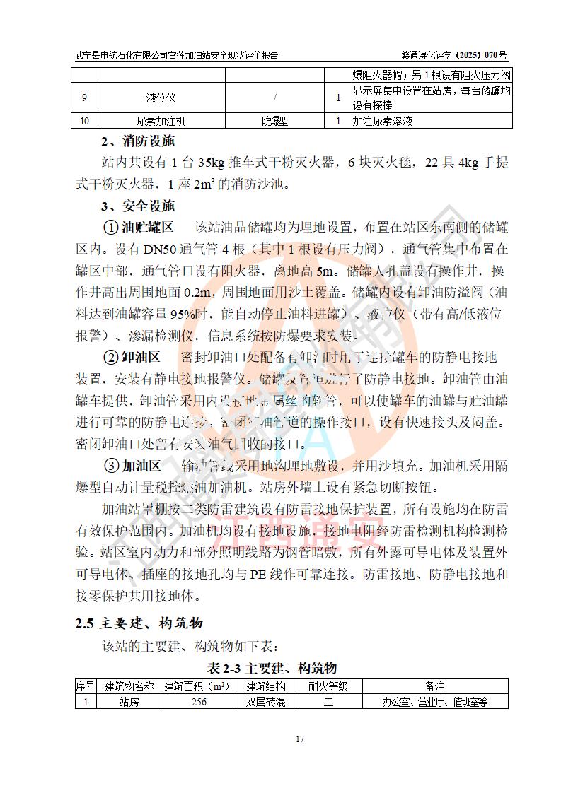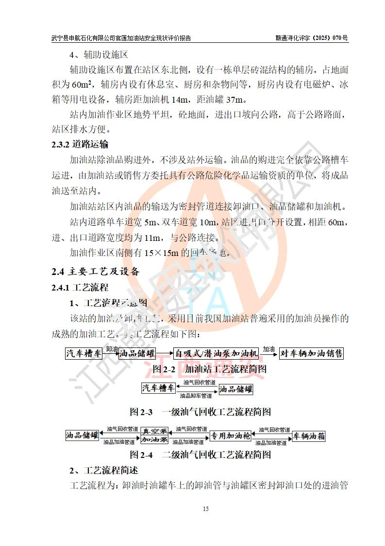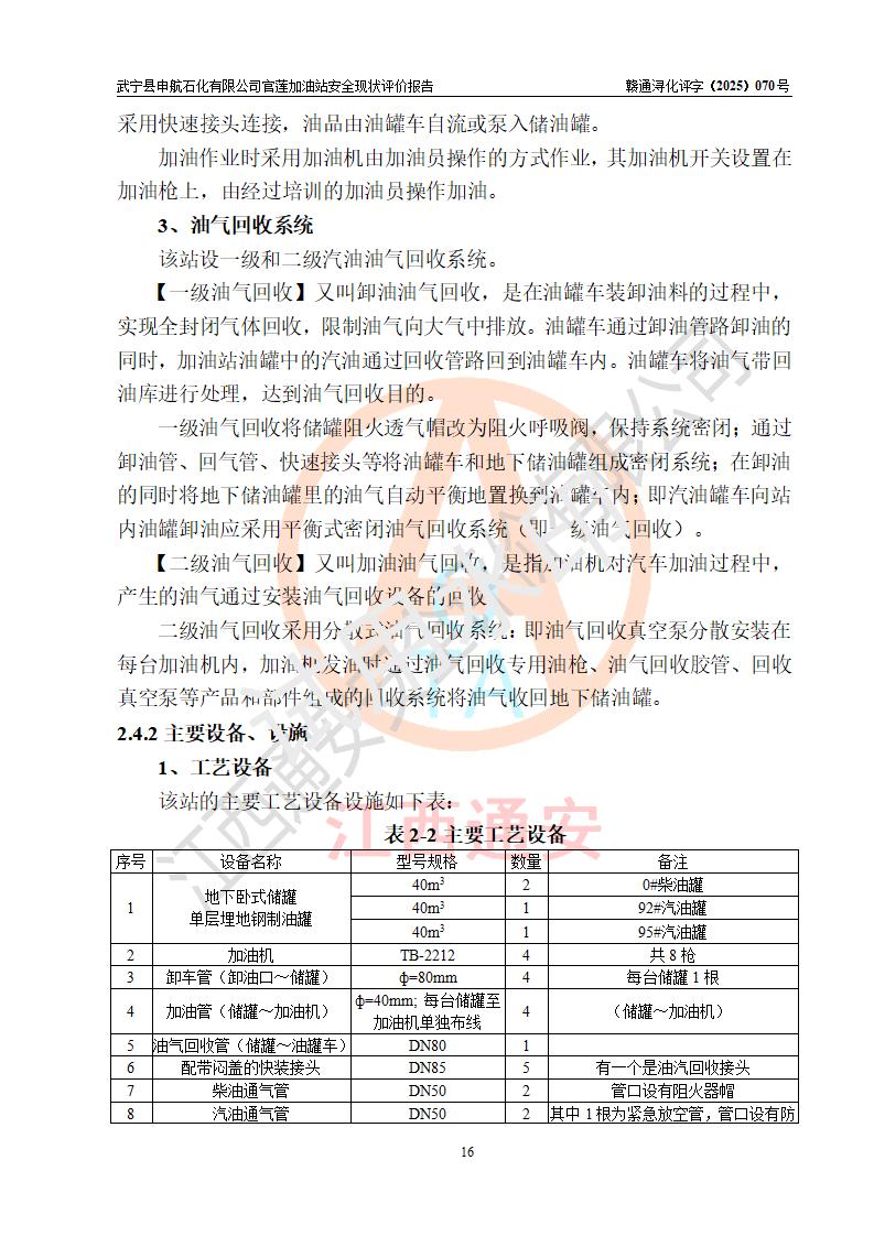 項(xiàng)目簡介 | 武寧縣申航石化有限公司官蓮加油站是一家專門從事成品油零售經(jīng)營的有限責(zé)任公司分公司,經(jīng)營場所位于江西省九江市武寧縣官蓮鄉(xiāng)集鎮(zhèn)。現(xiàn)有從業(yè)人員9名,其中安全管理人員1人,加油站負(fù)責(zé)人黎暉。 該加油站占地面積約2280m2,站區(qū)內(nèi)設(shè)置有4臺(tái)雙槍程控燃油加油機(jī)及配套的工藝管線、設(shè)有單層儲(chǔ)罐4臺(tái)(設(shè)有防滲罐池),其中40m3的0#柴油儲(chǔ)罐2臺(tái)、40m3的92#汽油儲(chǔ)罐1臺(tái),40m3的95#汽油儲(chǔ)罐1臺(tái),油品儲(chǔ)罐總?cè)莘e為160m3(折算成汽油為120m3),按現(xiàn)行《汽車加油加氣加氫站技術(shù)標(biāo)準(zhǔn)》對加油站的等級(jí)劃分原則,屬二級(jí)加油站。 該站由九江市行政審批局換發(fā)《危險(xiǎn)化學(xué)品經(jīng)營許可證》(證號(hào):36040013202500003),**期限2022年12月19日至2025年12月18日。 | |||