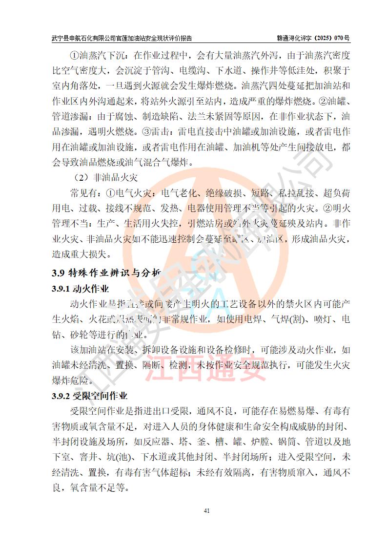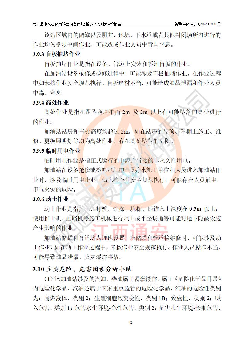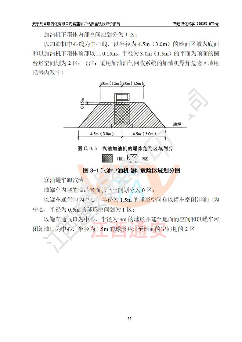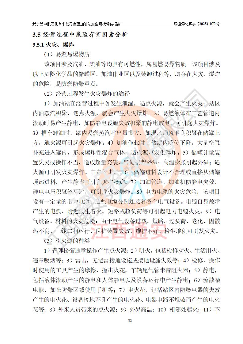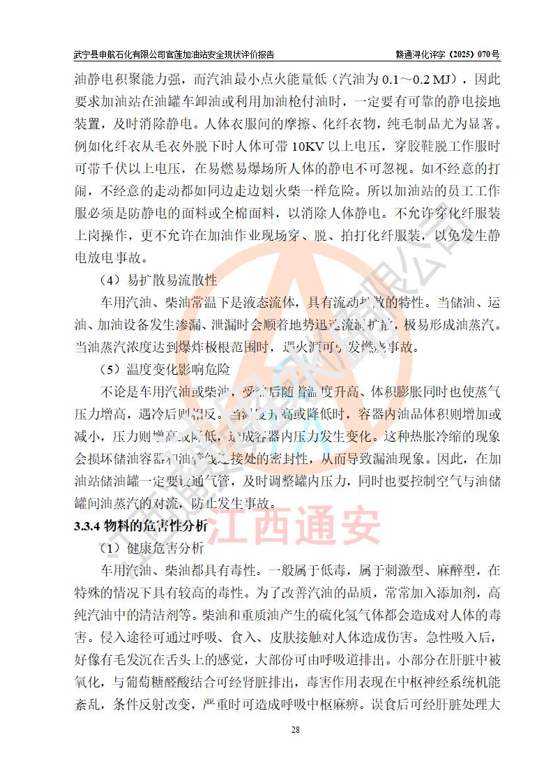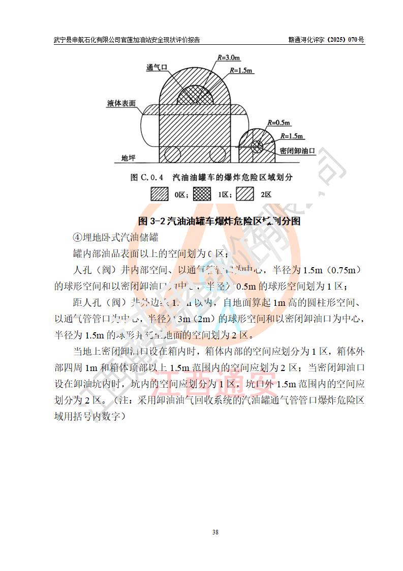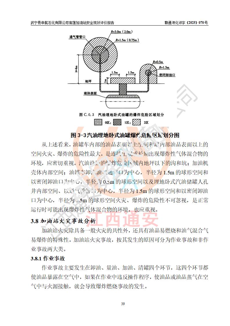項(xiàng)目簡介 | 武寧縣申航石化有限公司官蓮加油站是一家專門從事成品油零售經(jīng)營的有限責(zé)任公司分公司,經(jīng)營場所位于江西省九江市武寧縣官蓮鄉(xiāng)集鎮(zhèn)。現(xiàn)有從業(yè)人員9名,其中安全管理人員1人,加油站負(fù)責(zé)人黎暉。 該加油站占地面積約2280m2,站區(qū)內(nèi)設(shè)置有4臺(tái)雙槍程控燃油加油機(jī)及配套的工藝管線、設(shè)有單層儲(chǔ)罐4臺(tái)(設(shè)有防滲罐池),其中40m3的0#柴油儲(chǔ)罐2臺(tái)、40m3的92#汽油儲(chǔ)罐1臺(tái),40m3的95#汽油儲(chǔ)罐1臺(tái),油品儲(chǔ)罐總?cè)莘e為160m3(折算成汽油為120m3),按現(xiàn)行《汽車加油加氣加氫站技術(shù)標(biāo)準(zhǔn)》對加油站的等級(jí)劃分原則,屬二級(jí)加油站。 該站由九江市行政審批局換發(fā)《危險(xiǎn)化學(xué)品經(jīng)營許可證》(證號(hào):36040013202500003),**期限2022年12月19日至2025年12月18日。 | |||