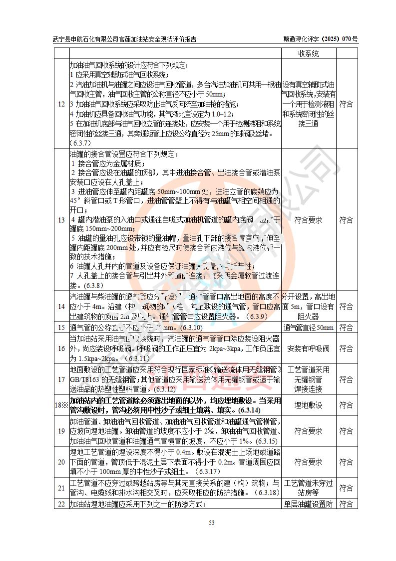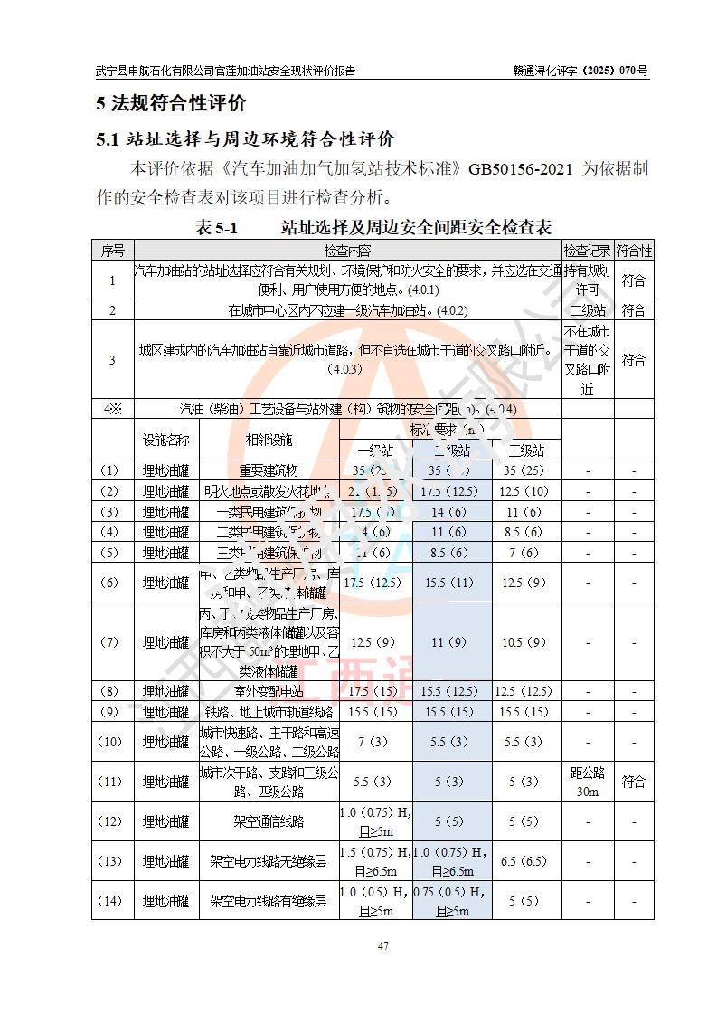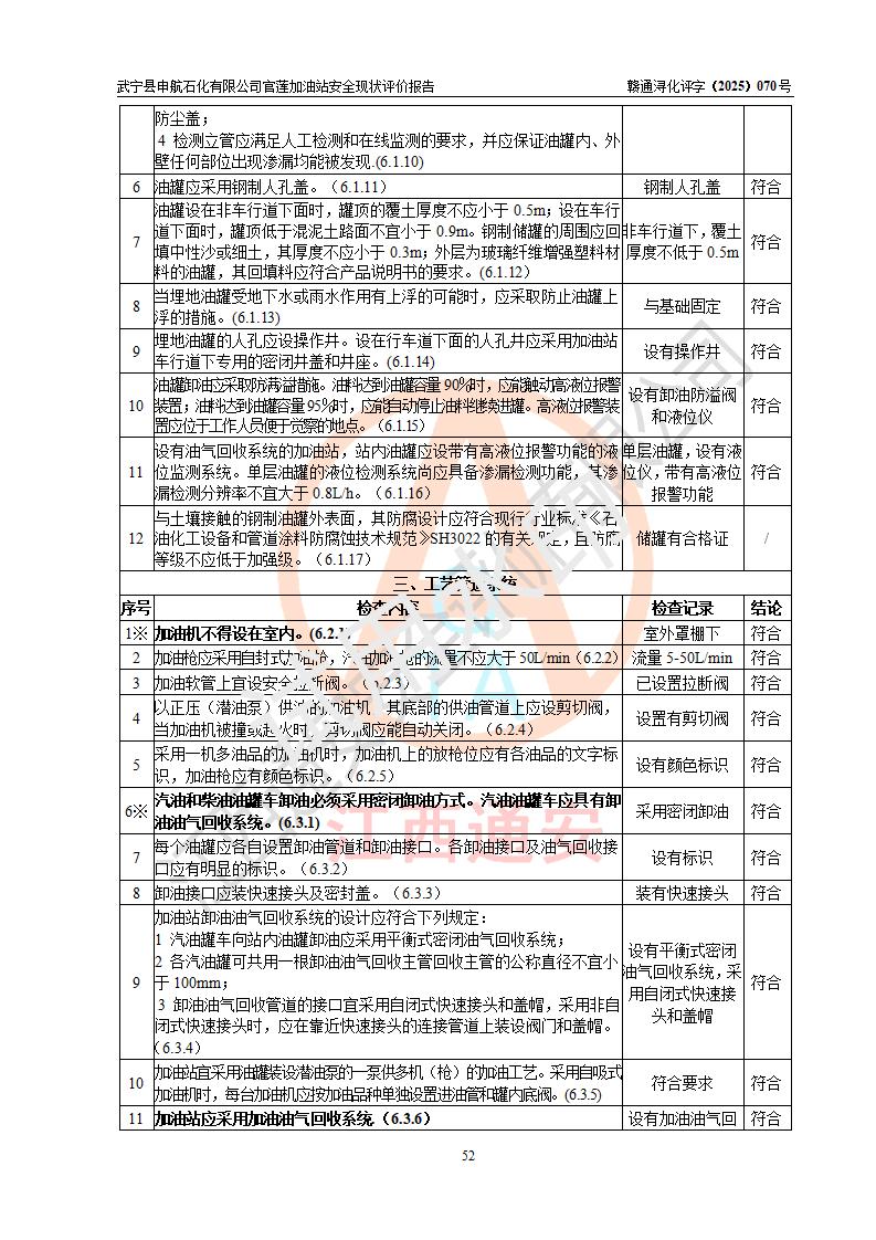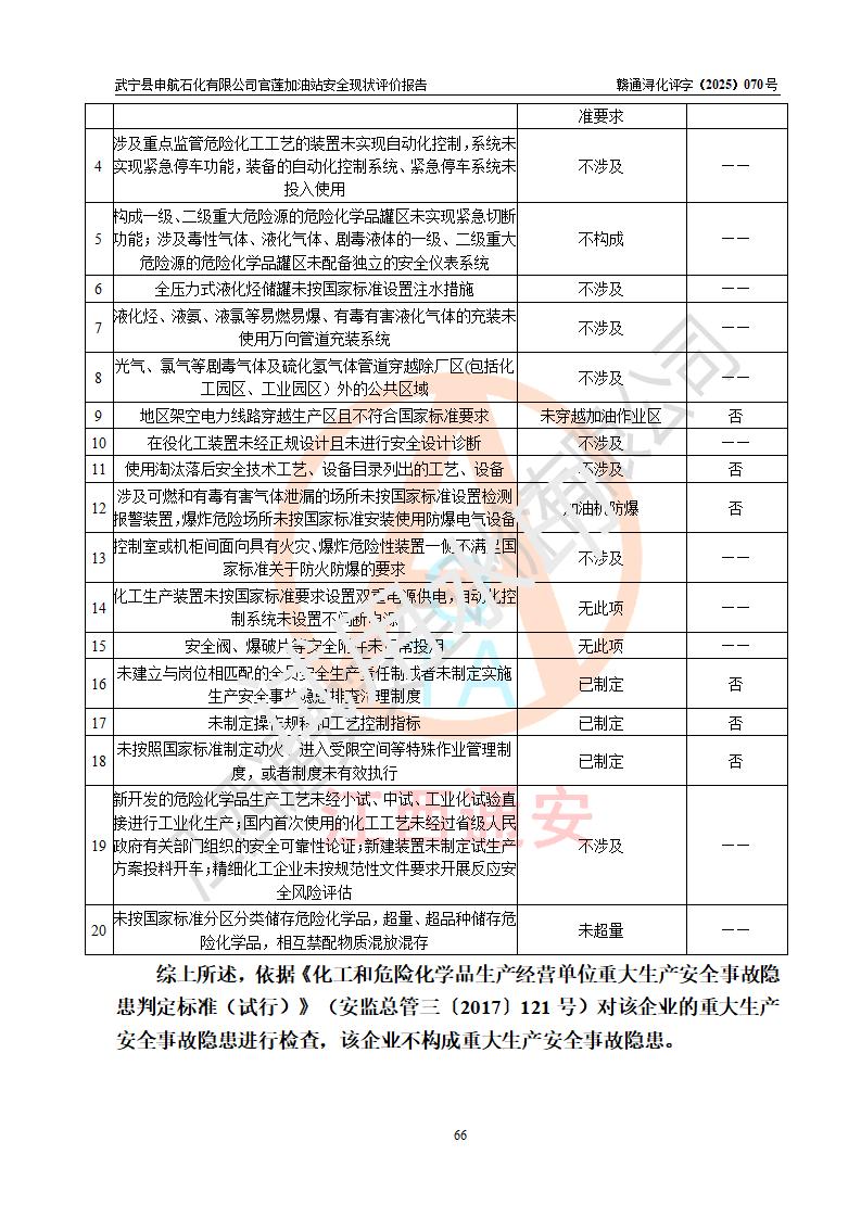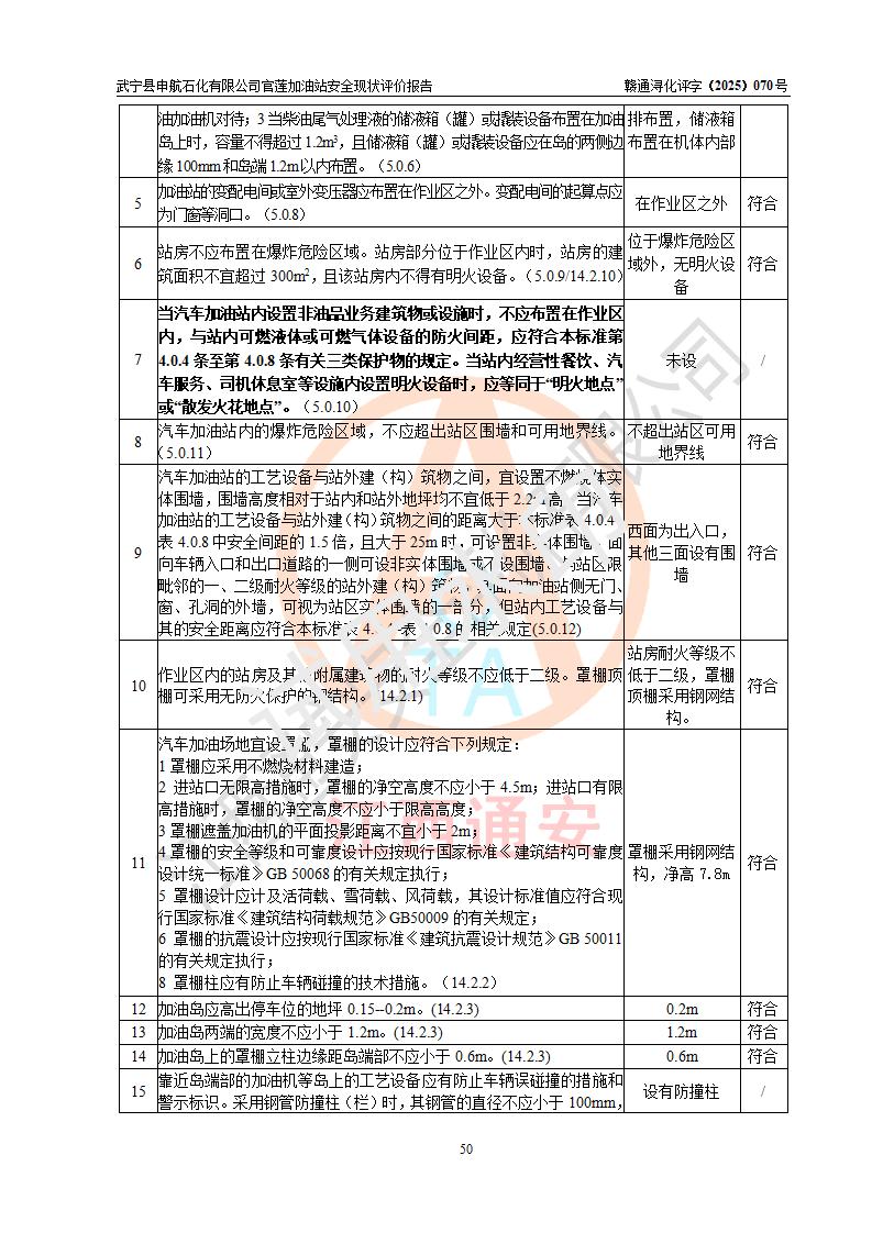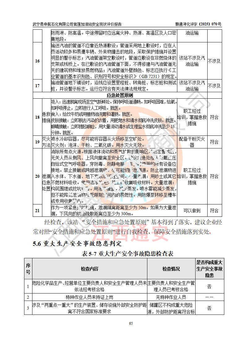 評(píng)價(jià)結(jié)論 | 武寧縣申航石化有限公司官蓮加油站涉及的安全條件、安全經(jīng)營條件、安全生產(chǎn)管理符合《危險(xiǎn)化學(xué)品經(jīng)營許可證管理辦法》、《汽車加油加氣加氫站技術(shù)標(biāo)準(zhǔn)》等**有關(guān)法規(guī)、標(biāo)準(zhǔn)、規(guī)范要求,能滿足危險(xiǎn)化學(xué)品經(jīng)營安全條件。 | |||