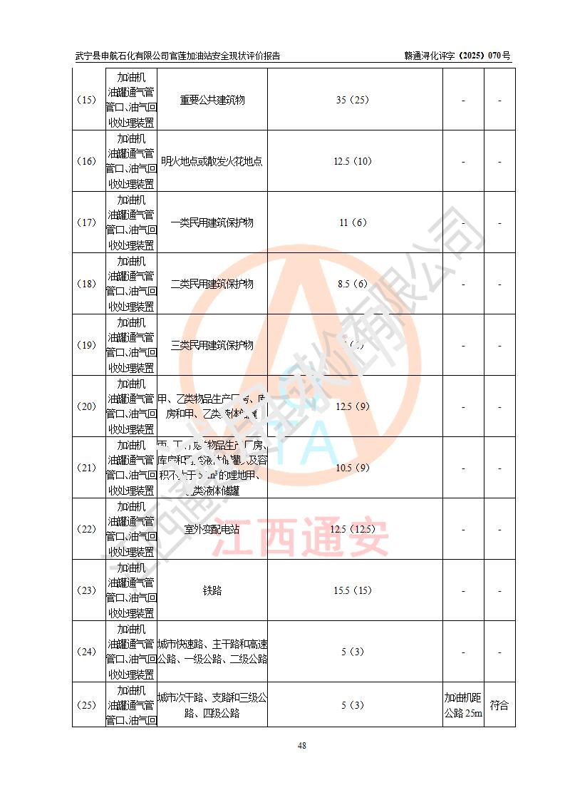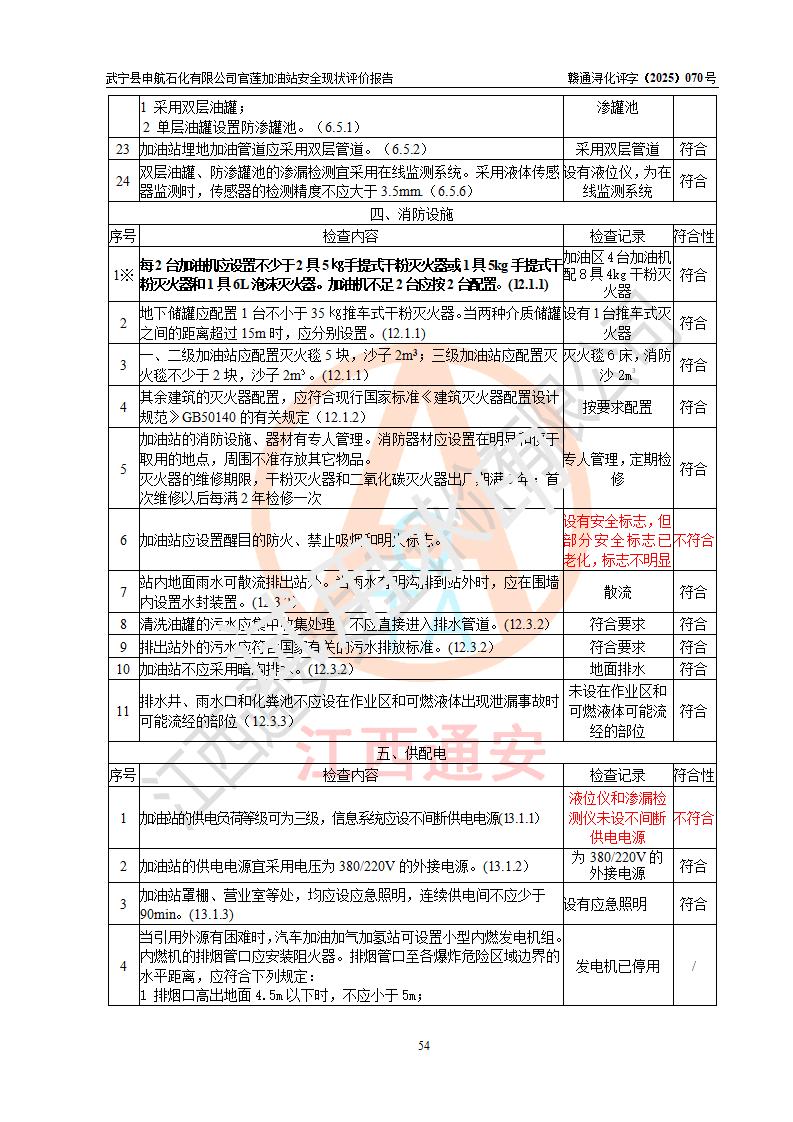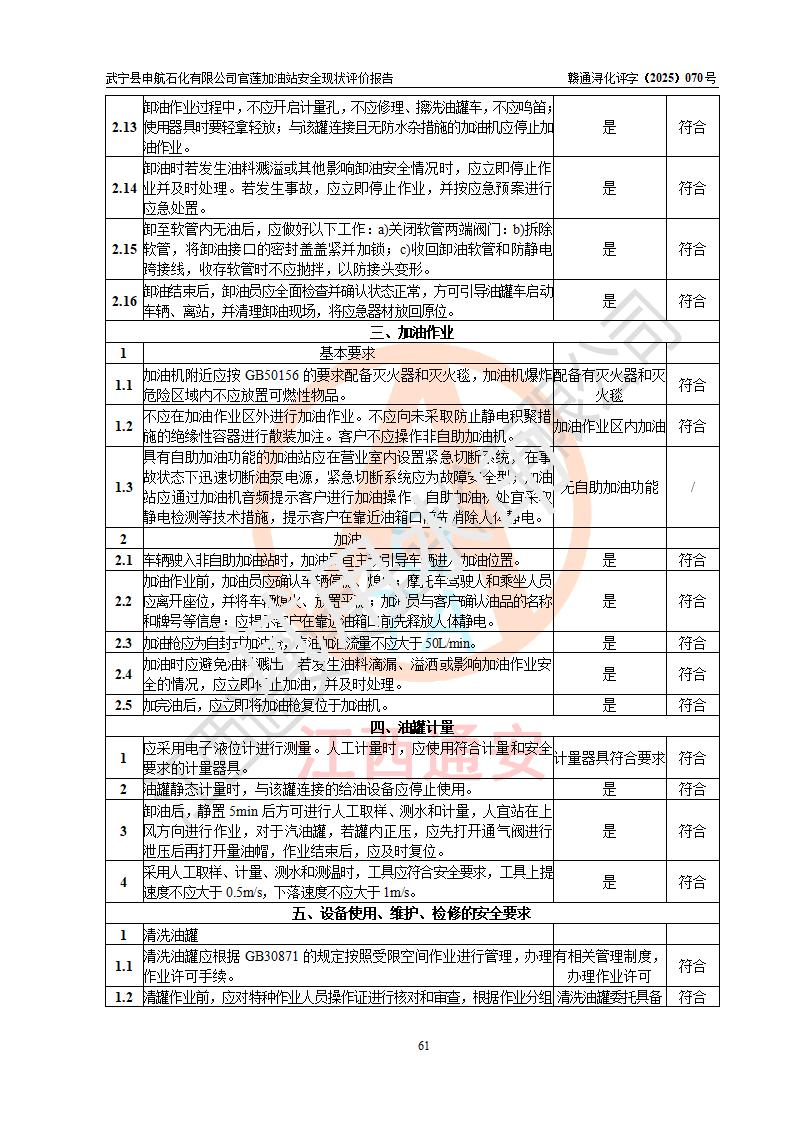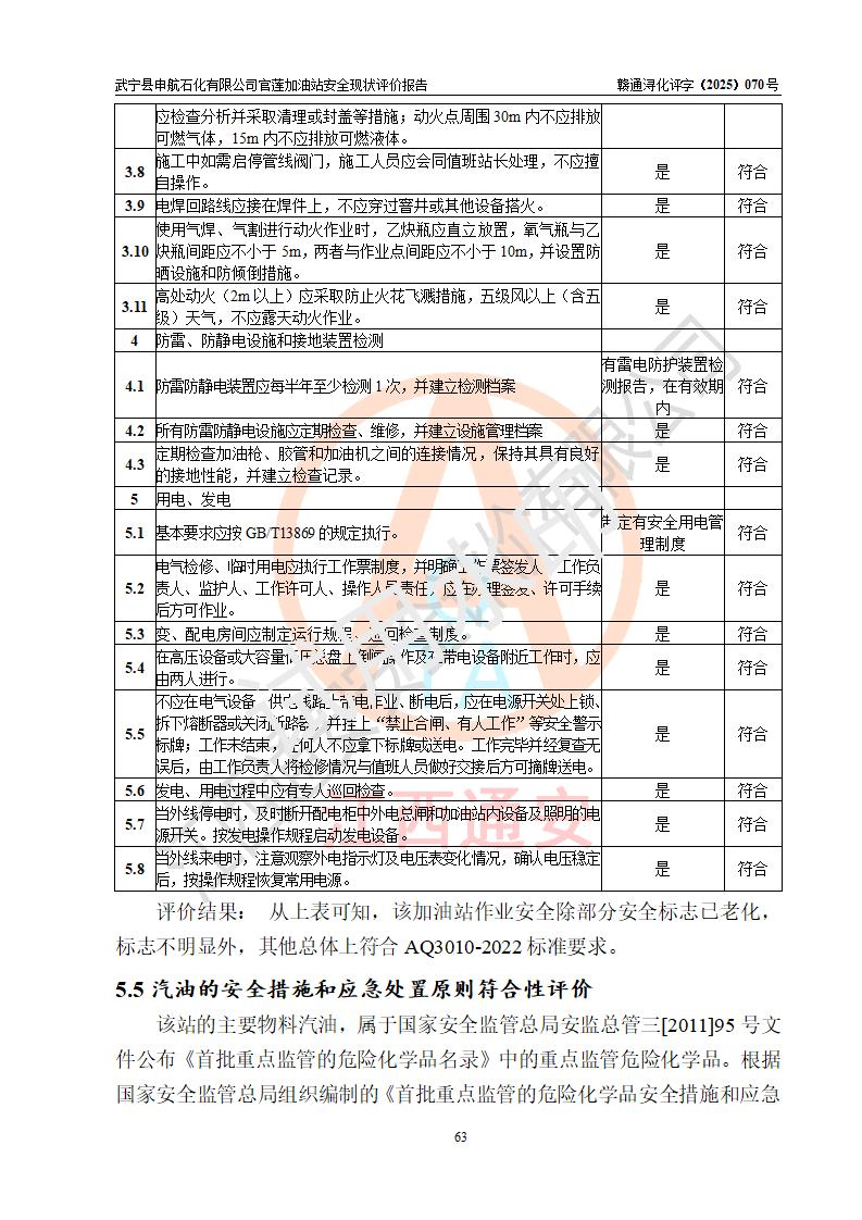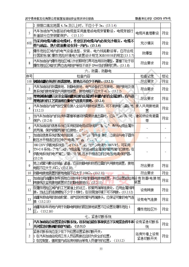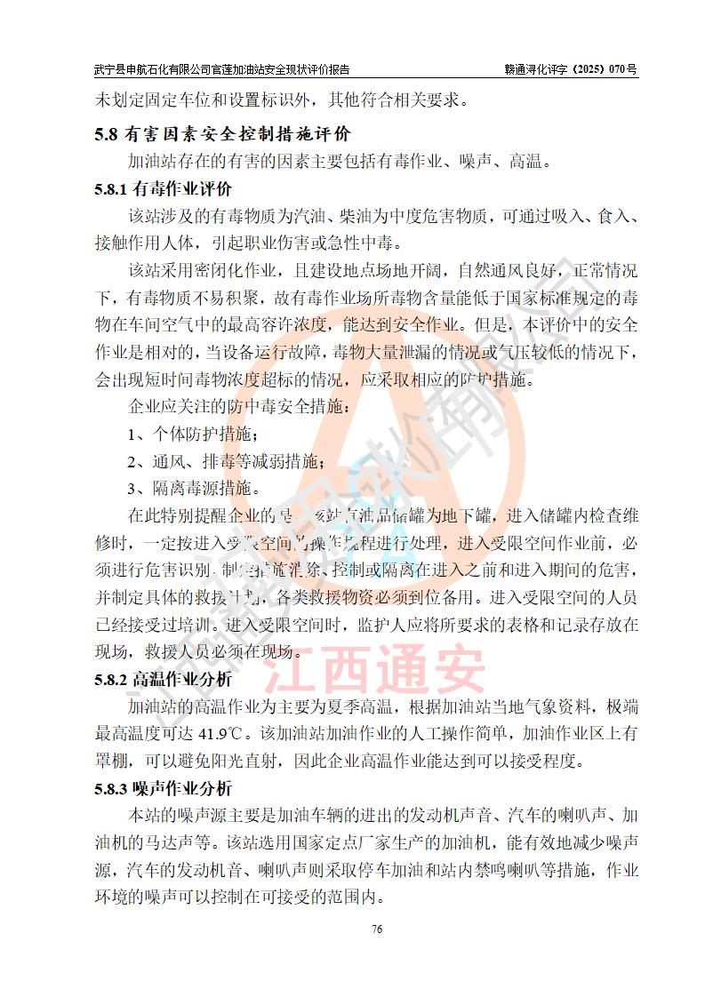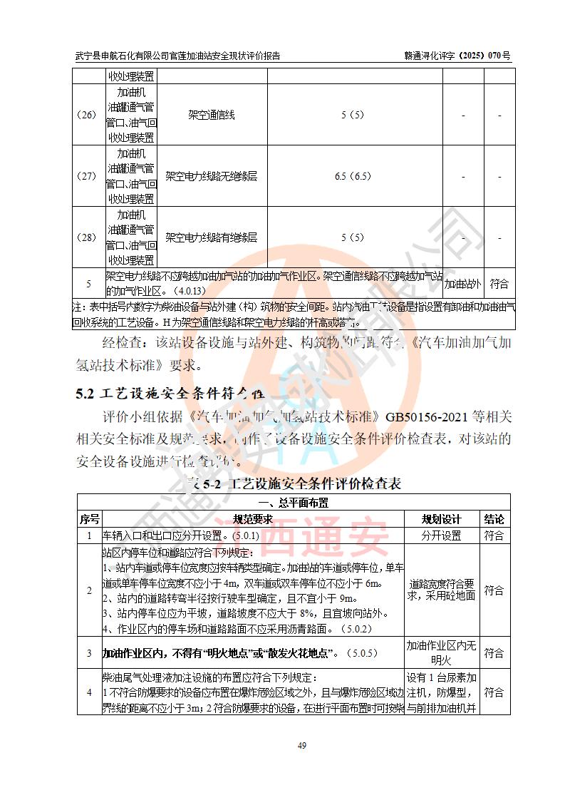 評(píng)價(jià)結(jié)論 | 武寧縣申航石化有限公司官蓮加油站涉及的安全條件、安全經(jīng)營條件、安全生產(chǎn)管理符合《危險(xiǎn)化學(xué)品經(jīng)營許可證管理辦法》、《汽車加油加氣加氫站技術(shù)標(biāo)準(zhǔn)》等**有關(guān)法規(guī)、標(biāo)準(zhǔn)、規(guī)范要求,能滿足危險(xiǎn)化學(xué)品經(jīng)營安全條件。 | |||