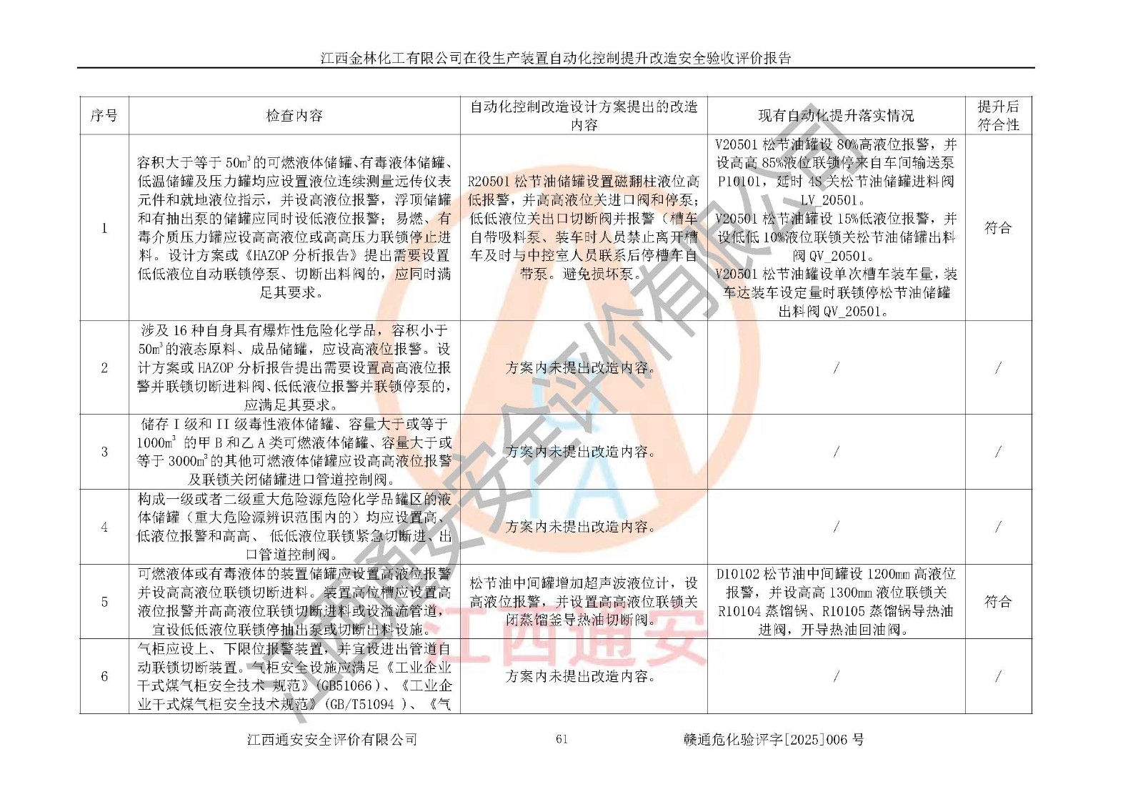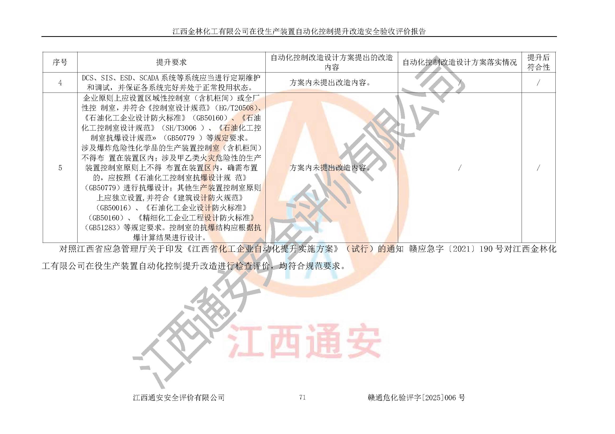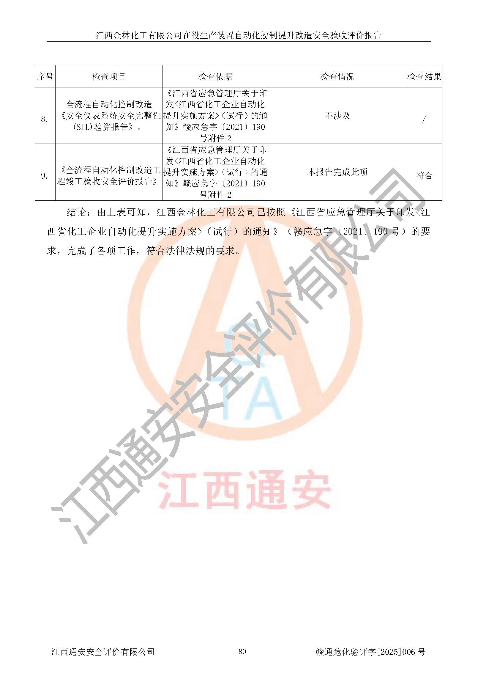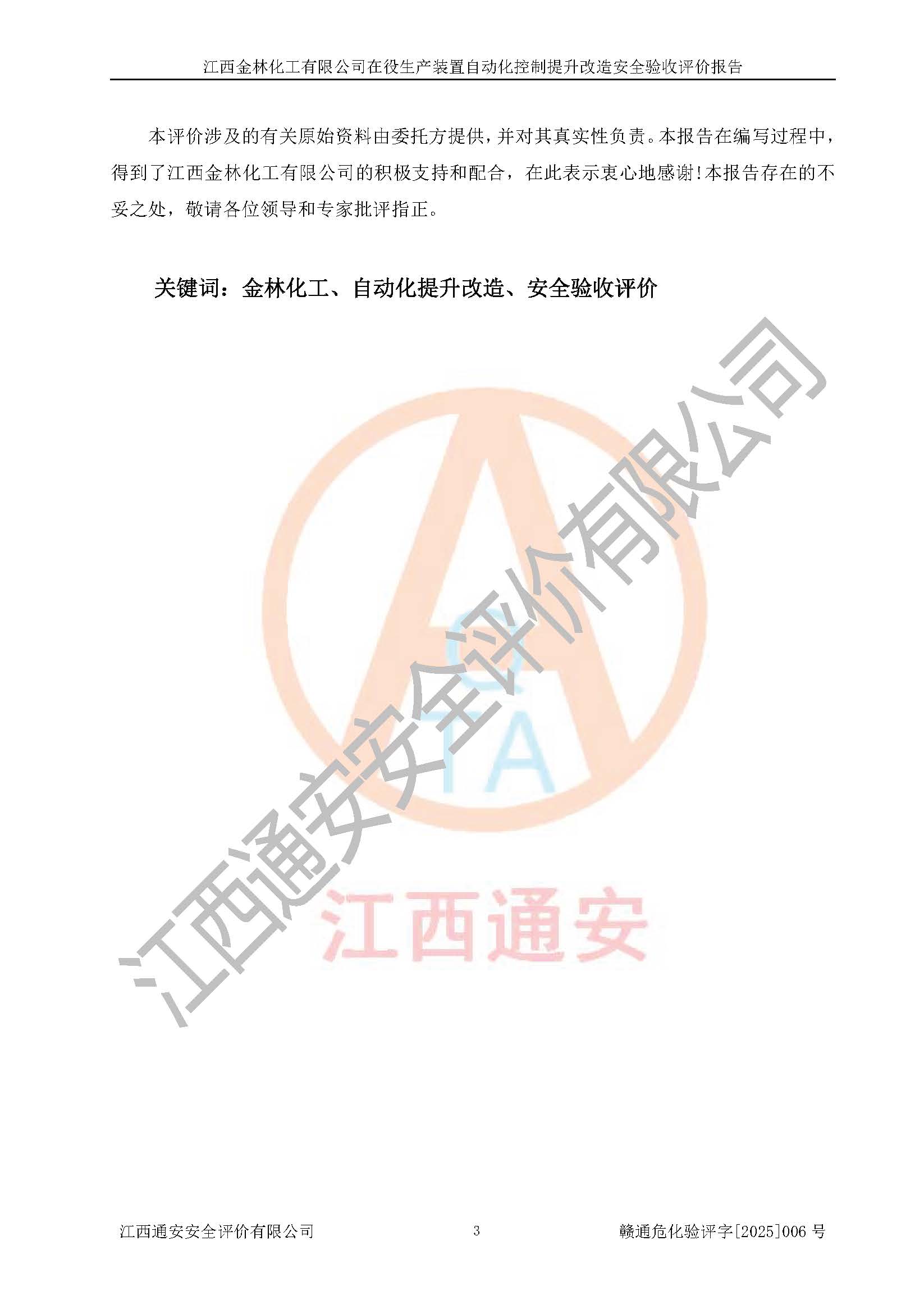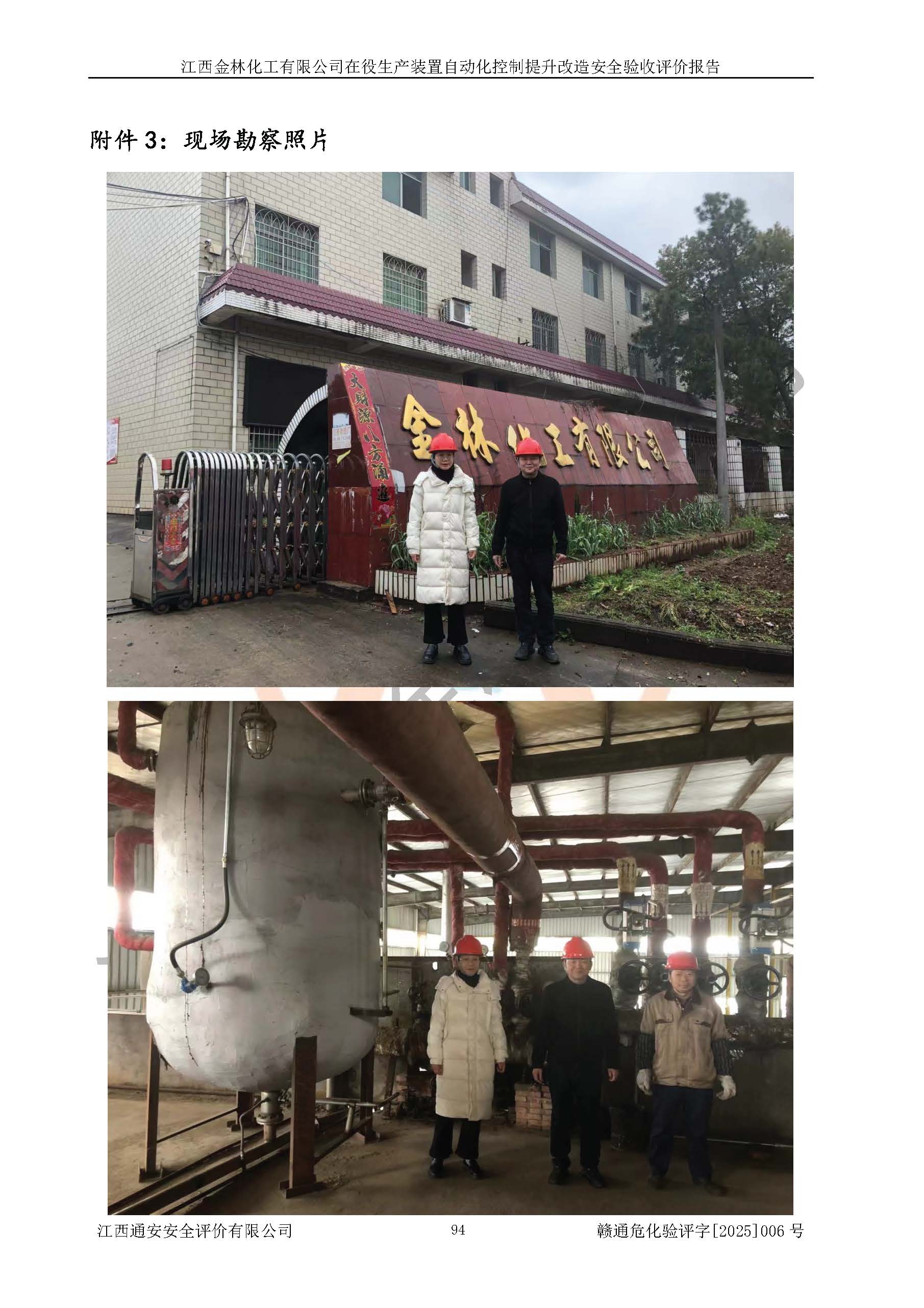 評(píng)價(jià)報(bào)告名稱 | 江西金林化工有限公司在役生產(chǎn)裝置自動(dòng)化控制提升改造安全驗(yàn)收評(píng)價(jià)報(bào)告 | |||