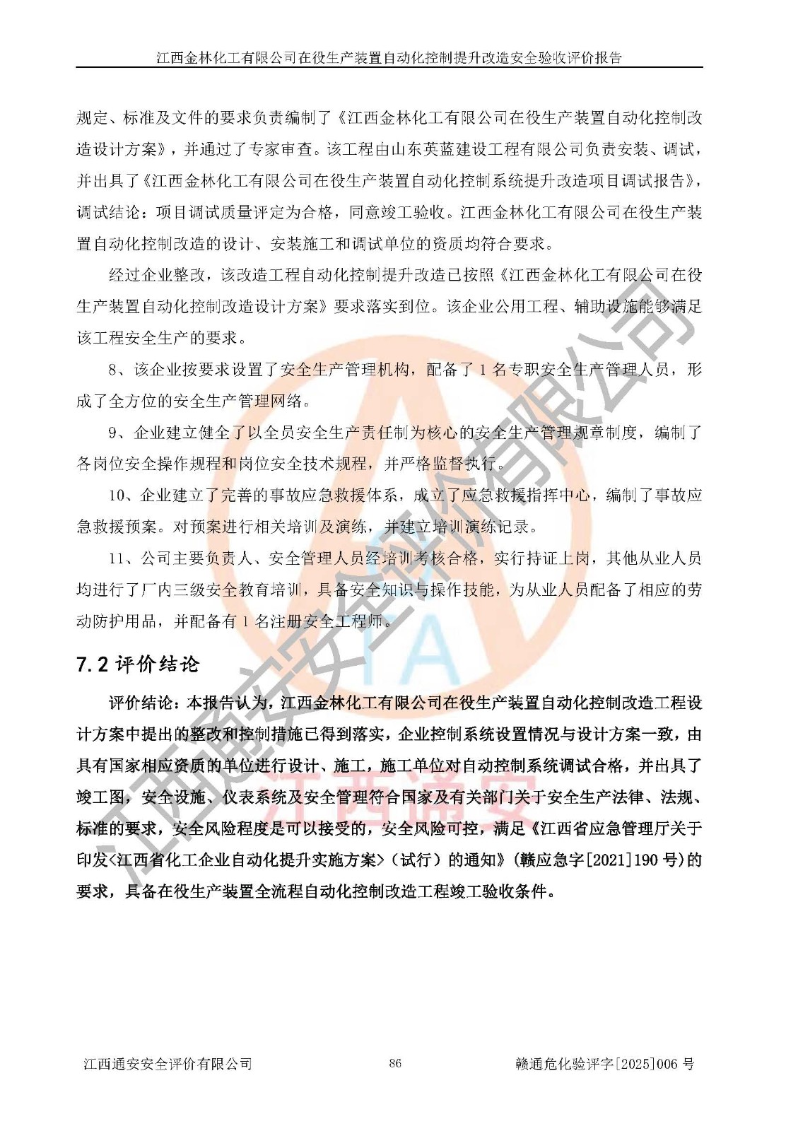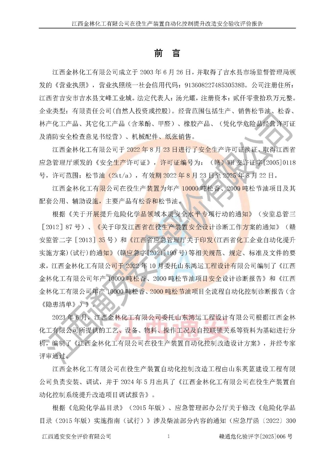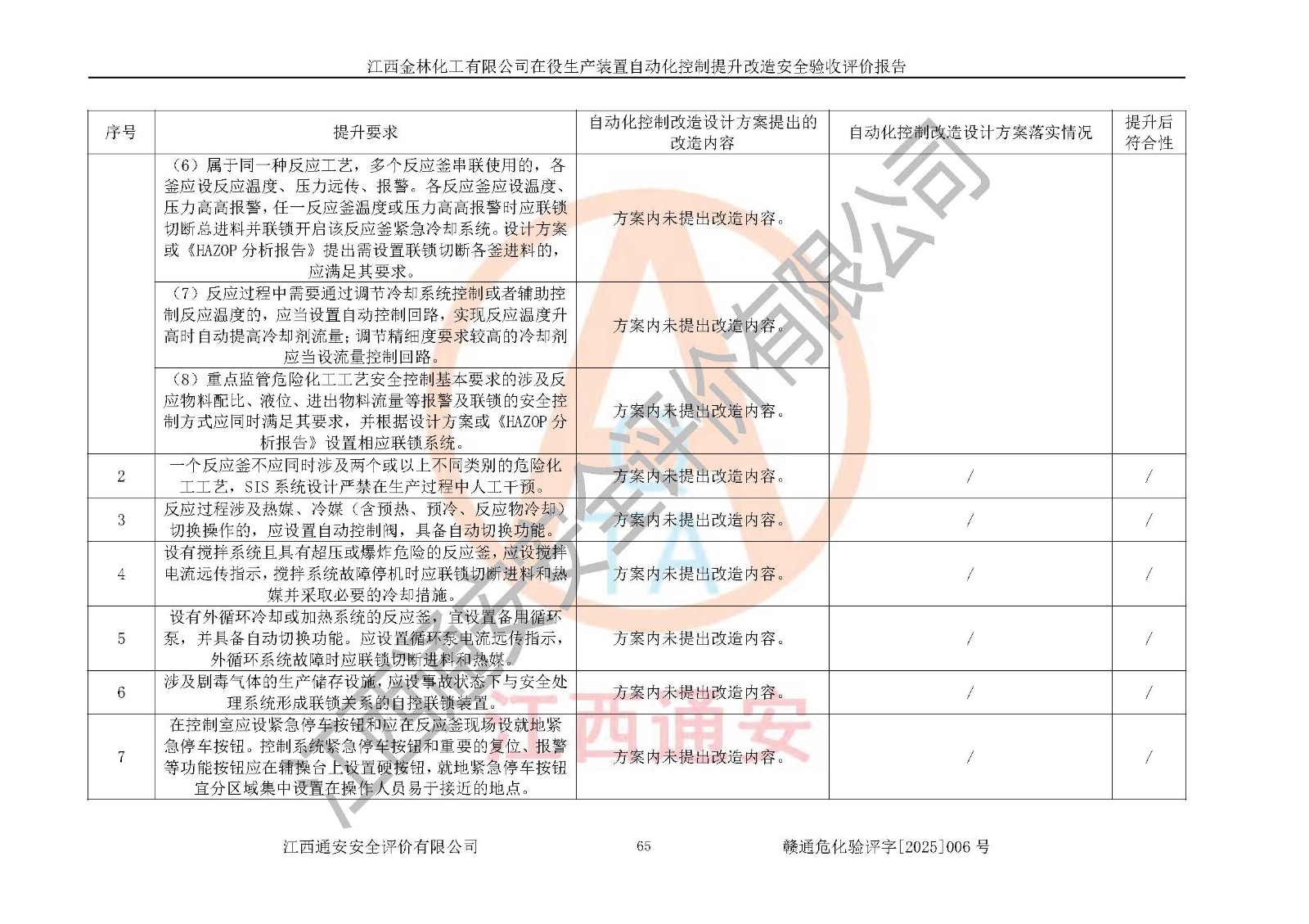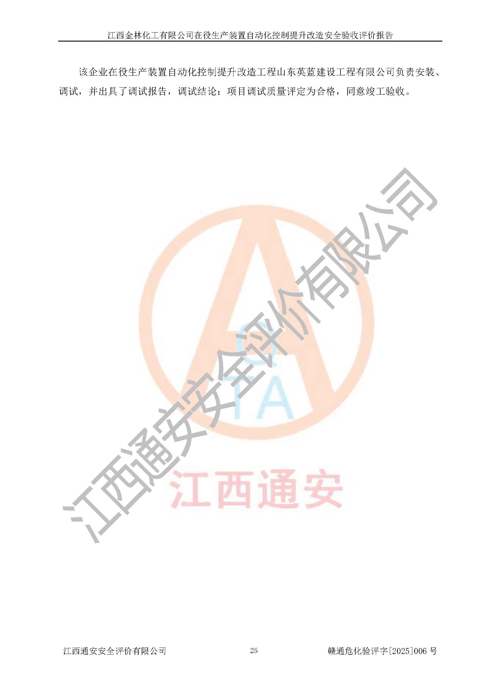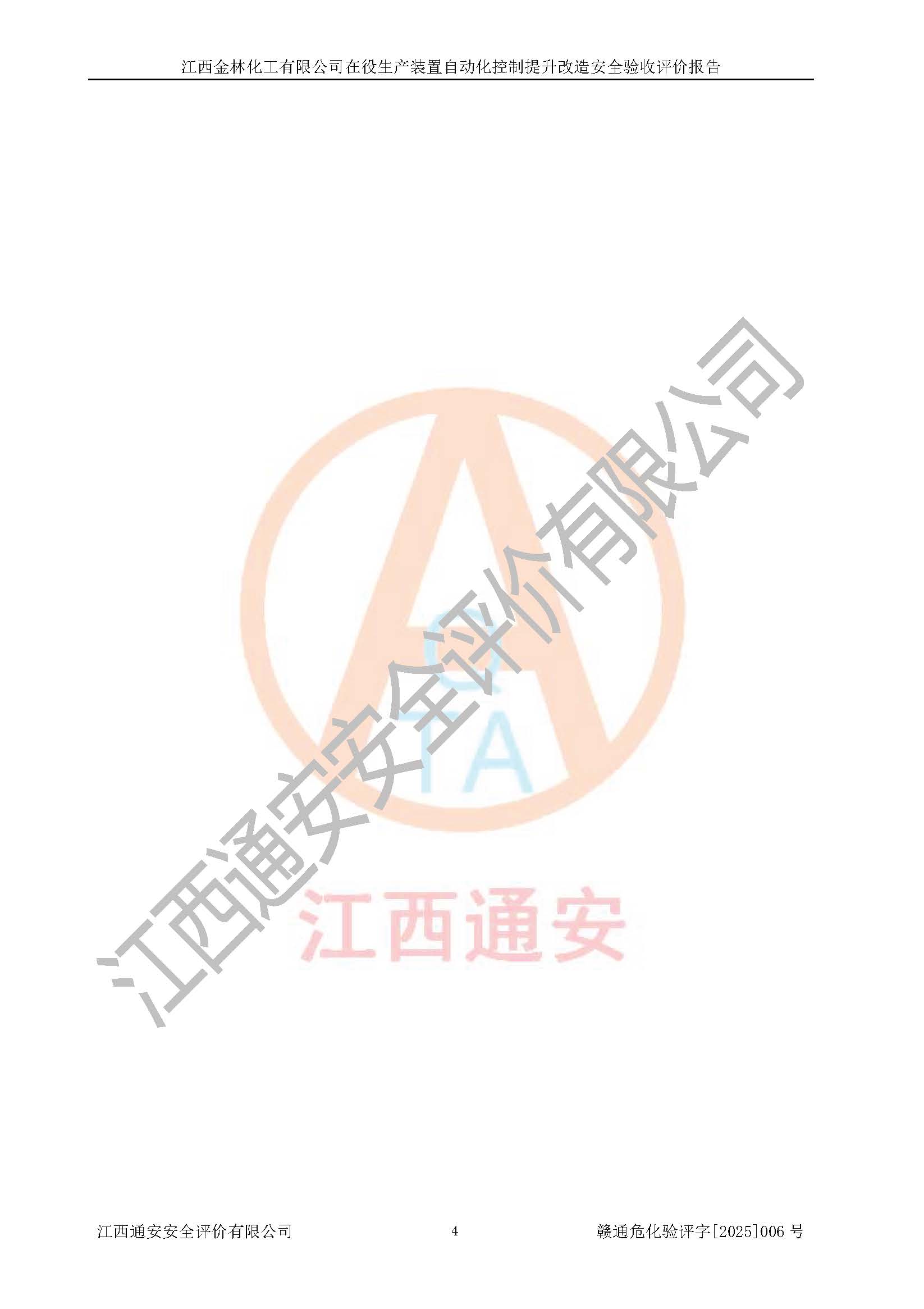 評(píng)價(jià)報(bào)告名稱 | 江西金林化工有限公司在役生產(chǎn)裝置自動(dòng)化控制提升改造安全驗(yàn)收評(píng)價(jià)報(bào)告 | |||