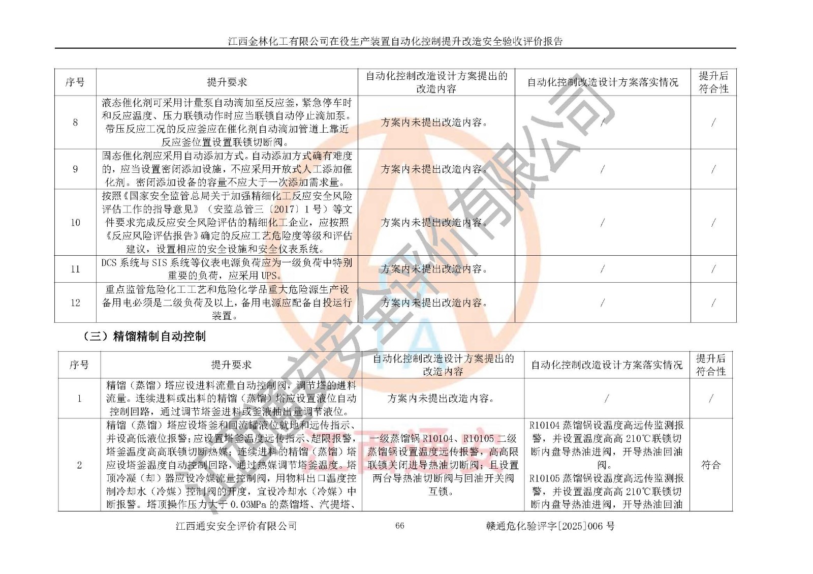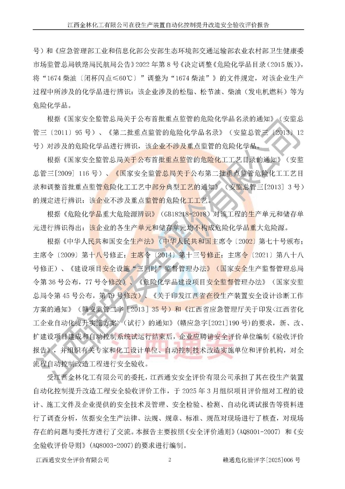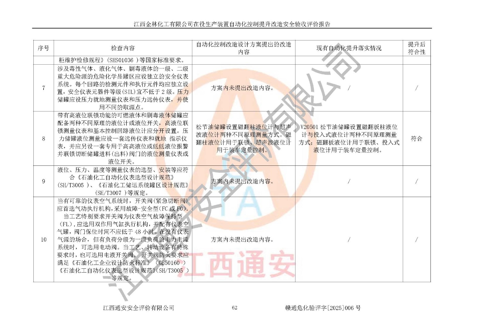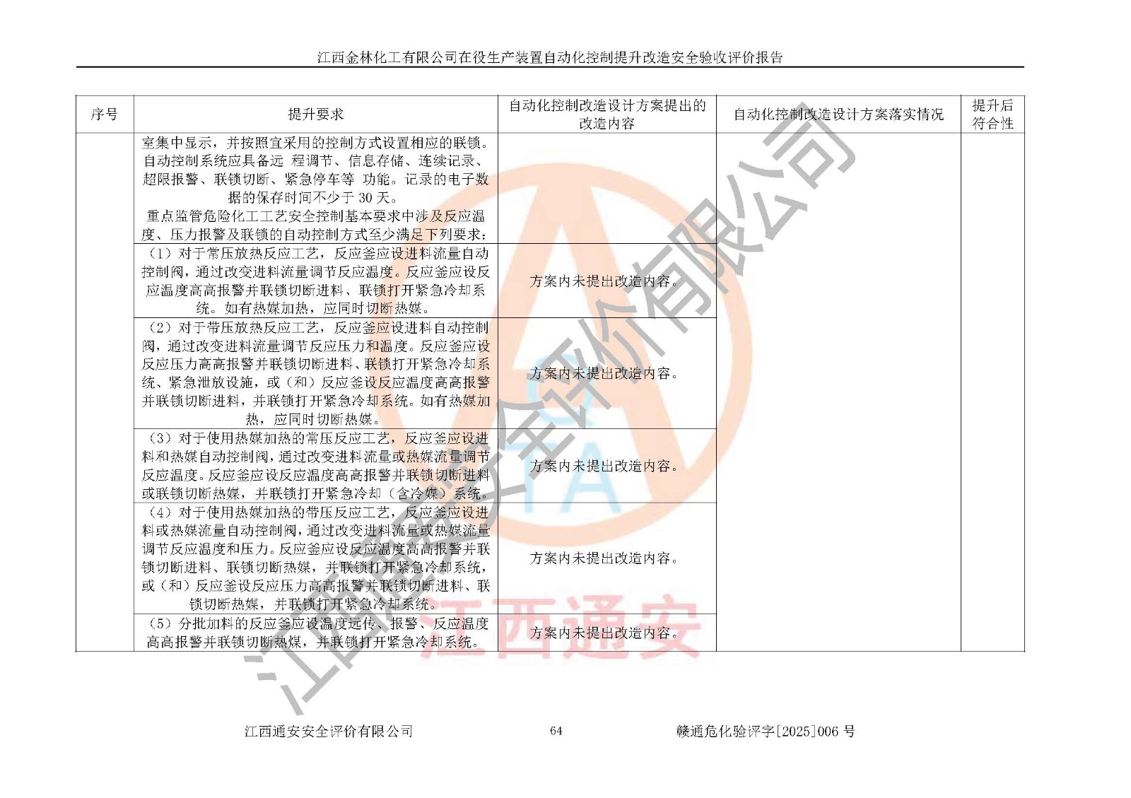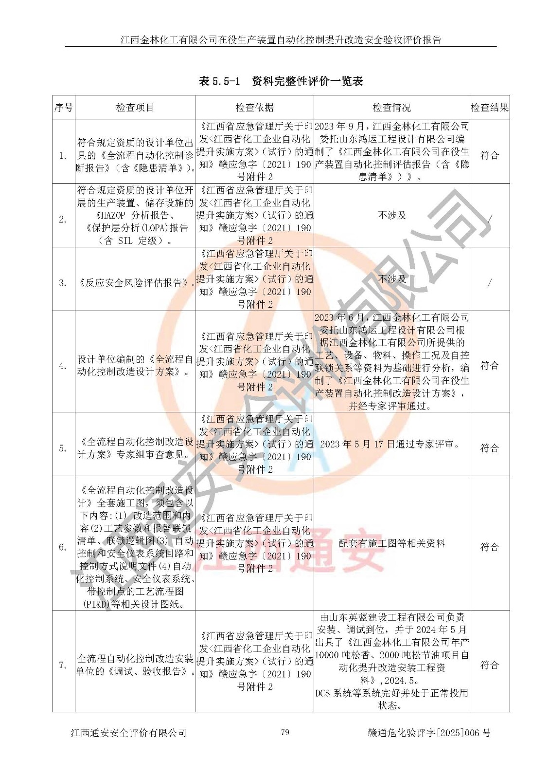 評(píng)價(jià)報(bào)告名稱 | 江西金林化工有限公司在役生產(chǎn)裝置自動(dòng)化控制提升改造安全驗(yàn)收評(píng)價(jià)報(bào)告 | |||
