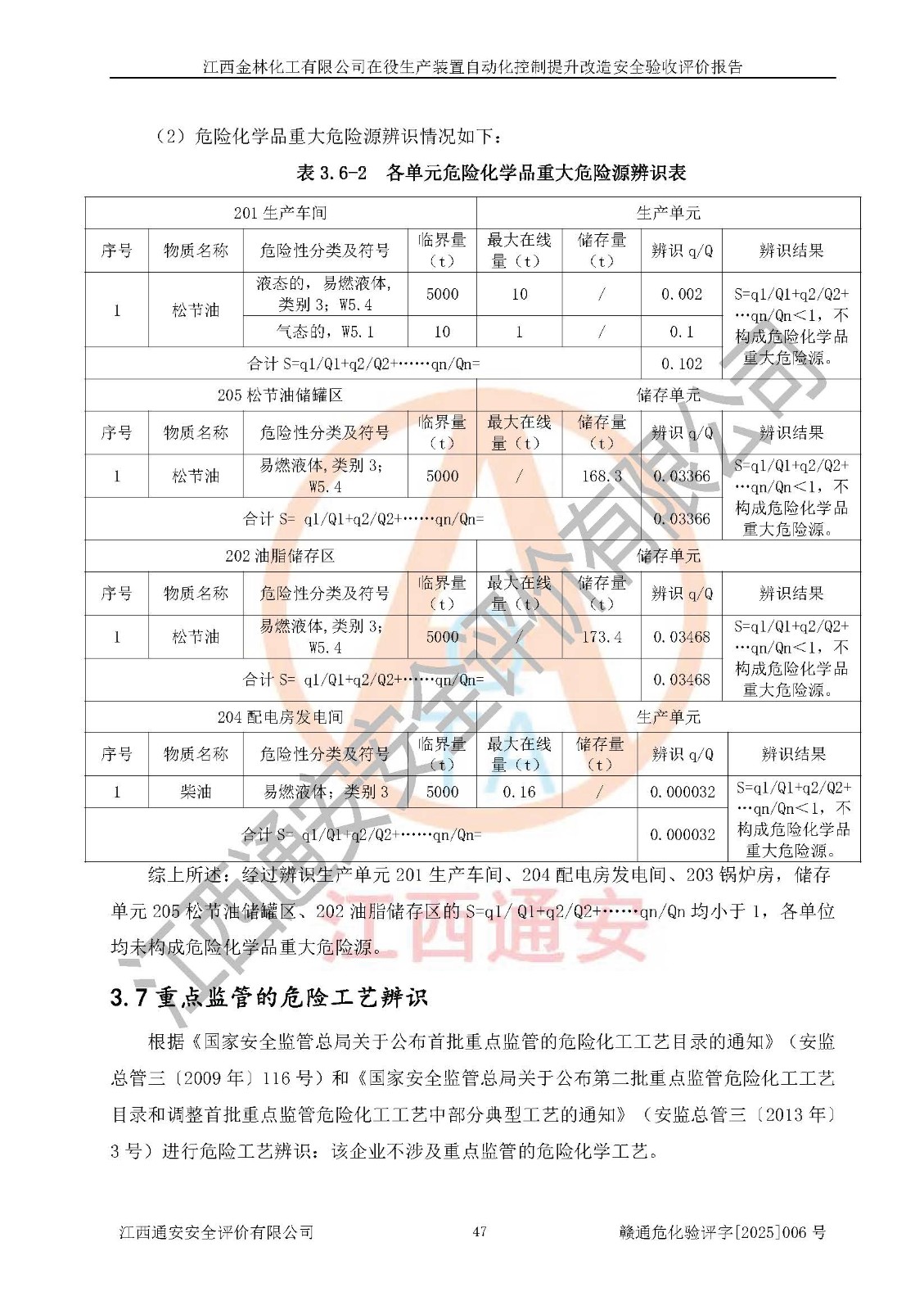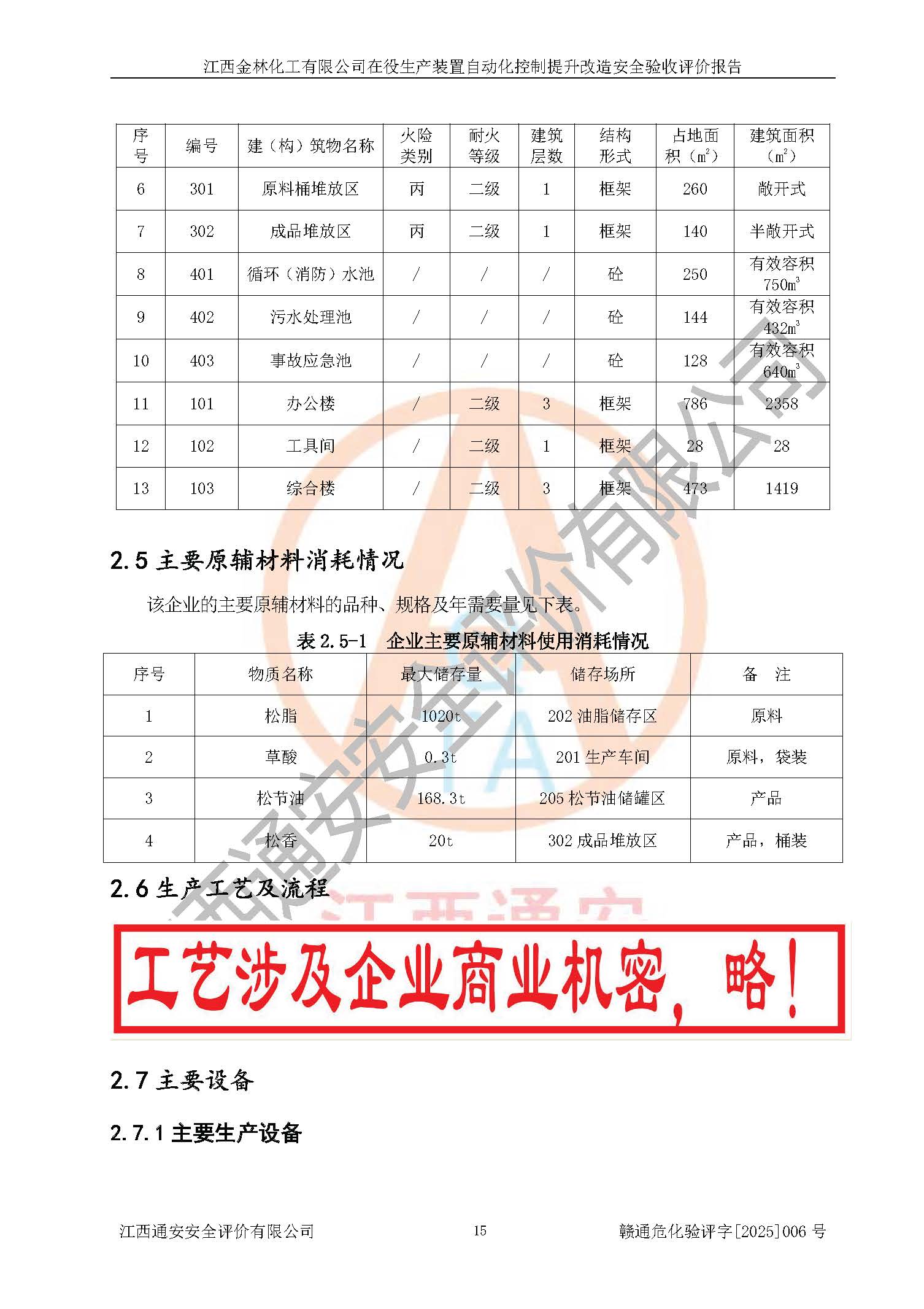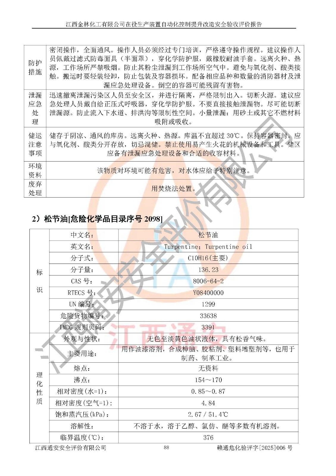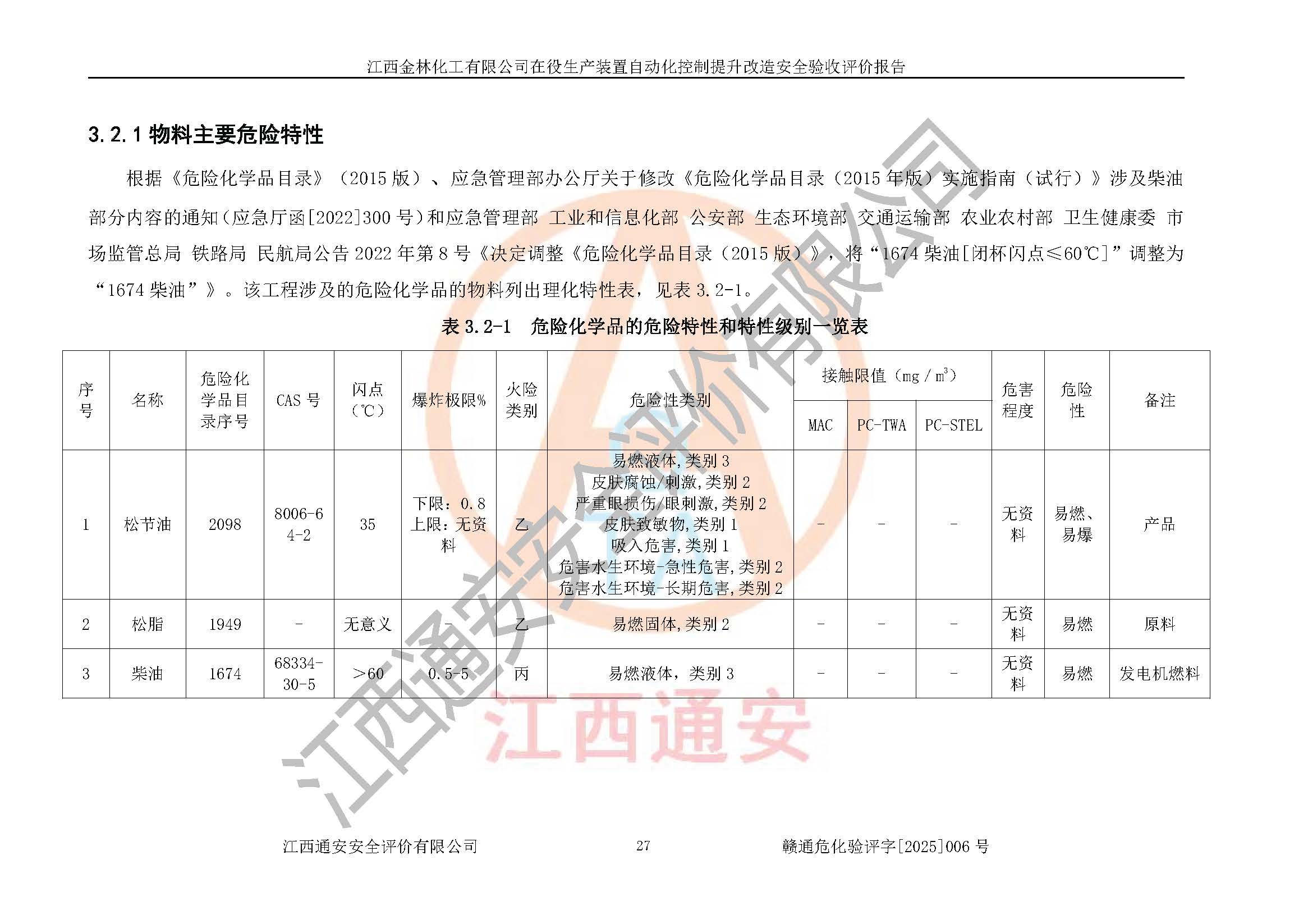 項(xiàng)目簡(jiǎn)介 | 江西金林化工有限公司成立于2003年6月26日,并取得了吉水縣市場(chǎng)監(jiān)督管理局頒發(fā)的《營(yíng)業(yè)執(zhí)照》,營(yíng)業(yè)執(zhí)照統(tǒng)一社會(huì)信用代碼:91360822748530538B。公司注冊(cè)住所:江西省吉安市吉水縣文峰工業(yè)城。法定**人:湯光耀,注冊(cè)資本:貳仟零壹拾玖萬(wàn)元整。企業(yè)類(lèi)型:有限責(zé)任公司(自然人投資或控股)。經(jīng)營(yíng)范圍包括生產(chǎn)、銷(xiāo)售松節(jié)油、松香、林產(chǎn)化工產(chǎn)品、其它化工產(chǎn)品(含苯酚、甲醛)、橡膠產(chǎn)品、(憑化學(xué)危險(xiǎn)品經(jīng)營(yíng)許可證及消防安全檢查意見(jiàn)書(shū)經(jīng)營(yíng))、機(jī)械配件、紙張銷(xiāo)售。 江西金林化工有限公司于2022年8月23日進(jìn)行了安全生產(chǎn)許可證換證,取得江西省應(yīng)急管理廳頒發(fā)的《安全生產(chǎn)許可證》,許可證編號(hào)為:(贛)WH安許證字[2005]0118號(hào),許可范圍:松節(jié)油(2kt/a),**期2022年8月23日至2025年8月22日。 江西金林化工有限公司在役生產(chǎn)裝置為年產(chǎn)10000噸松香、2000噸松節(jié)油項(xiàng)目及其配套公用、輔助設(shè)施,主要產(chǎn)品有松香和松節(jié)油。 根據(jù)《危險(xiǎn)化學(xué)品目錄》(2015年版)、應(yīng)急管理部辦公廳關(guān)于修改《危險(xiǎn)化學(xué)品目錄(2015年版)實(shí)施指南(試行)》涉及柴油部分內(nèi)容的通知(應(yīng)急廳函〔2022〕300號(hào))和《應(yīng)急管理部工業(yè)和信息化部公安部生態(tài)環(huán)境部交通運(yùn)輸部農(nóng)業(yè)農(nóng)村部衛(wèi)生健康委市場(chǎng)監(jiān)管總局鐵路局民航局公告》2022年第8號(hào)《決定調(diào)整《危險(xiǎn)化學(xué)品目錄(2015版)》,將“1674柴油〔閉杯閃點(diǎn)≤60℃〕”調(diào)整為“1674柴油”》的文件規(guī)定,對(duì)該企業(yè)生產(chǎn)過(guò)程中所涉及的化學(xué)品進(jìn)行辨識(shí):該企業(yè)涉及的松脂、松節(jié)油、柴油(發(fā)電機(jī)燃料)等為危險(xiǎn)化學(xué)品。 | |||