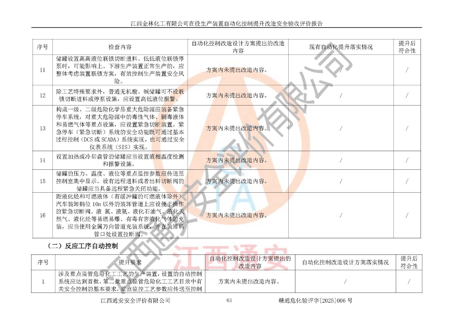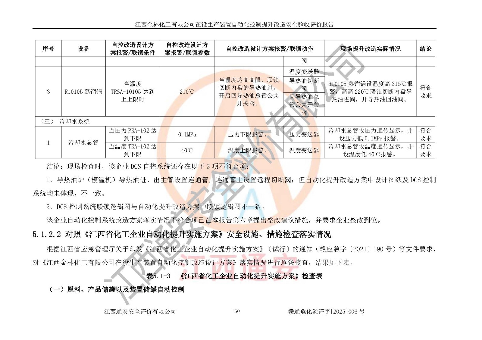 評(píng)價(jià)結(jié)論 | 江西金林化工有限公司在役生產(chǎn)裝置自動(dòng)化控制改造工程設(shè)計(jì)方案中提出的整改和控制措施已得到落實(shí),企業(yè)控制系統(tǒng)設(shè)置情況與設(shè)計(jì)方案一致,由具有**相應(yīng)資質(zhì)的單位進(jìn)行設(shè)計(jì)、施工,施工單位對(duì)自動(dòng)控制系統(tǒng)調(diào)試合格,并出具了竣工圖,安全設(shè)施、儀表系統(tǒng)及安全管理符合**及有關(guān)部門(mén)關(guān)于安全生產(chǎn)法律、法規(guī)、標(biāo)準(zhǔn)的要求,安全風(fēng)險(xiǎn)程度是可以接受的,安全風(fēng)險(xiǎn)可控,滿足《江西省應(yīng)急管理廳關(guān)于印發(fā)<江西省化工企業(yè)自動(dòng)化提升實(shí)施方案>(試行)的通知》(贛應(yīng)急字[2021]190號(hào))的要求,具備在役生產(chǎn)裝置全流程自動(dòng)化控制改造工程竣工驗(yàn)收條件。 | |||
