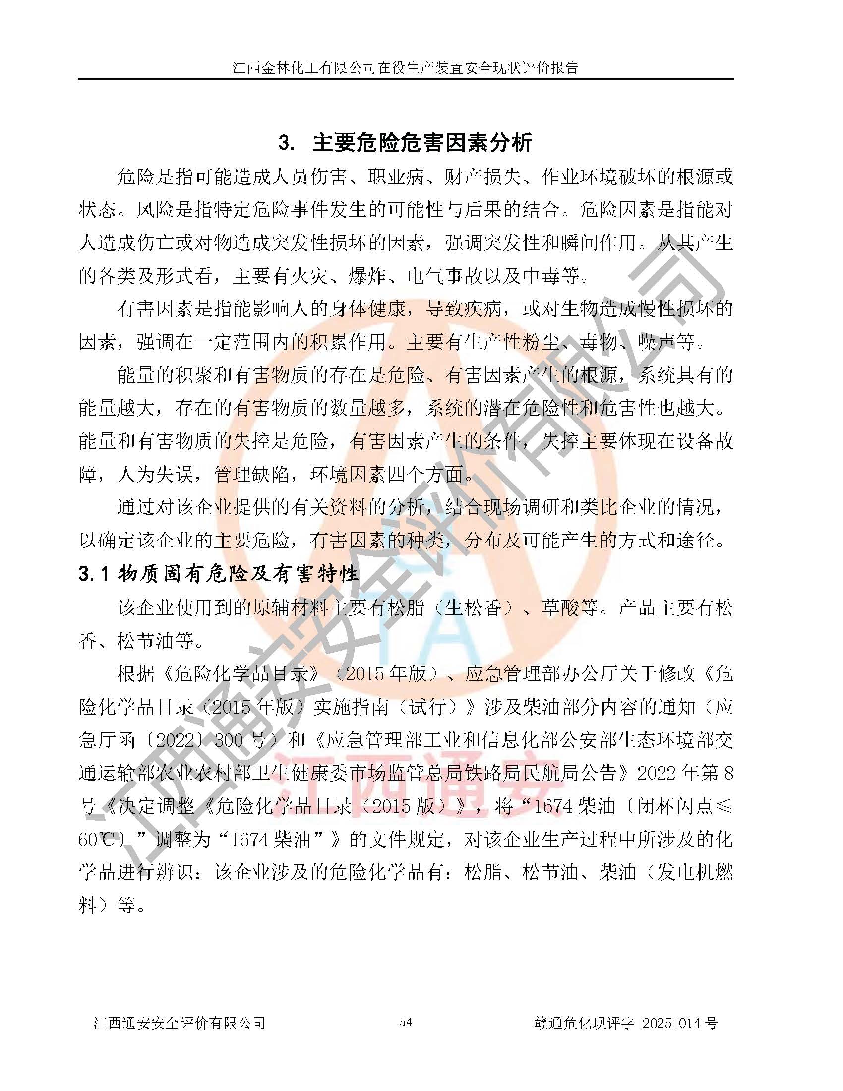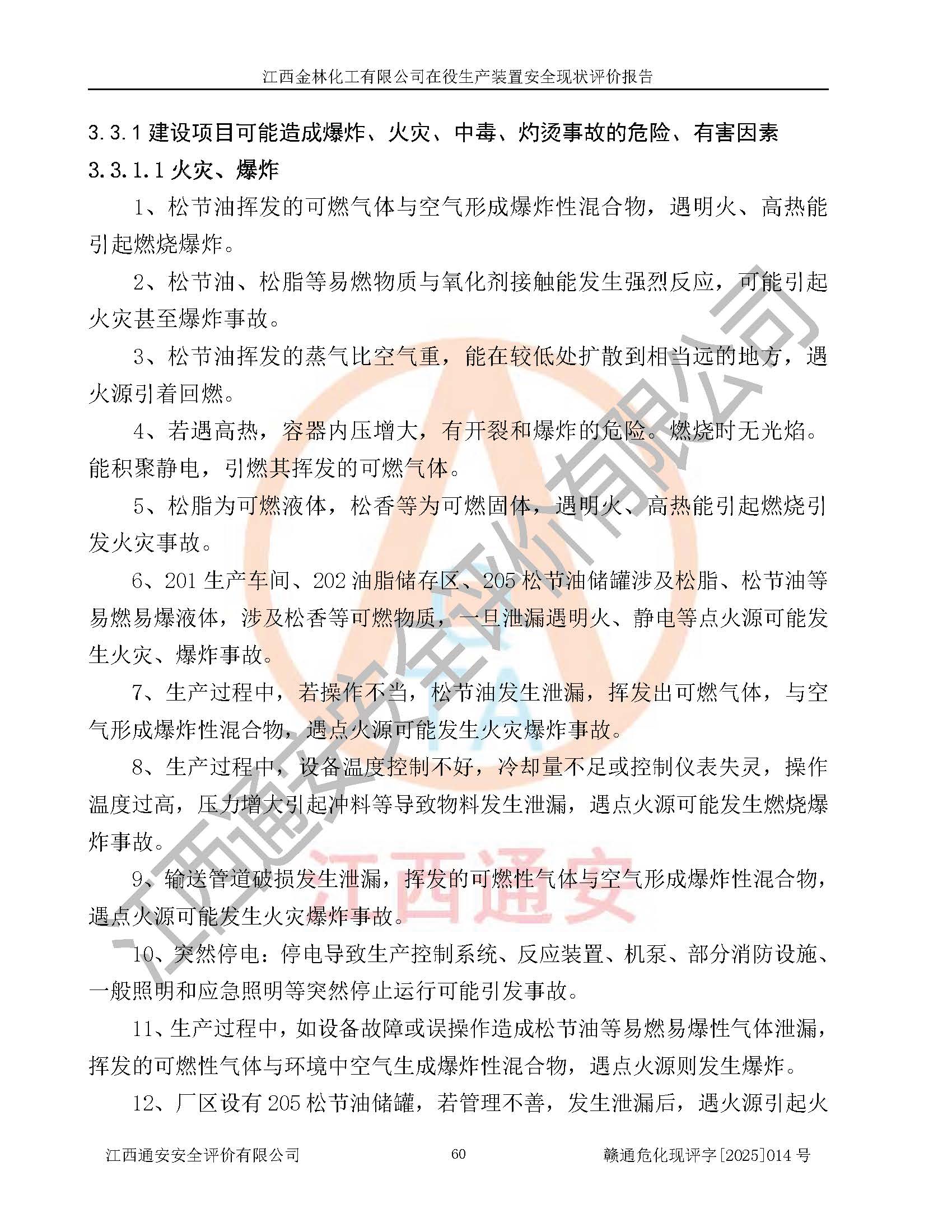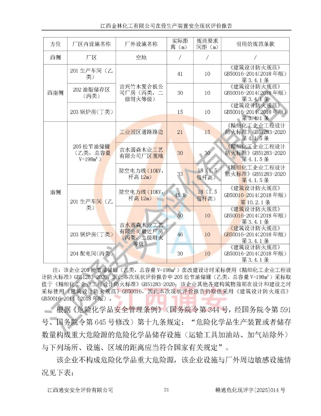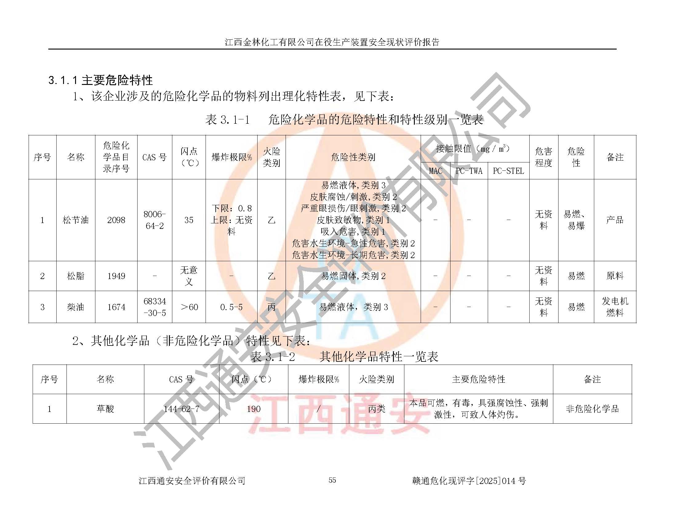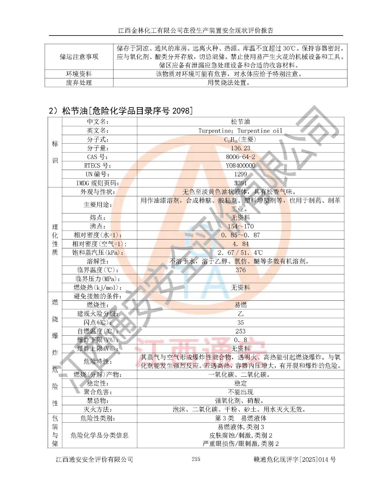 項(xiàng)目簡(jiǎn)介 | 江西金林化工有限公司成立于2003年6月26日,并取得吉水縣市場(chǎng)監(jiān)督管理局頒發(fā)的《營(yíng)業(yè)執(zhí)照》,營(yíng)業(yè)執(zhí)照統(tǒng)一社會(huì)信用代碼:91360822748530538B。公司注冊(cè)住所:江西省吉安市吉水縣文峰工業(yè)城。法定**人:湯光耀,注冊(cè)資本:貳仟零壹拾玖萬元整。企業(yè)類型:有限責(zé)任公司(自然人投資或控股)。經(jīng)營(yíng)范圍包括生產(chǎn)、銷售松節(jié)油、松香、林產(chǎn)化工產(chǎn)品、其它化工產(chǎn)品(含苯酚、甲醛)、橡膠產(chǎn)品、(憑化學(xué)危險(xiǎn)品經(jīng)營(yíng)許可證及消防安全檢查意見書經(jīng)營(yíng))、機(jī)械配件、紙張銷售。 江西金林化工有限公司于2022年8月23日進(jìn)行了安全生產(chǎn)許可證換證,取得江西省應(yīng)急管理廳頒發(fā)的《安全生產(chǎn)許可證》,許可證編號(hào)為:(贛)WH安許證字[2005]0118號(hào),許可范圍:松節(jié)油(2kt/a),**期2022年8月23日至2025年8月22日。 江西金林化工有限公司在役生產(chǎn)裝置為年產(chǎn)10000噸松香、2000噸松節(jié)油項(xiàng)目及其配套公用、輔助設(shè)施,主要產(chǎn)品有松香和松節(jié)油。 根據(jù)《危險(xiǎn)化學(xué)品目錄》(2015年版)、應(yīng)急管理部辦公廳關(guān)于修改《危險(xiǎn)化學(xué)品目錄(2015年版)實(shí)施指南(試行)》涉及柴油部分內(nèi)容的通知(應(yīng)急廳函〔2022〕300號(hào))和《應(yīng)急管理部工業(yè)和信息化部公安部生態(tài)環(huán)境部交通運(yùn)輸部農(nóng)業(yè)農(nóng)村部衛(wèi)生健康委市場(chǎng)監(jiān)管總局鐵路局民航局公告》2022年第8號(hào)《決定調(diào)整《危險(xiǎn)化學(xué)品目錄(2015版)》,將“1674柴油〔閉杯閃點(diǎn)≤60℃〕”調(diào)整為“1674柴油”》的文件規(guī)定,對(duì)該企業(yè)生產(chǎn)過程中所涉及的化學(xué)品進(jìn)行辨識(shí):該企業(yè)涉及的危險(xiǎn)化學(xué)品有:松脂、松節(jié)油、柴油(發(fā)電機(jī)燃料)等。 | |||
