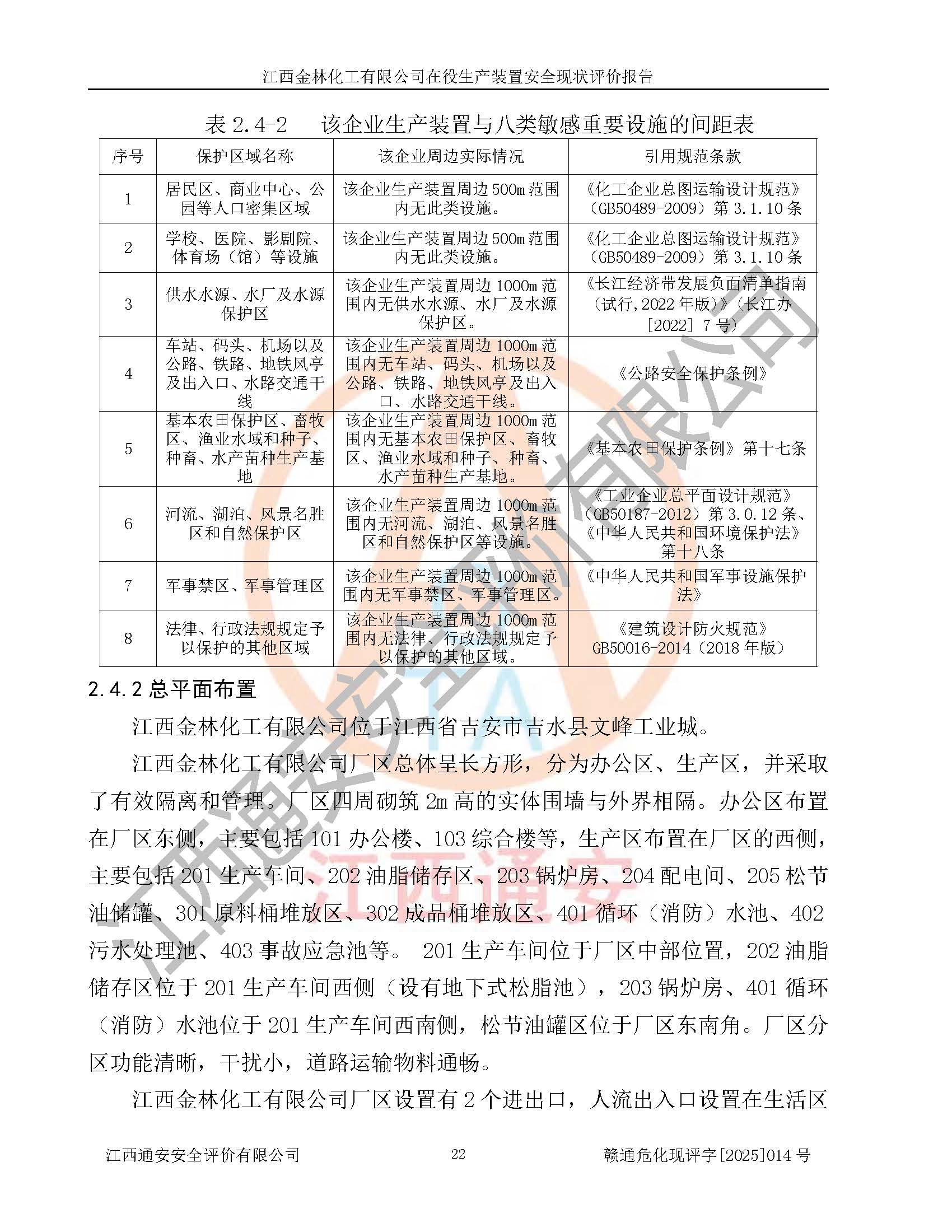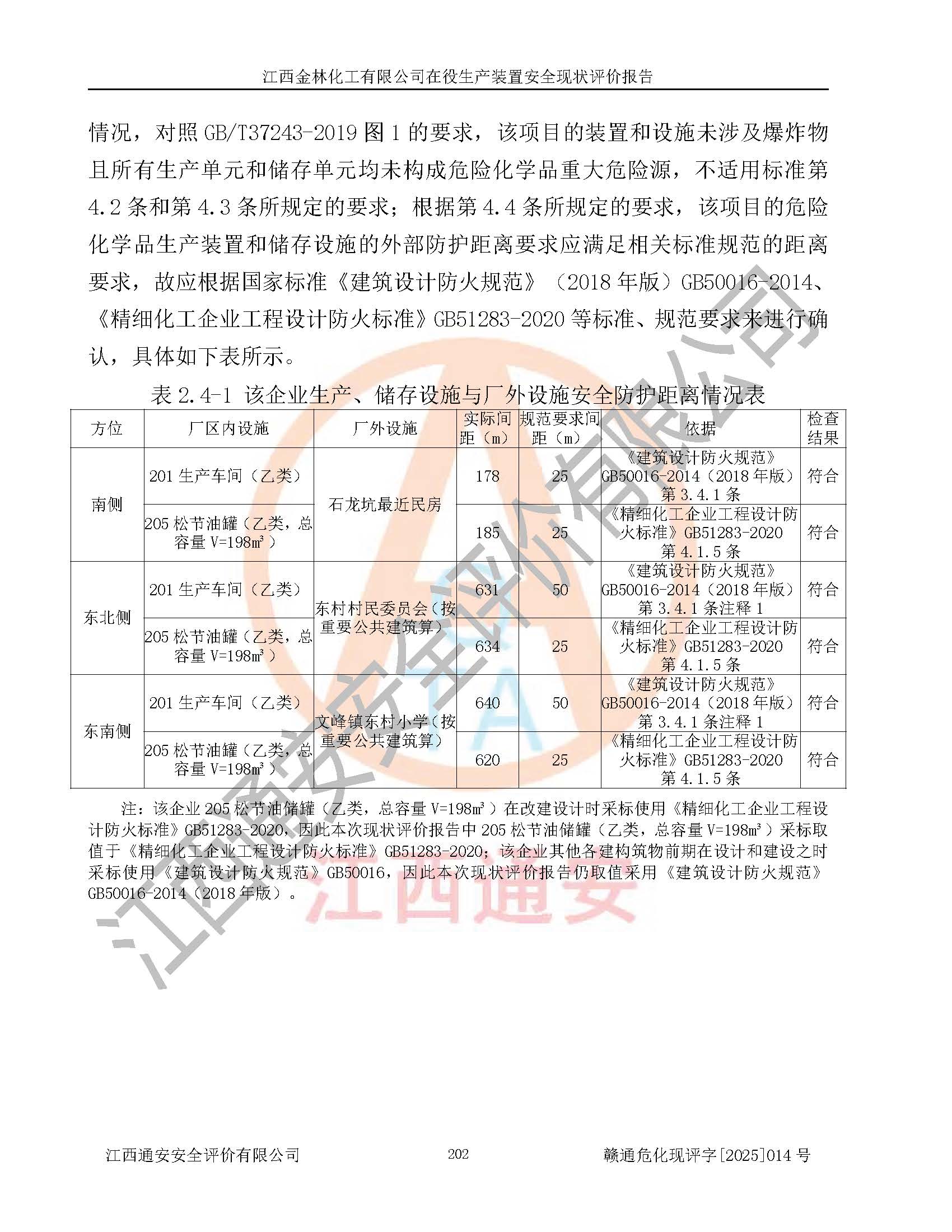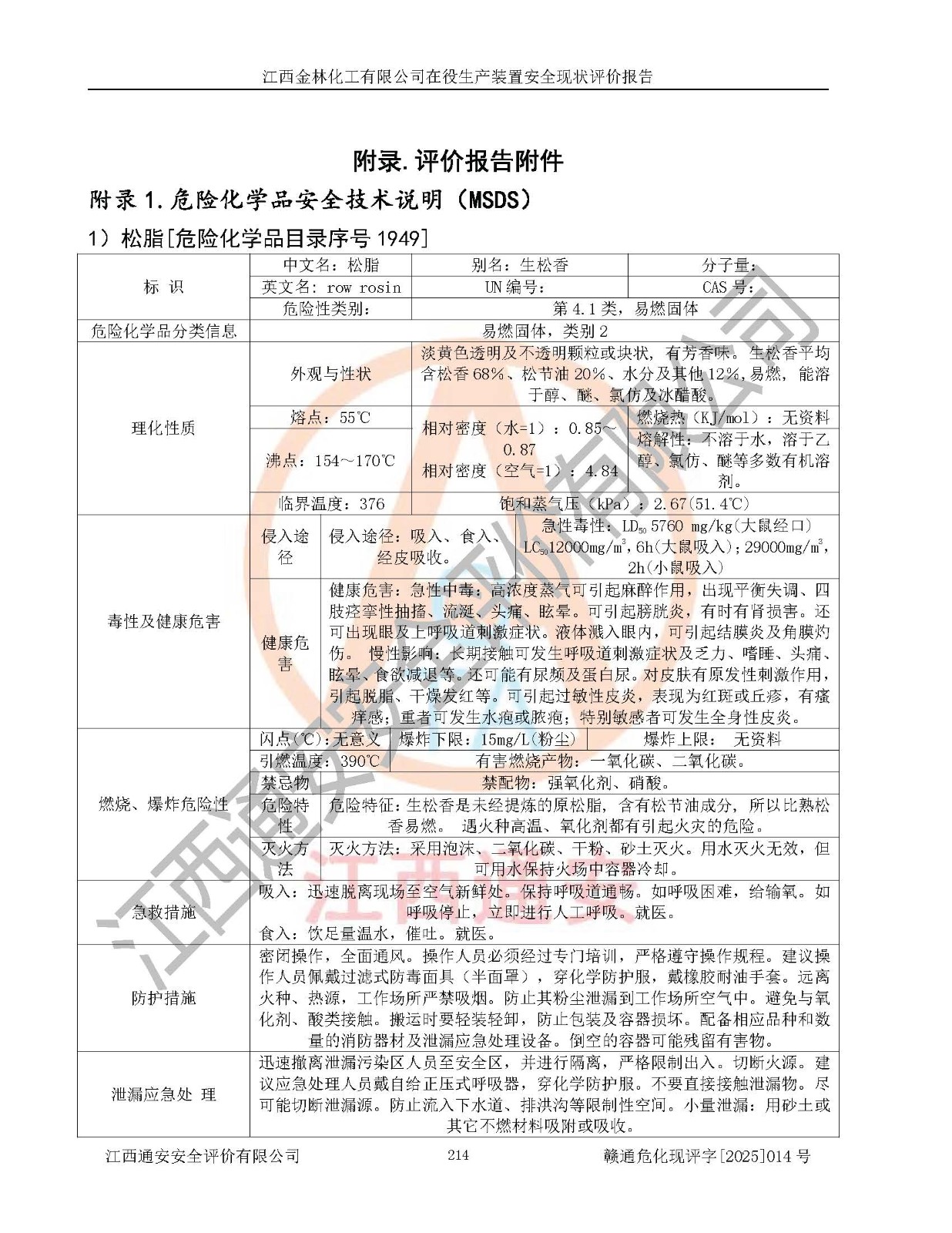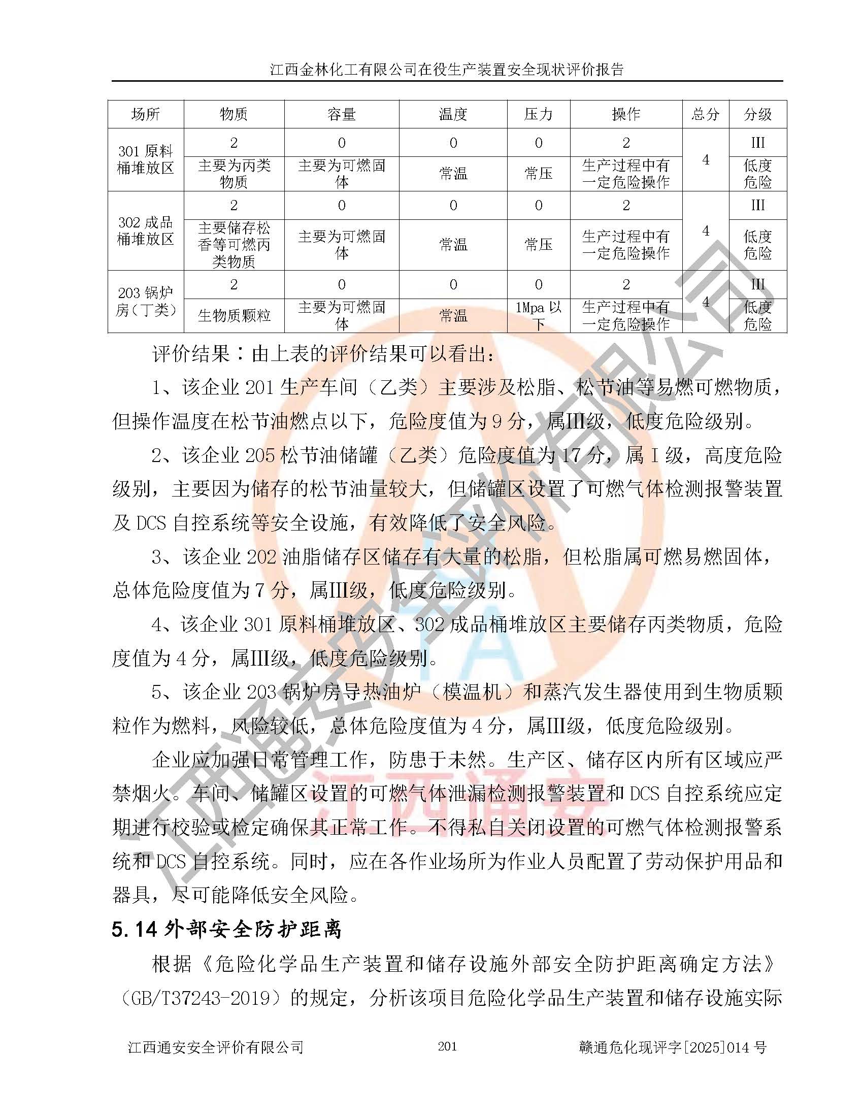 項(xiàng)目簡(jiǎn)介 | 江西金林化工有限公司成立于2003年6月26日,并取得吉水縣市場(chǎng)監(jiān)督管理局頒發(fā)的《營(yíng)業(yè)執(zhí)照》,營(yíng)業(yè)執(zhí)照統(tǒng)一社會(huì)信用代碼:91360822748530538B。公司注冊(cè)住所:江西省吉安市吉水縣文峰工業(yè)城。法定**人:湯光耀,注冊(cè)資本:貳仟零壹拾玖萬元整。企業(yè)類型:有限責(zé)任公司(自然人投資或控股)。經(jīng)營(yíng)范圍包括生產(chǎn)、銷售松節(jié)油、松香、林產(chǎn)化工產(chǎn)品、其它化工產(chǎn)品(含苯酚、甲醛)、橡膠產(chǎn)品、(憑化學(xué)危險(xiǎn)品經(jīng)營(yíng)許可證及消防安全檢查意見書經(jīng)營(yíng))、機(jī)械配件、紙張銷售。 江西金林化工有限公司于2022年8月23日進(jìn)行了安全生產(chǎn)許可證換證,取得江西省應(yīng)急管理廳頒發(fā)的《安全生產(chǎn)許可證》,許可證編號(hào)為:(贛)WH安許證字[2005]0118號(hào),許可范圍:松節(jié)油(2kt/a),**期2022年8月23日至2025年8月22日。 江西金林化工有限公司在役生產(chǎn)裝置為年產(chǎn)10000噸松香、2000噸松節(jié)油項(xiàng)目及其配套公用、輔助設(shè)施,主要產(chǎn)品有松香和松節(jié)油。 根據(jù)《危險(xiǎn)化學(xué)品目錄》(2015年版)、應(yīng)急管理部辦公廳關(guān)于修改《危險(xiǎn)化學(xué)品目錄(2015年版)實(shí)施指南(試行)》涉及柴油部分內(nèi)容的通知(應(yīng)急廳函〔2022〕300號(hào))和《應(yīng)急管理部工業(yè)和信息化部公安部生態(tài)環(huán)境部交通運(yùn)輸部農(nóng)業(yè)農(nóng)村部衛(wèi)生健康委市場(chǎng)監(jiān)管總局鐵路局民航局公告》2022年第8號(hào)《決定調(diào)整《危險(xiǎn)化學(xué)品目錄(2015版)》,將“1674柴油〔閉杯閃點(diǎn)≤60℃〕”調(diào)整為“1674柴油”》的文件規(guī)定,對(duì)該企業(yè)生產(chǎn)過程中所涉及的化學(xué)品進(jìn)行辨識(shí):該企業(yè)涉及的危險(xiǎn)化學(xué)品有:松脂、松節(jié)油、柴油(發(fā)電機(jī)燃料)等。 | |||