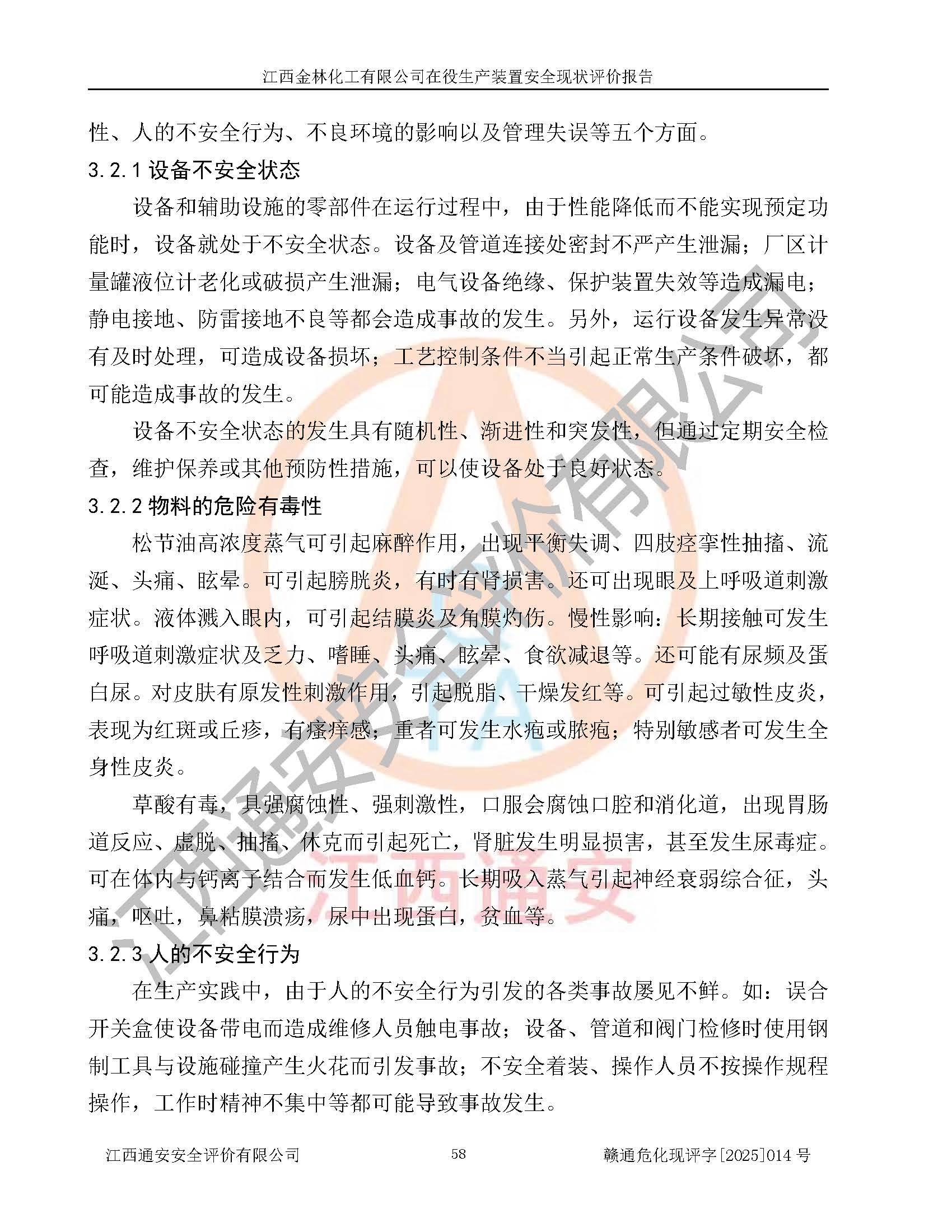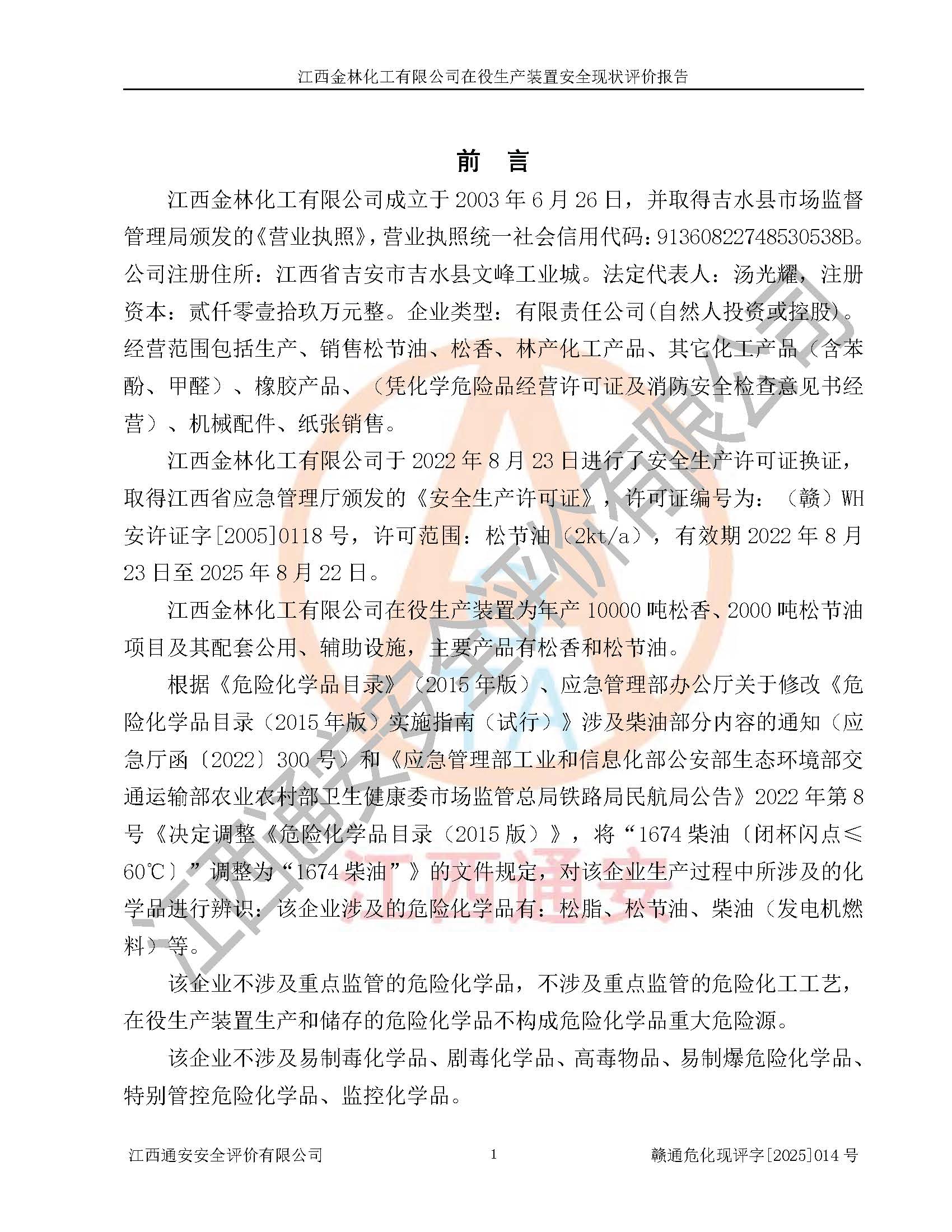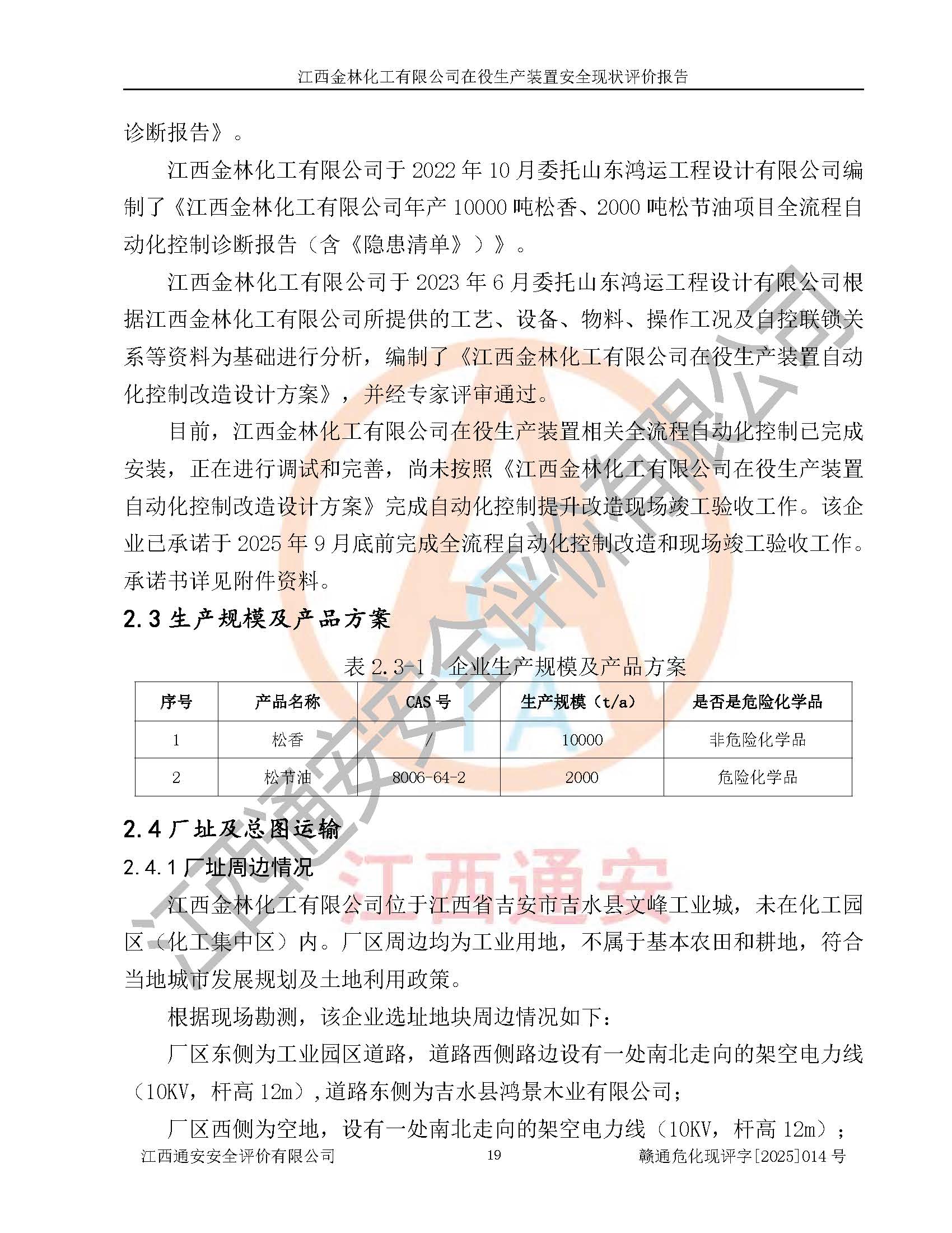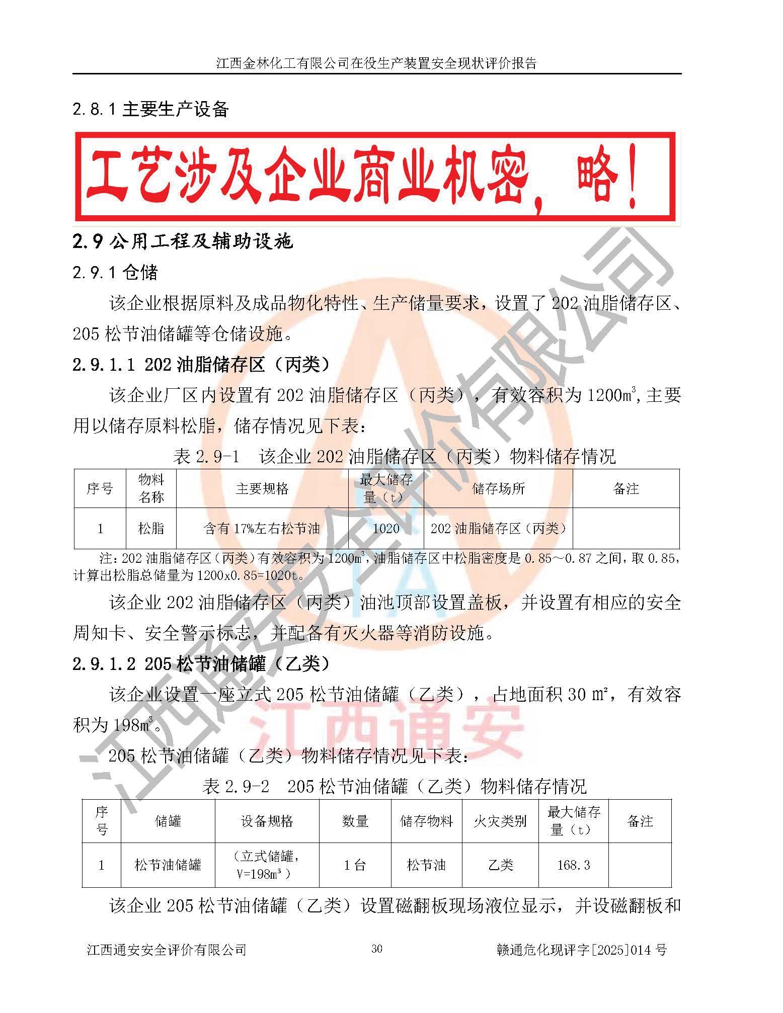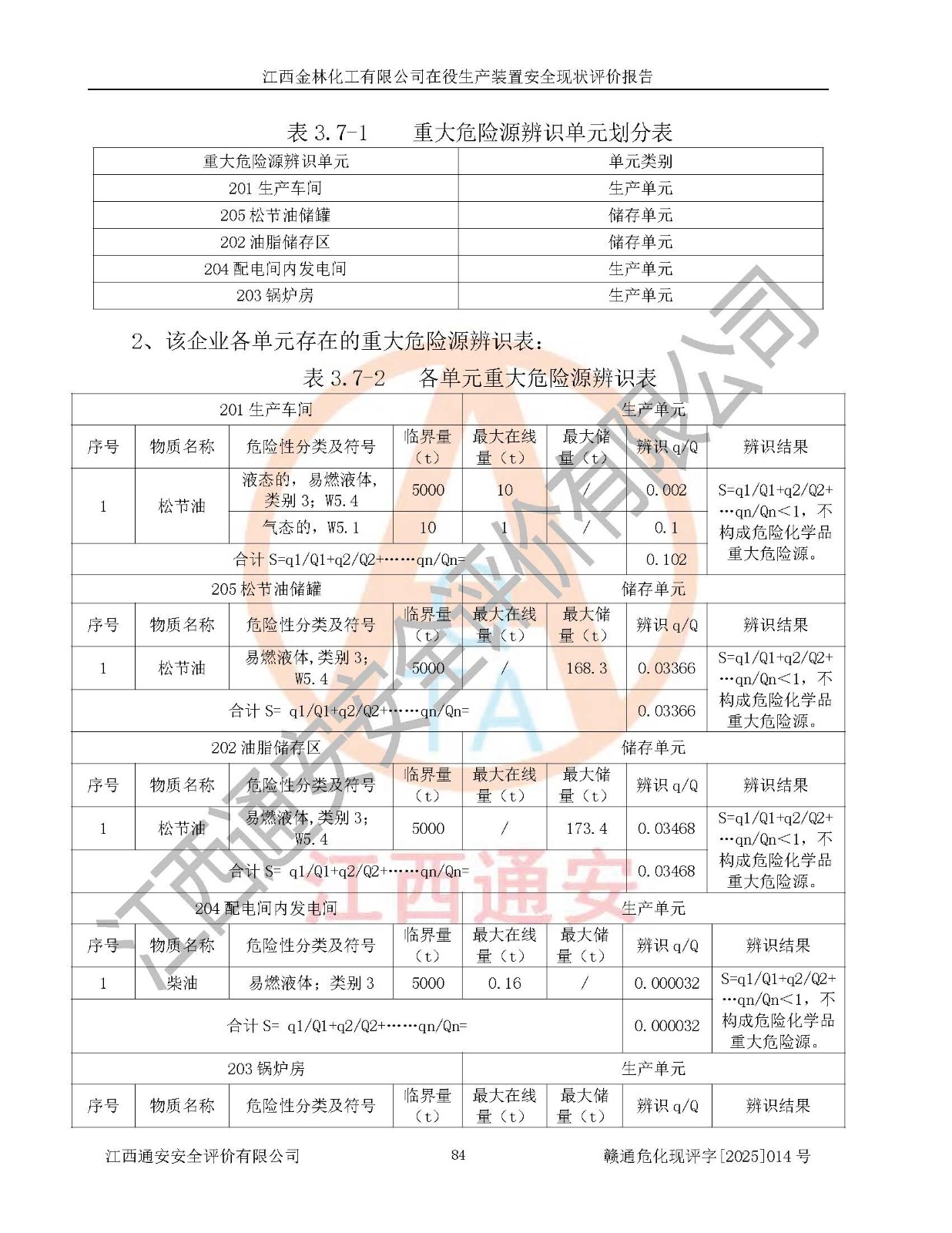 項(xiàng)目簡(jiǎn)介 | 江西金林化工有限公司成立于2003年6月26日,并取得吉水縣市場(chǎng)監(jiān)督管理局頒發(fā)的《營(yíng)業(yè)執(zhí)照》,營(yíng)業(yè)執(zhí)照統(tǒng)一社會(huì)信用代碼:91360822748530538B。公司注冊(cè)住所:江西省吉安市吉水縣文峰工業(yè)城。法定**人:湯光耀,注冊(cè)資本:貳仟零壹拾玖萬元整。企業(yè)類型:有限責(zé)任公司(自然人投資或控股)。經(jīng)營(yíng)范圍包括生產(chǎn)、銷售松節(jié)油、松香、林產(chǎn)化工產(chǎn)品、其它化工產(chǎn)品(含苯酚、甲醛)、橡膠產(chǎn)品、(憑化學(xué)危險(xiǎn)品經(jīng)營(yíng)許可證及消防安全檢查意見書經(jīng)營(yíng))、機(jī)械配件、紙張銷售。 江西金林化工有限公司于2022年8月23日進(jìn)行了安全生產(chǎn)許可證換證,取得江西省應(yīng)急管理廳頒發(fā)的《安全生產(chǎn)許可證》,許可證編號(hào)為:(贛)WH安許證字[2005]0118號(hào),許可范圍:松節(jié)油(2kt/a),**期2022年8月23日至2025年8月22日。 江西金林化工有限公司在役生產(chǎn)裝置為年產(chǎn)10000噸松香、2000噸松節(jié)油項(xiàng)目及其配套公用、輔助設(shè)施,主要產(chǎn)品有松香和松節(jié)油。 根據(jù)《危險(xiǎn)化學(xué)品目錄》(2015年版)、應(yīng)急管理部辦公廳關(guān)于修改《危險(xiǎn)化學(xué)品目錄(2015年版)實(shí)施指南(試行)》涉及柴油部分內(nèi)容的通知(應(yīng)急廳函〔2022〕300號(hào))和《應(yīng)急管理部工業(yè)和信息化部公安部生態(tài)環(huán)境部交通運(yùn)輸部農(nóng)業(yè)農(nóng)村部衛(wèi)生健康委市場(chǎng)監(jiān)管總局鐵路局民航局公告》2022年第8號(hào)《決定調(diào)整《危險(xiǎn)化學(xué)品目錄(2015版)》,將“1674柴油〔閉杯閃點(diǎn)≤60℃〕”調(diào)整為“1674柴油”》的文件規(guī)定,對(duì)該企業(yè)生產(chǎn)過程中所涉及的化學(xué)品進(jìn)行辨識(shí):該企業(yè)涉及的危險(xiǎn)化學(xué)品有:松脂、松節(jié)油、柴油(發(fā)電機(jī)燃料)等。 | |||