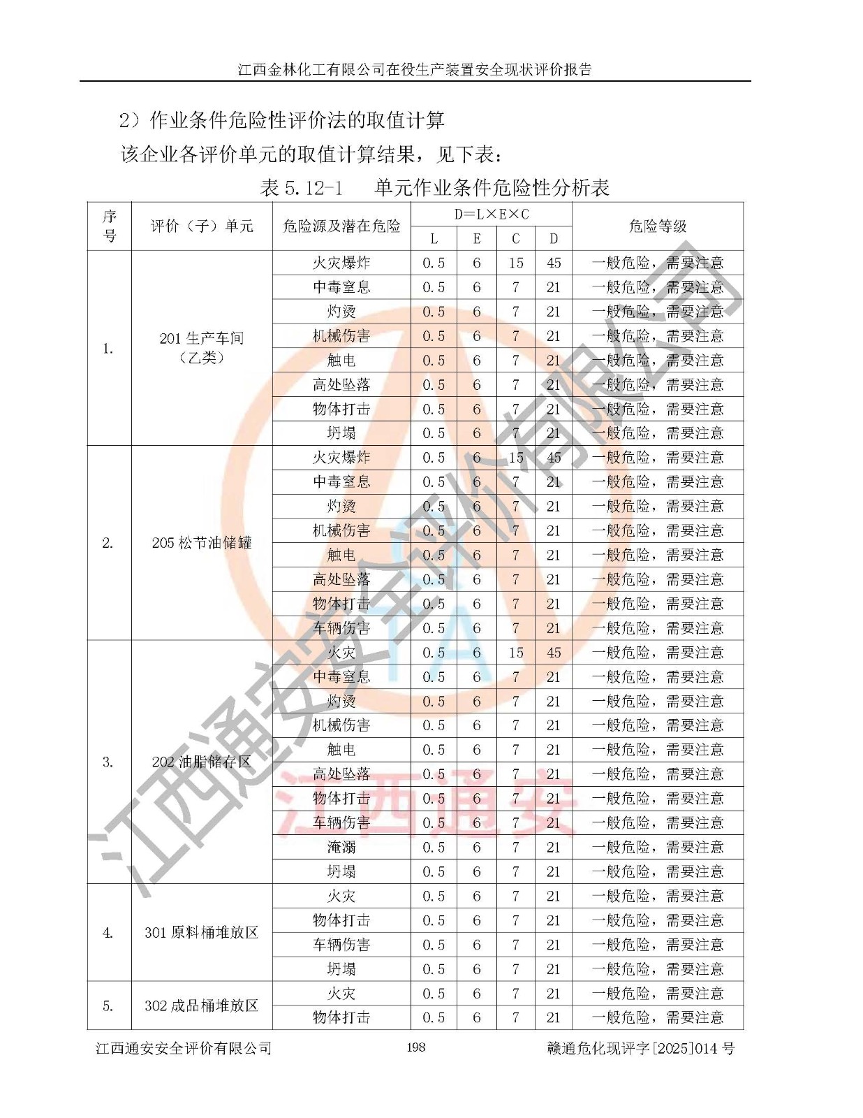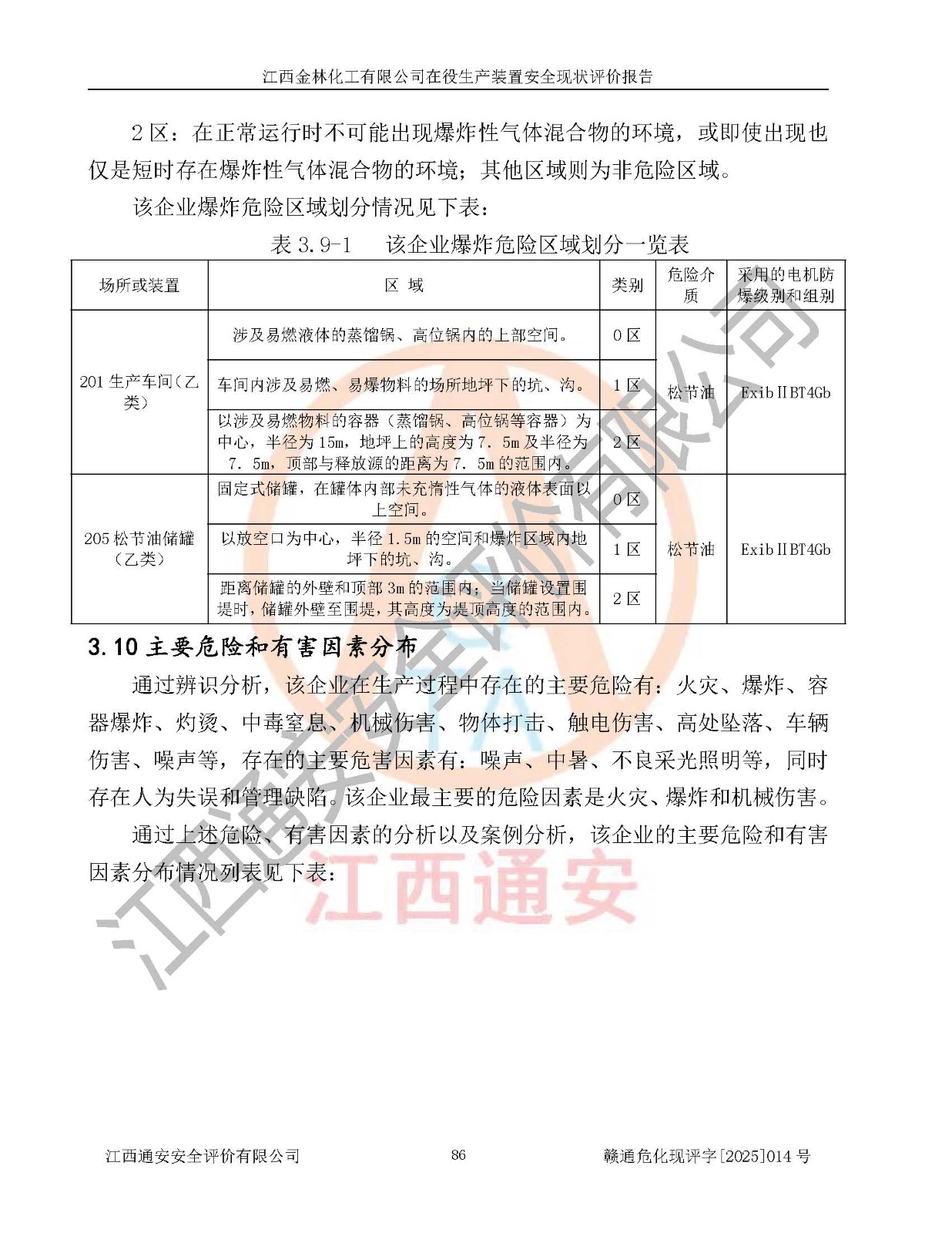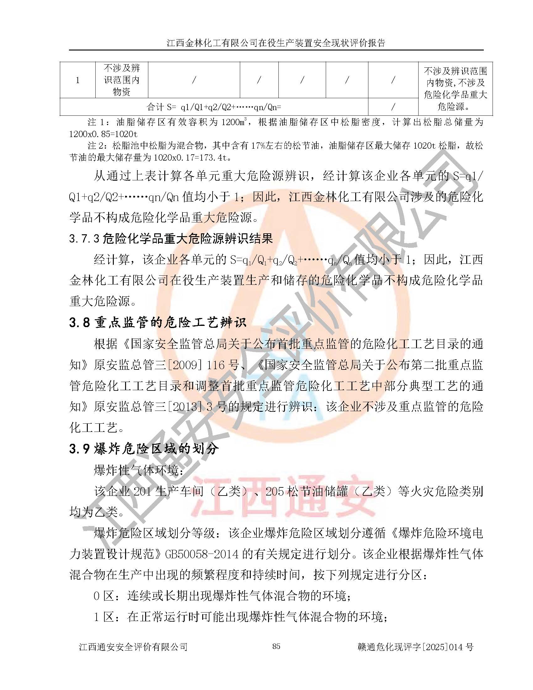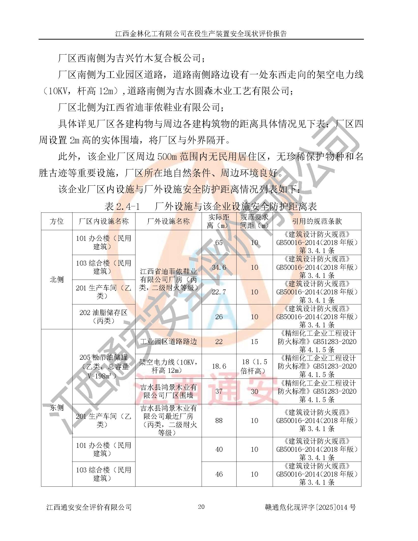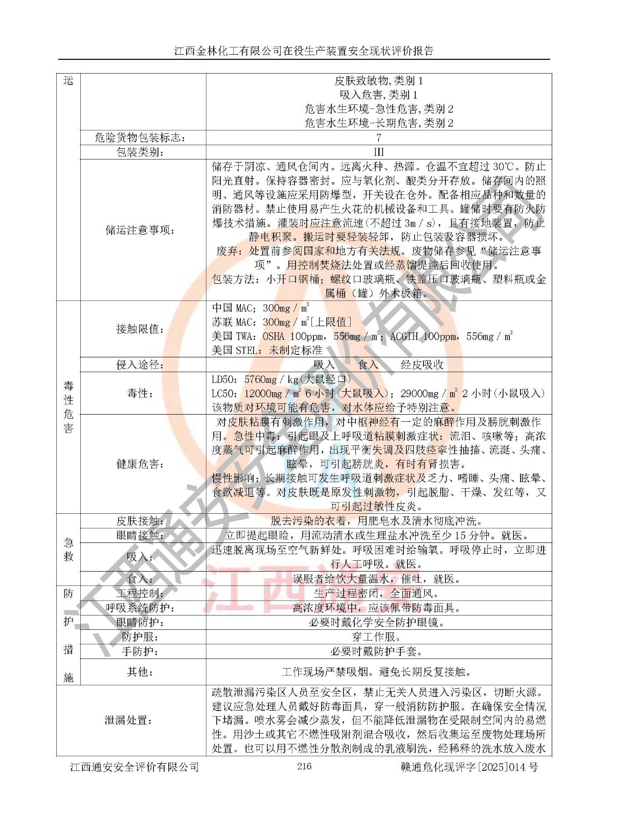 項(xiàng)目簡(jiǎn)介 | 江西金林化工有限公司成立于2003年6月26日,并取得吉水縣市場(chǎng)監(jiān)督管理局頒發(fā)的《營(yíng)業(yè)執(zhí)照》,營(yíng)業(yè)執(zhí)照統(tǒng)一社會(huì)信用代碼:91360822748530538B。公司注冊(cè)住所:江西省吉安市吉水縣文峰工業(yè)城。法定**人:湯光耀,注冊(cè)資本:貳仟零壹拾玖萬元整。企業(yè)類型:有限責(zé)任公司(自然人投資或控股)。經(jīng)營(yíng)范圍包括生產(chǎn)、銷售松節(jié)油、松香、林產(chǎn)化工產(chǎn)品、其它化工產(chǎn)品(含苯酚、甲醛)、橡膠產(chǎn)品、(憑化學(xué)危險(xiǎn)品經(jīng)營(yíng)許可證及消防安全檢查意見書經(jīng)營(yíng))、機(jī)械配件、紙張銷售。 江西金林化工有限公司于2022年8月23日進(jìn)行了安全生產(chǎn)許可證換證,取得江西省應(yīng)急管理廳頒發(fā)的《安全生產(chǎn)許可證》,許可證編號(hào)為:(贛)WH安許證字[2005]0118號(hào),許可范圍:松節(jié)油(2kt/a),**期2022年8月23日至2025年8月22日。 江西金林化工有限公司在役生產(chǎn)裝置為年產(chǎn)10000噸松香、2000噸松節(jié)油項(xiàng)目及其配套公用、輔助設(shè)施,主要產(chǎn)品有松香和松節(jié)油。 根據(jù)《危險(xiǎn)化學(xué)品目錄》(2015年版)、應(yīng)急管理部辦公廳關(guān)于修改《危險(xiǎn)化學(xué)品目錄(2015年版)實(shí)施指南(試行)》涉及柴油部分內(nèi)容的通知(應(yīng)急廳函〔2022〕300號(hào))和《應(yīng)急管理部工業(yè)和信息化部公安部生態(tài)環(huán)境部交通運(yùn)輸部農(nóng)業(yè)農(nóng)村部衛(wèi)生健康委市場(chǎng)監(jiān)管總局鐵路局民航局公告》2022年第8號(hào)《決定調(diào)整《危險(xiǎn)化學(xué)品目錄(2015版)》,將“1674柴油〔閉杯閃點(diǎn)≤60℃〕”調(diào)整為“1674柴油”》的文件規(guī)定,對(duì)該企業(yè)生產(chǎn)過程中所涉及的化學(xué)品進(jìn)行辨識(shí):該企業(yè)涉及的危險(xiǎn)化學(xué)品有:松脂、松節(jié)油、柴油(發(fā)電機(jī)燃料)等。 | |||