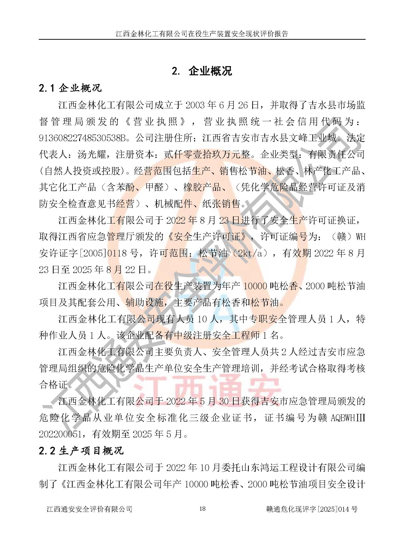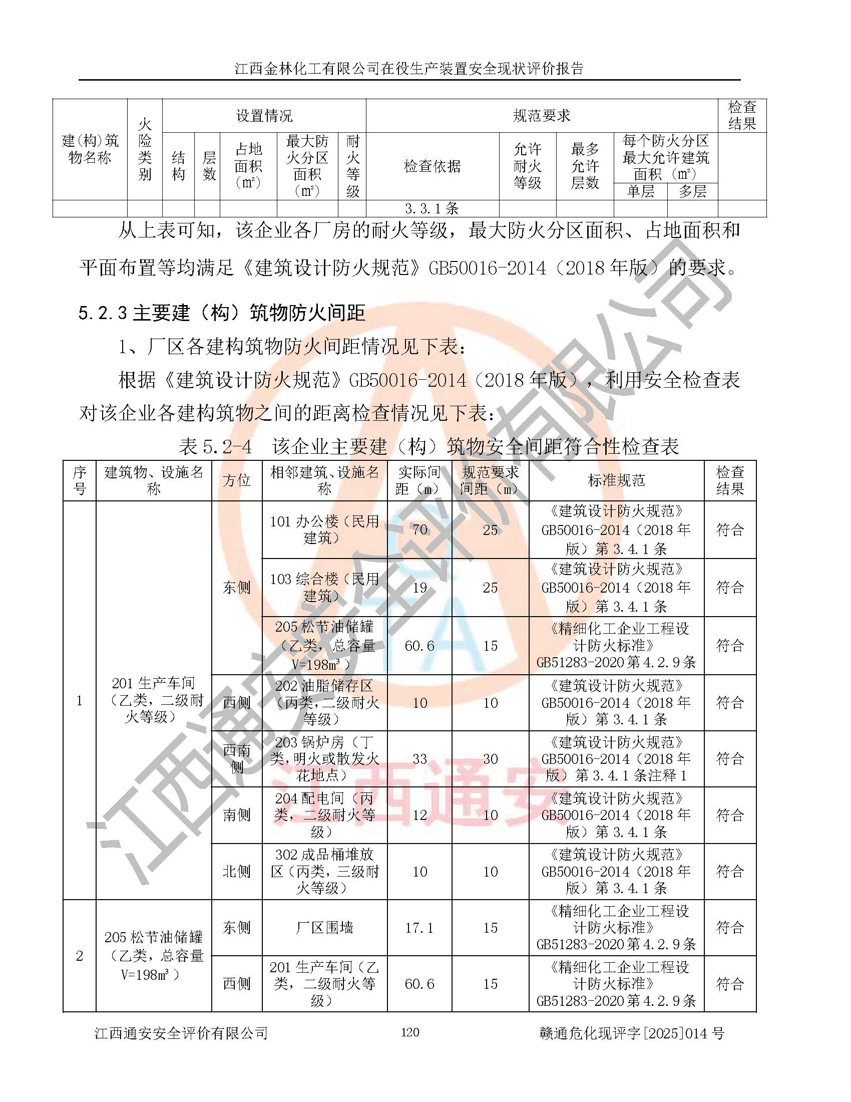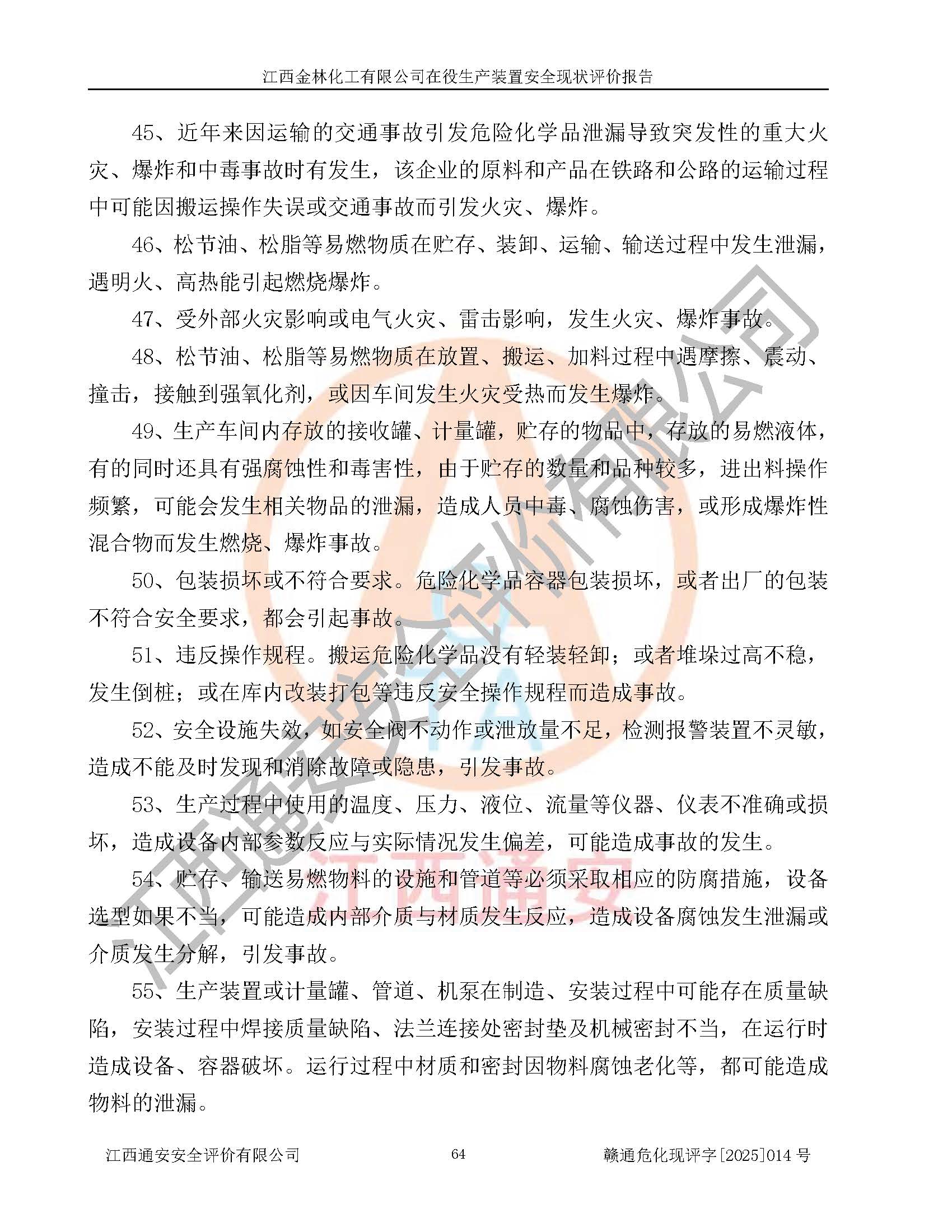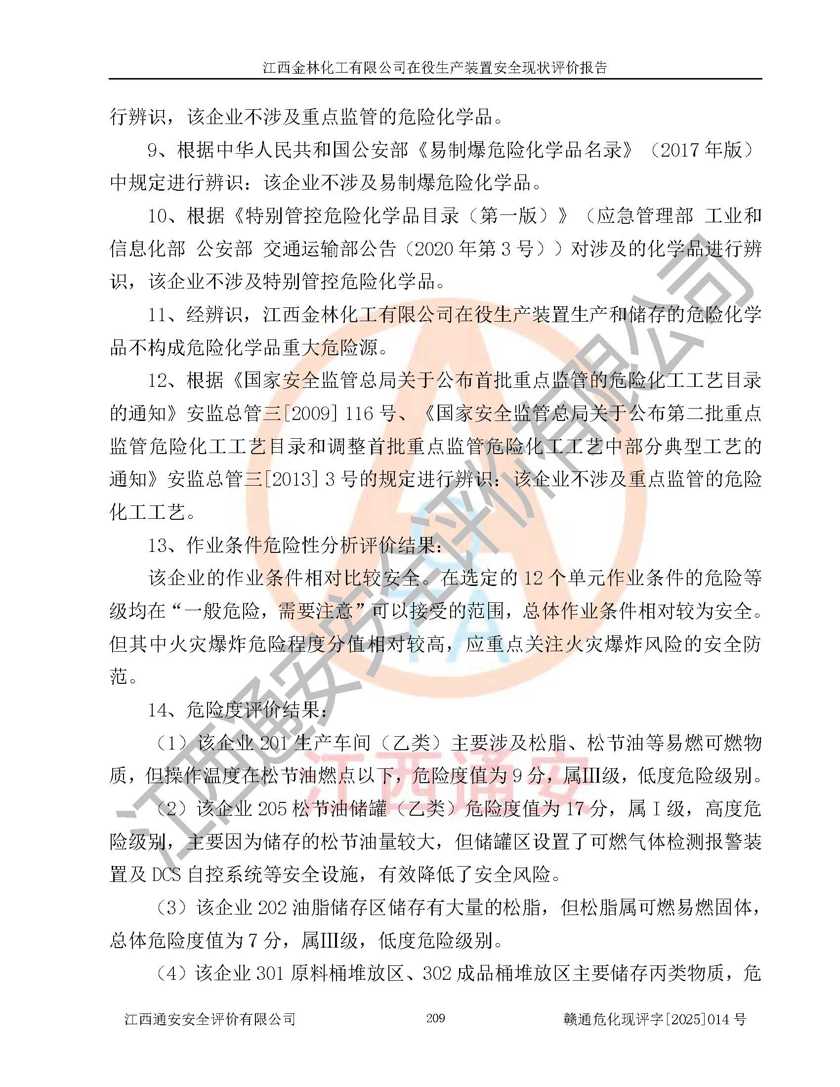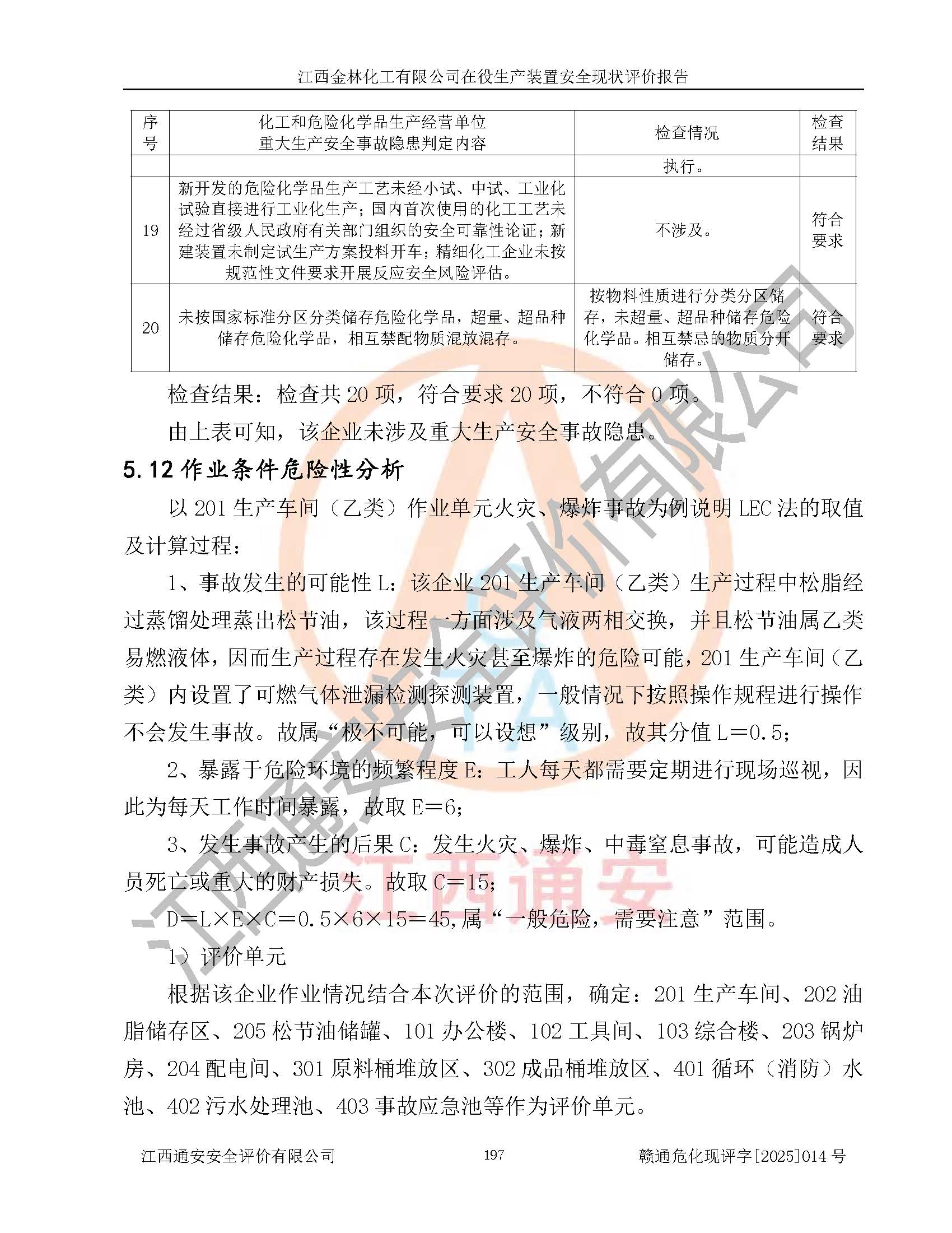 項(xiàng)目簡(jiǎn)介 | 江西金林化工有限公司成立于2003年6月26日,并取得吉水縣市場(chǎng)監(jiān)督管理局頒發(fā)的《營(yíng)業(yè)執(zhí)照》,營(yíng)業(yè)執(zhí)照統(tǒng)一社會(huì)信用代碼:91360822748530538B。公司注冊(cè)住所:江西省吉安市吉水縣文峰工業(yè)城。法定**人:湯光耀,注冊(cè)資本:貳仟零壹拾玖萬元整。企業(yè)類型:有限責(zé)任公司(自然人投資或控股)。經(jīng)營(yíng)范圍包括生產(chǎn)、銷售松節(jié)油、松香、林產(chǎn)化工產(chǎn)品、其它化工產(chǎn)品(含苯酚、甲醛)、橡膠產(chǎn)品、(憑化學(xué)危險(xiǎn)品經(jīng)營(yíng)許可證及消防安全檢查意見書經(jīng)營(yíng))、機(jī)械配件、紙張銷售。 江西金林化工有限公司于2022年8月23日進(jìn)行了安全生產(chǎn)許可證換證,取得江西省應(yīng)急管理廳頒發(fā)的《安全生產(chǎn)許可證》,許可證編號(hào)為:(贛)WH安許證字[2005]0118號(hào),許可范圍:松節(jié)油(2kt/a),**期2022年8月23日至2025年8月22日。 江西金林化工有限公司在役生產(chǎn)裝置為年產(chǎn)10000噸松香、2000噸松節(jié)油項(xiàng)目及其配套公用、輔助設(shè)施,主要產(chǎn)品有松香和松節(jié)油。 根據(jù)《危險(xiǎn)化學(xué)品目錄》(2015年版)、應(yīng)急管理部辦公廳關(guān)于修改《危險(xiǎn)化學(xué)品目錄(2015年版)實(shí)施指南(試行)》涉及柴油部分內(nèi)容的通知(應(yīng)急廳函〔2022〕300號(hào))和《應(yīng)急管理部工業(yè)和信息化部公安部生態(tài)環(huán)境部交通運(yùn)輸部農(nóng)業(yè)農(nóng)村部衛(wèi)生健康委市場(chǎng)監(jiān)管總局鐵路局民航局公告》2022年第8號(hào)《決定調(diào)整《危險(xiǎn)化學(xué)品目錄(2015版)》,將“1674柴油〔閉杯閃點(diǎn)≤60℃〕”調(diào)整為“1674柴油”》的文件規(guī)定,對(duì)該企業(yè)生產(chǎn)過程中所涉及的化學(xué)品進(jìn)行辨識(shí):該企業(yè)涉及的危險(xiǎn)化學(xué)品有:松脂、松節(jié)油、柴油(發(fā)電機(jī)燃料)等。 | |||