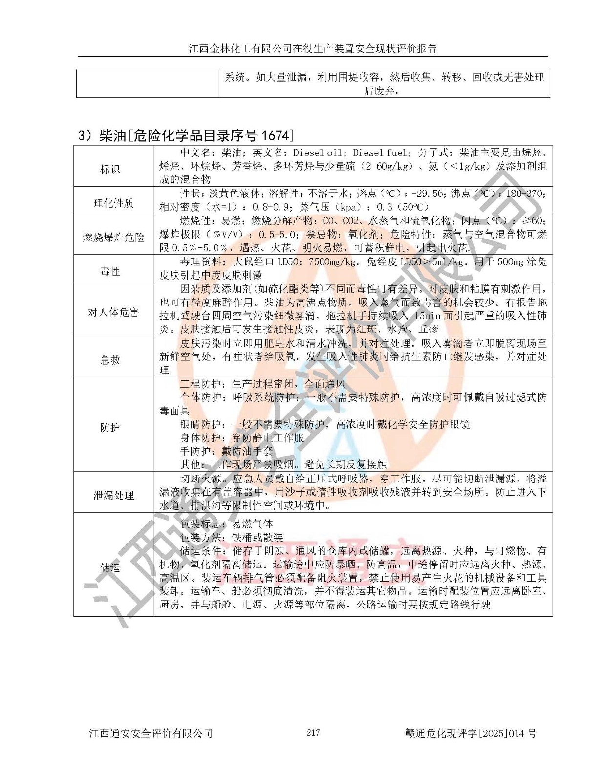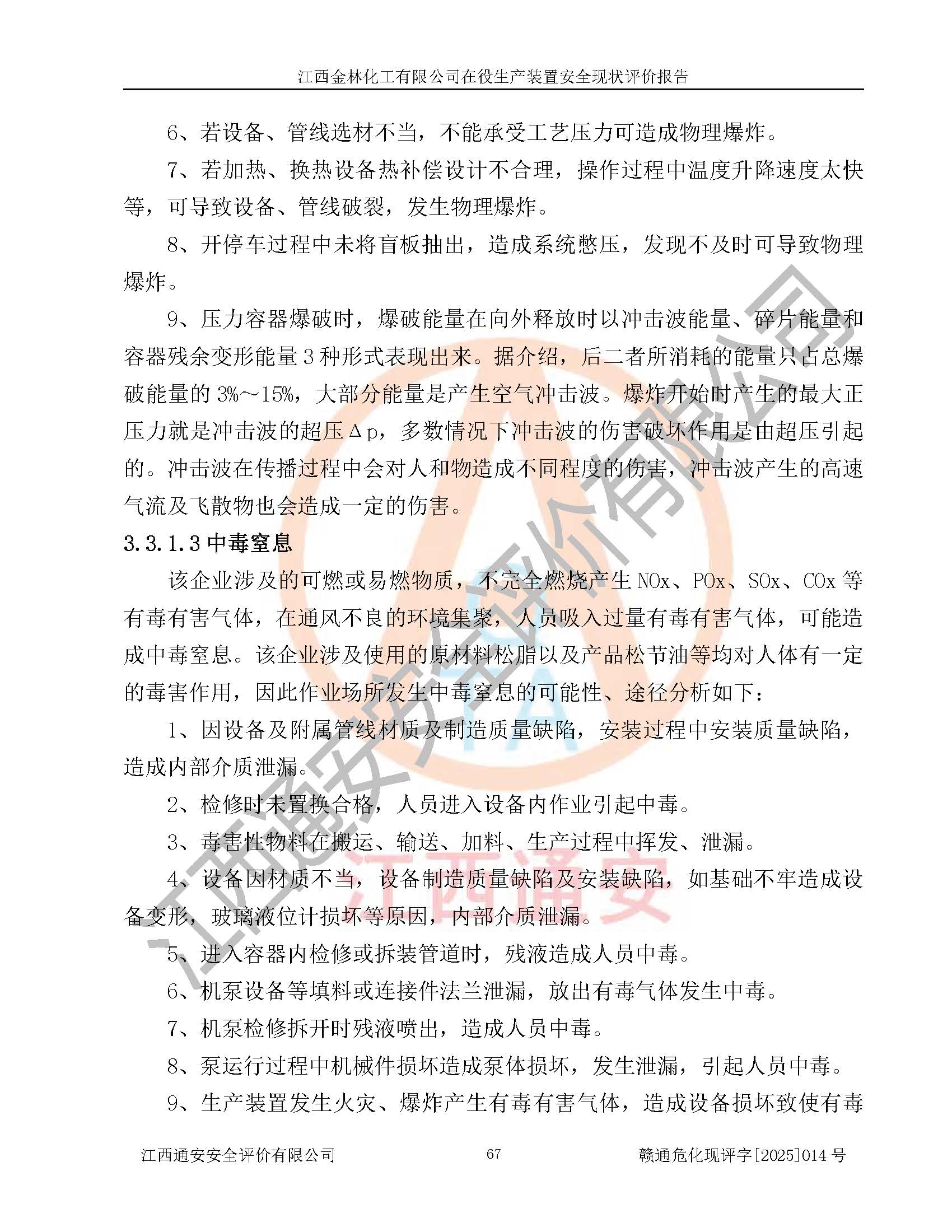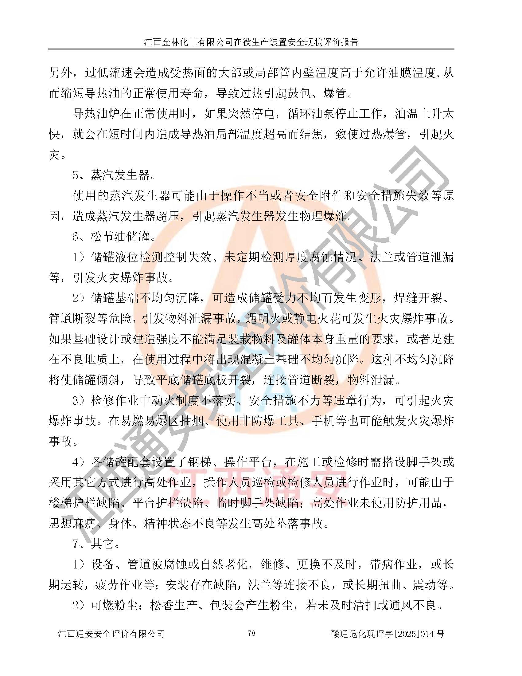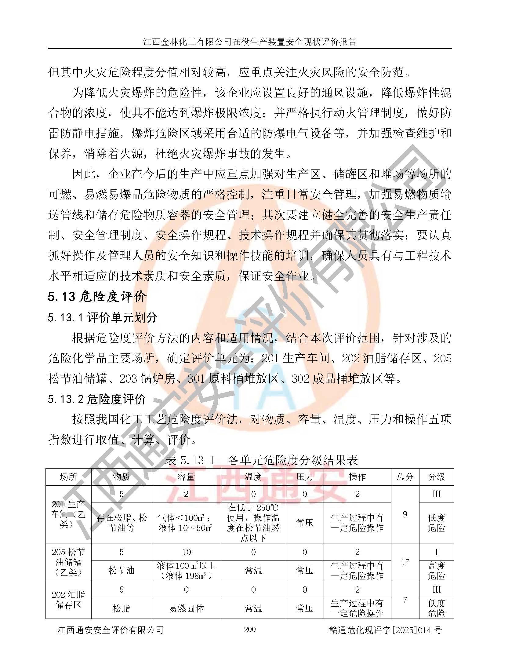 項(xiàng)目簡(jiǎn)介 | 江西金林化工有限公司成立于2003年6月26日,并取得吉水縣市場(chǎng)監(jiān)督管理局頒發(fā)的《營(yíng)業(yè)執(zhí)照》,營(yíng)業(yè)執(zhí)照統(tǒng)一社會(huì)信用代碼:91360822748530538B。公司注冊(cè)住所:江西省吉安市吉水縣文峰工業(yè)城。法定**人:湯光耀,注冊(cè)資本:貳仟零壹拾玖萬元整。企業(yè)類型:有限責(zé)任公司(自然人投資或控股)。經(jīng)營(yíng)范圍包括生產(chǎn)、銷售松節(jié)油、松香、林產(chǎn)化工產(chǎn)品、其它化工產(chǎn)品(含苯酚、甲醛)、橡膠產(chǎn)品、(憑化學(xué)危險(xiǎn)品經(jīng)營(yíng)許可證及消防安全檢查意見書經(jīng)營(yíng))、機(jī)械配件、紙張銷售。 江西金林化工有限公司于2022年8月23日進(jìn)行了安全生產(chǎn)許可證換證,取得江西省應(yīng)急管理廳頒發(fā)的《安全生產(chǎn)許可證》,許可證編號(hào)為:(贛)WH安許證字[2005]0118號(hào),許可范圍:松節(jié)油(2kt/a),**期2022年8月23日至2025年8月22日。 江西金林化工有限公司在役生產(chǎn)裝置為年產(chǎn)10000噸松香、2000噸松節(jié)油項(xiàng)目及其配套公用、輔助設(shè)施,主要產(chǎn)品有松香和松節(jié)油。 根據(jù)《危險(xiǎn)化學(xué)品目錄》(2015年版)、應(yīng)急管理部辦公廳關(guān)于修改《危險(xiǎn)化學(xué)品目錄(2015年版)實(shí)施指南(試行)》涉及柴油部分內(nèi)容的通知(應(yīng)急廳函〔2022〕300號(hào))和《應(yīng)急管理部工業(yè)和信息化部公安部生態(tài)環(huán)境部交通運(yùn)輸部農(nóng)業(yè)農(nóng)村部衛(wèi)生健康委市場(chǎng)監(jiān)管總局鐵路局民航局公告》2022年第8號(hào)《決定調(diào)整《危險(xiǎn)化學(xué)品目錄(2015版)》,將“1674柴油〔閉杯閃點(diǎn)≤60℃〕”調(diào)整為“1674柴油”》的文件規(guī)定,對(duì)該企業(yè)生產(chǎn)過程中所涉及的化學(xué)品進(jìn)行辨識(shí):該企業(yè)涉及的危險(xiǎn)化學(xué)品有:松脂、松節(jié)油、柴油(發(fā)電機(jī)燃料)等。 | |||