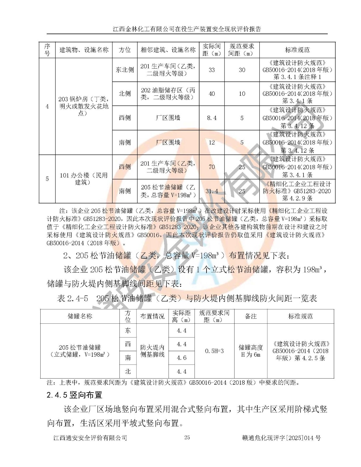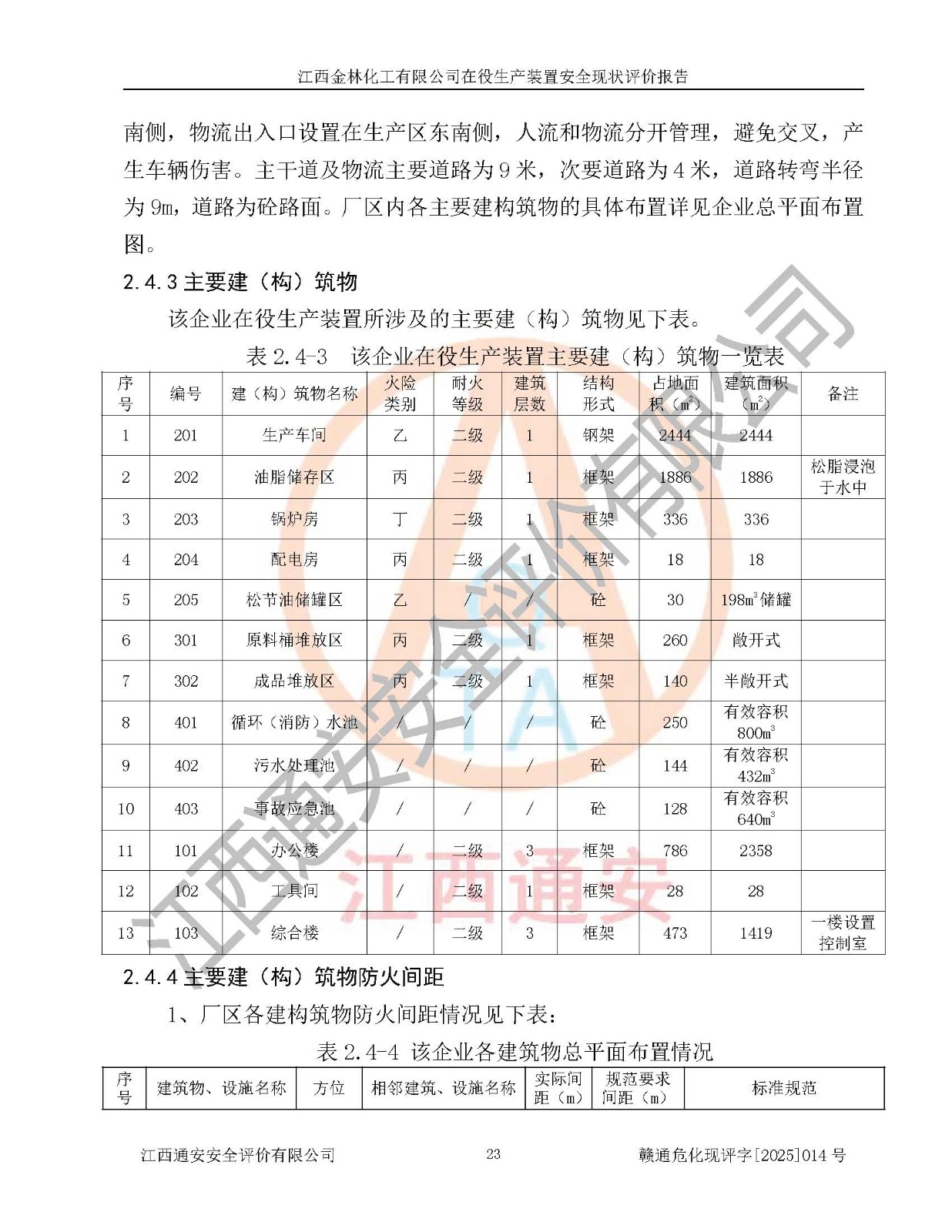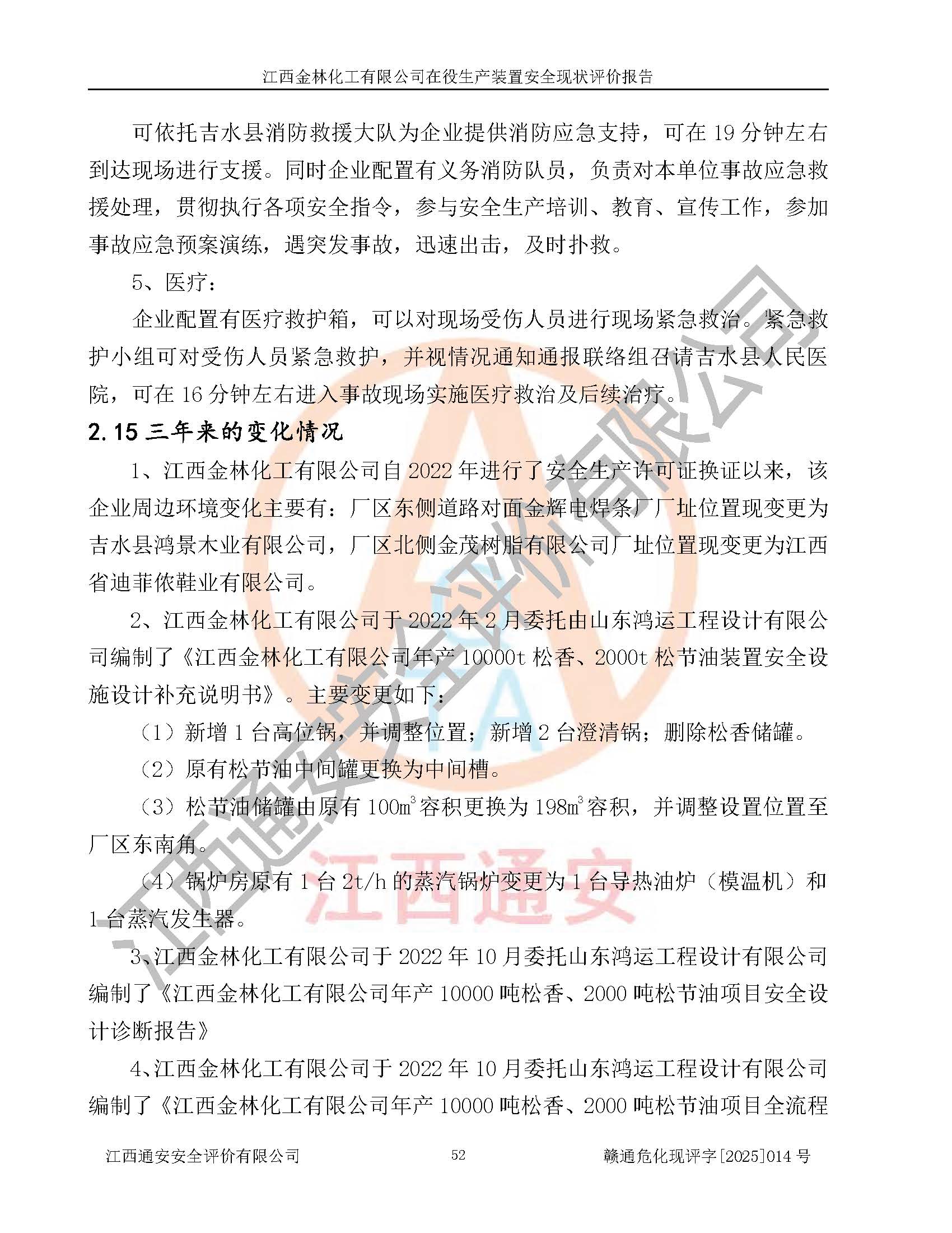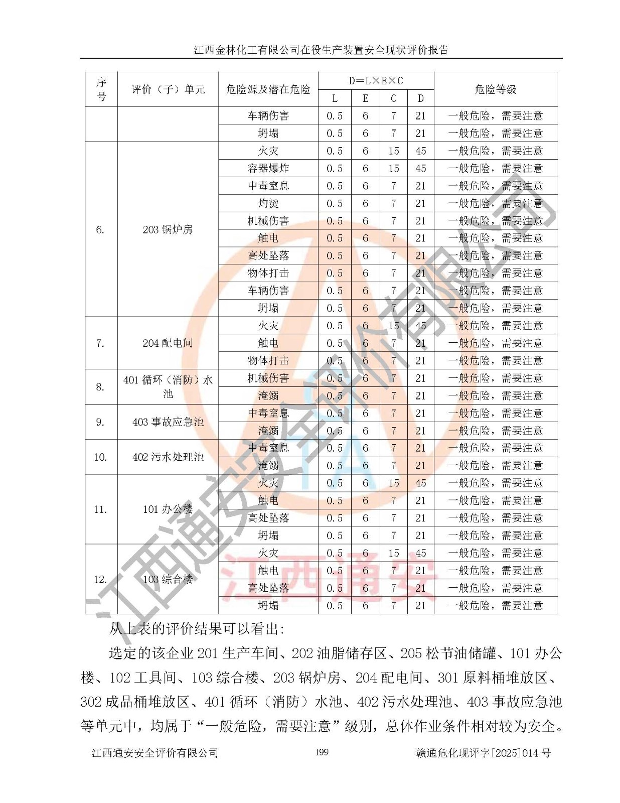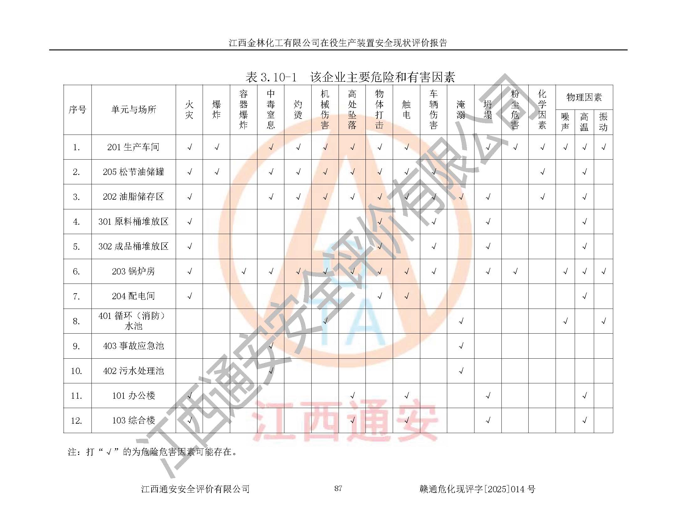 項(xiàng)目簡(jiǎn)介 | 江西金林化工有限公司成立于2003年6月26日,并取得吉水縣市場(chǎng)監(jiān)督管理局頒發(fā)的《營(yíng)業(yè)執(zhí)照》,營(yíng)業(yè)執(zhí)照統(tǒng)一社會(huì)信用代碼:91360822748530538B。公司注冊(cè)住所:江西省吉安市吉水縣文峰工業(yè)城。法定**人:湯光耀,注冊(cè)資本:貳仟零壹拾玖萬元整。企業(yè)類型:有限責(zé)任公司(自然人投資或控股)。經(jīng)營(yíng)范圍包括生產(chǎn)、銷售松節(jié)油、松香、林產(chǎn)化工產(chǎn)品、其它化工產(chǎn)品(含苯酚、甲醛)、橡膠產(chǎn)品、(憑化學(xué)危險(xiǎn)品經(jīng)營(yíng)許可證及消防安全檢查意見書經(jīng)營(yíng))、機(jī)械配件、紙張銷售。 江西金林化工有限公司于2022年8月23日進(jìn)行了安全生產(chǎn)許可證換證,取得江西省應(yīng)急管理廳頒發(fā)的《安全生產(chǎn)許可證》,許可證編號(hào)為:(贛)WH安許證字[2005]0118號(hào),許可范圍:松節(jié)油(2kt/a),**期2022年8月23日至2025年8月22日。 江西金林化工有限公司在役生產(chǎn)裝置為年產(chǎn)10000噸松香、2000噸松節(jié)油項(xiàng)目及其配套公用、輔助設(shè)施,主要產(chǎn)品有松香和松節(jié)油。 根據(jù)《危險(xiǎn)化學(xué)品目錄》(2015年版)、應(yīng)急管理部辦公廳關(guān)于修改《危險(xiǎn)化學(xué)品目錄(2015年版)實(shí)施指南(試行)》涉及柴油部分內(nèi)容的通知(應(yīng)急廳函〔2022〕300號(hào))和《應(yīng)急管理部工業(yè)和信息化部公安部生態(tài)環(huán)境部交通運(yùn)輸部農(nóng)業(yè)農(nóng)村部衛(wèi)生健康委市場(chǎng)監(jiān)管總局鐵路局民航局公告》2022年第8號(hào)《決定調(diào)整《危險(xiǎn)化學(xué)品目錄(2015版)》,將“1674柴油〔閉杯閃點(diǎn)≤60℃〕”調(diào)整為“1674柴油”》的文件規(guī)定,對(duì)該企業(yè)生產(chǎn)過程中所涉及的化學(xué)品進(jìn)行辨識(shí):該企業(yè)涉及的危險(xiǎn)化學(xué)品有:松脂、松節(jié)油、柴油(發(fā)電機(jī)燃料)等。 | |||