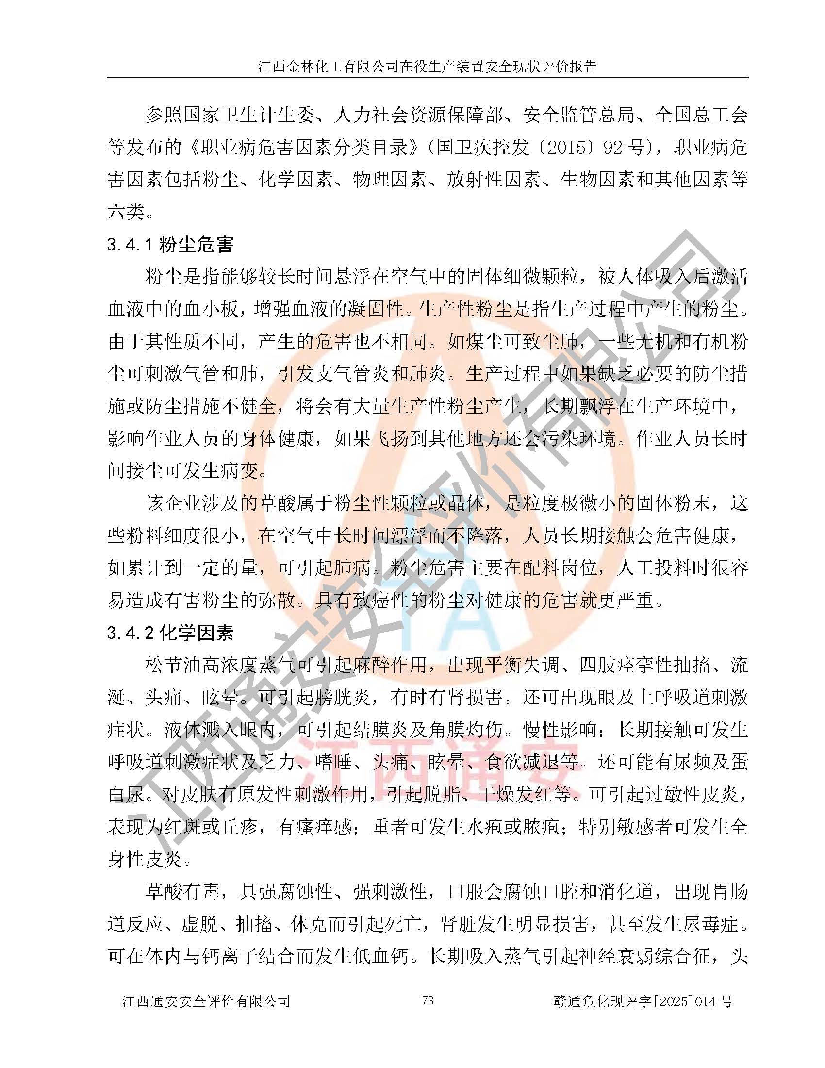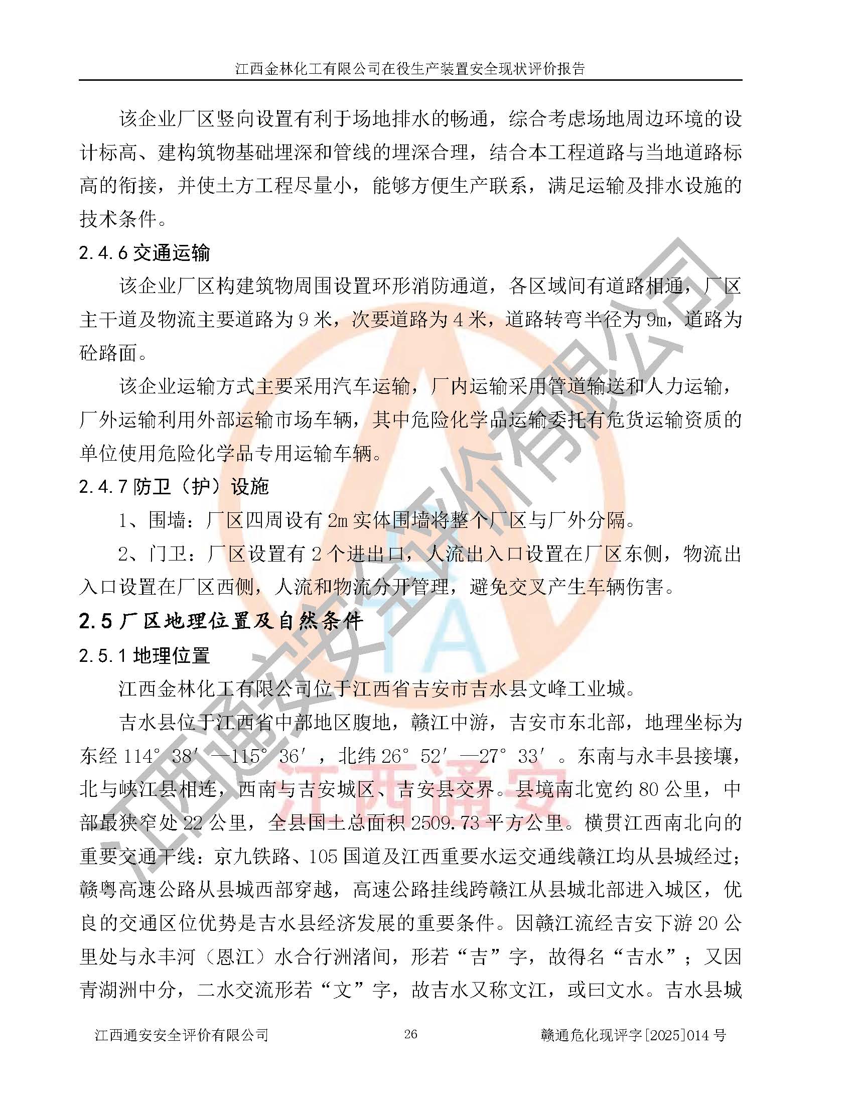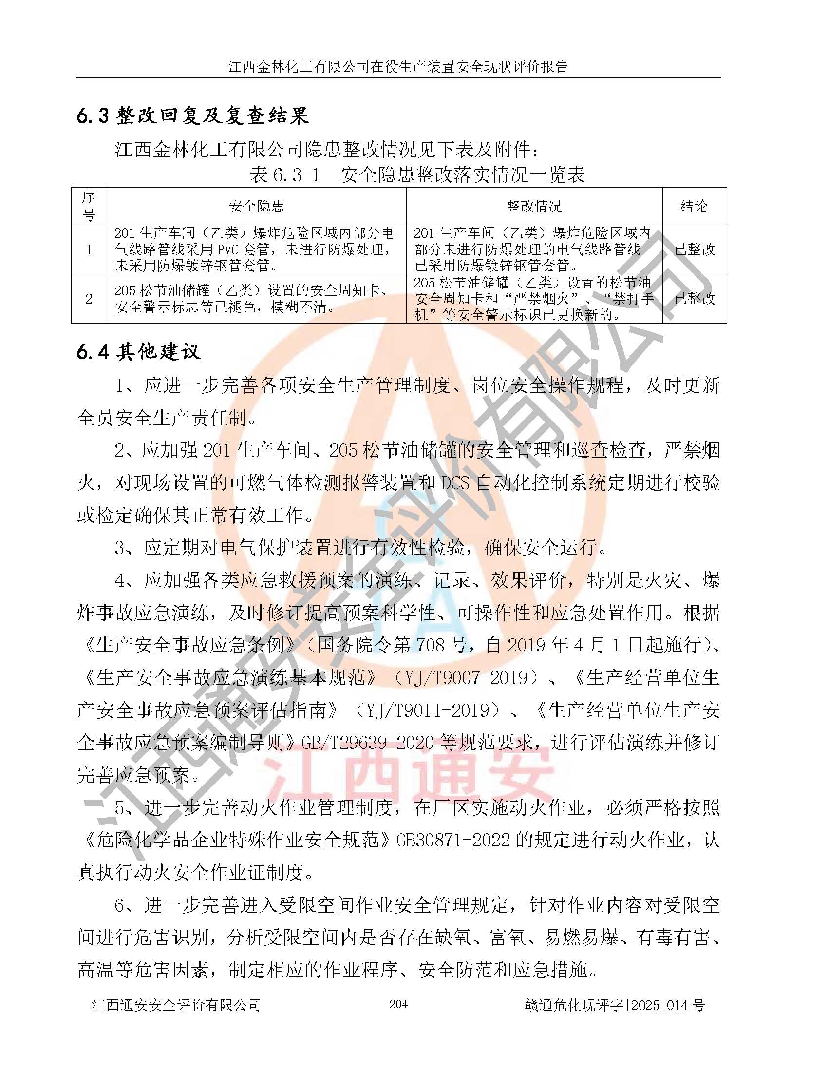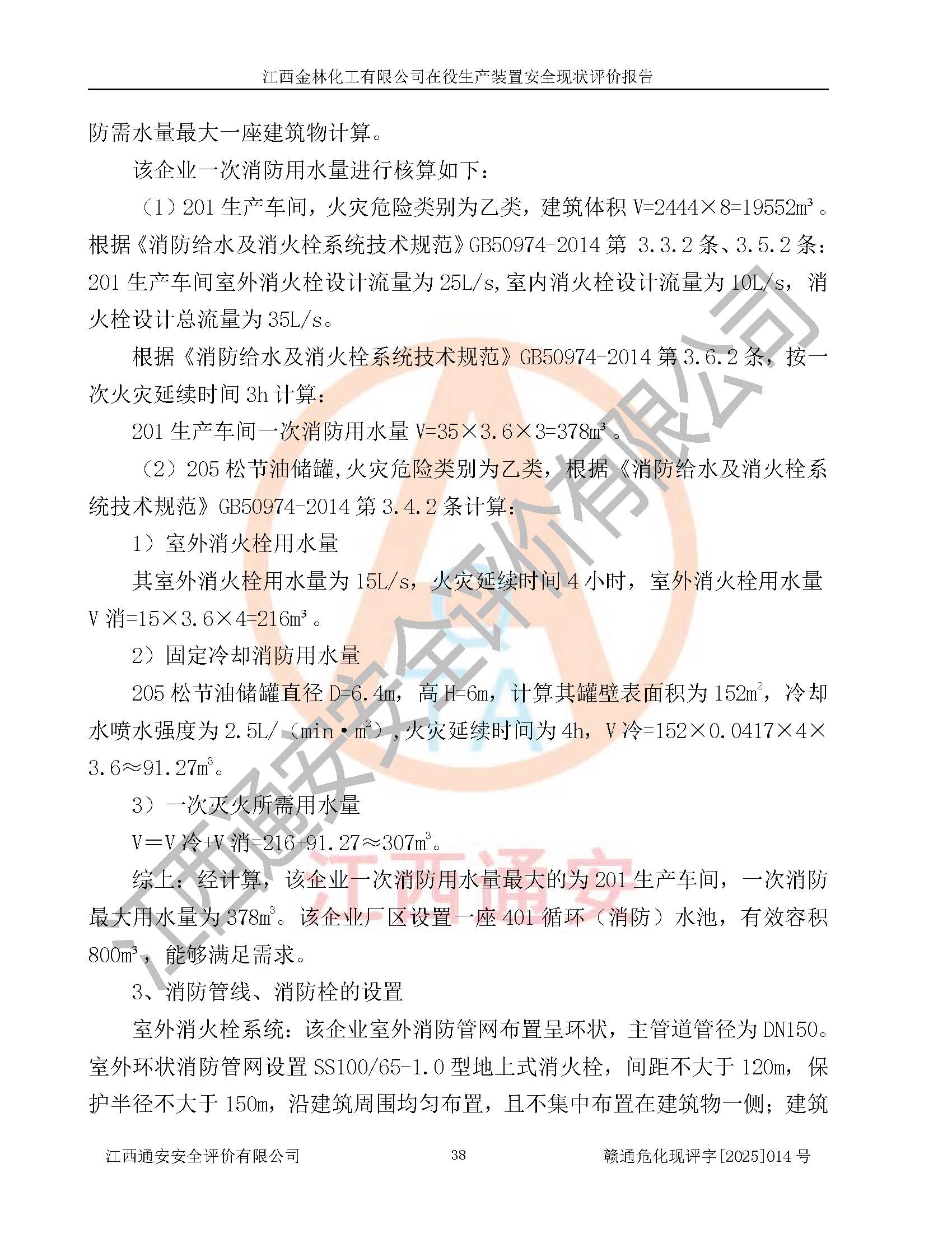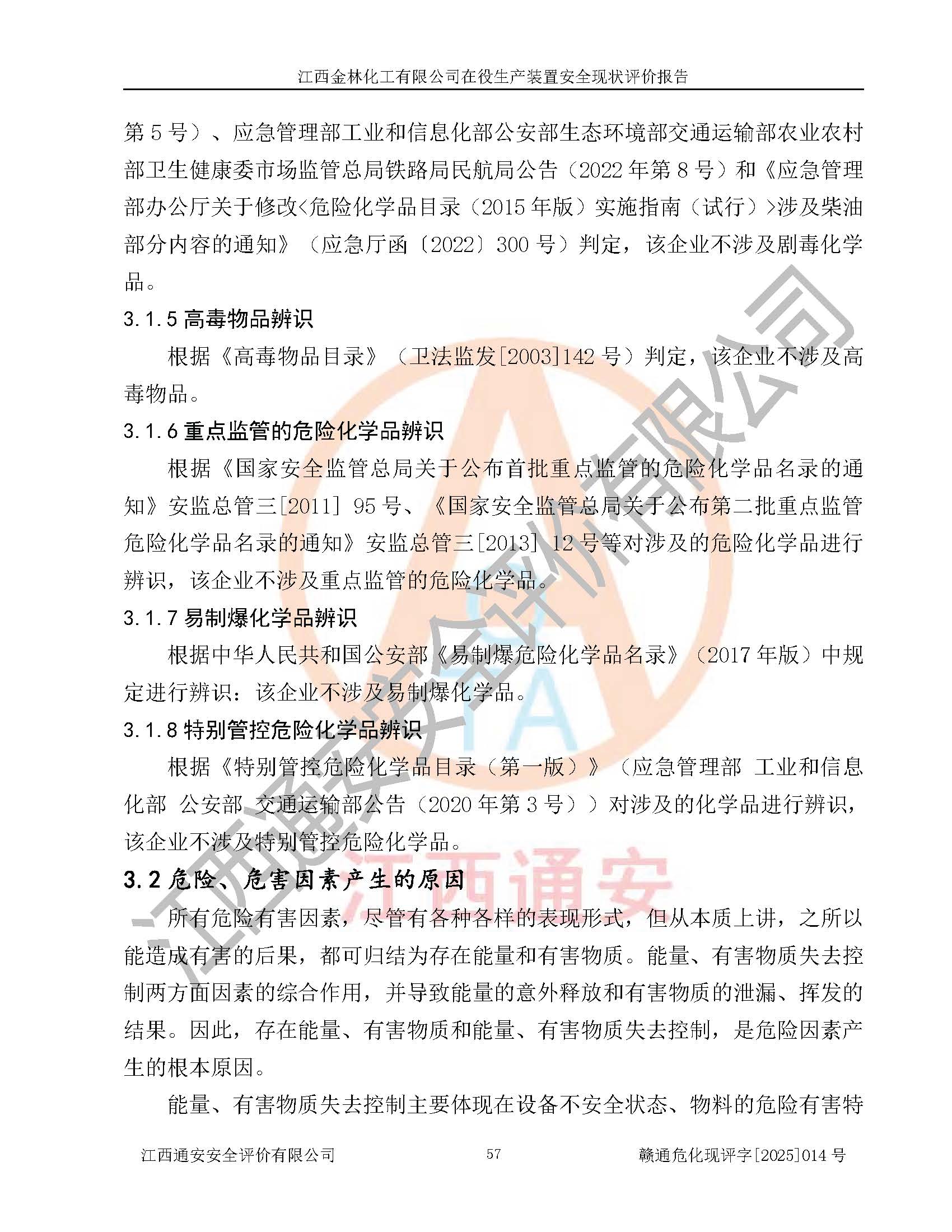 項(xiàng)目簡(jiǎn)介 | 江西金林化工有限公司成立于2003年6月26日,并取得吉水縣市場(chǎng)監(jiān)督管理局頒發(fā)的《營(yíng)業(yè)執(zhí)照》,營(yíng)業(yè)執(zhí)照統(tǒng)一社會(huì)信用代碼:91360822748530538B。公司注冊(cè)住所:江西省吉安市吉水縣文峰工業(yè)城。法定**人:湯光耀,注冊(cè)資本:貳仟零壹拾玖萬元整。企業(yè)類型:有限責(zé)任公司(自然人投資或控股)。經(jīng)營(yíng)范圍包括生產(chǎn)、銷售松節(jié)油、松香、林產(chǎn)化工產(chǎn)品、其它化工產(chǎn)品(含苯酚、甲醛)、橡膠產(chǎn)品、(憑化學(xué)危險(xiǎn)品經(jīng)營(yíng)許可證及消防安全檢查意見書經(jīng)營(yíng))、機(jī)械配件、紙張銷售。 江西金林化工有限公司于2022年8月23日進(jìn)行了安全生產(chǎn)許可證換證,取得江西省應(yīng)急管理廳頒發(fā)的《安全生產(chǎn)許可證》,許可證編號(hào)為:(贛)WH安許證字[2005]0118號(hào),許可范圍:松節(jié)油(2kt/a),**期2022年8月23日至2025年8月22日。 江西金林化工有限公司在役生產(chǎn)裝置為年產(chǎn)10000噸松香、2000噸松節(jié)油項(xiàng)目及其配套公用、輔助設(shè)施,主要產(chǎn)品有松香和松節(jié)油。 根據(jù)《危險(xiǎn)化學(xué)品目錄》(2015年版)、應(yīng)急管理部辦公廳關(guān)于修改《危險(xiǎn)化學(xué)品目錄(2015年版)實(shí)施指南(試行)》涉及柴油部分內(nèi)容的通知(應(yīng)急廳函〔2022〕300號(hào))和《應(yīng)急管理部工業(yè)和信息化部公安部生態(tài)環(huán)境部交通運(yùn)輸部農(nóng)業(yè)農(nóng)村部衛(wèi)生健康委市場(chǎng)監(jiān)管總局鐵路局民航局公告》2022年第8號(hào)《決定調(diào)整《危險(xiǎn)化學(xué)品目錄(2015版)》,將“1674柴油〔閉杯閃點(diǎn)≤60℃〕”調(diào)整為“1674柴油”》的文件規(guī)定,對(duì)該企業(yè)生產(chǎn)過程中所涉及的化學(xué)品進(jìn)行辨識(shí):該企業(yè)涉及的危險(xiǎn)化學(xué)品有:松脂、松節(jié)油、柴油(發(fā)電機(jī)燃料)等。 | |||