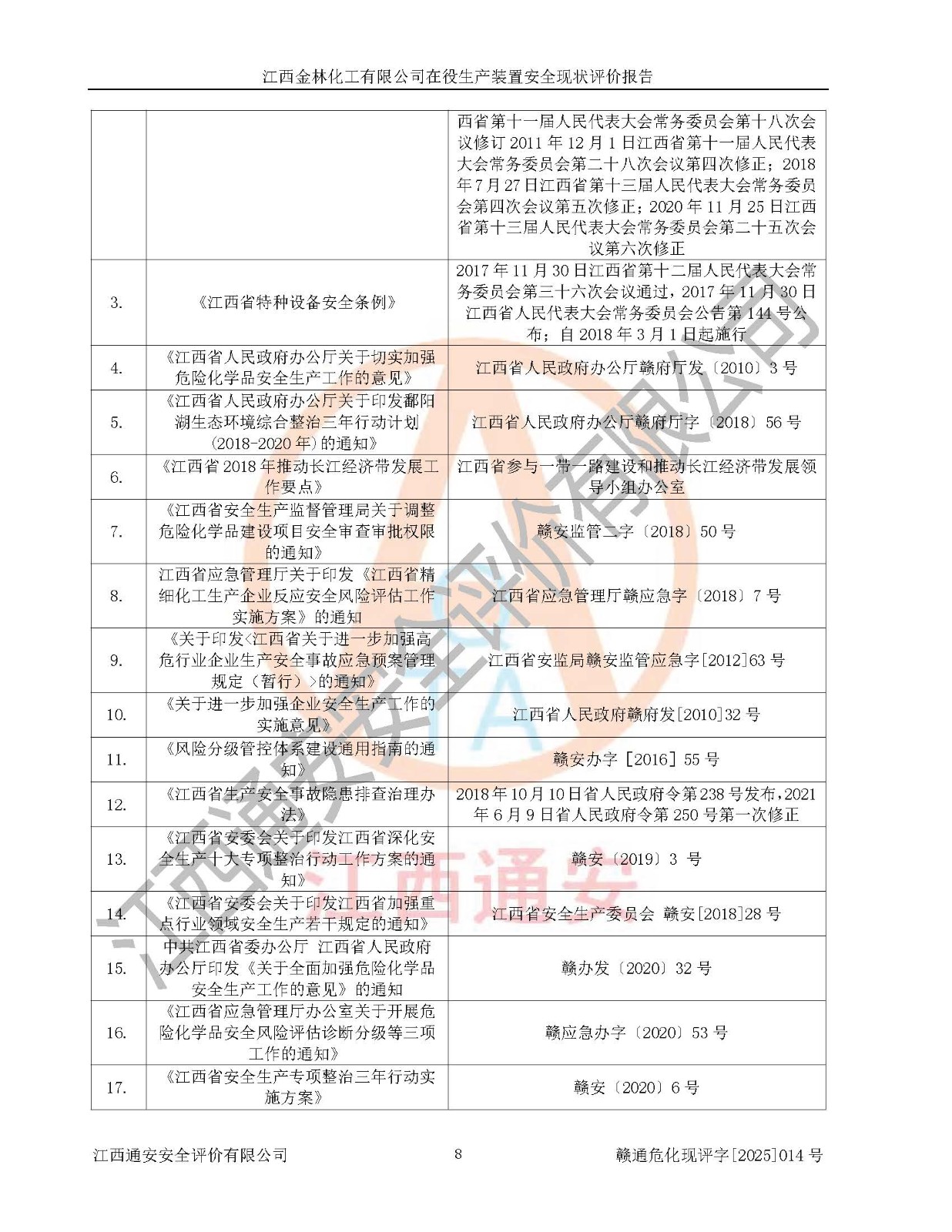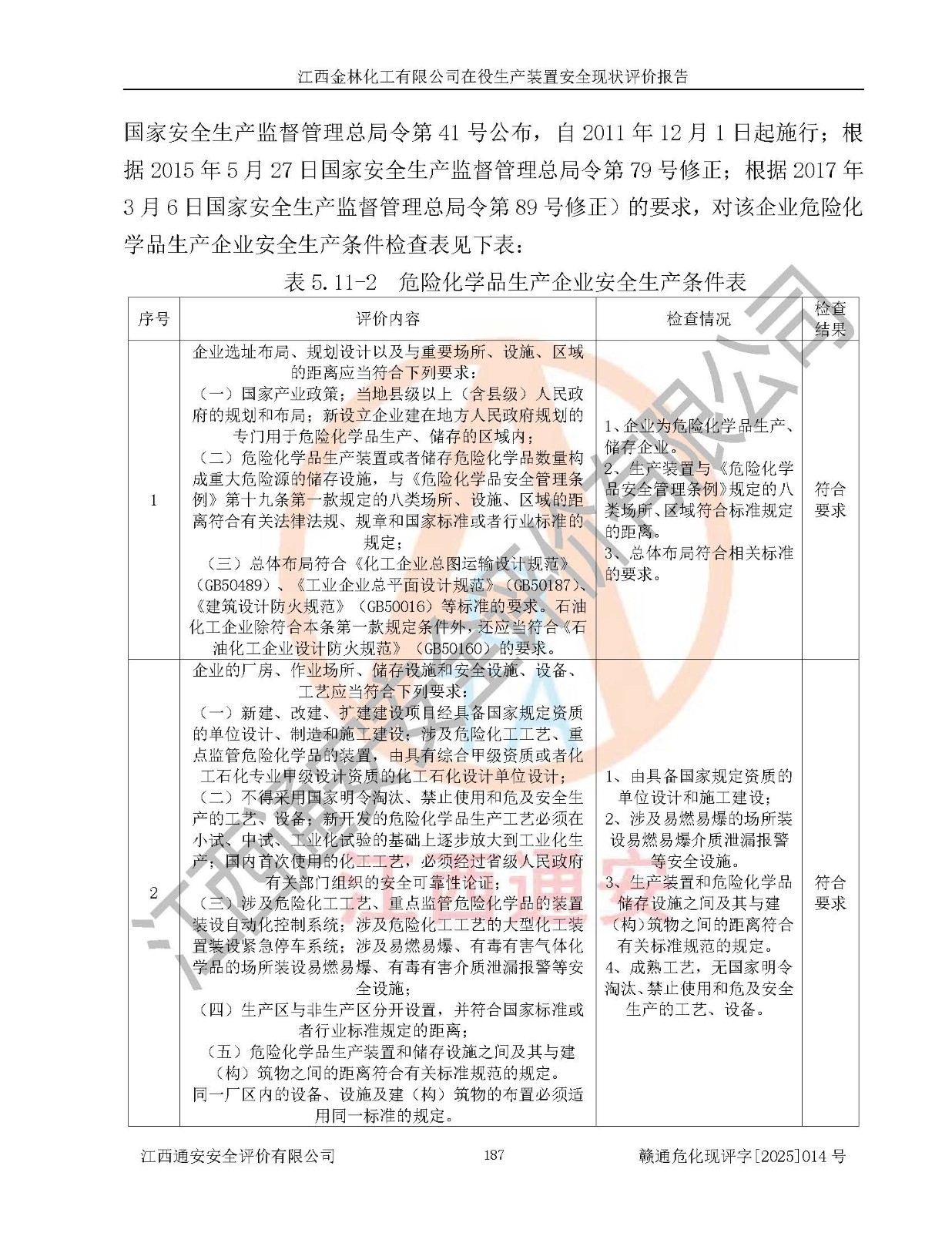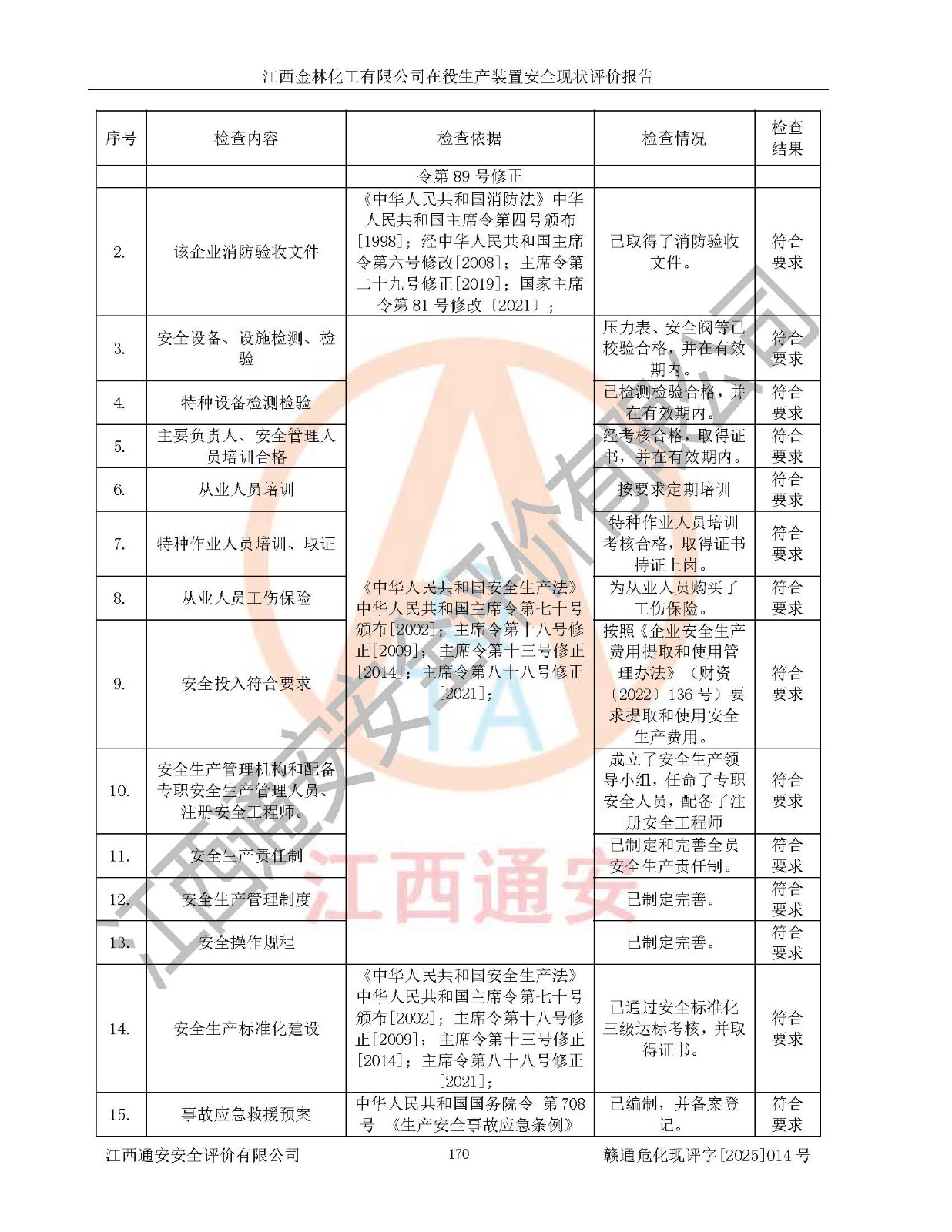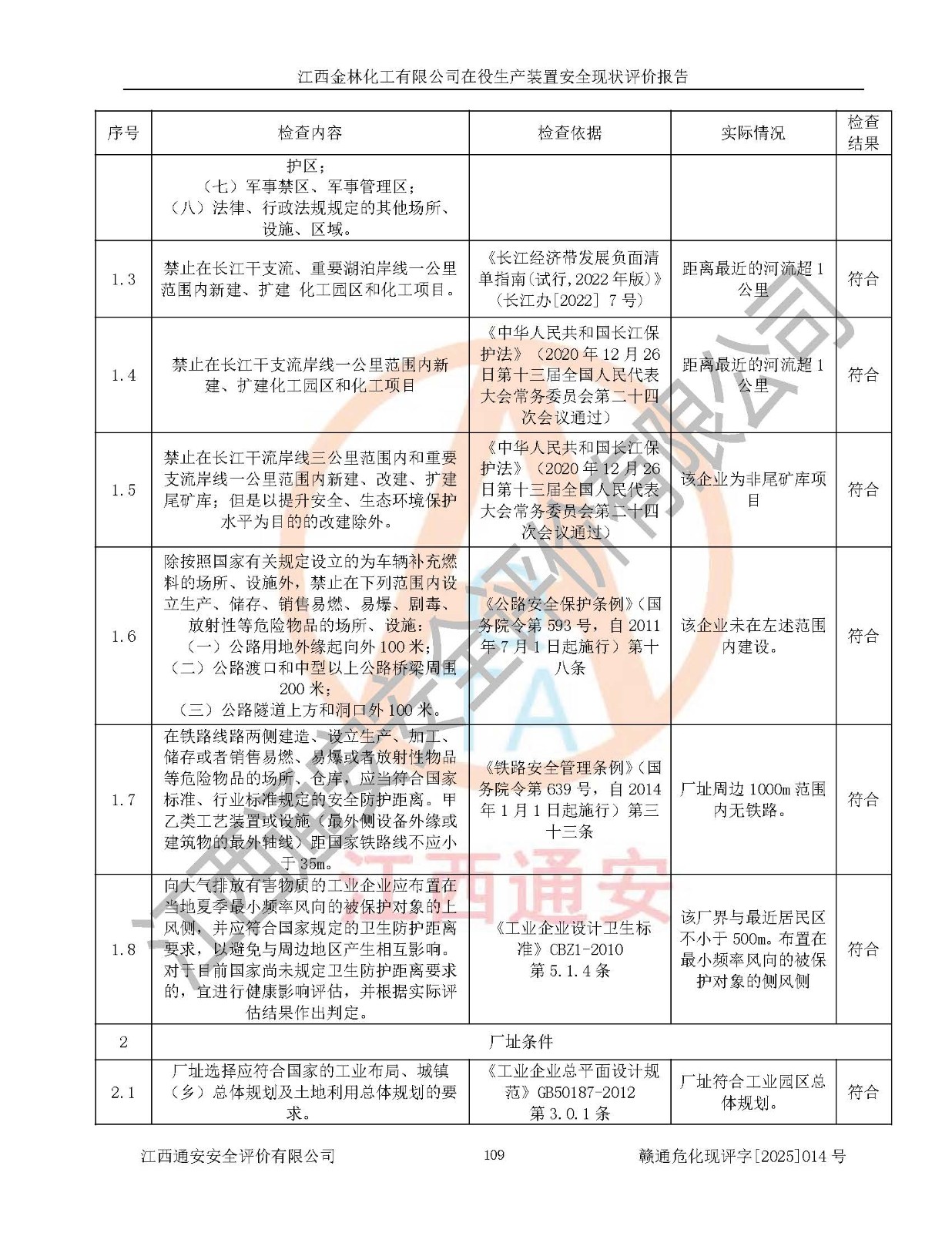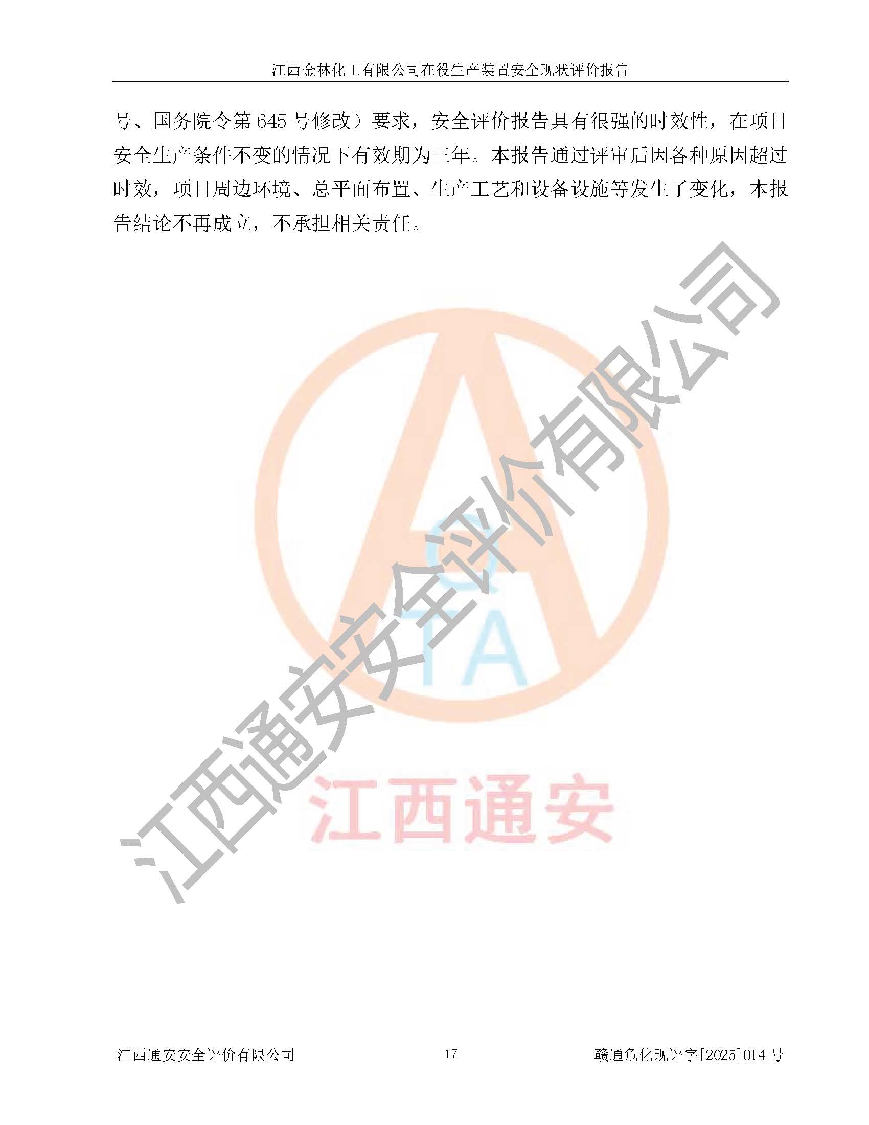 評(píng)價(jià)報(bào)告名稱 | 江西金林化工有限公司在役生產(chǎn)裝置安全現(xiàn)狀評(píng)價(jià)報(bào)告 | |||