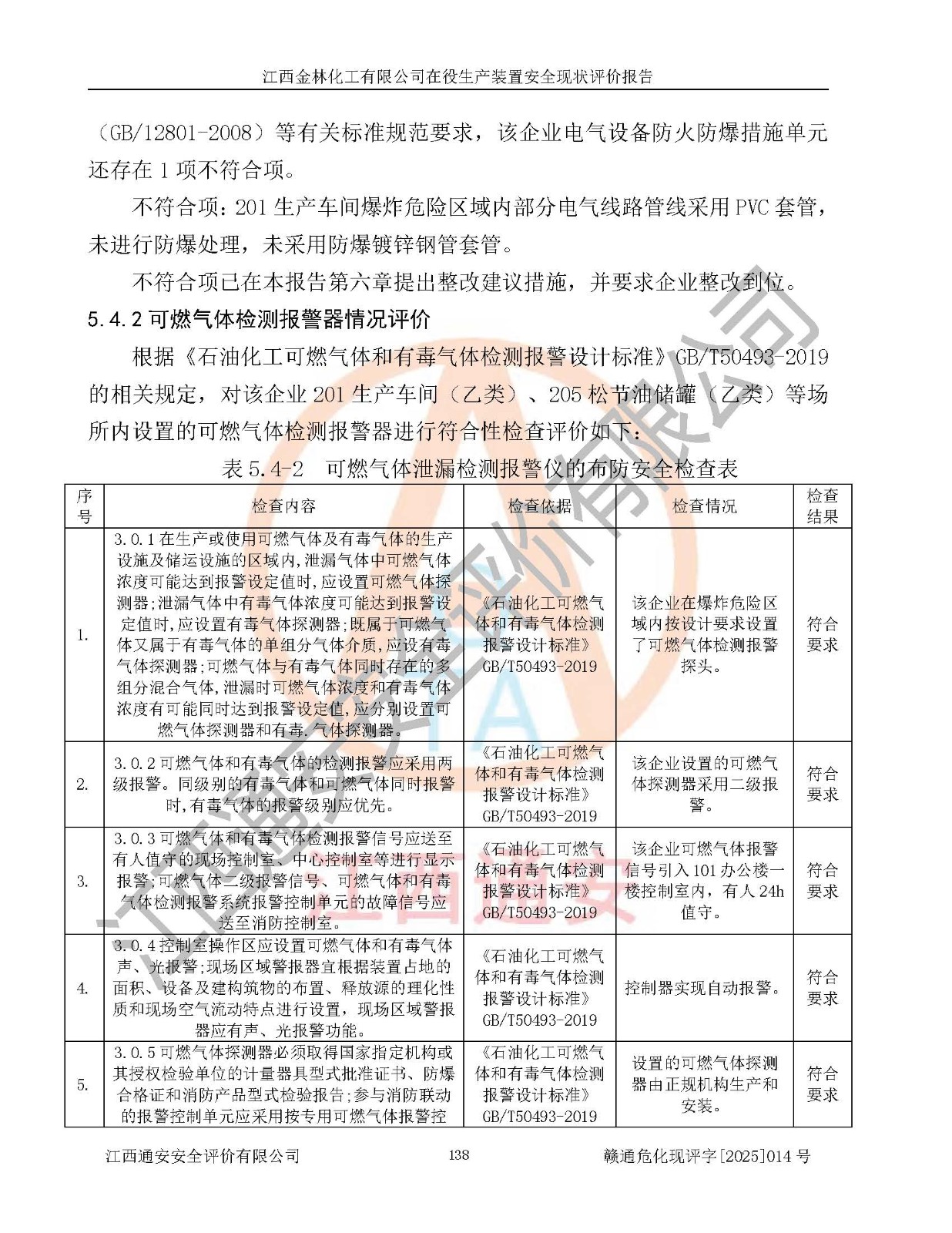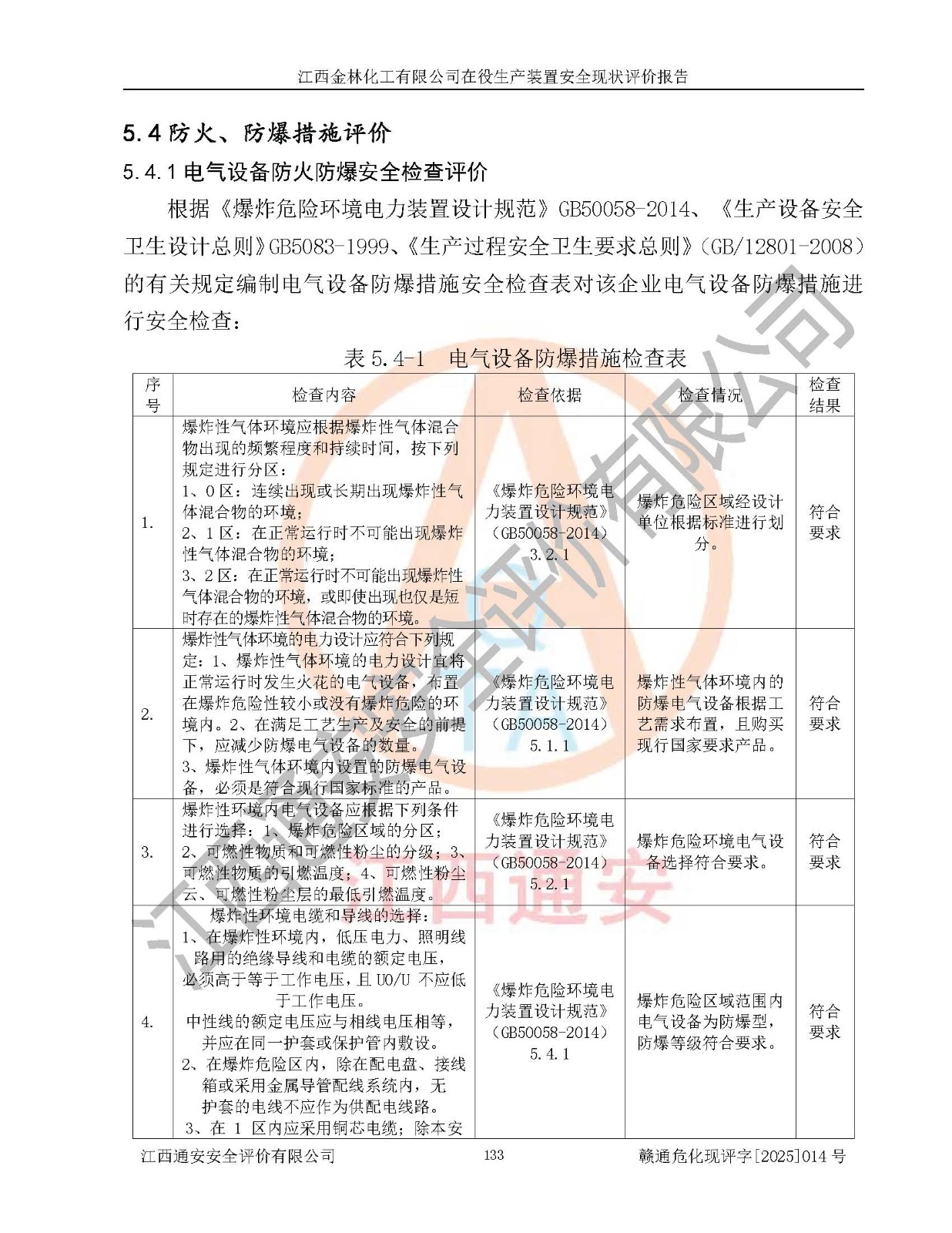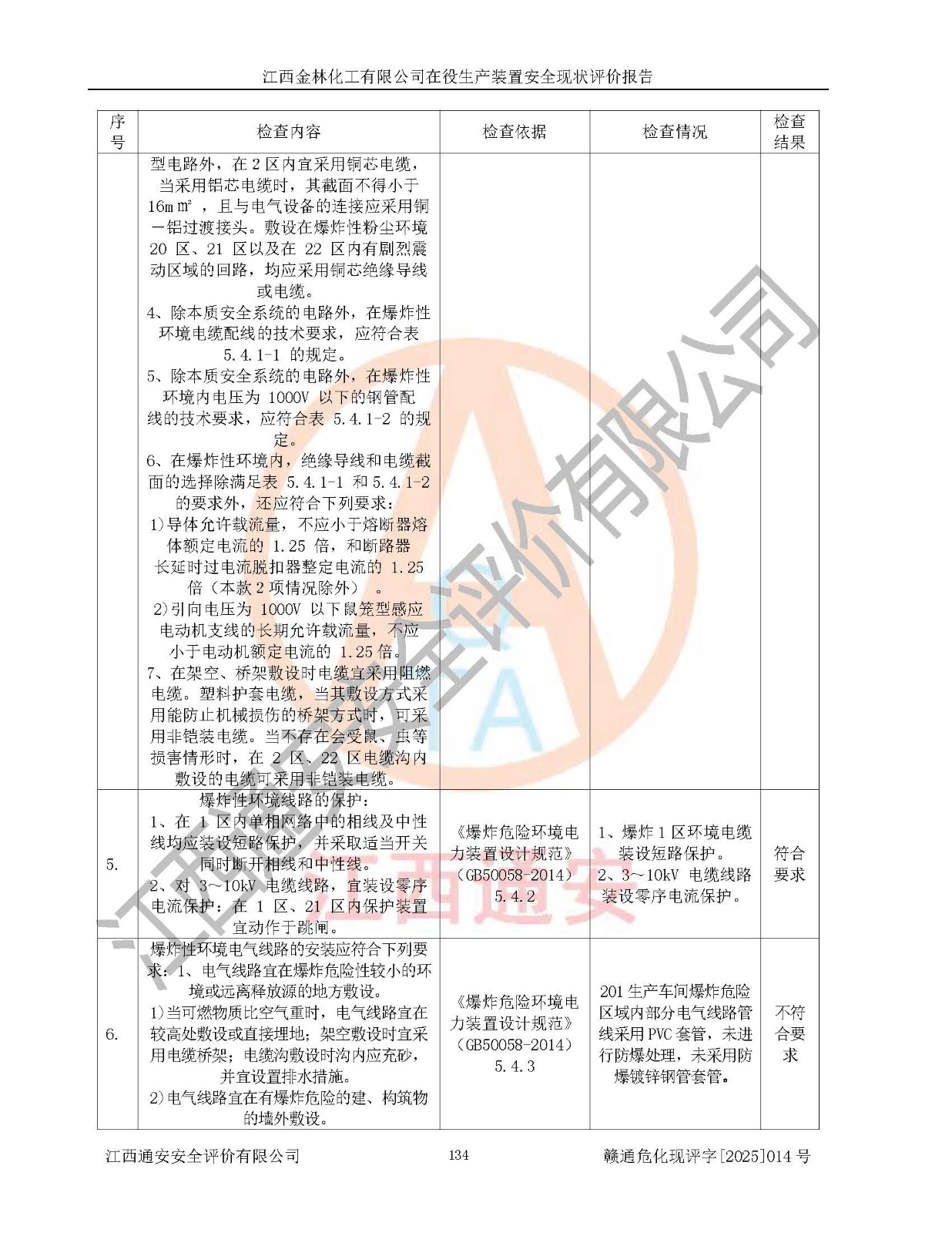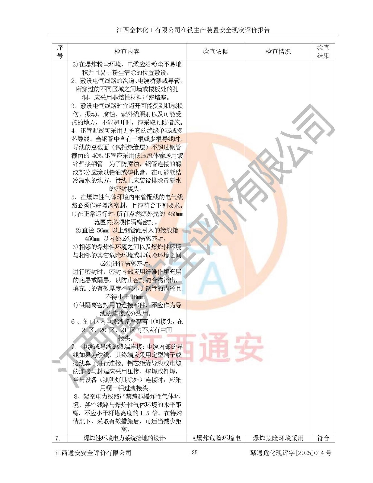 勘察現(xiàn)場(chǎng)發(fā)現(xiàn)的問題及安全對(duì)策措施 | 序號(hào)安全隱患對(duì)策措施與整改建議緊迫程度1. 201生產(chǎn)車間爆炸危險(xiǎn)區(qū)域內(nèi)部分電氣線路管線采用PVC套管,未進(jìn)行防爆處理,未采用防爆鍍鋅鋼管套管。對(duì)201生產(chǎn)車間爆炸危險(xiǎn)區(qū)域內(nèi)部分未進(jìn)行防爆處理的電氣線路管線采用防爆鍍鋅鋼管套管。高2. 205松節(jié)油儲(chǔ)罐(乙類)設(shè)置的安全周知卡、安全警示標(biāo)志等已褪色,模糊不清。205松節(jié)油儲(chǔ)罐(乙類)更換新的安全周知卡、安全警示標(biāo)志。中
