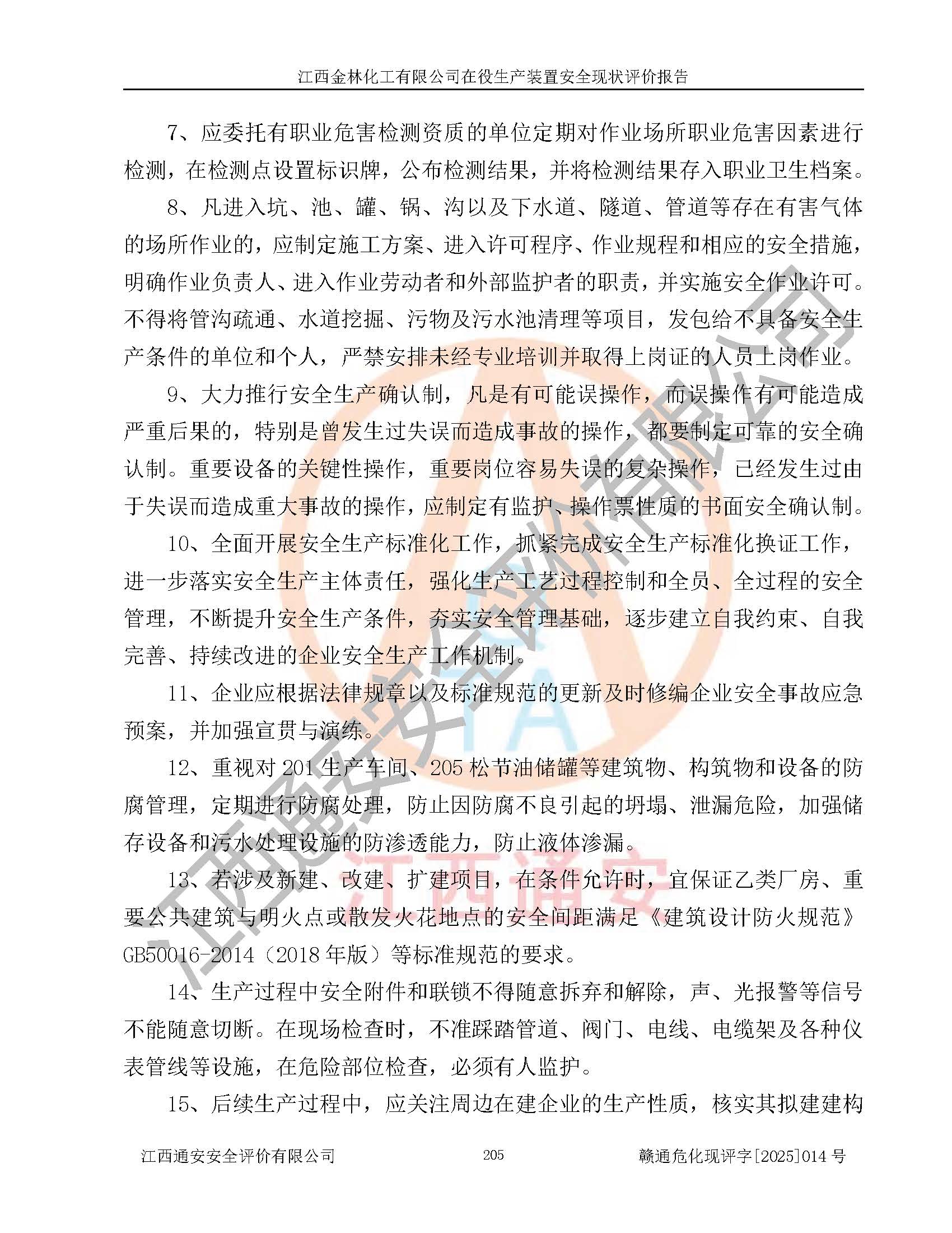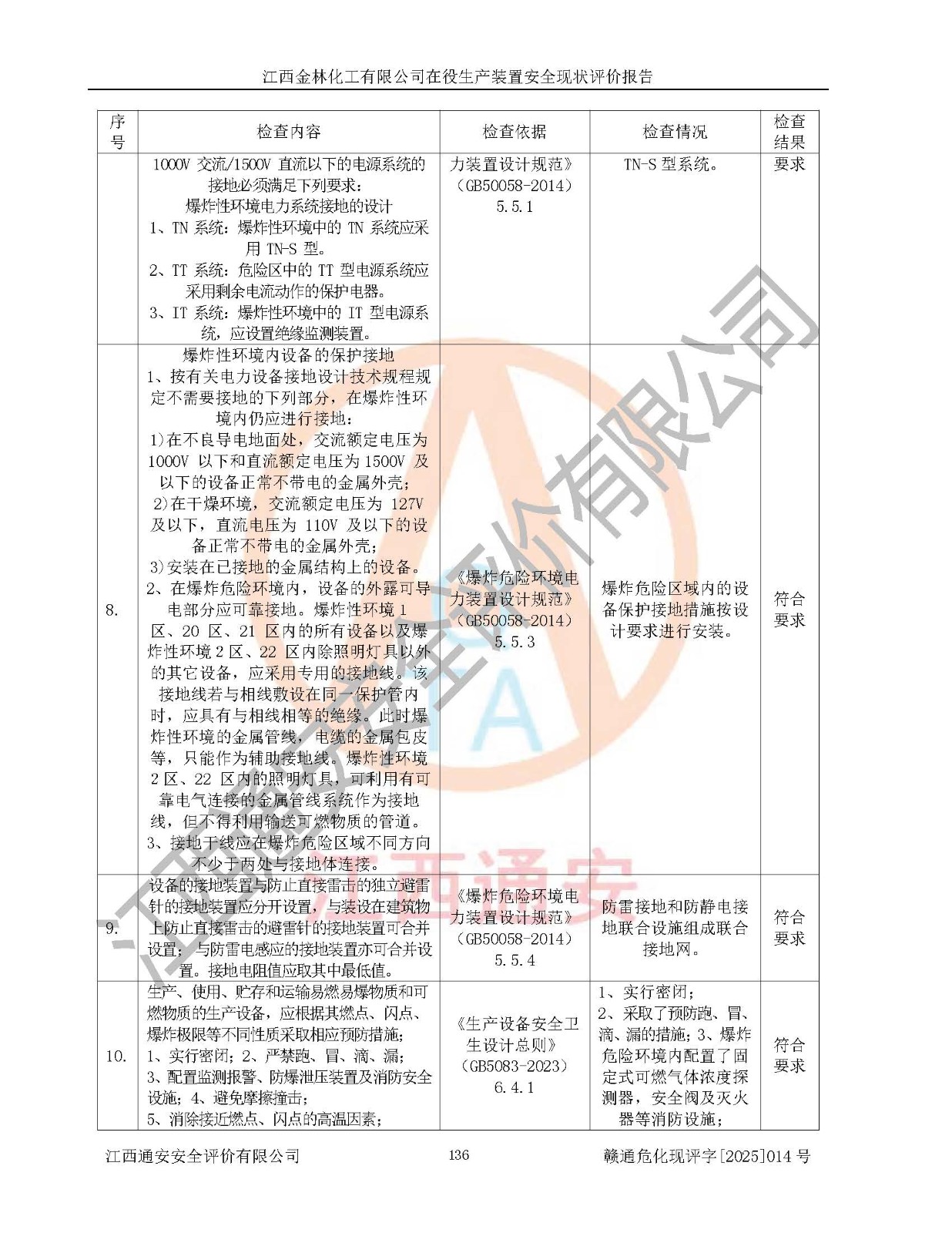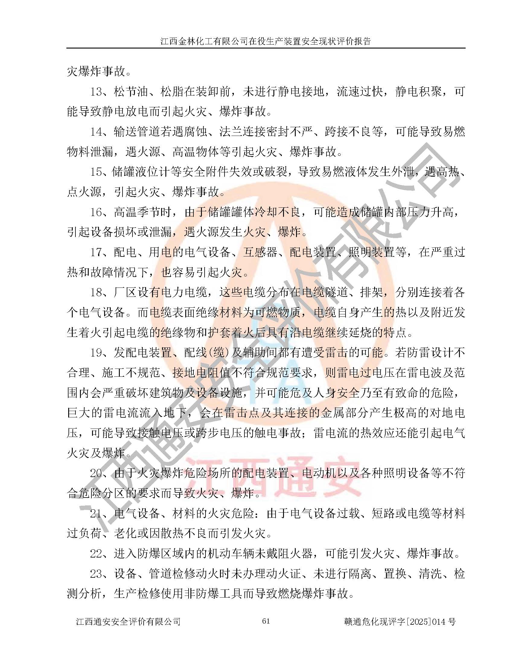 勘察現(xiàn)場(chǎng)發(fā)現(xiàn)的問題及安全對(duì)策措施 | 序號(hào)安全隱患對(duì)策措施與整改建議緊迫程度1. 201生產(chǎn)車間爆炸危險(xiǎn)區(qū)域內(nèi)部分電氣線路管線采用PVC套管,未進(jìn)行防爆處理,未采用防爆鍍鋅鋼管套管。對(duì)201生產(chǎn)車間爆炸危險(xiǎn)區(qū)域內(nèi)部分未進(jìn)行防爆處理的電氣線路管線采用防爆鍍鋅鋼管套管。高2. 205松節(jié)油儲(chǔ)罐(乙類)設(shè)置的安全周知卡、安全警示標(biāo)志等已褪色,模糊不清。205松節(jié)油儲(chǔ)罐(乙類)更換新的安全周知卡、安全警示標(biāo)志。中