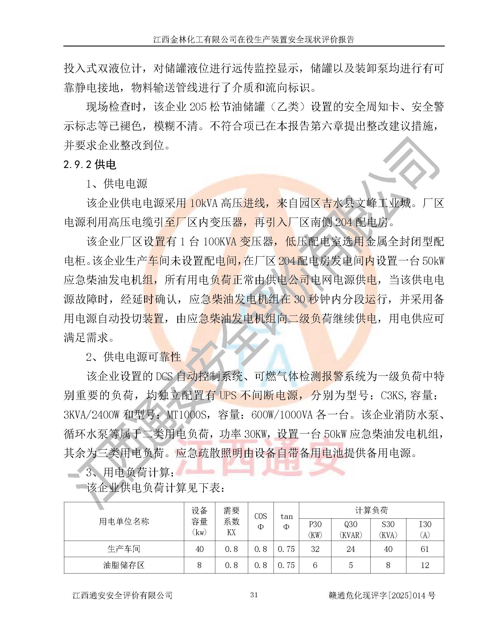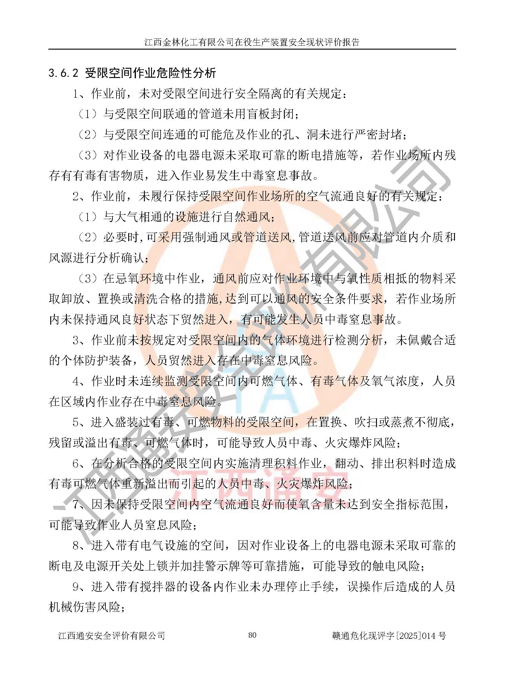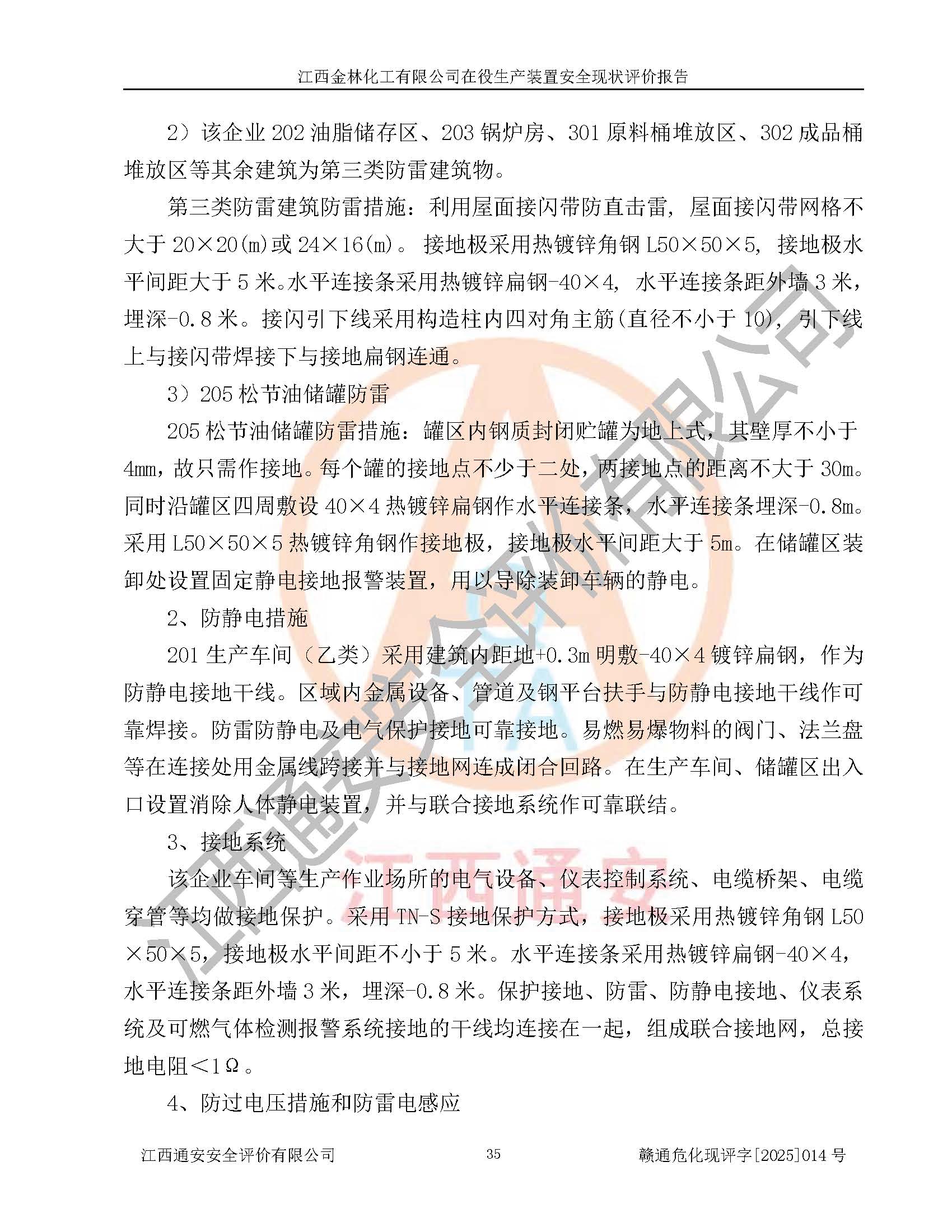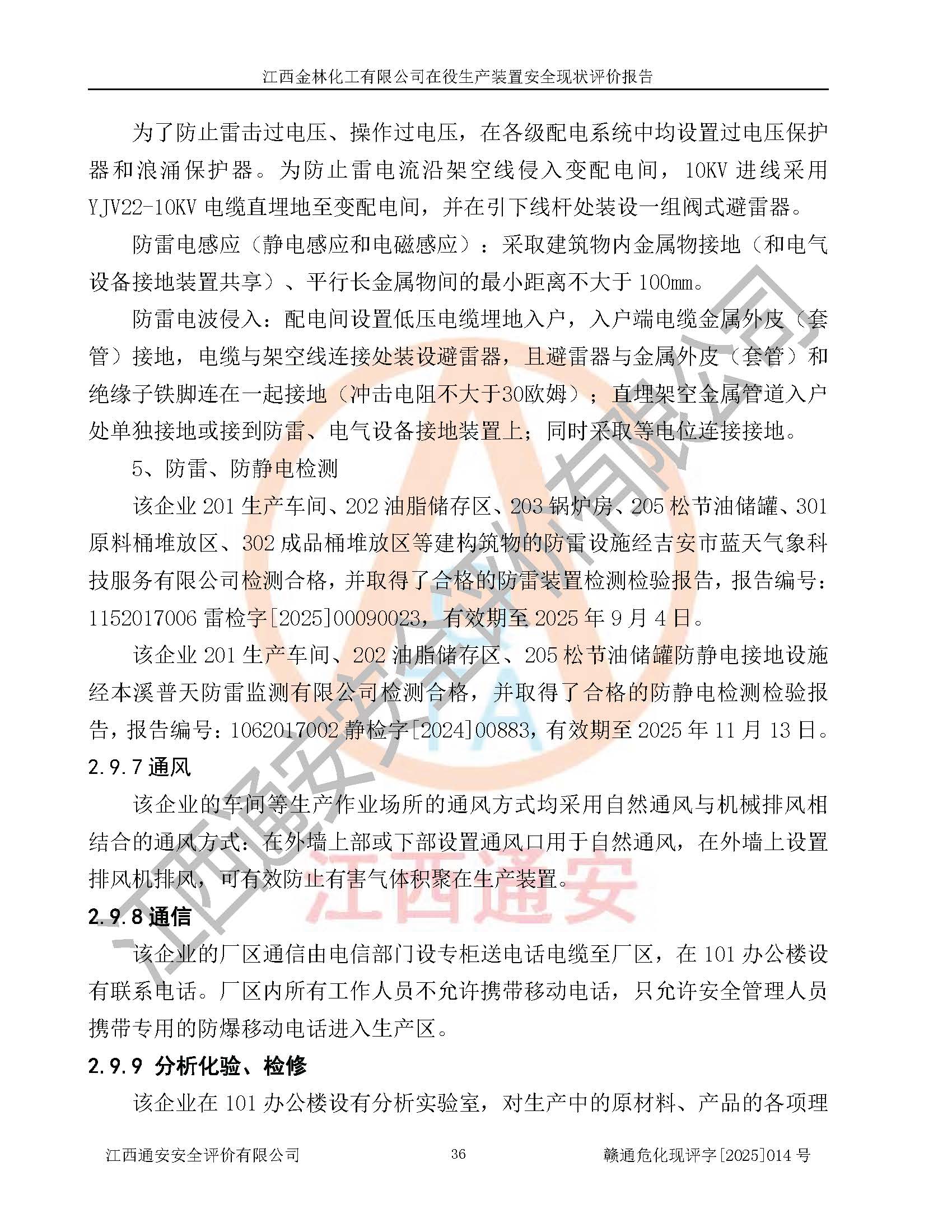 勘察現(xiàn)場(chǎng)發(fā)現(xiàn)的問題及安全對(duì)策措施 | 序號(hào)安全隱患對(duì)策措施與整改建議緊迫程度1. 201生產(chǎn)車間爆炸危險(xiǎn)區(qū)域內(nèi)部分電氣線路管線采用PVC套管,未進(jìn)行防爆處理,未采用防爆鍍鋅鋼管套管。對(duì)201生產(chǎn)車間爆炸危險(xiǎn)區(qū)域內(nèi)部分未進(jìn)行防爆處理的電氣線路管線采用防爆鍍鋅鋼管套管。高2. 205松節(jié)油儲(chǔ)罐(乙類)設(shè)置的安全周知卡、安全警示標(biāo)志等已褪色,模糊不清。205松節(jié)油儲(chǔ)罐(乙類)更換新的安全周知卡、安全警示標(biāo)志。中