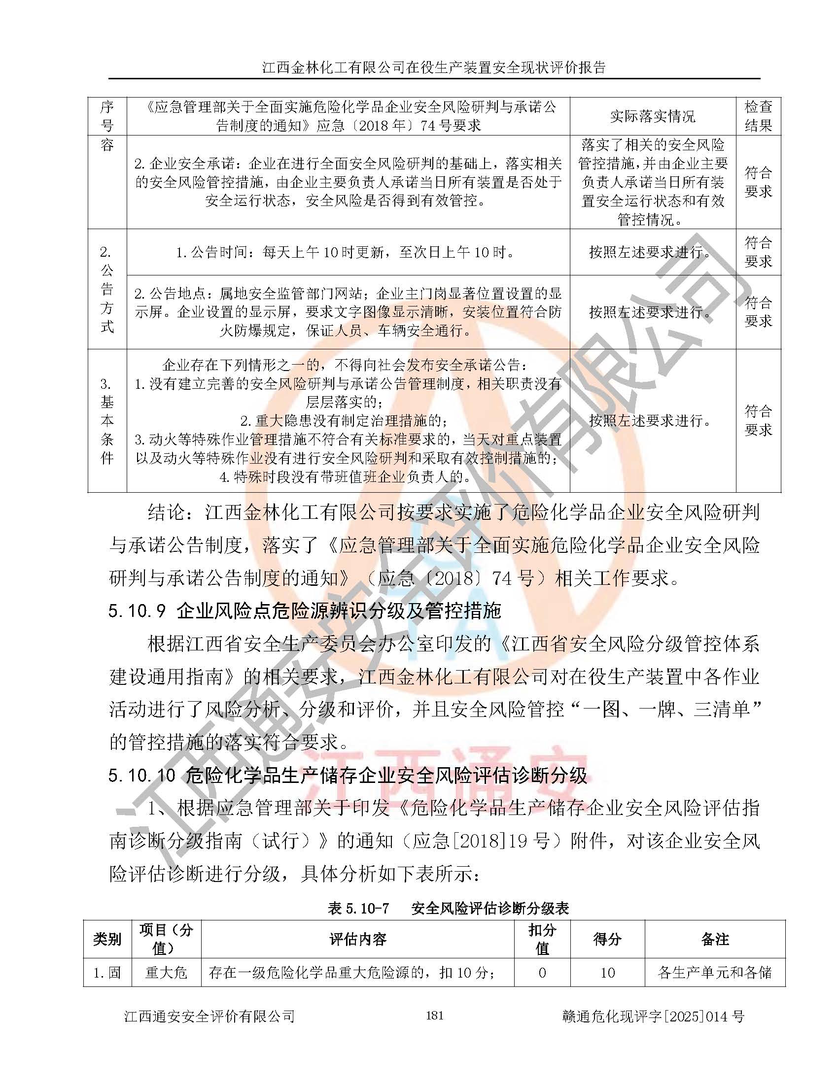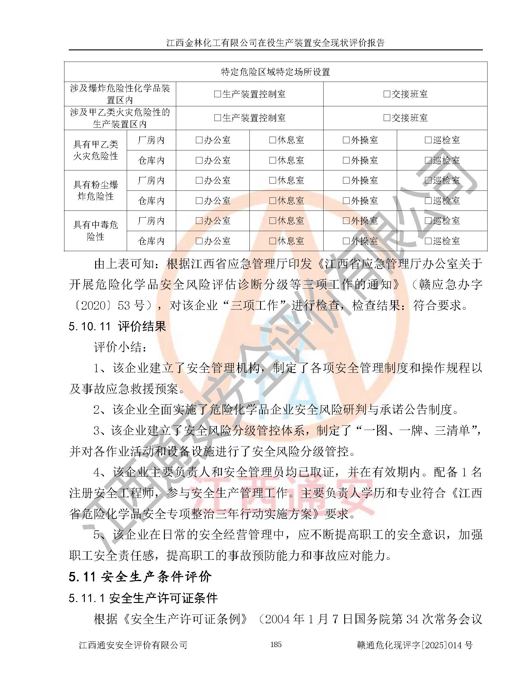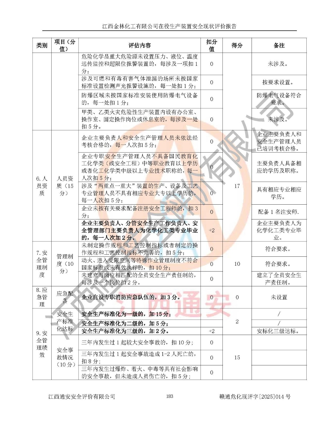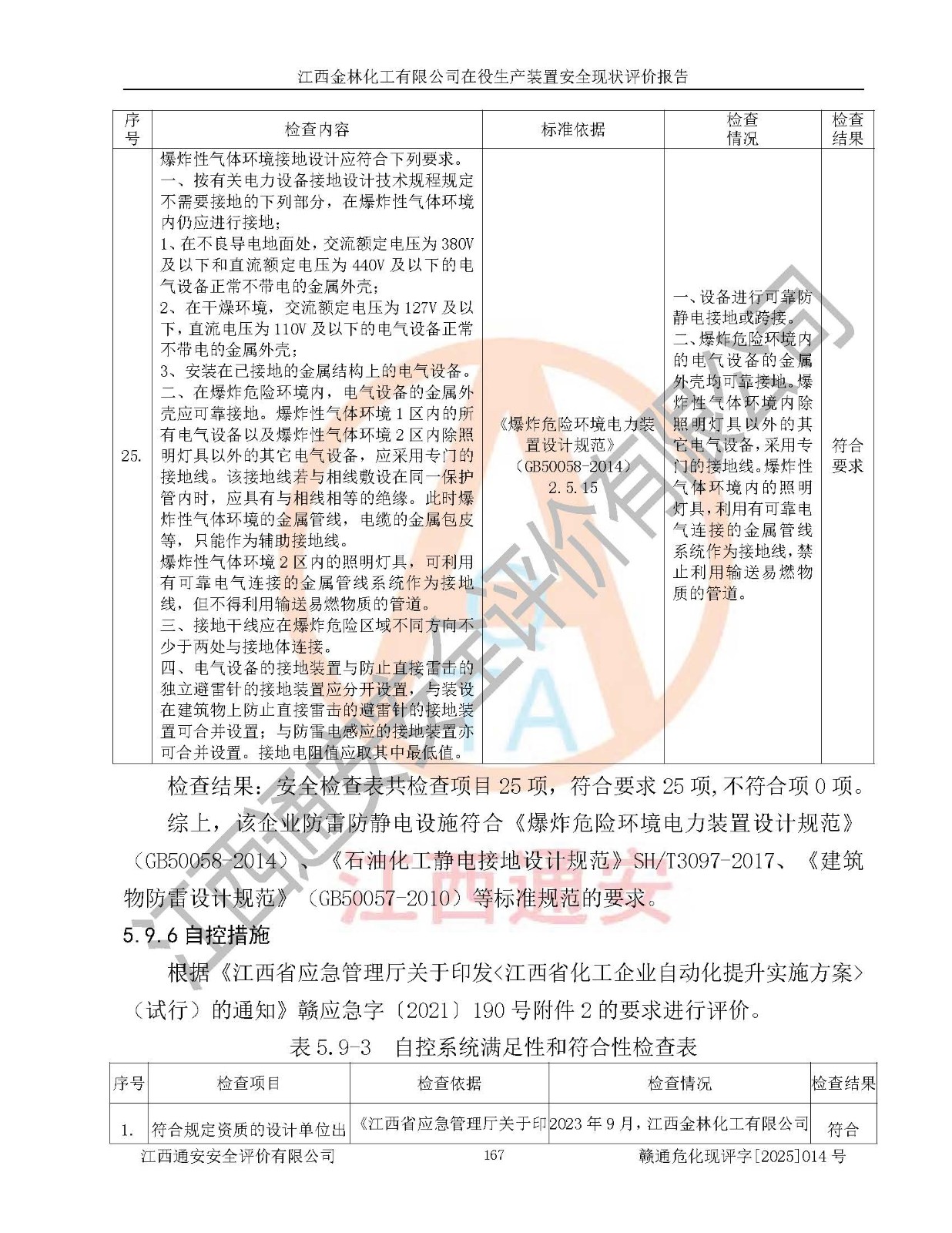 評(píng)價(jià)結(jié)論 | 江西金林化工有限公司在役生產(chǎn)裝置現(xiàn)場(chǎng)情況與設(shè)計(jì)圖紙一致,安全監(jiān)測(cè)監(jiān)控系統(tǒng)與設(shè)計(jì)一致,并**運(yùn)行,有關(guān)從業(yè)人員資格符合《江西省危險(xiǎn)化學(xué)品安全專項(xiàng)整治三年行動(dòng)實(shí)施方案》要求,安全設(shè)施及安全管理符合**及有關(guān)部門關(guān)于安全生產(chǎn)法律法規(guī)、標(biāo)準(zhǔn)的要求,安全設(shè)施正常投用且運(yùn)行**,安全風(fēng)險(xiǎn)是可以控制的,其風(fēng)險(xiǎn)程度是可以接受的,安全現(xiàn)狀符合安全生產(chǎn)條件,能夠滿足安全生產(chǎn)的要求。 | |||
