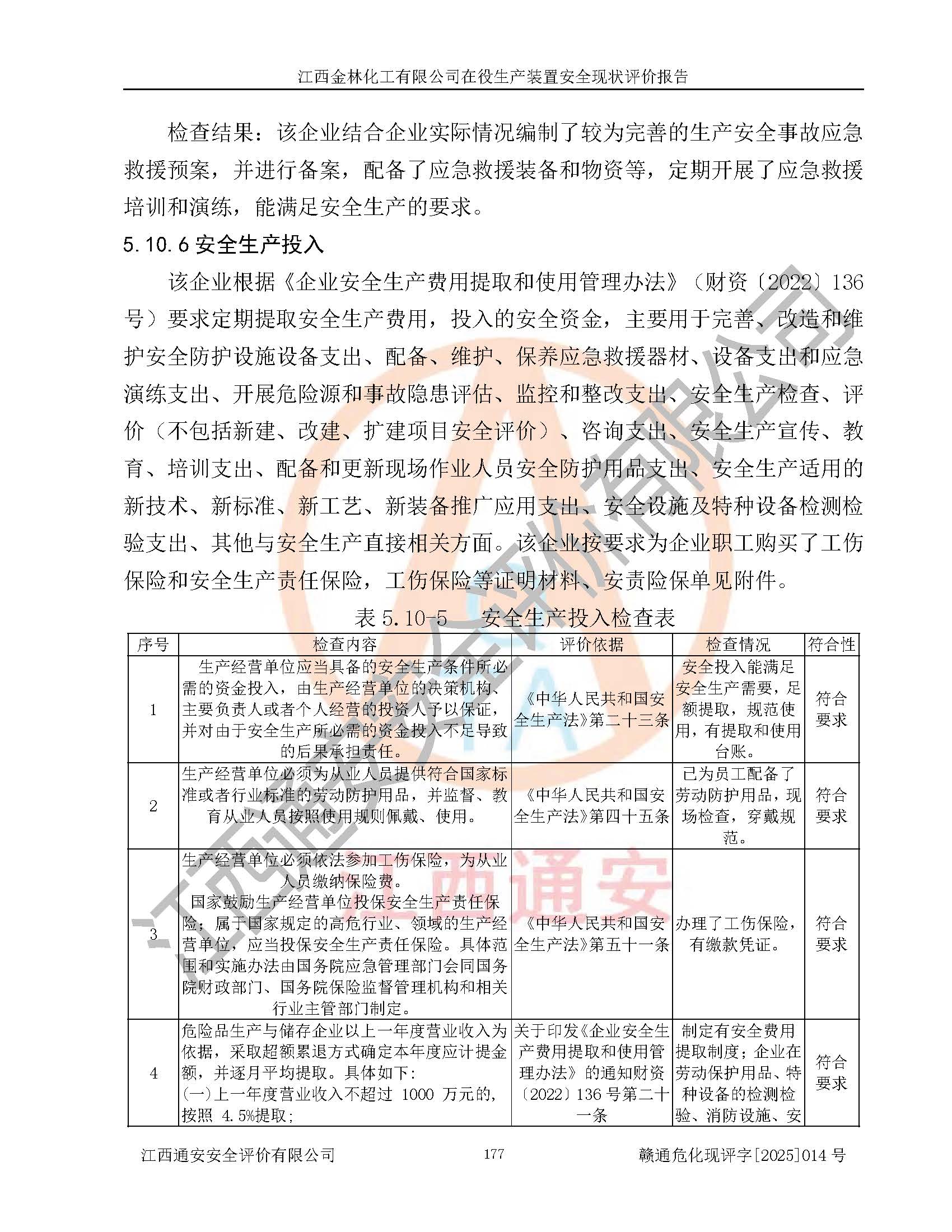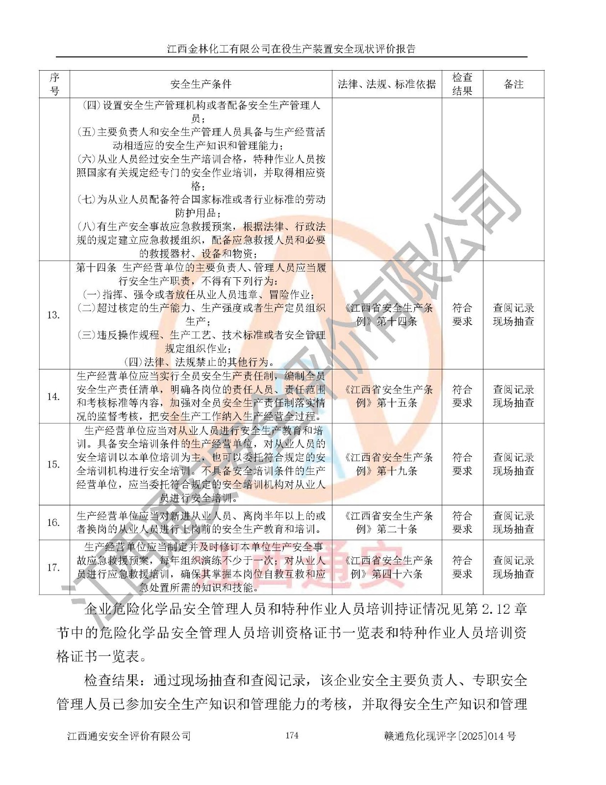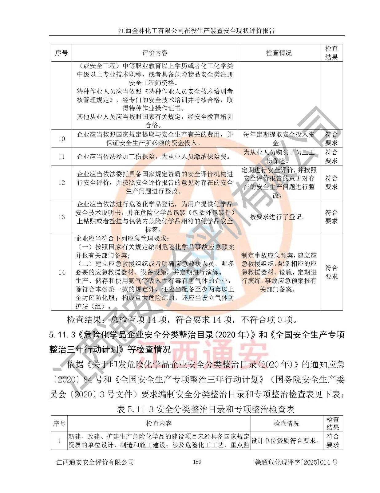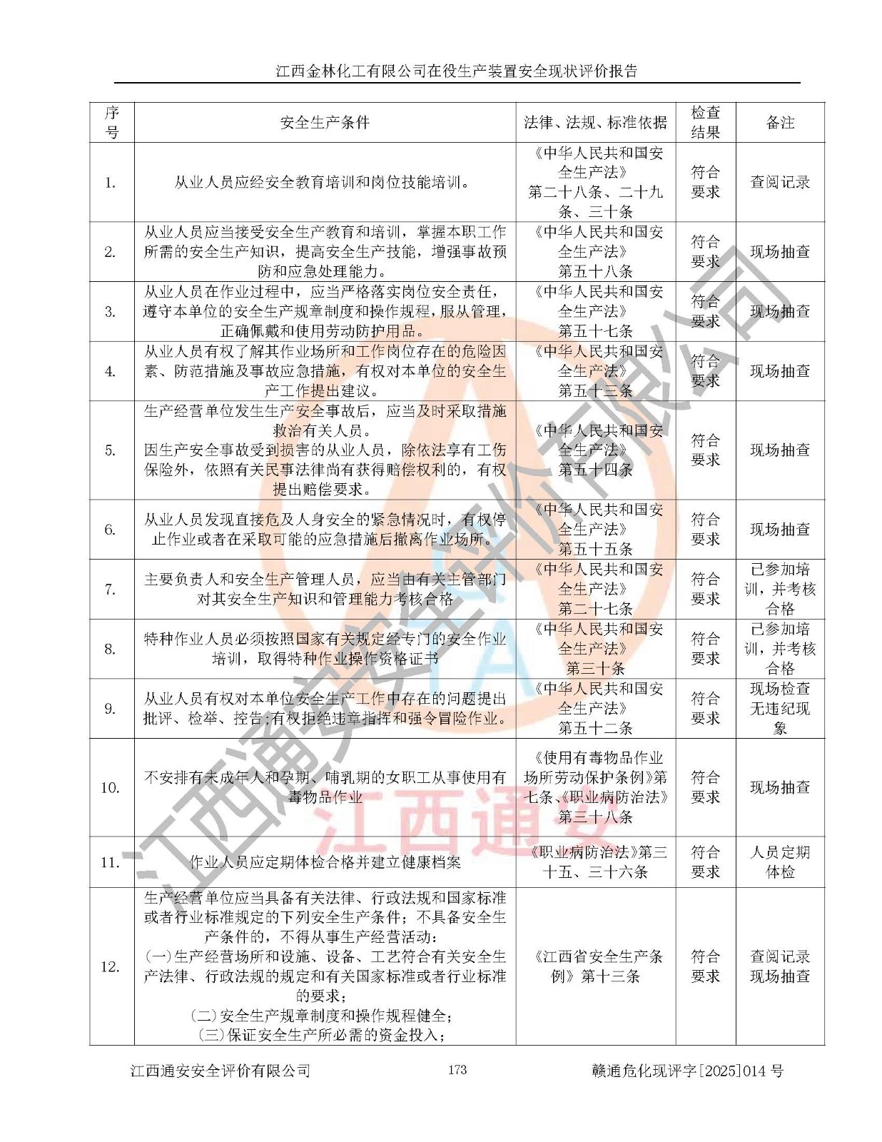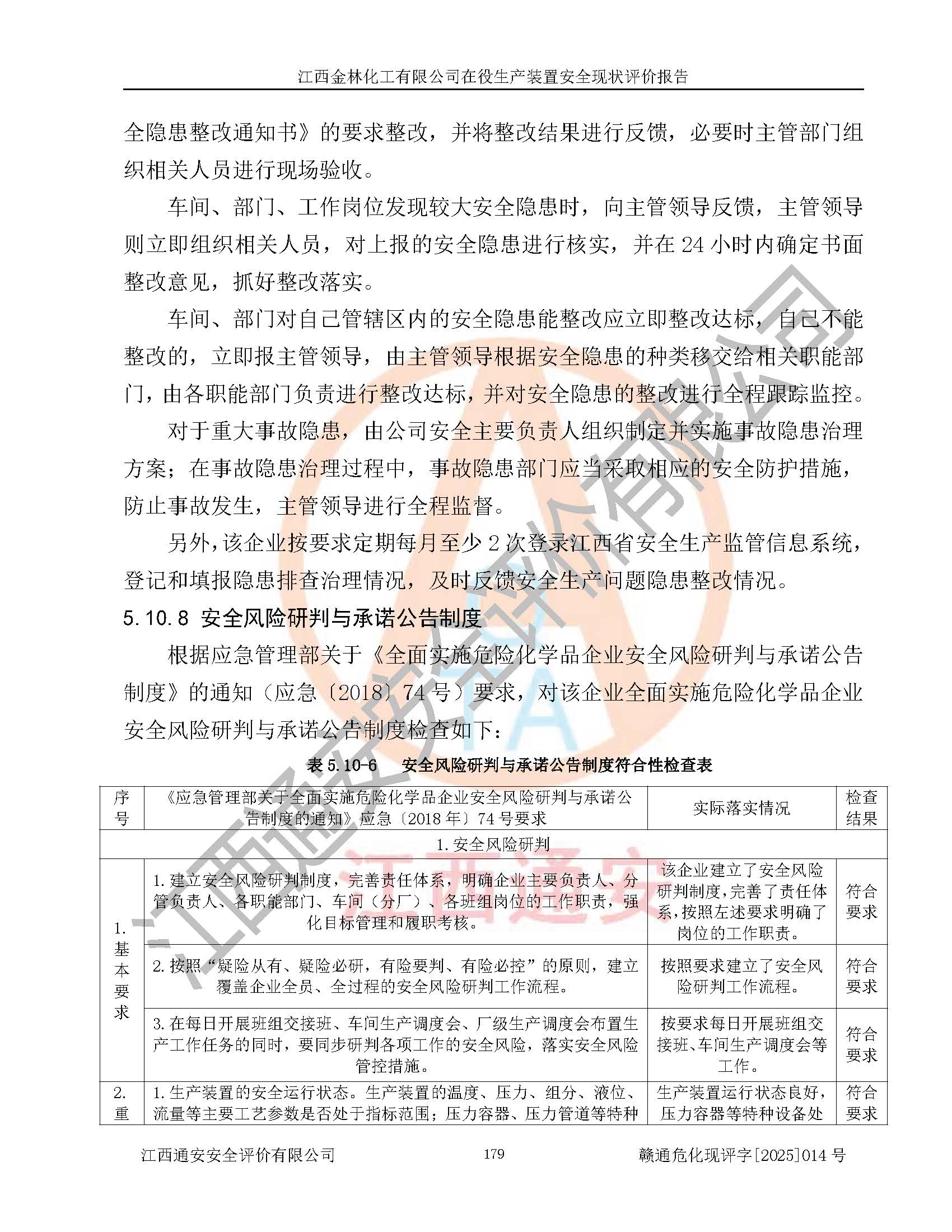 評(píng)價(jià)結(jié)論 | 江西金林化工有限公司在役生產(chǎn)裝置現(xiàn)場(chǎng)情況與設(shè)計(jì)圖紙一致,安全監(jiān)測(cè)監(jiān)控系統(tǒng)與設(shè)計(jì)一致,并**運(yùn)行,有關(guān)從業(yè)人員資格符合《江西省危險(xiǎn)化學(xué)品安全專項(xiàng)整治三年行動(dòng)實(shí)施方案》要求,安全設(shè)施及安全管理符合**及有關(guān)部門關(guān)于安全生產(chǎn)法律法規(guī)、標(biāo)準(zhǔn)的要求,安全設(shè)施正常投用且運(yùn)行**,安全風(fēng)險(xiǎn)是可以控制的,其風(fēng)險(xiǎn)程度是可以接受的,安全現(xiàn)狀符合安全生產(chǎn)條件,能夠滿足安全生產(chǎn)的要求。 | |||
