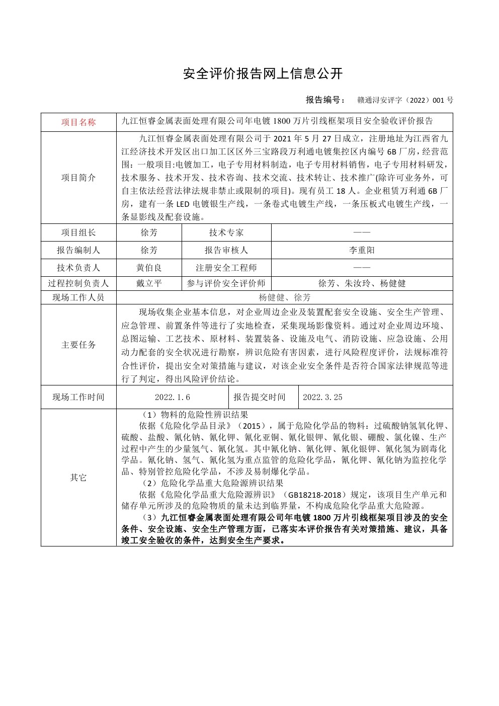 九江恒睿金屬表面處理有限公司年電鍍1800萬片引線框架項目安全驗收評價報告