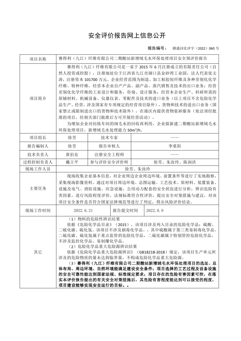 賽得利(九江)纖維有限公司二期酸站新增絨毛水**處理項目安全預(yù)評價報告