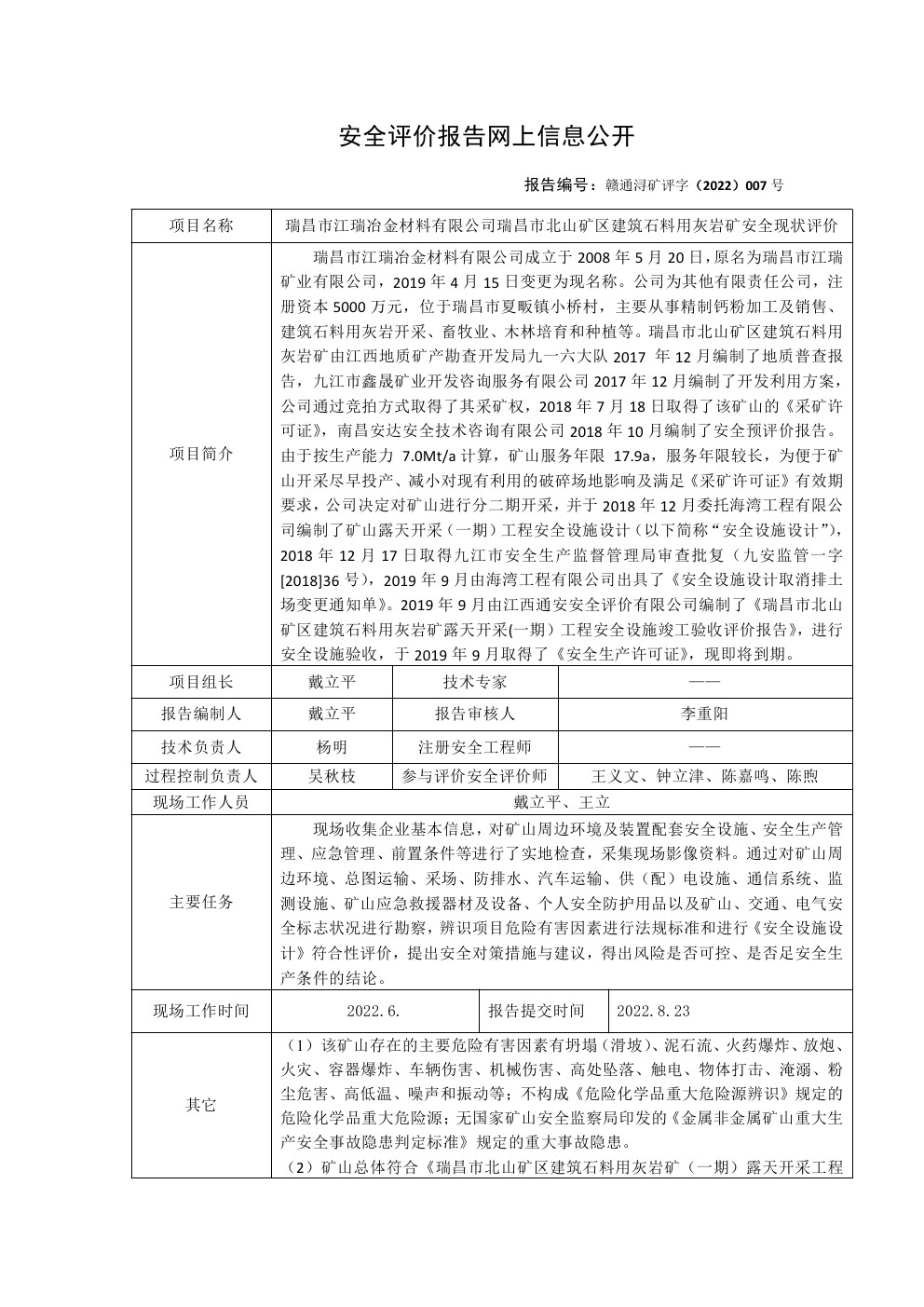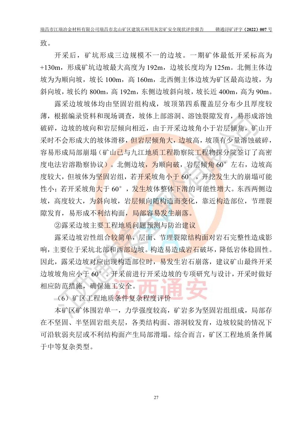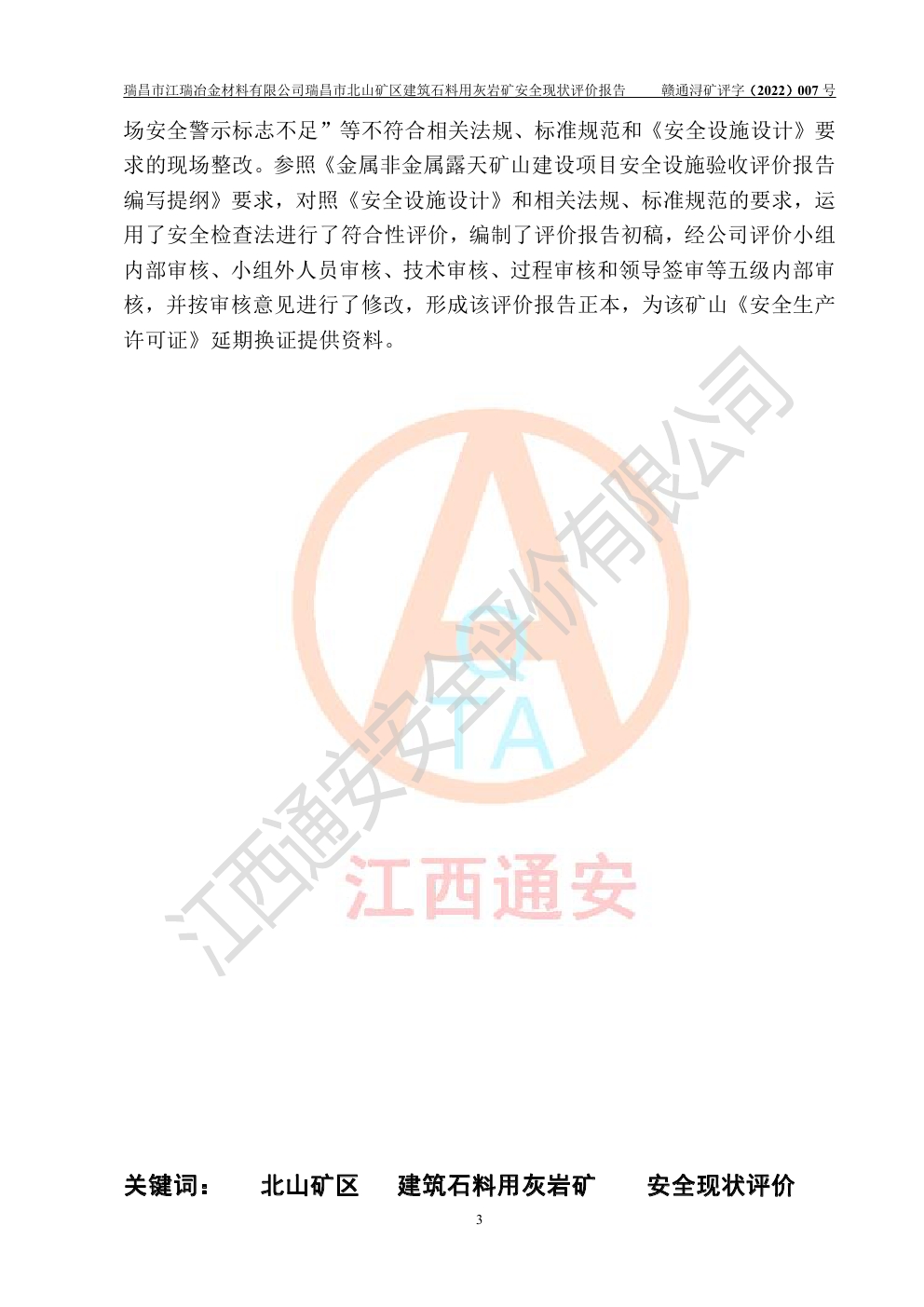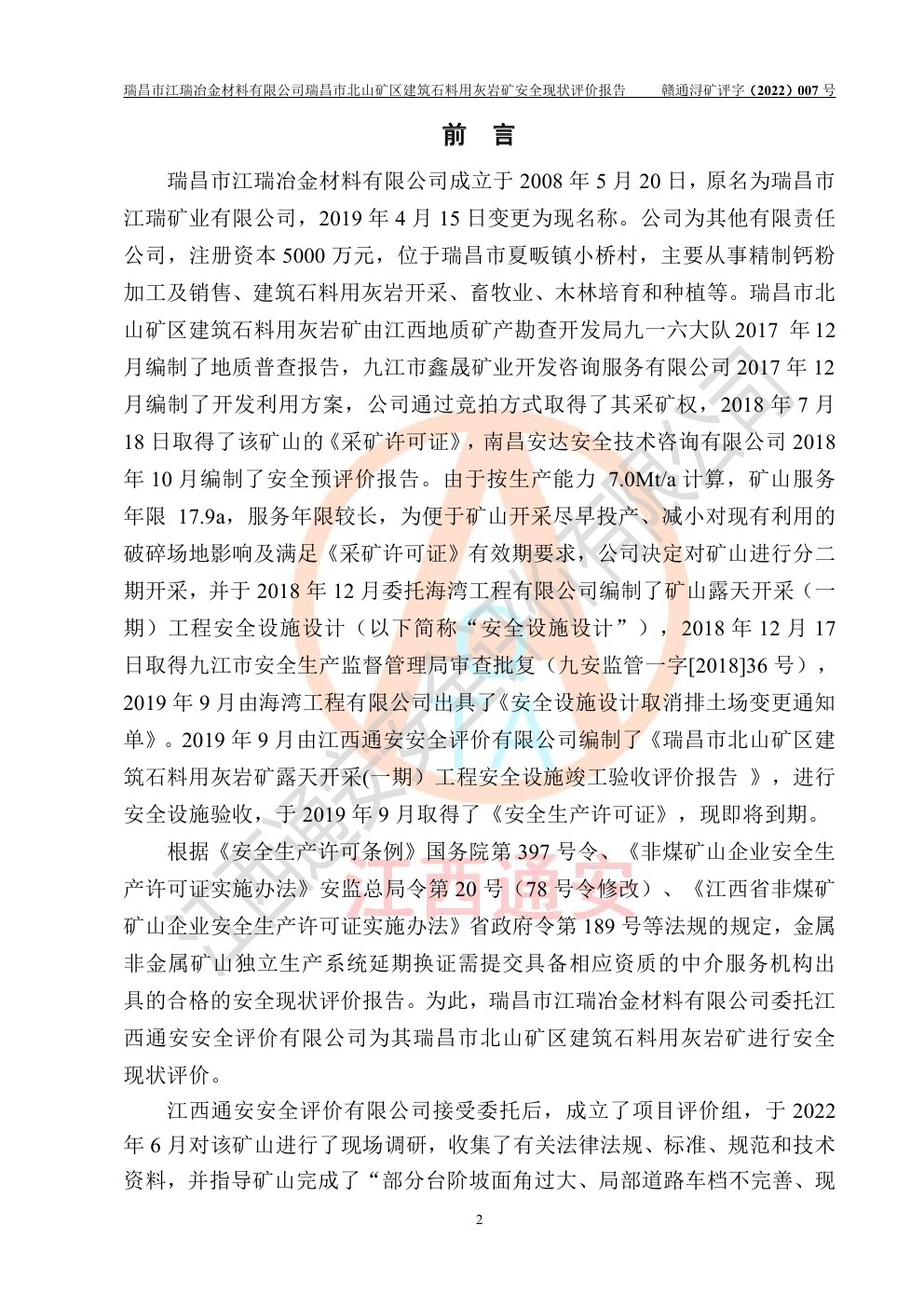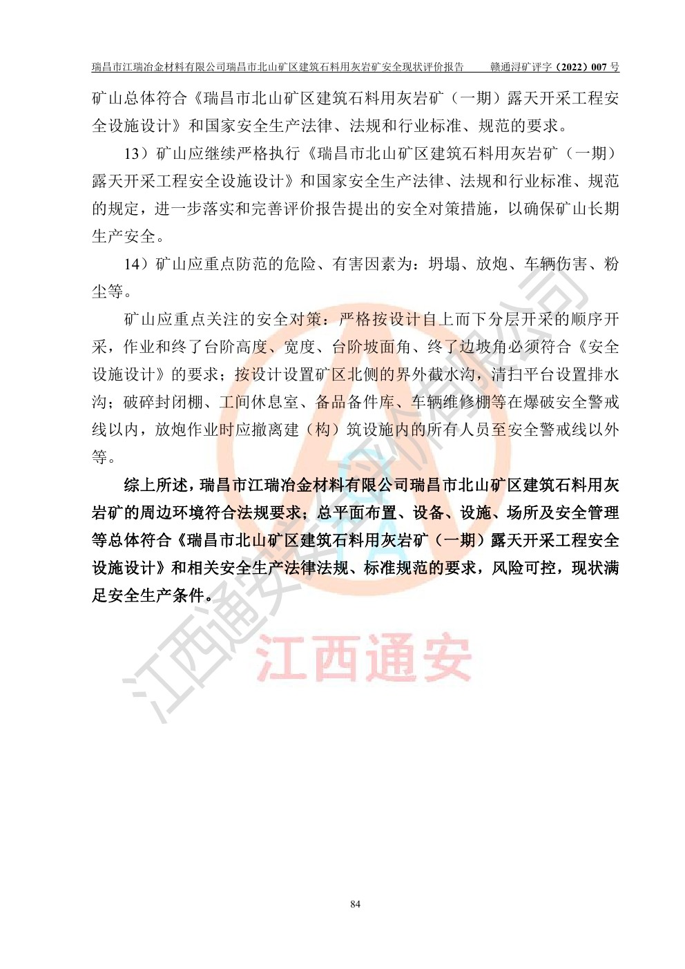 瑞昌市江瑞冶金材料有限公司瑞昌市北山礦區(qū)建筑石料用灰?guī)r礦安全現(xiàn)狀評價