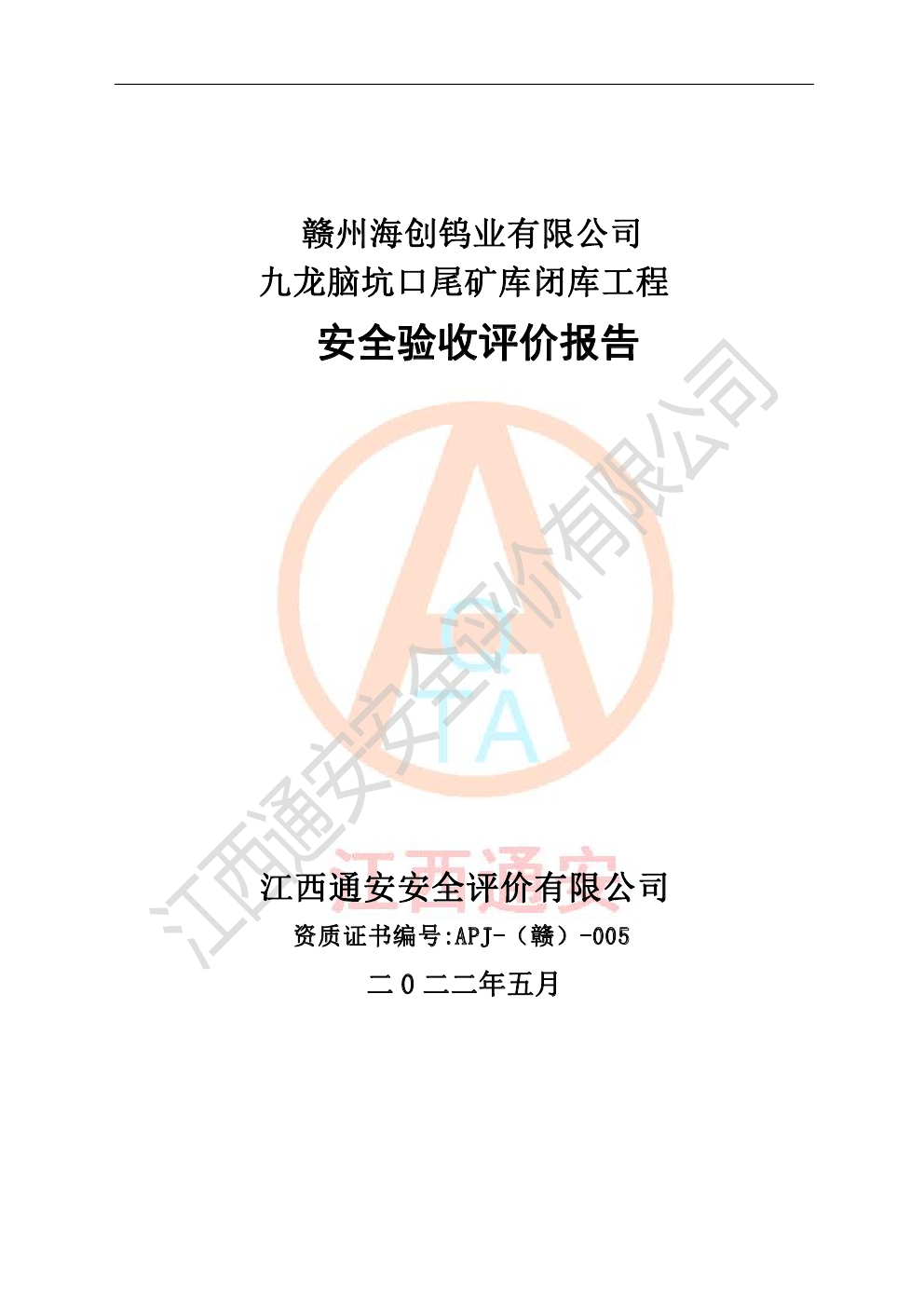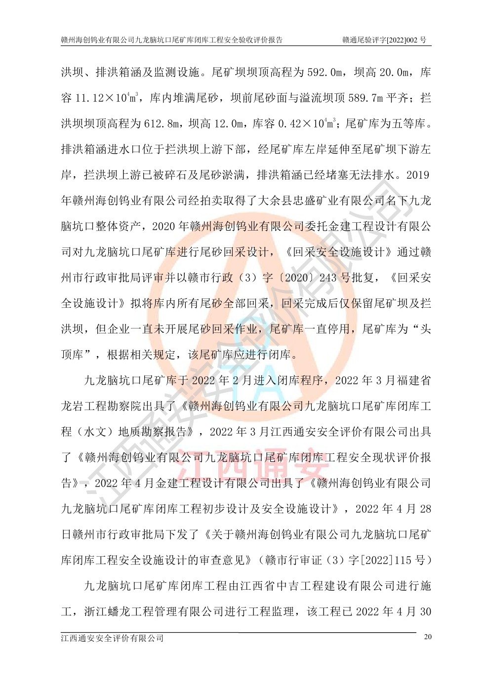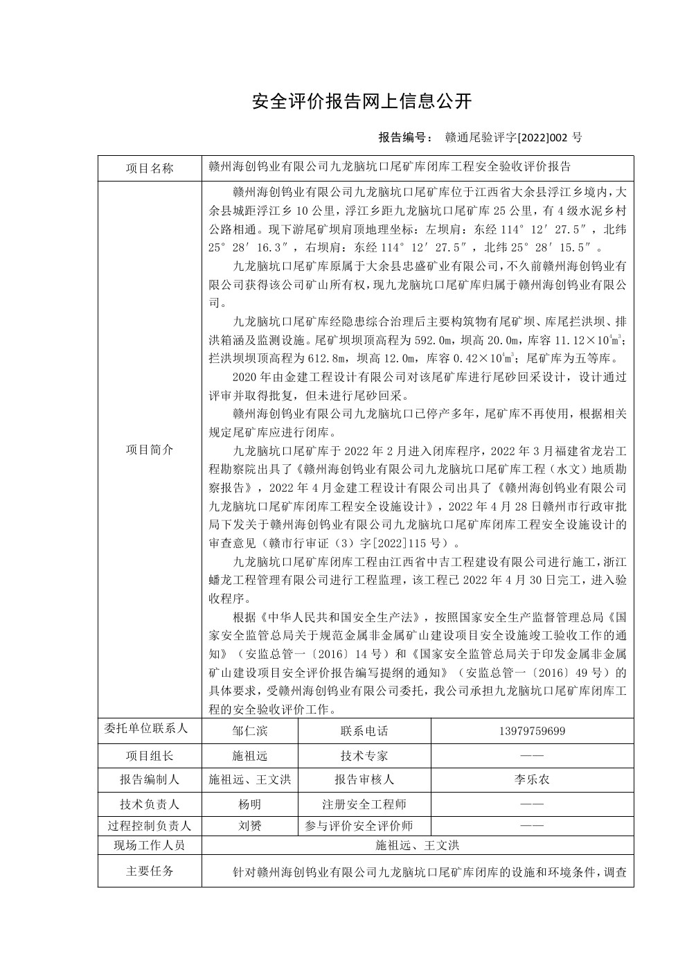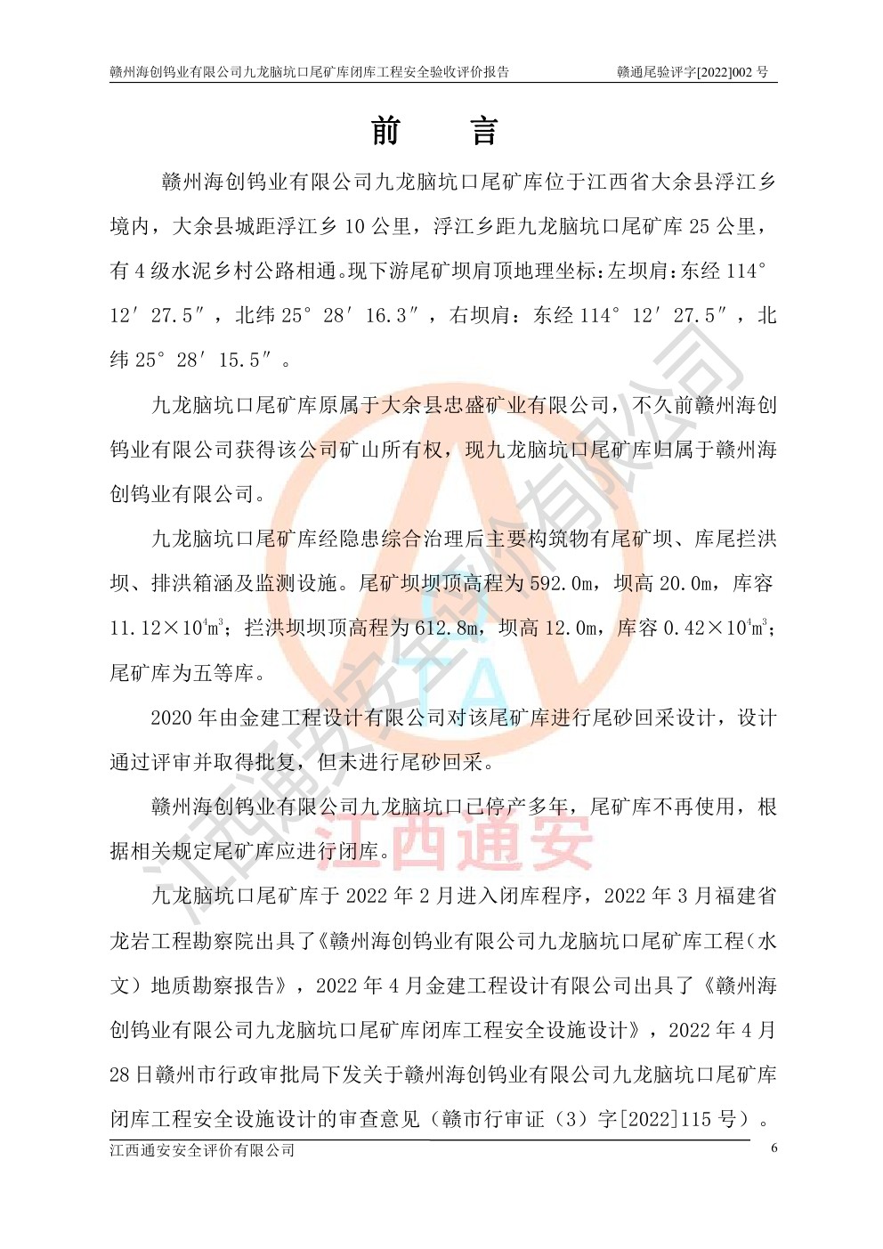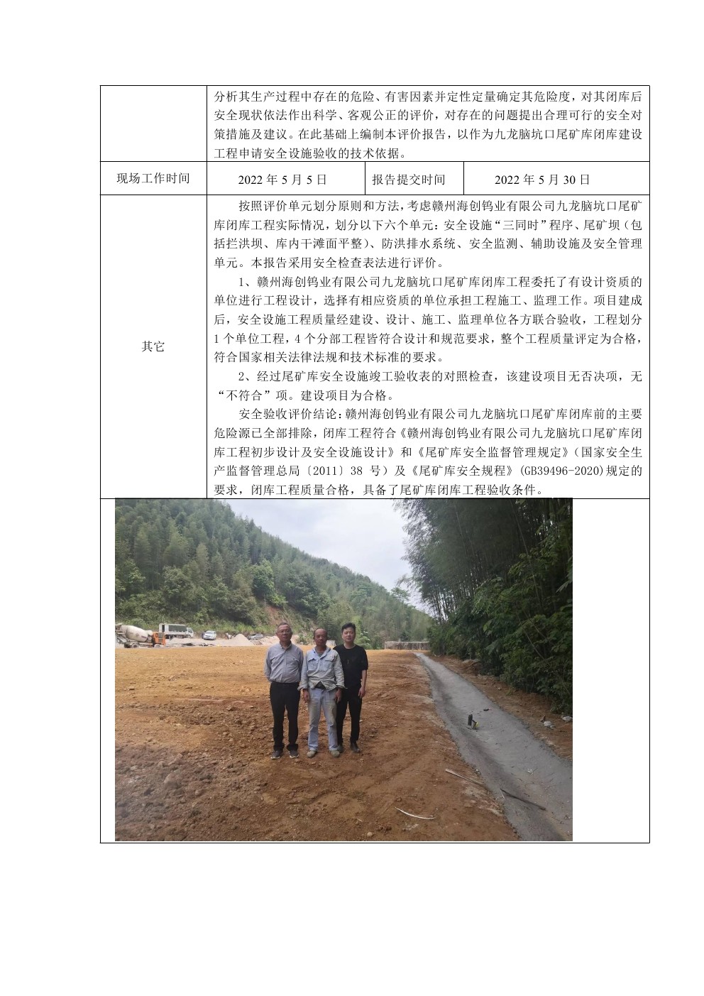 贛州海創(chuàng)鎢業(yè)有限公司九龍腦坑口尾礦庫(kù)閉庫(kù)工程安全驗(yàn)收評(píng)價(jià)報(bào)告