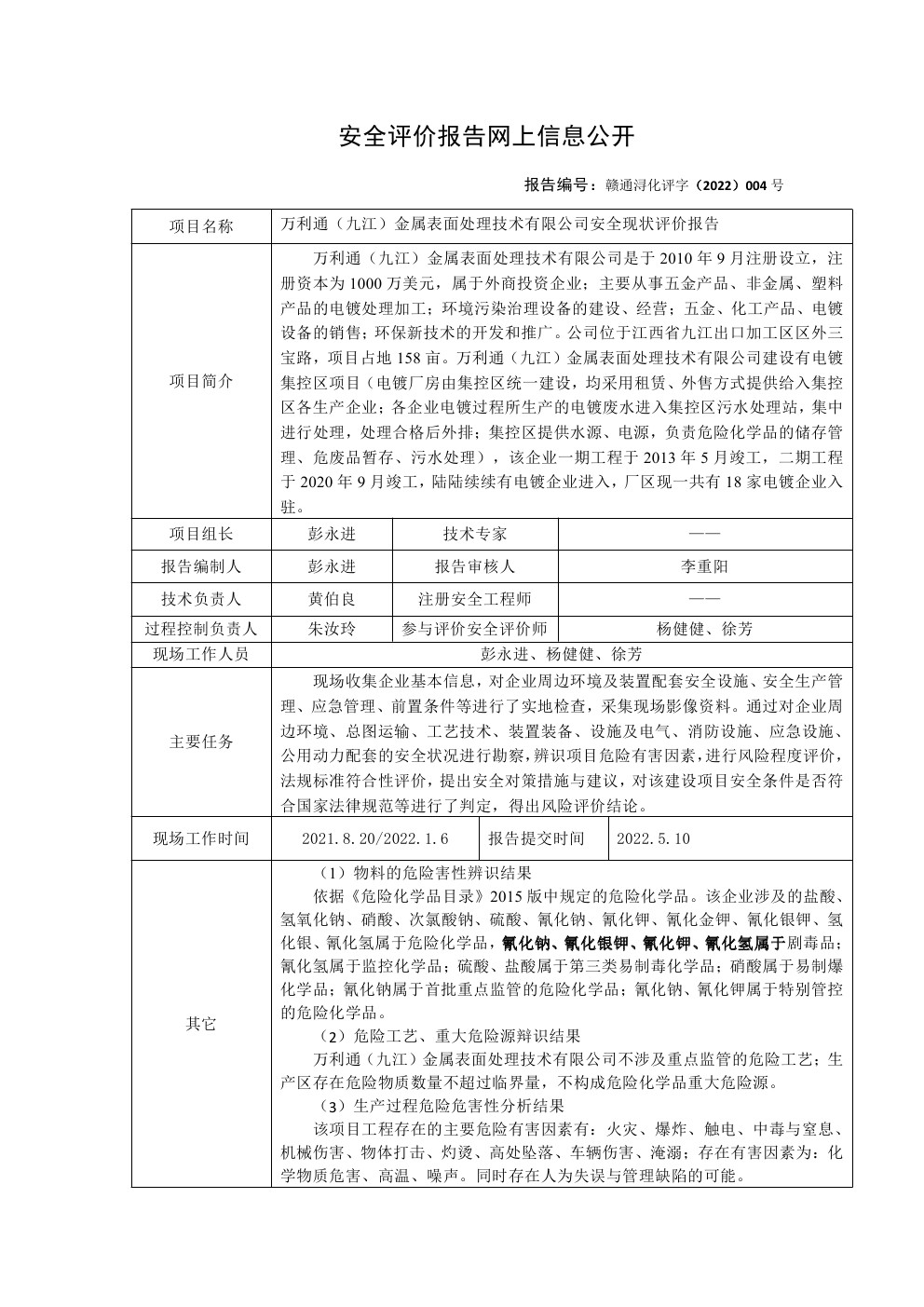 萬利通(九江)金屬表面處理技術(shù)有限公司安全現(xiàn)狀評價報告