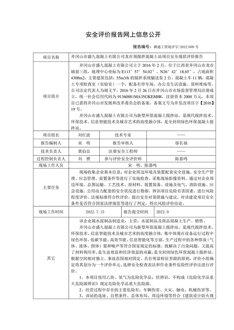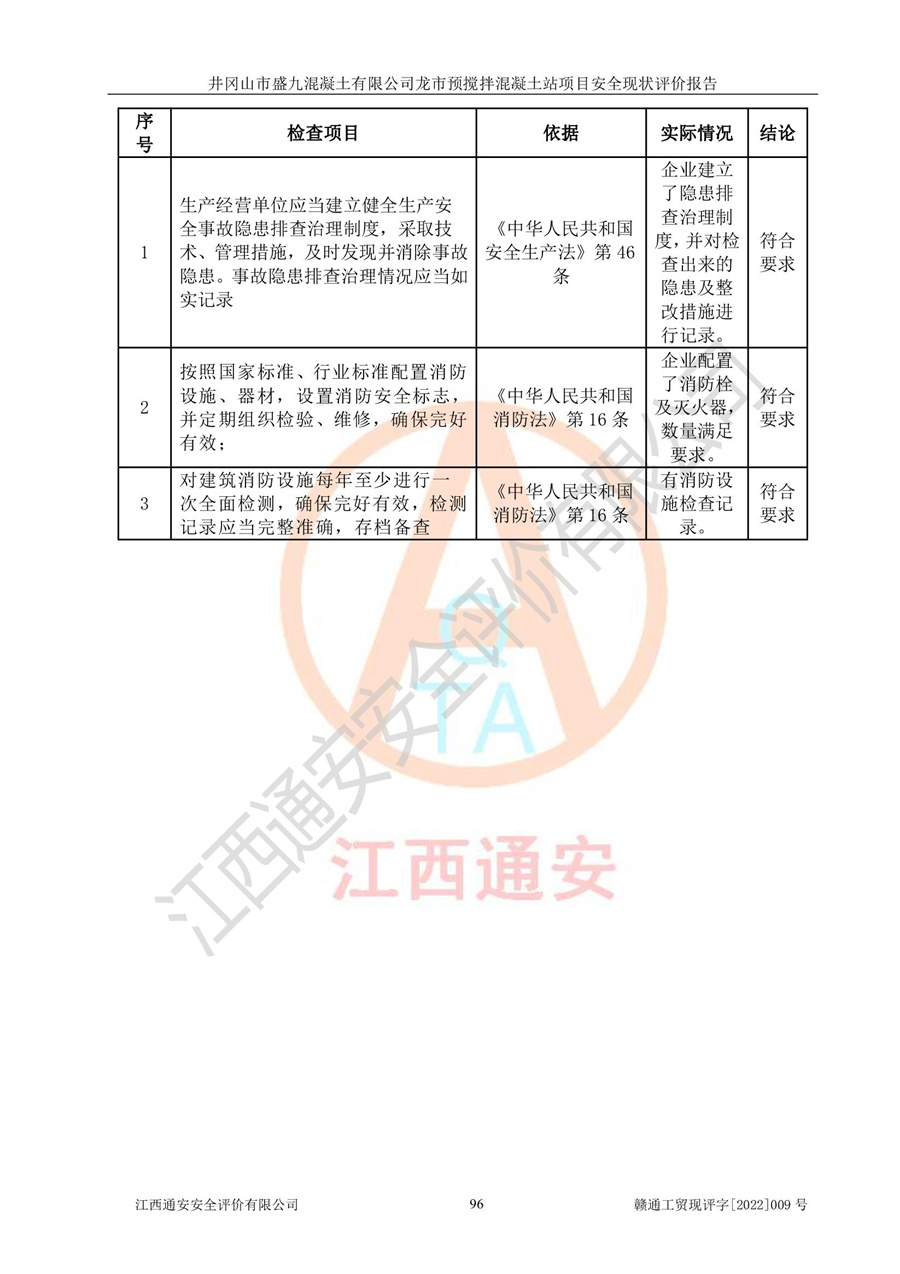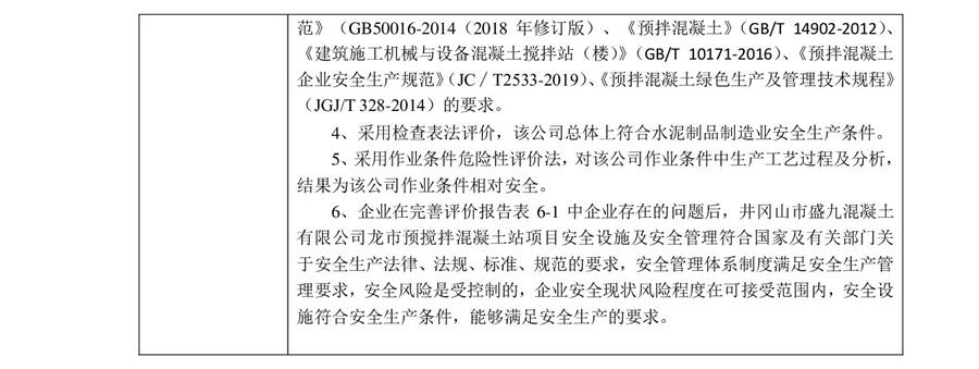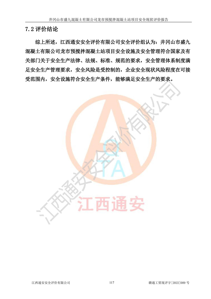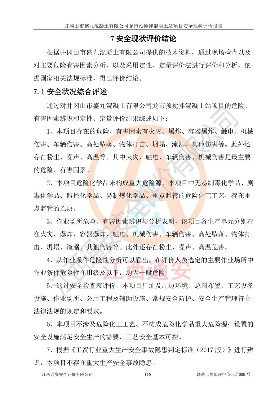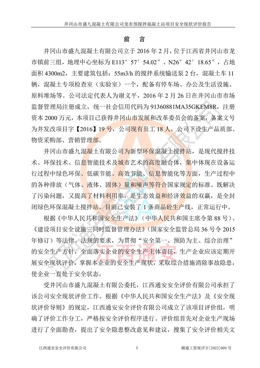 井岡山市盛九混凝土有限公司龍市預(yù)攪拌混凝土站項目安全現(xiàn)狀評價報告