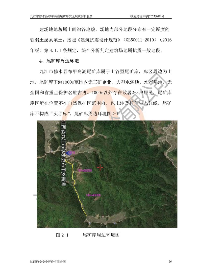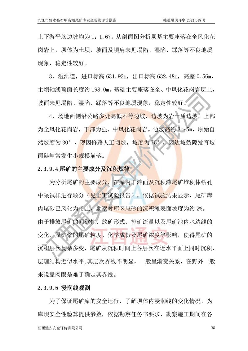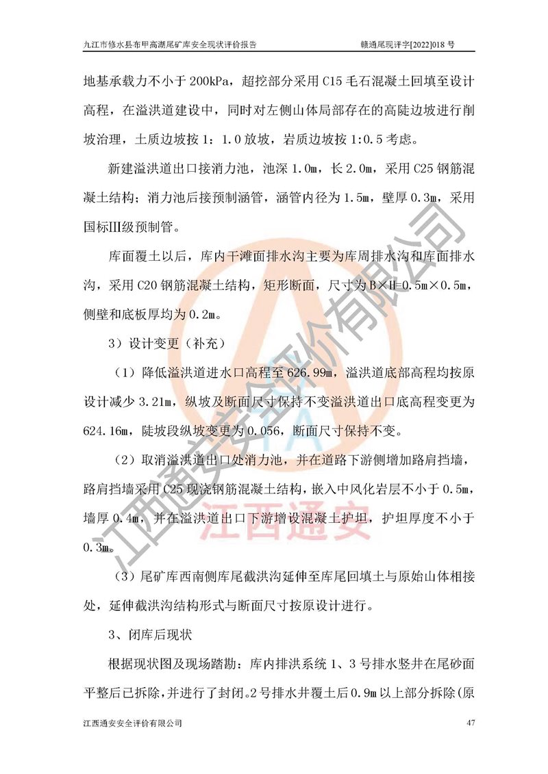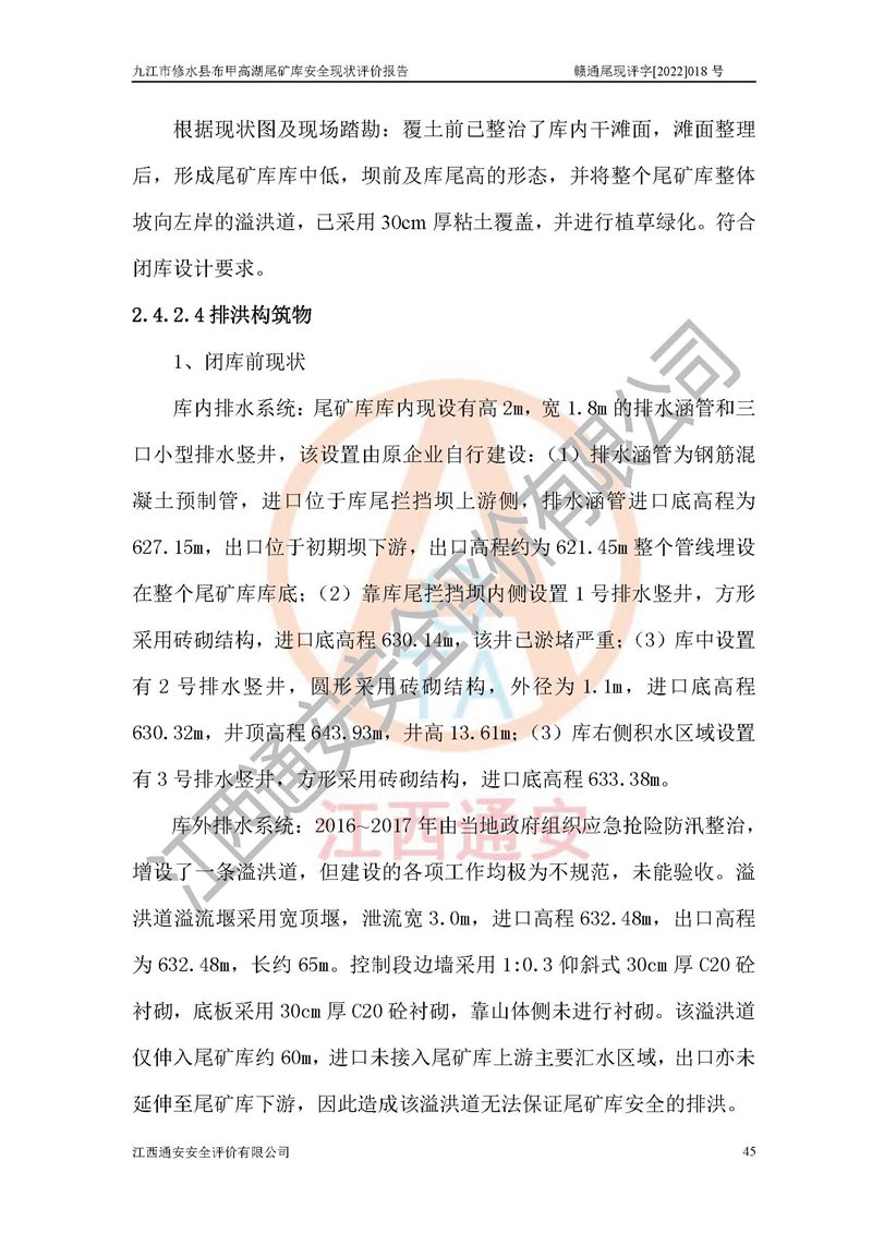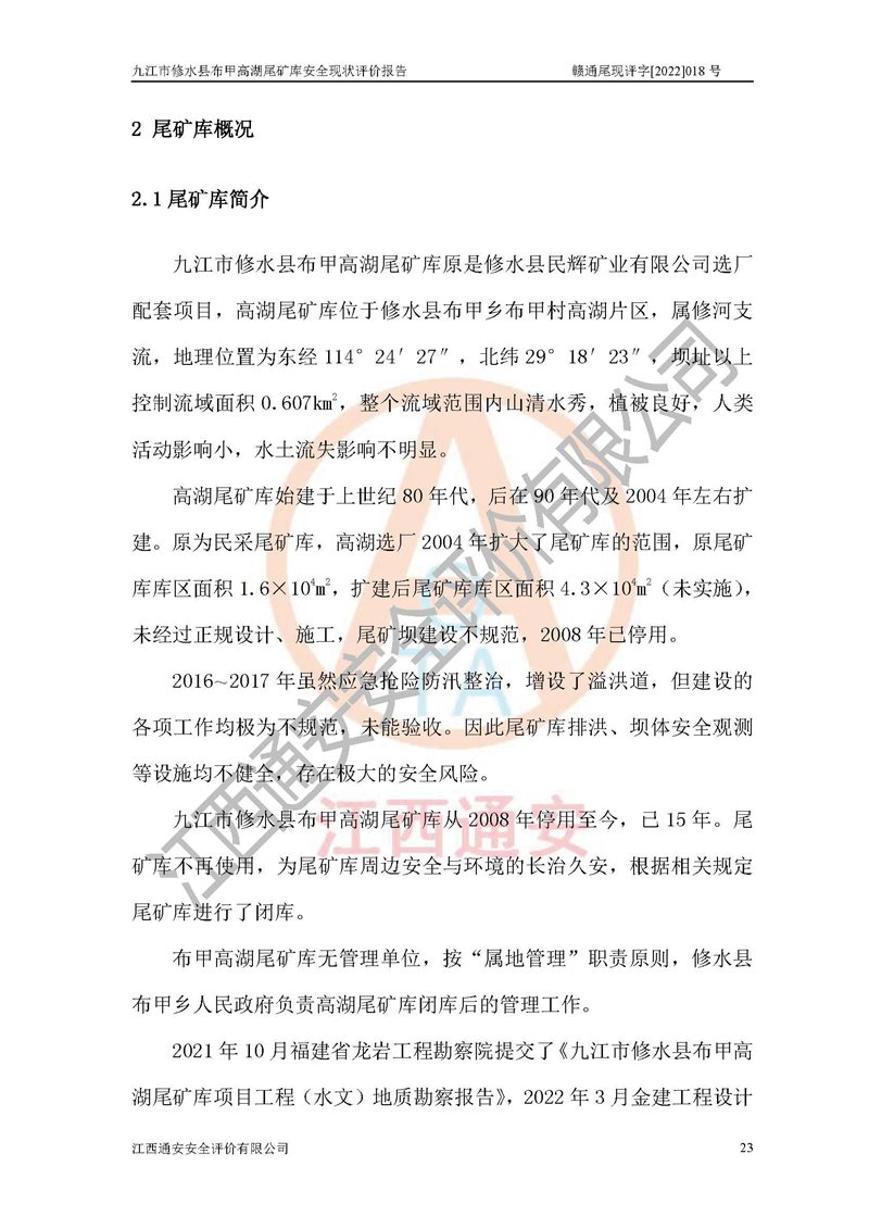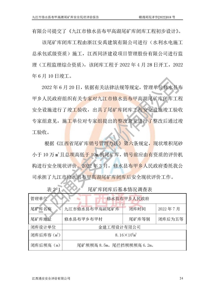 九江市修水縣布甲高湖尾礦庫(kù)位于修水縣布甲鄉(xiāng)布甲村高湖片區(qū),屬修河支流,地理位置為東經(jīng)114°24′27″,北緯29°18′23″,壩址以上控制流域面積0.607km2,整個(gè)流域范圍內(nèi)山清水秀,植被良好,人類活動(dòng)影響小,水土流失影響不明顯。 高湖尾礦庫(kù)始建于上世紀(jì)80年代,后在90年代及2004年左右擴(kuò)建。原為民采尾礦庫(kù),高湖選廠2004年擴(kuò)大了尾礦庫(kù)的范圍,原尾礦庫(kù)庫(kù)區(qū)面積1.6×104m2,擴(kuò)建后尾礦庫(kù)庫(kù)區(qū)面積4.3×104m2(未實(shí)施),未經(jīng)過(guò)正規(guī)設(shè)計(jì)、施工,尾礦壩建設(shè)不規(guī)范,2008年已停用。 2016~2017年雖然應(yīng)急搶險(xiǎn)防汛整治,增設(shè)了溢洪道,但建設(shè)的各項(xiàng)工作均極為不規(guī)范,未能驗(yàn)收。因此尾礦庫(kù)排洪、壩體安全觀測(cè)等設(shè)施均不健全,存在**的安全風(fēng)險(xiǎn)。 九江市修水縣布甲高湖尾礦庫(kù)從2008年停用至今,已15年。尾礦庫(kù)不再使用,為尾礦庫(kù)周邊安全與環(huán)境的長(zhǎng)治久安,根據(jù)相關(guān)規(guī)定尾礦庫(kù)進(jìn)行了閉庫(kù)。 修水縣布甲高湖尾礦庫(kù)無(wú)管理單位,按“屬地管理”職責(zé)原則,修水縣布甲鄉(xiāng)人民**負(fù)責(zé)高湖尾礦庫(kù)閉庫(kù)后的管理工作。 2021年10月福建省龍巖工程勘察院提交了《九江市修水縣布甲高湖尾礦庫(kù)項(xiàng)目工程(水文)地質(zhì)勘察報(bào)告》,2022年3月金建工程設(shè)計(jì)有限公司提交了《九江市修水縣布甲高湖尾礦庫(kù)閉庫(kù)工程初步設(shè)計(jì)》。 該尾礦庫(kù)閉庫(kù)工程由浙江安禹建筑有限公司進(jìn)行(水利水電施工總承包貳級(jí)資質(zhì))施工,江西同濟(jì)建設(shè)項(xiàng)目管理股份有限公司進(jìn)行監(jiān)理(工程監(jiān)理綜合資質(zhì)),該閉庫(kù)工程于2022年4月28日開(kāi)工,2022年6月10日竣工。 |