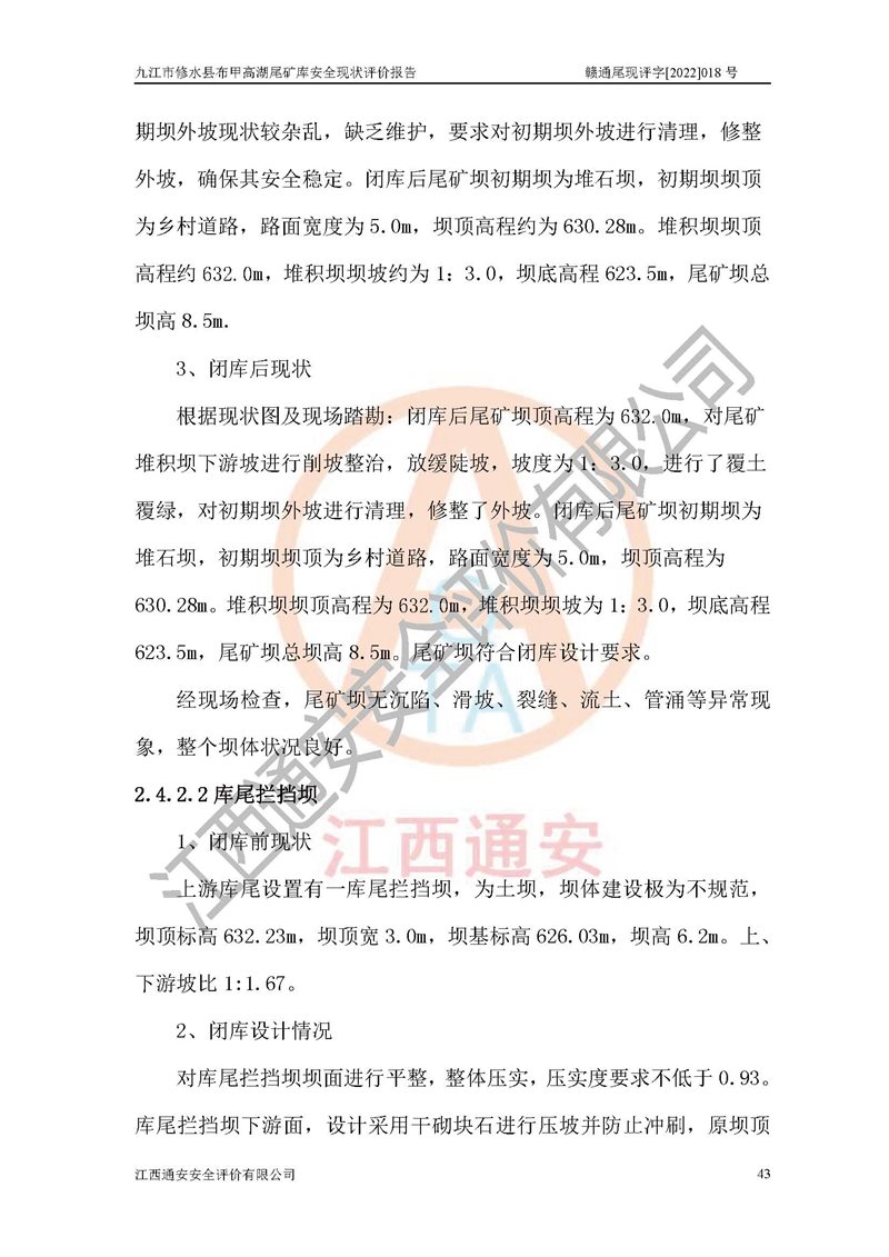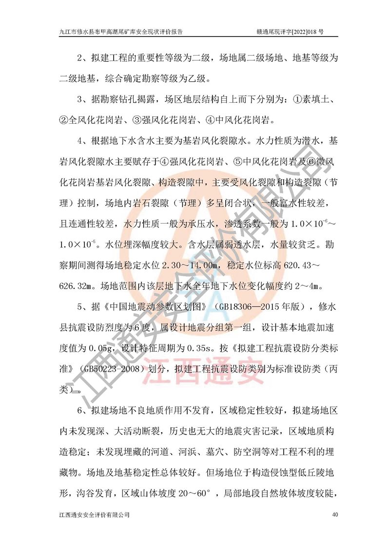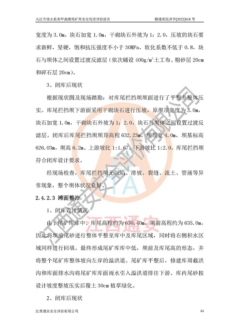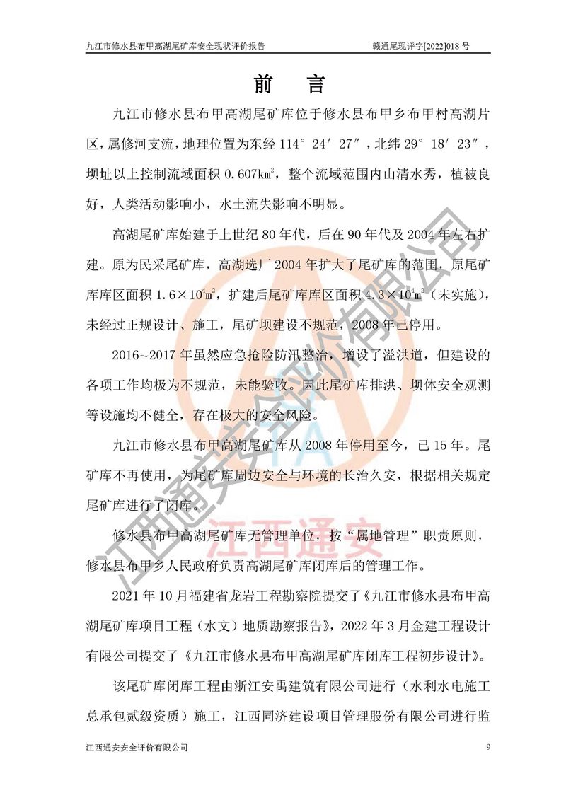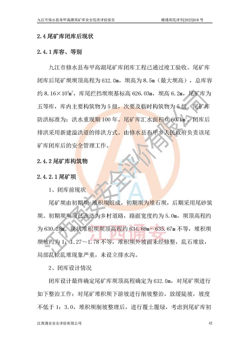 九江市修水縣布甲高湖尾礦庫(kù)位于修水縣布甲鄉(xiāng)布甲村高湖片區(qū),屬修河支流,地理位置為東經(jīng)114°24′27″,北緯29°18′23″,壩址以上控制流域面積0.607km2,整個(gè)流域范圍內(nèi)山清水秀,植被良好,人類活動(dòng)影響小,水土流失影響不明顯。 高湖尾礦庫(kù)始建于上世紀(jì)80年代,后在90年代及2004年左右擴(kuò)建。原為民采尾礦庫(kù),高湖選廠2004年擴(kuò)大了尾礦庫(kù)的范圍,原尾礦庫(kù)庫(kù)區(qū)面積1.6×104m2,擴(kuò)建后尾礦庫(kù)庫(kù)區(qū)面積4.3×104m2(未實(shí)施),未經(jīng)過(guò)正規(guī)設(shè)計(jì)、施工,尾礦壩建設(shè)不規(guī)范,2008年已停用。 2016~2017年雖然應(yīng)急搶險(xiǎn)防汛整治,增設(shè)了溢洪道,但建設(shè)的各項(xiàng)工作均極為不規(guī)范,未能驗(yàn)收。因此尾礦庫(kù)排洪、壩體安全觀測(cè)等設(shè)施均不健全,存在**的安全風(fēng)險(xiǎn)。 九江市修水縣布甲高湖尾礦庫(kù)從2008年停用至今,已15年。尾礦庫(kù)不再使用,為尾礦庫(kù)周邊安全與環(huán)境的長(zhǎng)治久安,根據(jù)相關(guān)規(guī)定尾礦庫(kù)進(jìn)行了閉庫(kù)。 修水縣布甲高湖尾礦庫(kù)無(wú)管理單位,按“屬地管理”職責(zé)原則,修水縣布甲鄉(xiāng)人民**負(fù)責(zé)高湖尾礦庫(kù)閉庫(kù)后的管理工作。 2021年10月福建省龍巖工程勘察院提交了《九江市修水縣布甲高湖尾礦庫(kù)項(xiàng)目工程(水文)地質(zhì)勘察報(bào)告》,2022年3月金建工程設(shè)計(jì)有限公司提交了《九江市修水縣布甲高湖尾礦庫(kù)閉庫(kù)工程初步設(shè)計(jì)》。 該尾礦庫(kù)閉庫(kù)工程由浙江安禹建筑有限公司進(jìn)行(水利水電施工總承包貳級(jí)資質(zhì))施工,江西同濟(jì)建設(shè)項(xiàng)目管理股份有限公司進(jìn)行監(jiān)理(工程監(jiān)理綜合資質(zhì)),該閉庫(kù)工程于2022年4月28日開(kāi)工,2022年6月10日竣工。 |