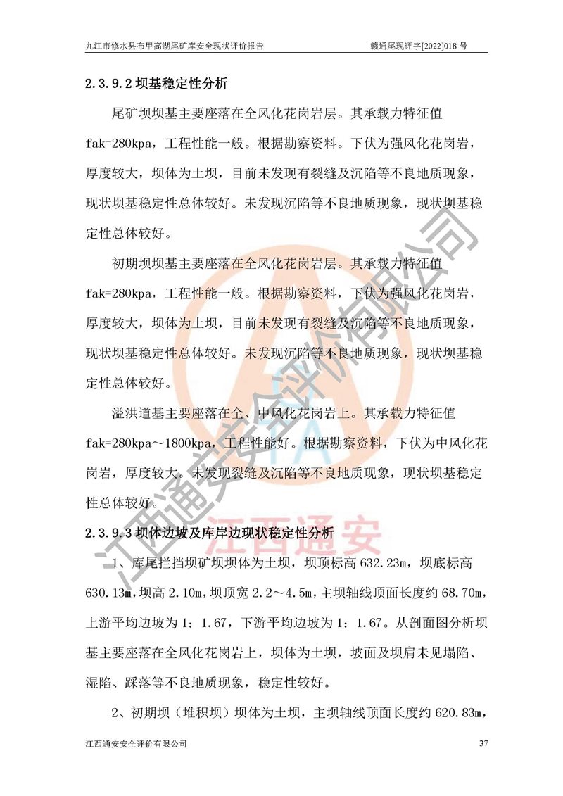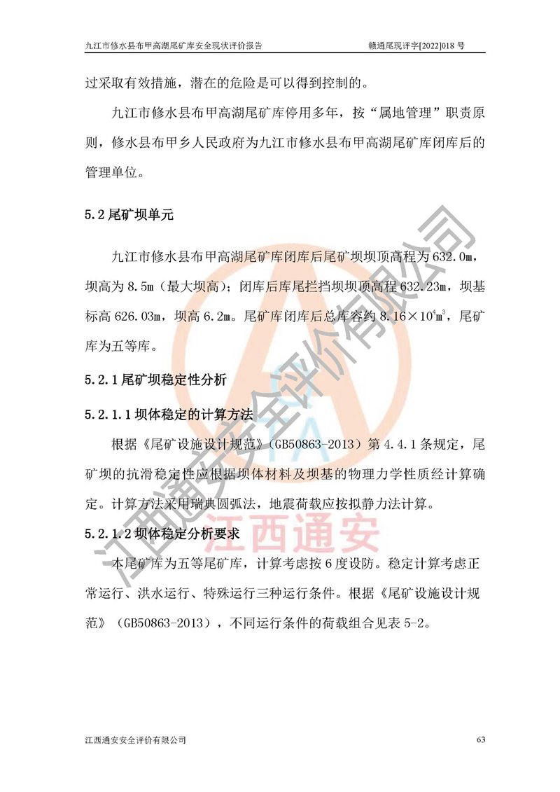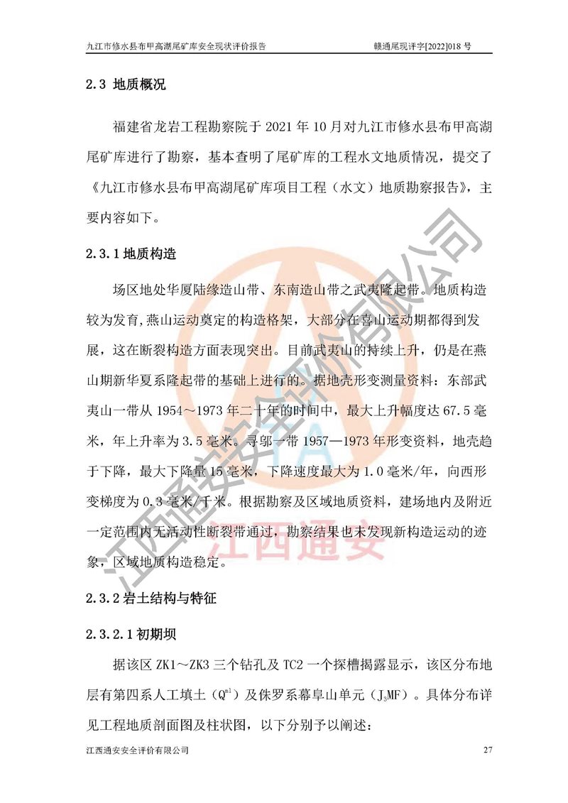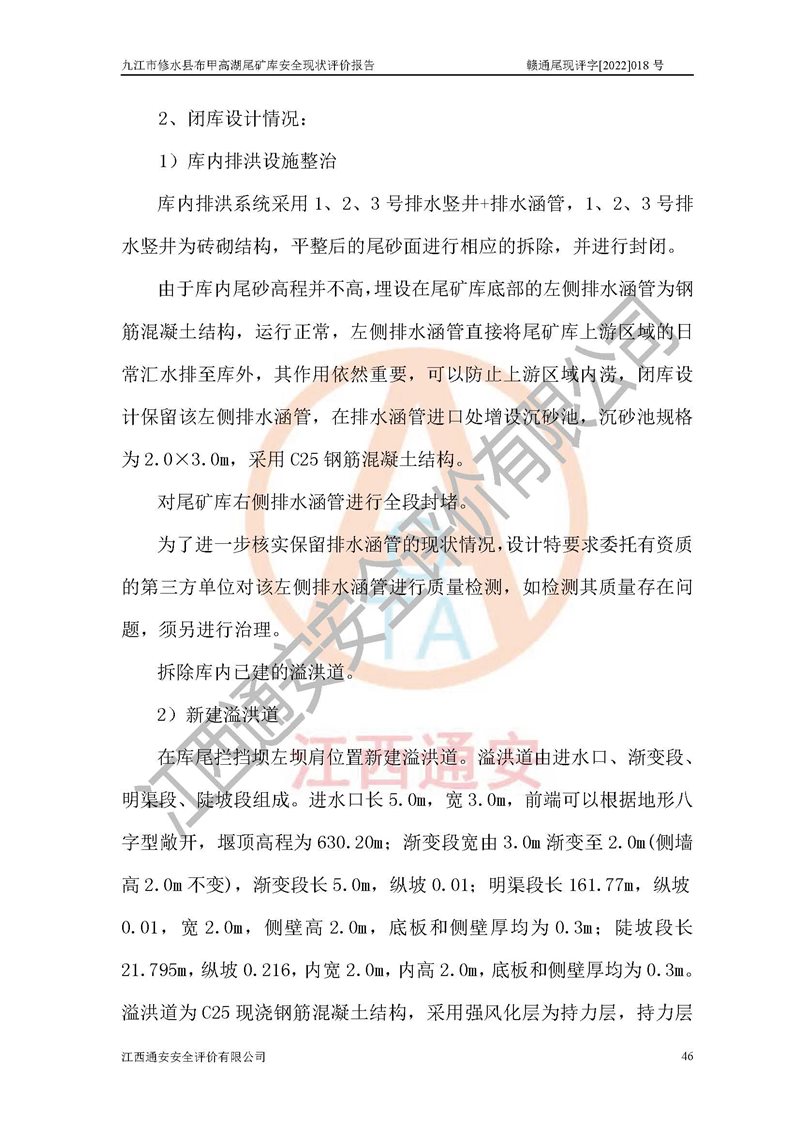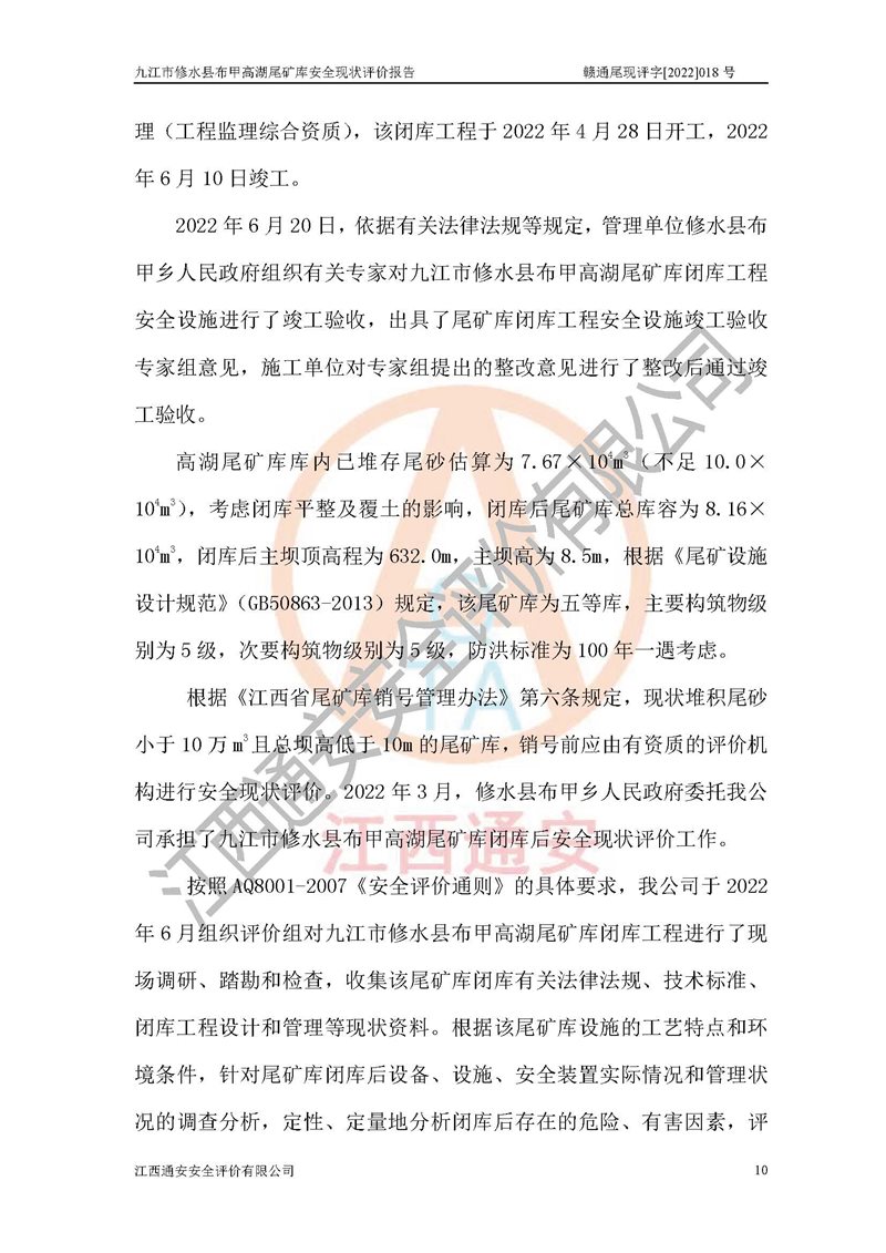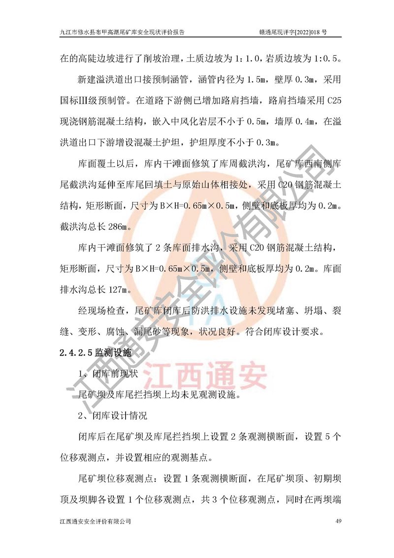九江市修水縣布甲高湖尾礦庫(kù)位于修水縣布甲鄉(xiāng)布甲村高湖片區(qū),屬修河支流,地理位置為東經(jīng)114°24′27″,北緯29°18′23″,壩址以上控制流域面積0.607km2,整個(gè)流域范圍內(nèi)山清水秀,植被良好,人類活動(dòng)影響小,水土流失影響不明顯。 高湖尾礦庫(kù)始建于上世紀(jì)80年代,后在90年代及2004年左右擴(kuò)建。原為民采尾礦庫(kù),高湖選廠2004年擴(kuò)大了尾礦庫(kù)的范圍,原尾礦庫(kù)庫(kù)區(qū)面積1.6×104m2,擴(kuò)建后尾礦庫(kù)庫(kù)區(qū)面積4.3×104m2(未實(shí)施),未經(jīng)過(guò)正規(guī)設(shè)計(jì)、施工,尾礦壩建設(shè)不規(guī)范,2008年已停用。 2016~2017年雖然應(yīng)急搶險(xiǎn)防汛整治,增設(shè)了溢洪道,但建設(shè)的各項(xiàng)工作均極為不規(guī)范,未能驗(yàn)收。因此尾礦庫(kù)排洪、壩體安全觀測(cè)等設(shè)施均不健全,存在**的安全風(fēng)險(xiǎn)。 九江市修水縣布甲高湖尾礦庫(kù)從2008年停用至今,已15年。尾礦庫(kù)不再使用,為尾礦庫(kù)周邊安全與環(huán)境的長(zhǎng)治久安,根據(jù)相關(guān)規(guī)定尾礦庫(kù)進(jìn)行了閉庫(kù)。 修水縣布甲高湖尾礦庫(kù)無(wú)管理單位,按“屬地管理”職責(zé)原則,修水縣布甲鄉(xiāng)人民**負(fù)責(zé)高湖尾礦庫(kù)閉庫(kù)后的管理工作。 2021年10月福建省龍巖工程勘察院提交了《九江市修水縣布甲高湖尾礦庫(kù)項(xiàng)目工程(水文)地質(zhì)勘察報(bào)告》,2022年3月金建工程設(shè)計(jì)有限公司提交了《九江市修水縣布甲高湖尾礦庫(kù)閉庫(kù)工程初步設(shè)計(jì)》。 該尾礦庫(kù)閉庫(kù)工程由浙江安禹建筑有限公司進(jìn)行(水利水電施工總承包貳級(jí)資質(zhì))施工,江西同濟(jì)建設(shè)項(xiàng)目管理股份有限公司進(jìn)行監(jiān)理(工程監(jiān)理綜合資質(zhì)),該閉庫(kù)工程于2022年4月28日開(kāi)工,2022年6月10日竣工。 |