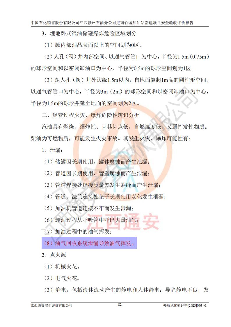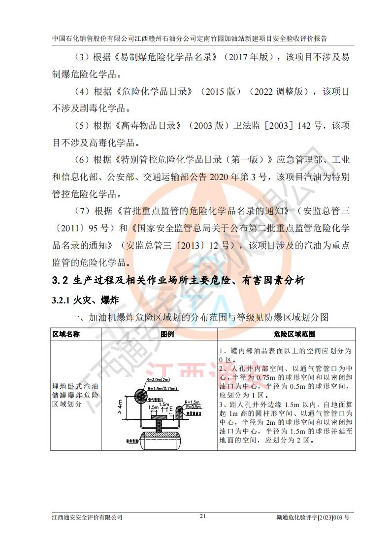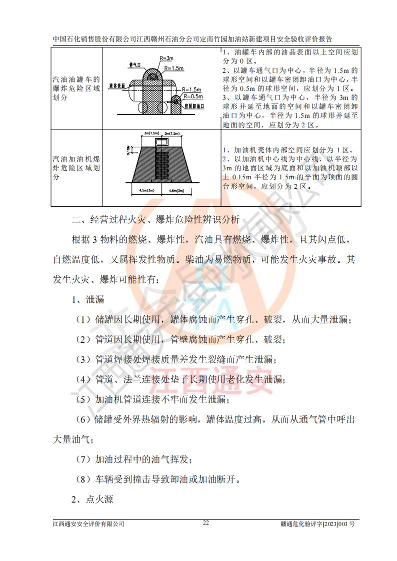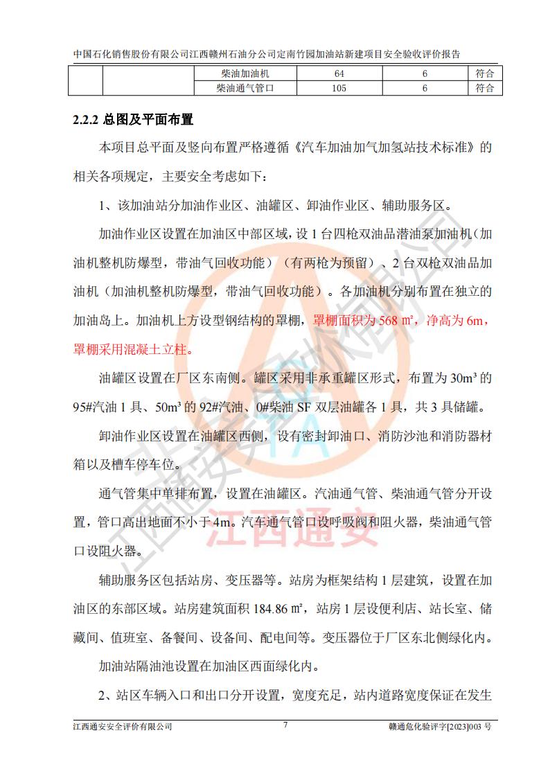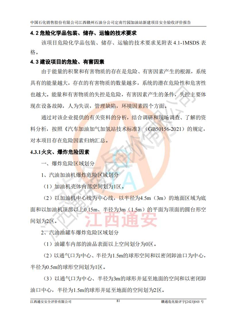 項目簡介 | 本報告為中國石化銷售股份有限公司江西贛州石油分公司定南竹園加油站(以下簡稱竹園加油站)新建項目的安全驗收評價報告。竹園加油站位于江西省贛州市定南縣竹園村S266省道東側(歷市鎮(zhèn)竹園村路段)。中國石化銷售股份有限公司江西贛州石油分公司法定**人為聶志群,成立日期為2000年6月15日,統(tǒng)一社會信用代碼91360700705714329Q。經營范圍包括成品油(汽油、柴油)零售。該站于2021年8月26日取得定南縣發(fā)展和改革委員會出具的《江西省企業(yè)投資項目備案通知書》(項目統(tǒng)一代碼為:2019-360728-45-03-015645),由河北海川能源科技股份有限公司設計。2020年7月18日已取得定南縣應急管理局出具的安全條件審查批復,2020年8月26日已取得定南縣應急管理局出具的安全設施設計審查批復。2021年8月20日由哈爾濱天源石化工程設計有限責任公司重新出具了施工圖,由江西海潤建設工程有限公司進行施工。 本站設置50m3的柴油臥式SF雙層油罐、92#汽油臥式SF雙層油罐各一具,30m3的95#汽油臥式SF雙層油罐1具,總罐容積為130m3,油儲容積為105m3(柴油折半),屬于二級加油站。 汽油和柴油均是化學品液體。汽油、柴油均為危險化學品,其中汽油火險分級為甲B類,其蒸汽與空氣形成爆炸性氣體,遇明火、高熱易燃燒爆炸;柴油火險分級為丙A類,遇明火、高熱或與氧化劑接觸,有引起燃燒爆炸的危險。 | ||||