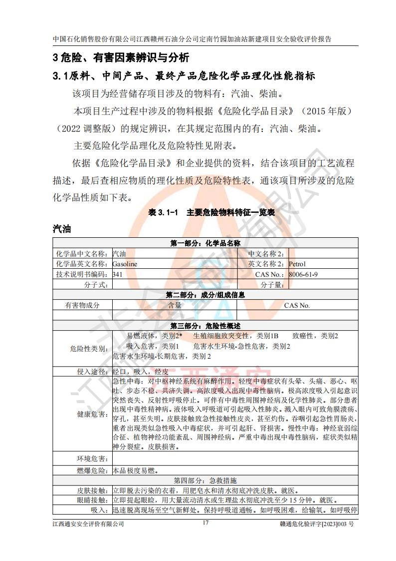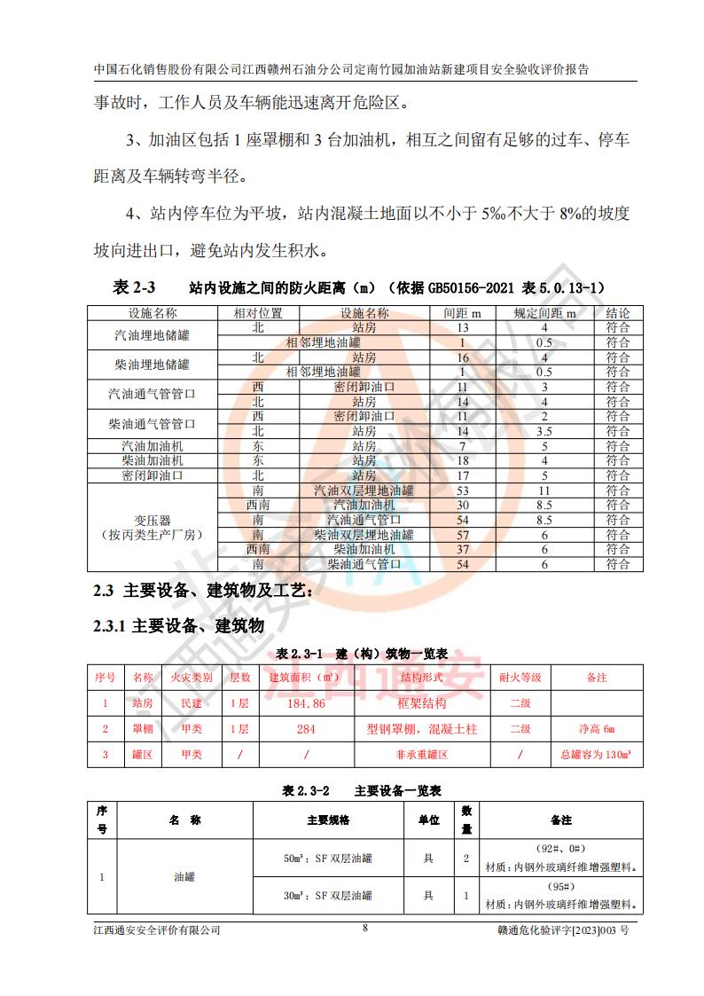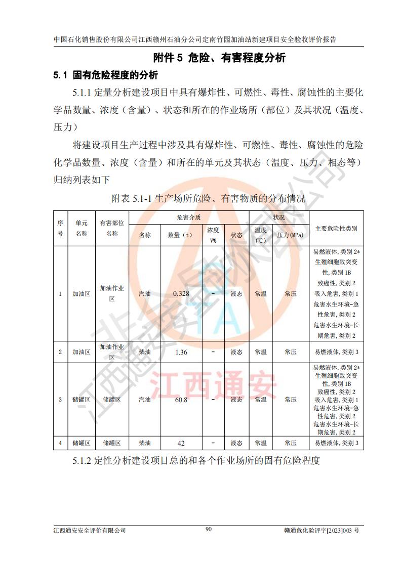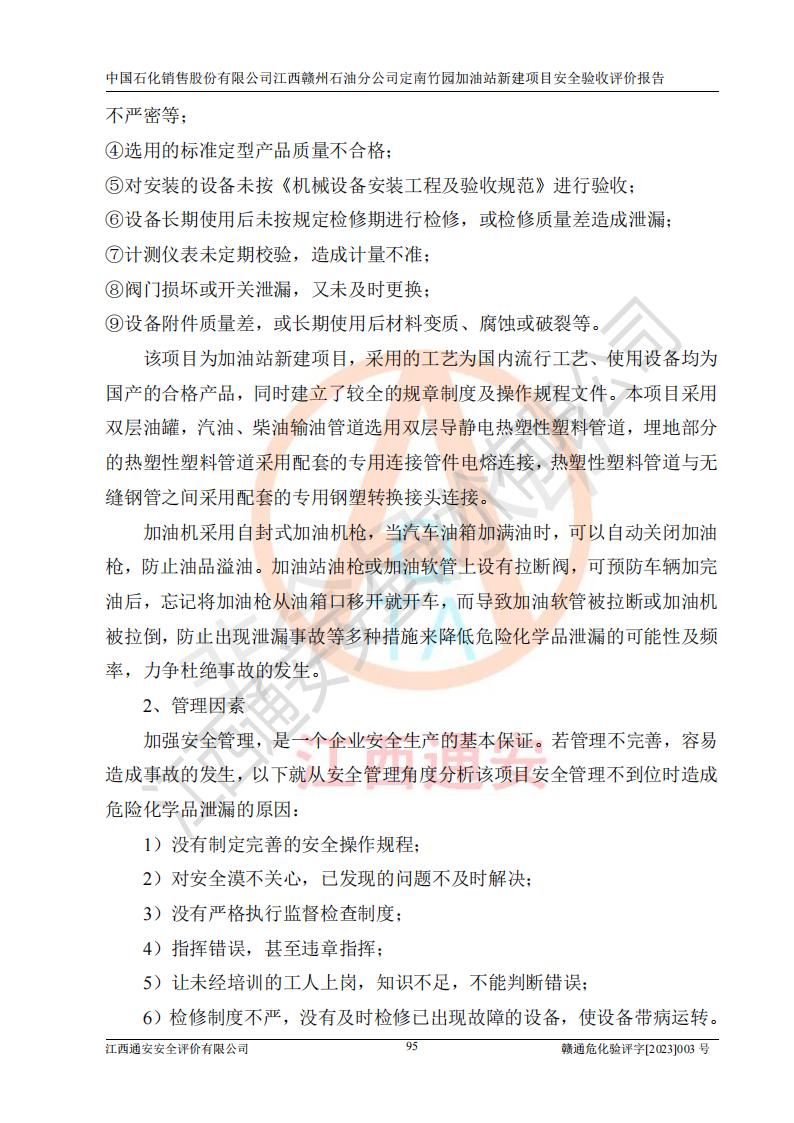 項目簡介 | 本報告為中國石化銷售股份有限公司江西贛州石油分公司定南竹園加油站(以下簡稱竹園加油站)新建項目的安全驗收評價報告。竹園加油站位于江西省贛州市定南縣竹園村S266省道東側(歷市鎮(zhèn)竹園村路段)。中國石化銷售股份有限公司江西贛州石油分公司法定**人為聶志群,成立日期為2000年6月15日,統(tǒng)一社會信用代碼91360700705714329Q。經營范圍包括成品油(汽油、柴油)零售。該站于2021年8月26日取得定南縣發(fā)展和改革委員會出具的《江西省企業(yè)投資項目備案通知書》(項目統(tǒng)一代碼為:2019-360728-45-03-015645),由河北海川能源科技股份有限公司設計。2020年7月18日已取得定南縣應急管理局出具的安全條件審查批復,2020年8月26日已取得定南縣應急管理局出具的安全設施設計審查批復。2021年8月20日由哈爾濱天源石化工程設計有限責任公司重新出具了施工圖,由江西海潤建設工程有限公司進行施工。 本站設置50m3的柴油臥式SF雙層油罐、92#汽油臥式SF雙層油罐各一具,30m3的95#汽油臥式SF雙層油罐1具,總罐容積為130m3,油儲容積為105m3(柴油折半),屬于二級加油站。 汽油和柴油均是化學品液體。汽油、柴油均為危險化學品,其中汽油火險分級為甲B類,其蒸汽與空氣形成爆炸性氣體,遇明火、高熱易燃燒爆炸;柴油火險分級為丙A類,遇明火、高熱或與氧化劑接觸,有引起燃燒爆炸的危險。 | ||||