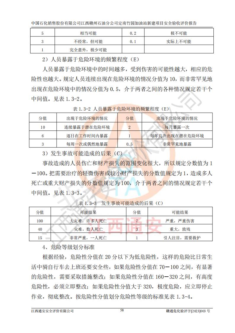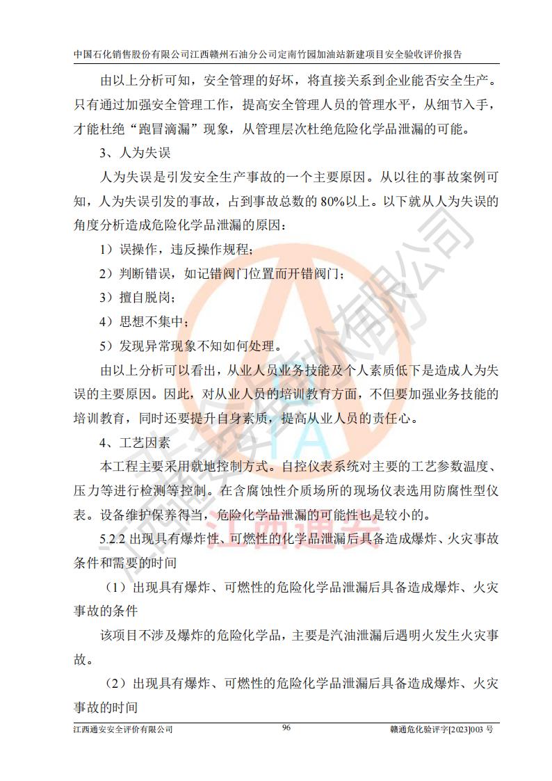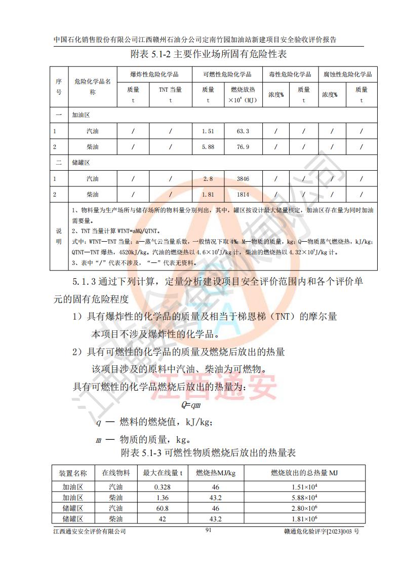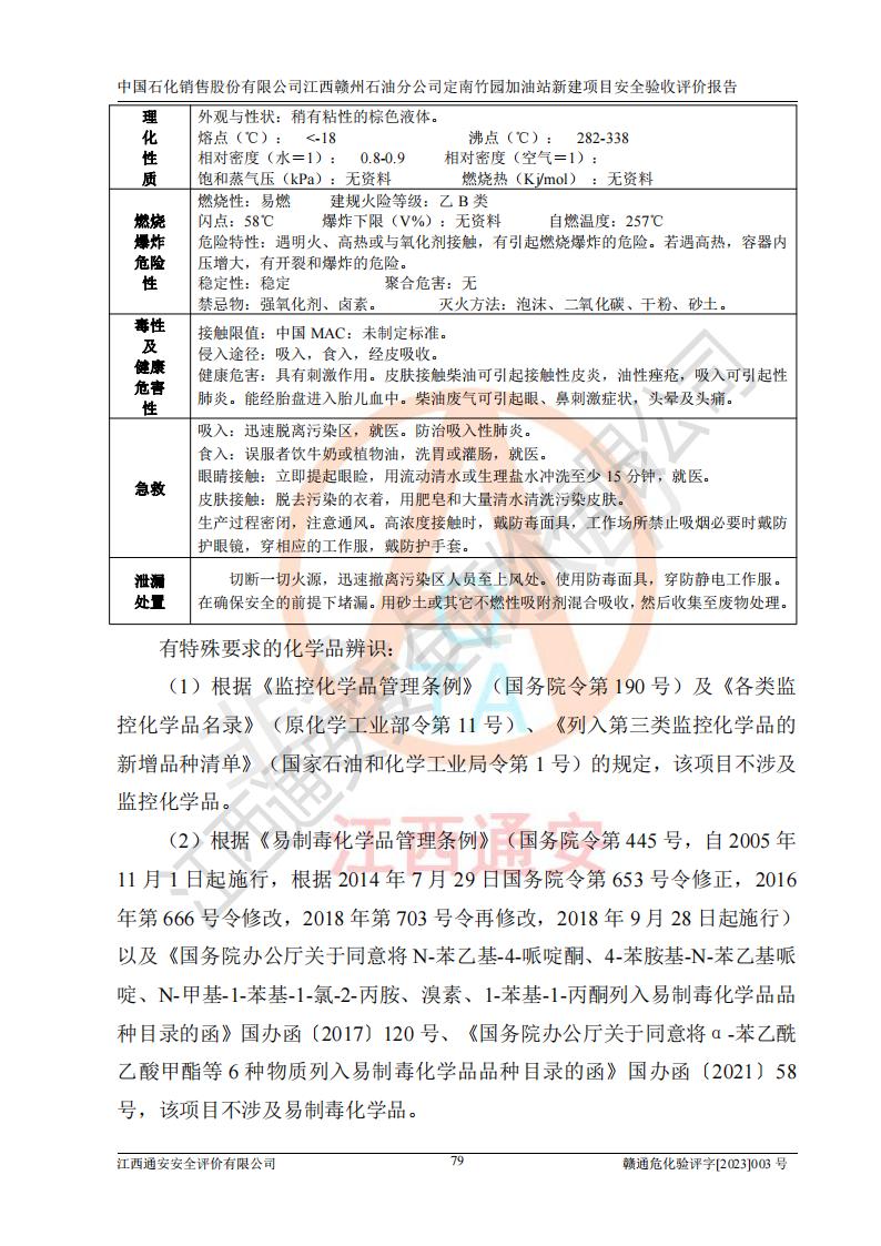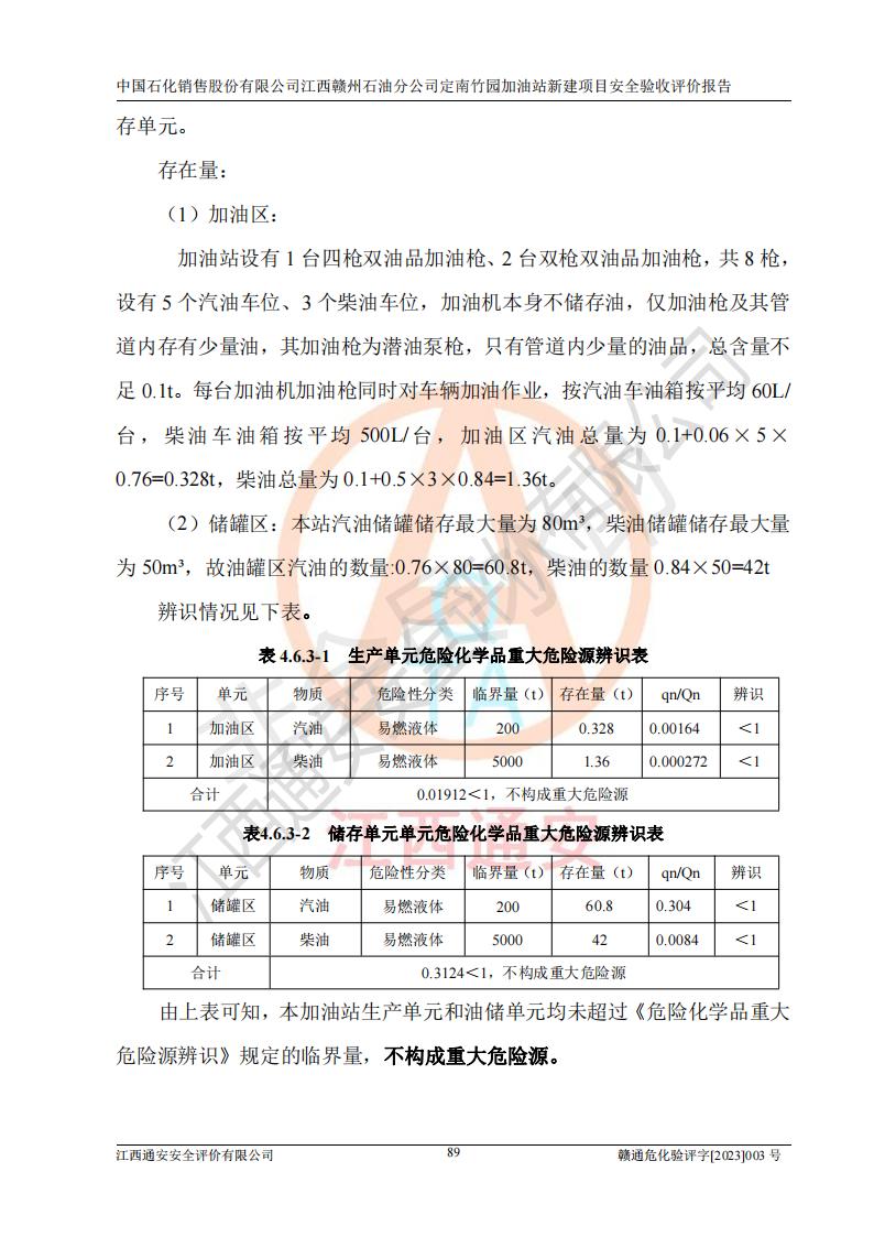 項目簡介 | 本報告為中國石化銷售股份有限公司江西贛州石油分公司定南竹園加油站(以下簡稱竹園加油站)新建項目的安全驗收評價報告。竹園加油站位于江西省贛州市定南縣竹園村S266省道東側(歷市鎮(zhèn)竹園村路段)。中國石化銷售股份有限公司江西贛州石油分公司法定**人為聶志群,成立日期為2000年6月15日,統(tǒng)一社會信用代碼91360700705714329Q。經營范圍包括成品油(汽油、柴油)零售。該站于2021年8月26日取得定南縣發(fā)展和改革委員會出具的《江西省企業(yè)投資項目備案通知書》(項目統(tǒng)一代碼為:2019-360728-45-03-015645),由河北海川能源科技股份有限公司設計。2020年7月18日已取得定南縣應急管理局出具的安全條件審查批復,2020年8月26日已取得定南縣應急管理局出具的安全設施設計審查批復。2021年8月20日由哈爾濱天源石化工程設計有限責任公司重新出具了施工圖,由江西海潤建設工程有限公司進行施工。 本站設置50m3的柴油臥式SF雙層油罐、92#汽油臥式SF雙層油罐各一具,30m3的95#汽油臥式SF雙層油罐1具,總罐容積為130m3,油儲容積為105m3(柴油折半),屬于二級加油站。 汽油和柴油均是化學品液體。汽油、柴油均為危險化學品,其中汽油火險分級為甲B類,其蒸汽與空氣形成爆炸性氣體,遇明火、高熱易燃燒爆炸;柴油火險分級為丙A類,遇明火、高熱或與氧化劑接觸,有引起燃燒爆炸的危險。 | ||||