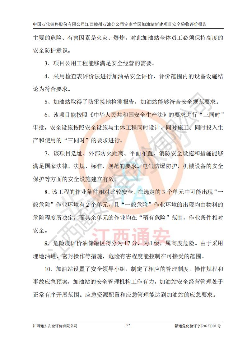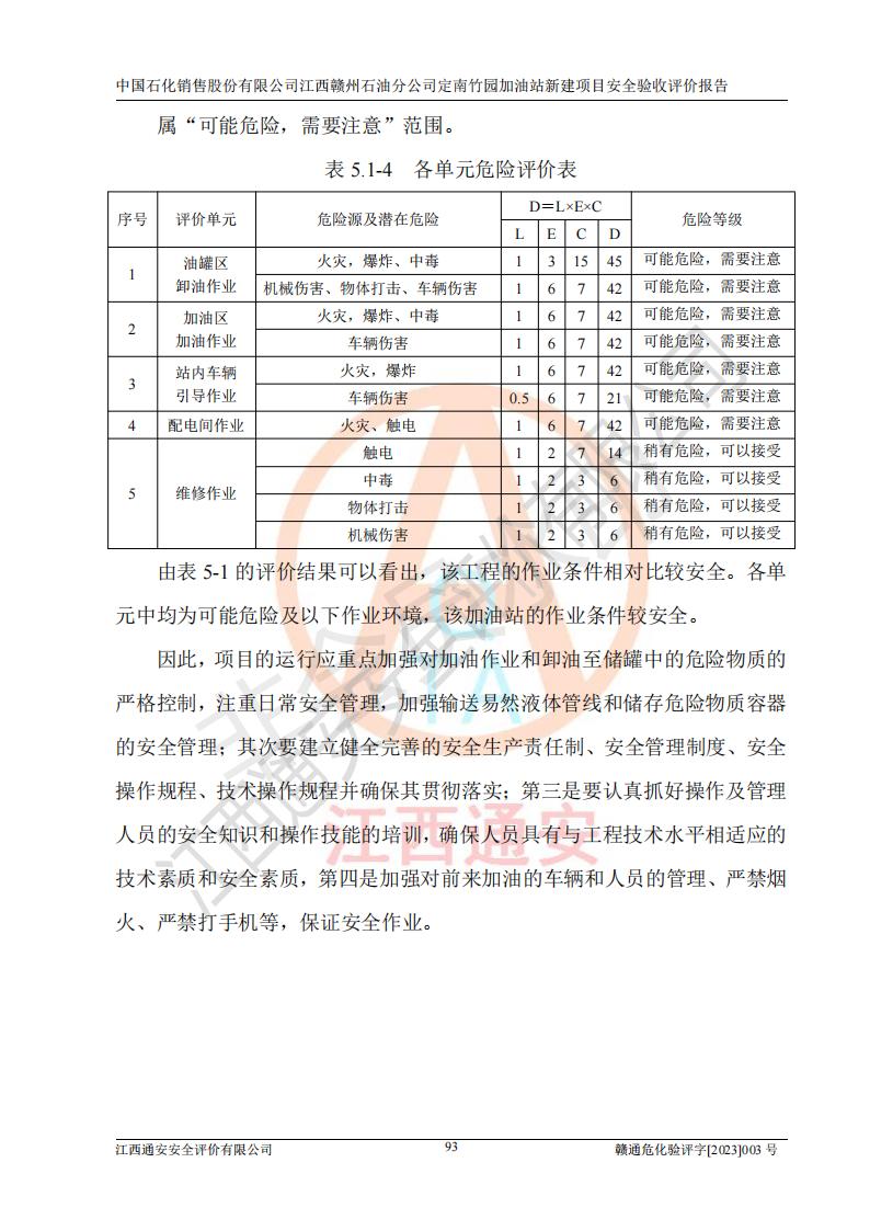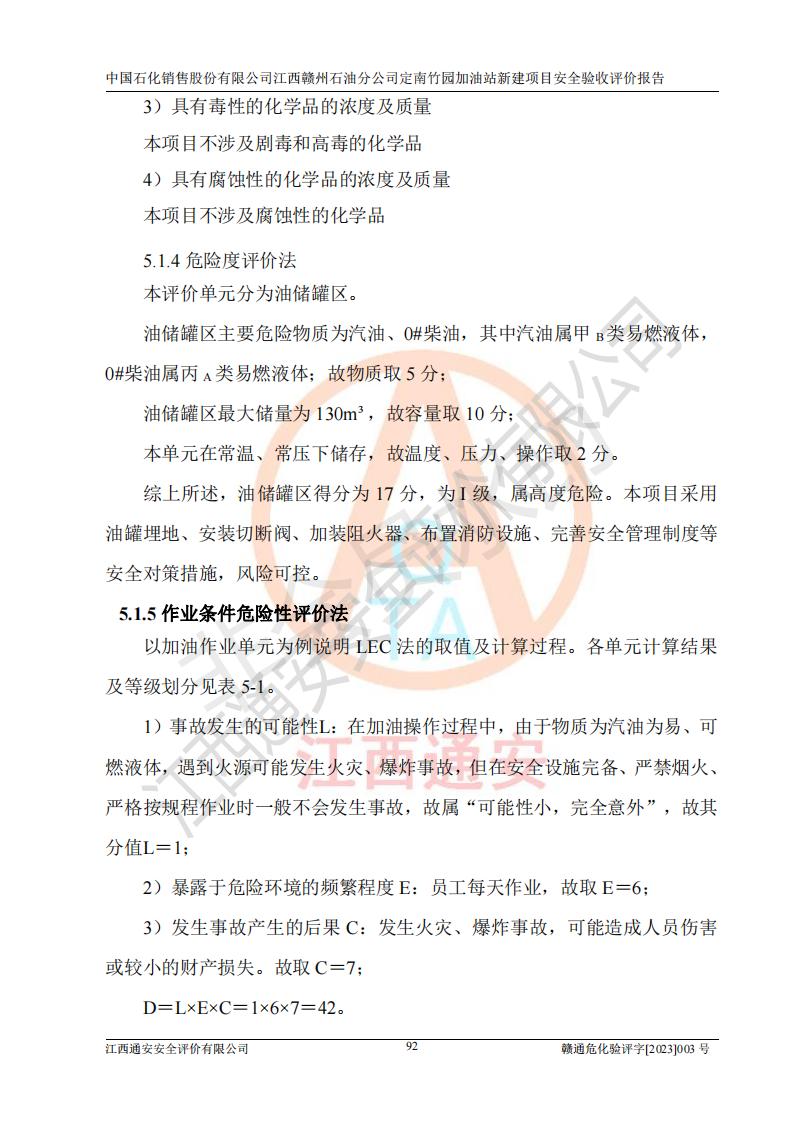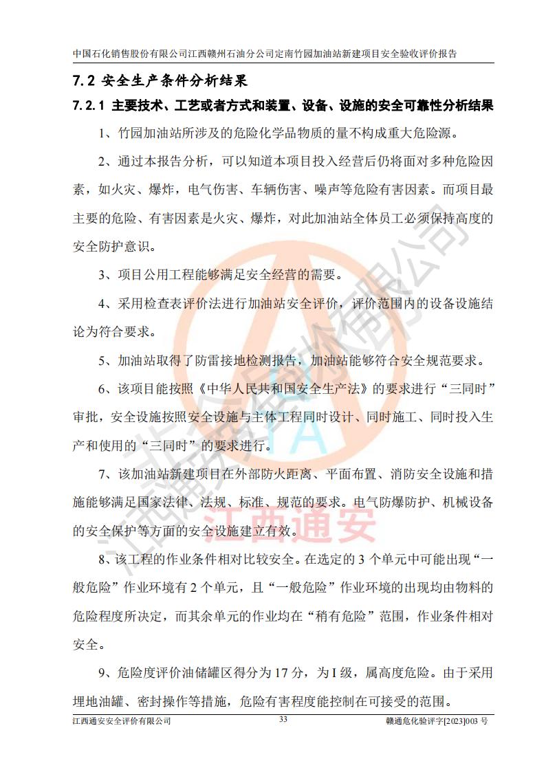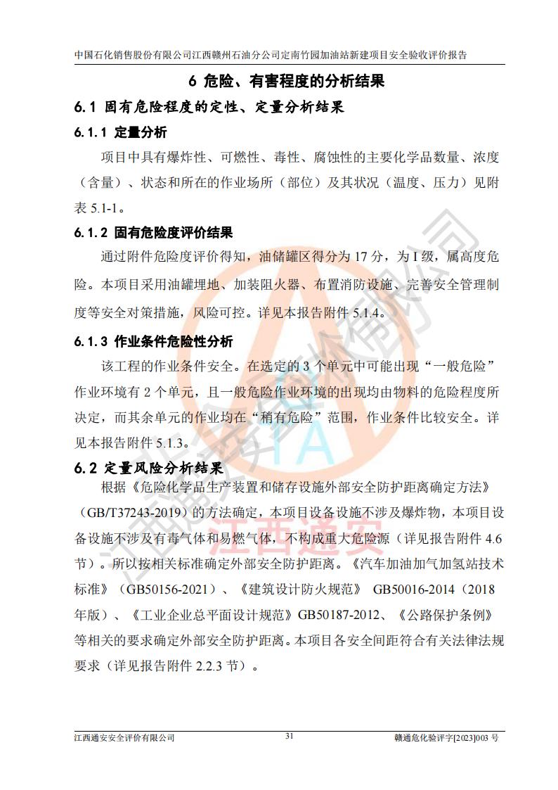 其它 | 在對該項目危險、有害因素辨識分析的基礎上,運用安全檢查表、預作業(yè)條件危險性分析法、危險度評價、重大事故后果分析結果等評價方法對該項目進行了分析評價,評價結果如下: 1、竹園加油站所涉及的危險化學品物質的量不構成重大危險源。經辨識本項目不涉及監(jiān)控、易制毒、易制爆、劇毒和**危險化學品;項目涉及的汽油屬于重點監(jiān)管和特別管控危險化學品,儲存經營單位應根據“汽油安全措施和應急處理原則”要求的措施完善安全、應急設施和資源;依據《特別管控危險化學品目錄(**版)》管控措施進行檢查,加油站對汽油進行儲存定置化管理,設置油罐區(qū)**儲存汽油,并制定各種管理制度,依法依規(guī)嚴格管理。項目不涉及重點監(jiān)管危險化工工藝。 2、通過本報告分析,可以知道本項目投入經營后仍將面對多種危險因素,如火災、爆炸,電氣傷害、**傷害、噪聲等危險有害因素。而項目主要的危險、有害因素是火災、爆炸,對此加油站全體員工**保持**的安全防護意識。 3、項目公用工程能夠滿足安全經營的需要。 4、采用檢查表評價法進行加油站安全評價,評價范圍內的設備設施結論為符合要求。 5、加油站取得了防雷接地檢測報告,加油站能夠符合安全規(guī)范要求。 6、該項目能按照《中華人民共和國安全生產法》的要求進行“三同時”審批,安全設施按照安全設施與主體工程同時設計、同時施工、同時投入生產和使用的“三同時”的要求進行。 7、該項目選址、外部防火距離、平面布置、消防安全設施和措施能夠滿足**法律、法規(guī)、標準、規(guī)范的要求。電氣防爆防護、機械設備的安全保護等方面的安全設施建立**。 8、該工程的作業(yè)條件相對比較安全。在選定的3個單元中可能出現(xiàn)“一般危險”作業(yè)環(huán)境有2個單元,且“一般危險”作業(yè)環(huán)境的出現(xiàn)均由物料的危險程度所決定,而其余單元的作業(yè)均在“稍有危險”范圍,作業(yè)條件相對安全。 9、危險度評價油儲罐區(qū)得分為17分,為I級,屬**危險。由于采用埋地油罐、密封操作等措施,危險有害程度能控制在可接受的范圍。 10、加油站設置了安全**小組,制定了相應的管理制度,操作規(guī)程和事故應急預案,加油站的安全管理機構工作有力,加油站安全經營管理處于正常有序開展范圍。應急資源配置和應急管理能達到加油站的應急要求。 評價結論: 綜上所述,中國石化銷售股份有限公司江西贛州石油分公司定南竹園加油站新建項目嚴格執(zhí)行**有關安全生產法律、法規(guī)和有關標準、規(guī)范,認真落實并合理采納安全條件評價報告及安全設施設計專篇設計中的安全對策、措施及建議,做到安全設施與主體工程同時設計、同時施工、同時投入生產和使用的“三同時”,對潛在的危險、有害因素采取了安全對策措施,工程潛在的危險、有害因素可得到**控制,風險在**控制和可接受范圍內。現(xiàn)場與設計一致。 該項目安全設施設計專篇設計的安全設施得到落實符合**安全生產方面的法律、法規(guī)、標準、規(guī)范的要求,具備安全驗收條件,符合安全生產條件。 | ||||