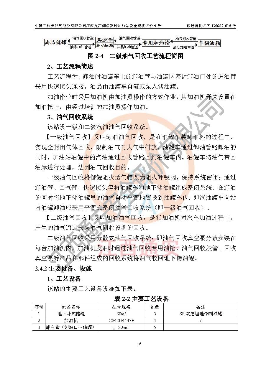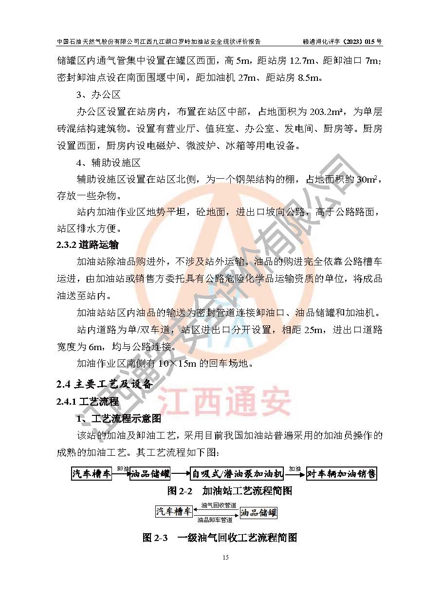 項(xiàng)目簡(jiǎn)介 | 中國(guó)石油天然氣股份有限公司江西九江湖口羅嶺加油站是一家專門從事成品油零售經(jīng)營(yíng)的股份有限公司分公司(國(guó)有控股),經(jīng)營(yíng)場(chǎng)所位于九江市湖口縣馬影鎮(zhèn)羅嶺牛湖路北邊?,F(xiàn)有從業(yè)人員7名,其中安全管理人員1人,加油站負(fù)責(zé)人楊全榮。 該加油站占地面積2361.74m2,站區(qū)內(nèi)設(shè)置有4臺(tái)四槍稅控燃油加油機(jī)及配套的工藝管線,設(shè)有SF雙層儲(chǔ)罐5臺(tái),其中30m3的92#汽油儲(chǔ)罐2臺(tái)、30m3的95#汽油儲(chǔ)罐1臺(tái)、30m3的0#柴油儲(chǔ)罐2臺(tái),油品儲(chǔ)罐總?cè)莘e為150m3(折算成汽油為120 m3),按現(xiàn)行《汽車加油加氣加氫站技術(shù)標(biāo)準(zhǔn)》對(duì)加油站的等級(jí)劃分原則,屬二級(jí)加油站。 該站由九江市行政審批局換發(fā)《危險(xiǎn)化學(xué)品經(jīng)營(yíng)許可證》(證號(hào):贛九行審經(jīng)(甲)字[2022]000041號(hào)),**期限2020年03月31日至2023年03月30日。 | |||