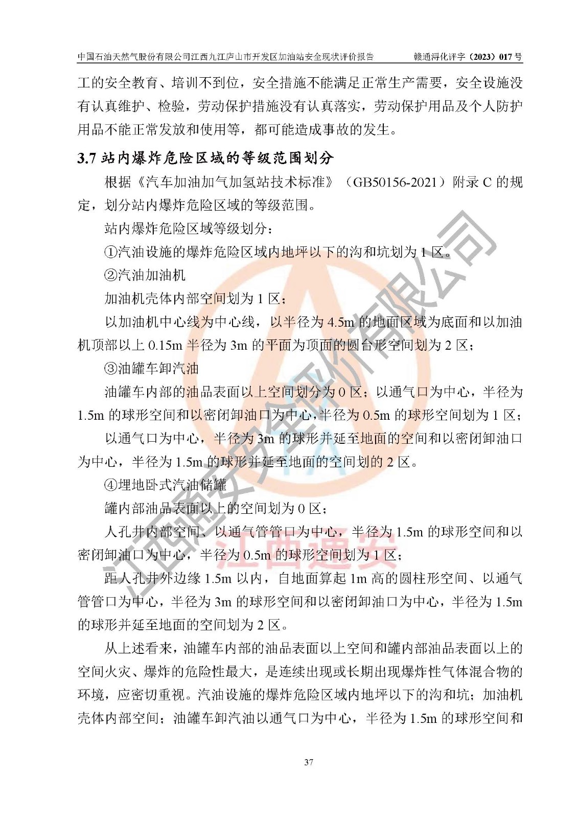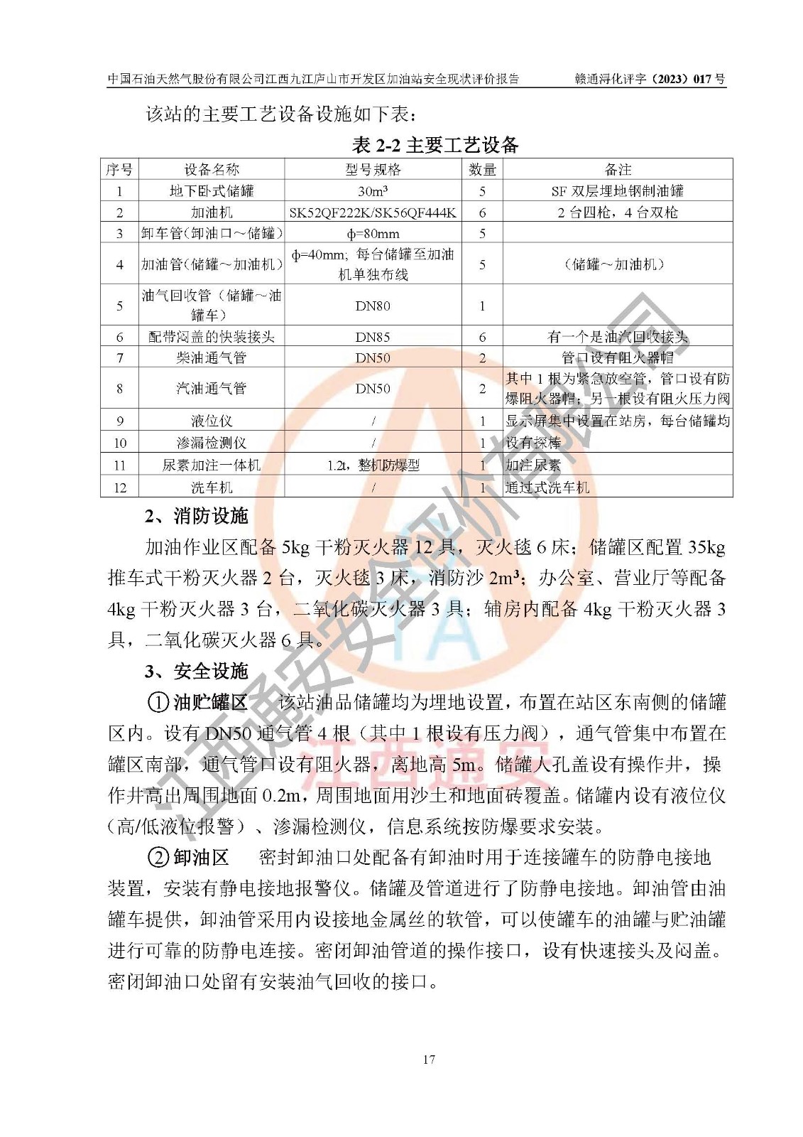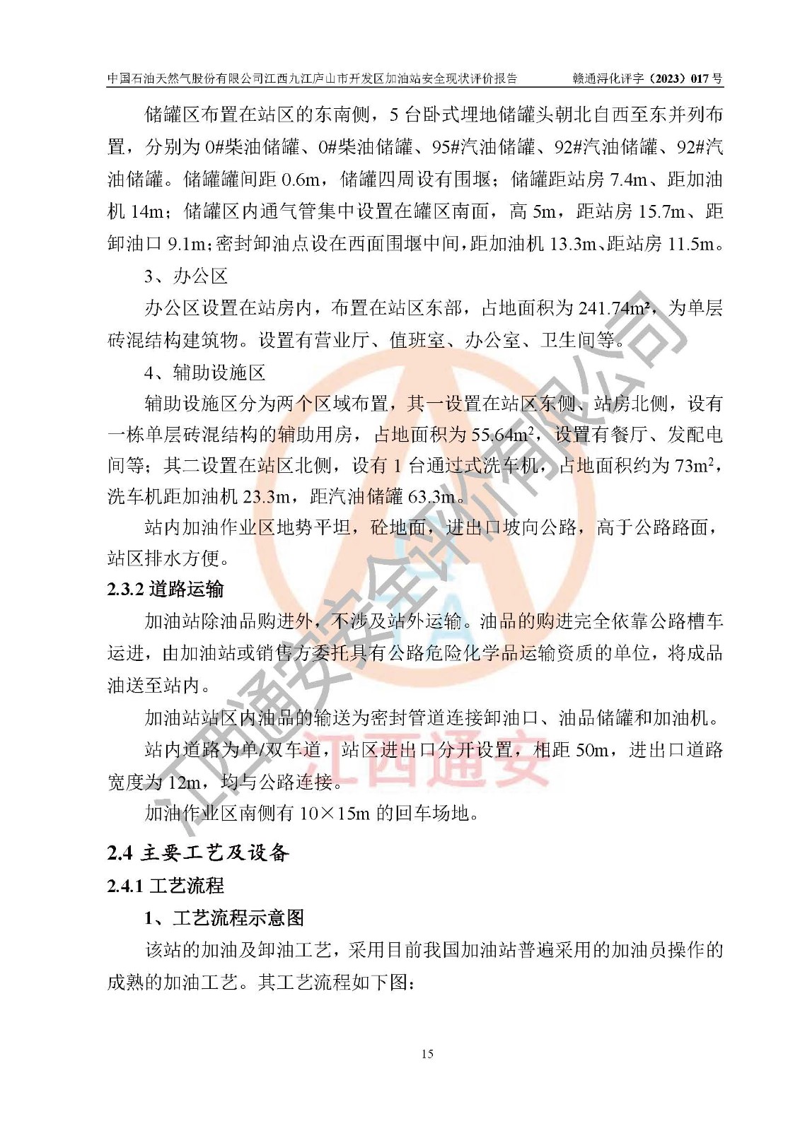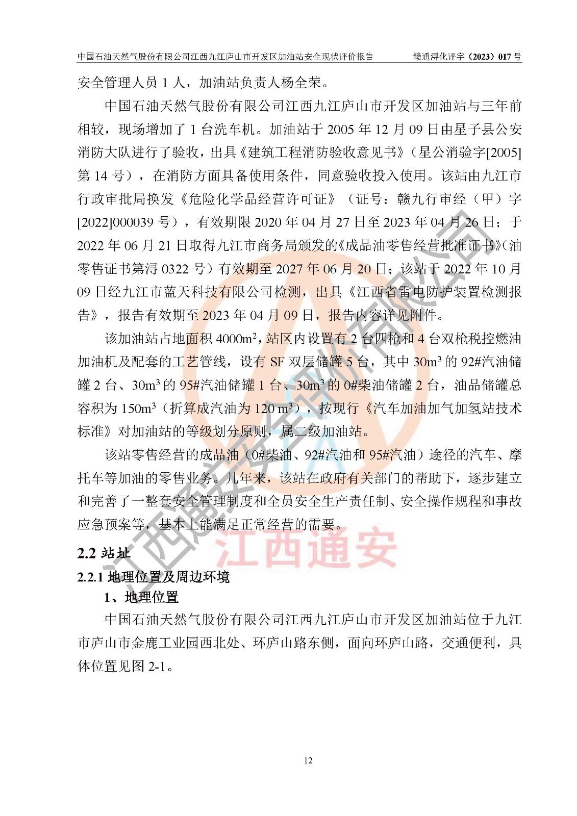 項(xiàng)目簡介 | 中國石油天然氣股份有限公司江西九江廬山市開發(fā)區(qū)加油站是一家專門從事成品油零售經(jīng)營的股份有限公司分公司(國有控股),經(jīng)營場所位于九江市廬山市金鹿工業(yè)園西北處、環(huán)廬山路東側(cè)。現(xiàn)有從業(yè)人員7名,其中安全管理人員1人,加油站負(fù)責(zé)人楊全榮。 該加油站占地面積4000m2,站區(qū)內(nèi)設(shè)置有2臺(tái)四槍和4臺(tái)雙槍稅控燃油加油機(jī)及配套的工藝管線,設(shè)有SF雙層儲(chǔ)罐5臺(tái),其中30m3的92#汽油儲(chǔ)罐2臺(tái)、30m3的95#汽油儲(chǔ)罐1臺(tái)、30m3的0#柴油儲(chǔ)罐2臺(tái),油品儲(chǔ)罐總?cè)莘e為150m3(折算成汽油為120 m3),按現(xiàn)行《汽車加油加氣加氫站技術(shù)標(biāo)準(zhǔn)》對(duì)加油站的等級(jí)劃分原則,屬二級(jí)加油站。 該站由九江市行政審批局換發(fā)《危險(xiǎn)化學(xué)品經(jīng)營許可證》(證號(hào):贛九行審經(jīng)(甲)字[2022]000039號(hào)),**期限2020年04月27日至2023年04月26日。 | |||