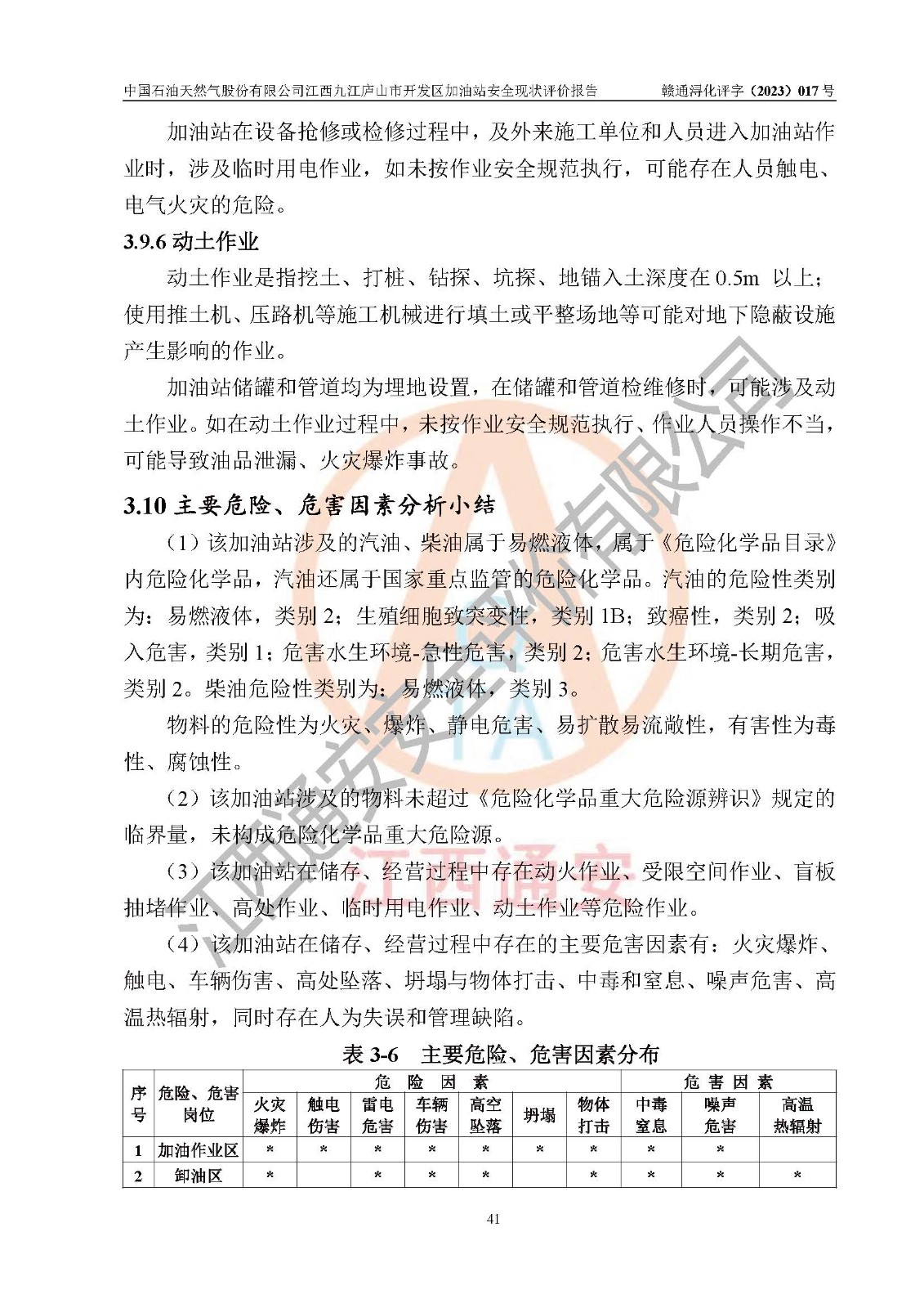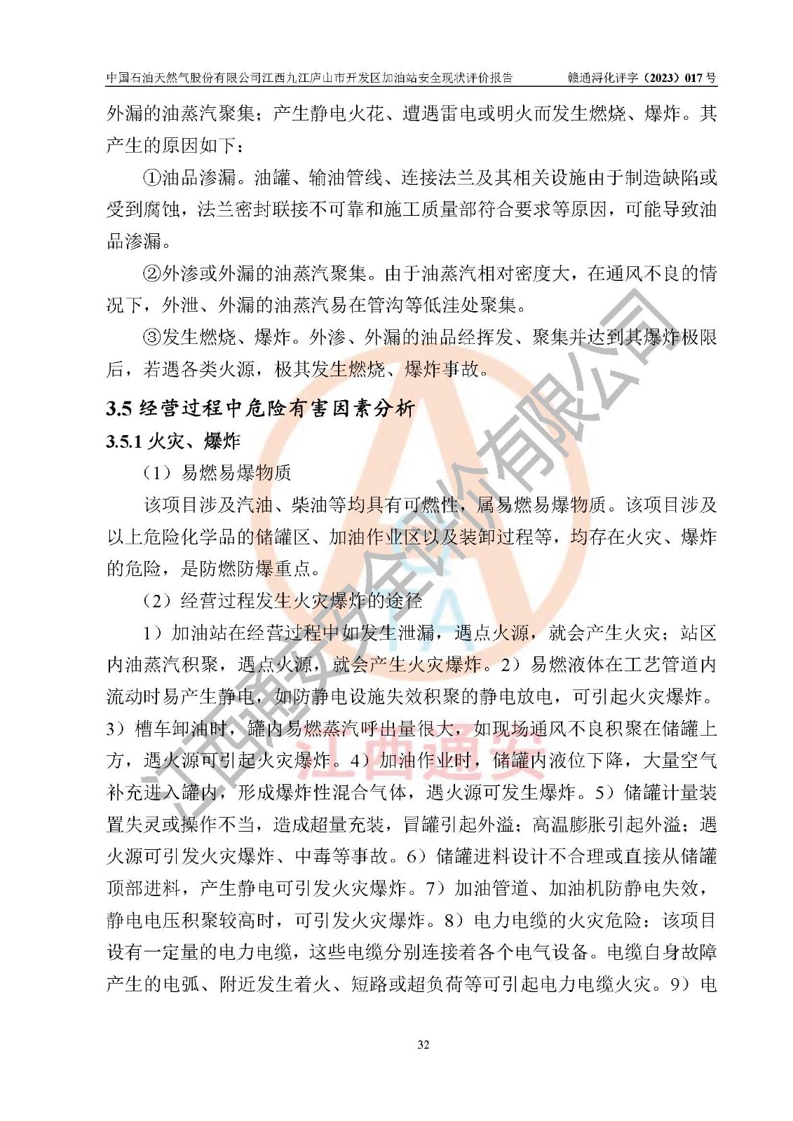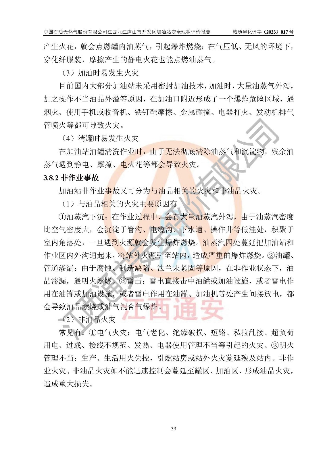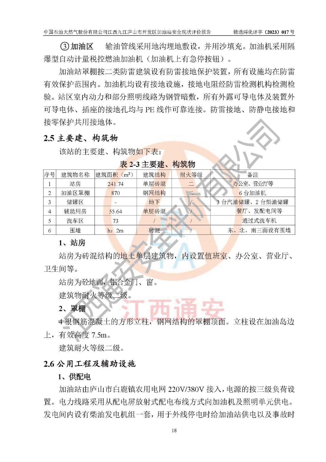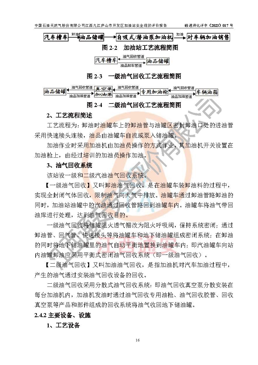 項(xiàng)目簡介 | 中國石油天然氣股份有限公司江西九江廬山市開發(fā)區(qū)加油站是一家專門從事成品油零售經(jīng)營的股份有限公司分公司(國有控股),經(jīng)營場所位于九江市廬山市金鹿工業(yè)園西北處、環(huán)廬山路東側(cè)。現(xiàn)有從業(yè)人員7名,其中安全管理人員1人,加油站負(fù)責(zé)人楊全榮。 該加油站占地面積4000m2,站區(qū)內(nèi)設(shè)置有2臺(tái)四槍和4臺(tái)雙槍稅控燃油加油機(jī)及配套的工藝管線,設(shè)有SF雙層儲(chǔ)罐5臺(tái),其中30m3的92#汽油儲(chǔ)罐2臺(tái)、30m3的95#汽油儲(chǔ)罐1臺(tái)、30m3的0#柴油儲(chǔ)罐2臺(tái),油品儲(chǔ)罐總?cè)莘e為150m3(折算成汽油為120 m3),按現(xiàn)行《汽車加油加氣加氫站技術(shù)標(biāo)準(zhǔn)》對(duì)加油站的等級(jí)劃分原則,屬二級(jí)加油站。 該站由九江市行政審批局換發(fā)《危險(xiǎn)化學(xué)品經(jīng)營許可證》(證號(hào):贛九行審經(jīng)(甲)字[2022]000039號(hào)),**期限2020年04月27日至2023年04月26日。 | |||