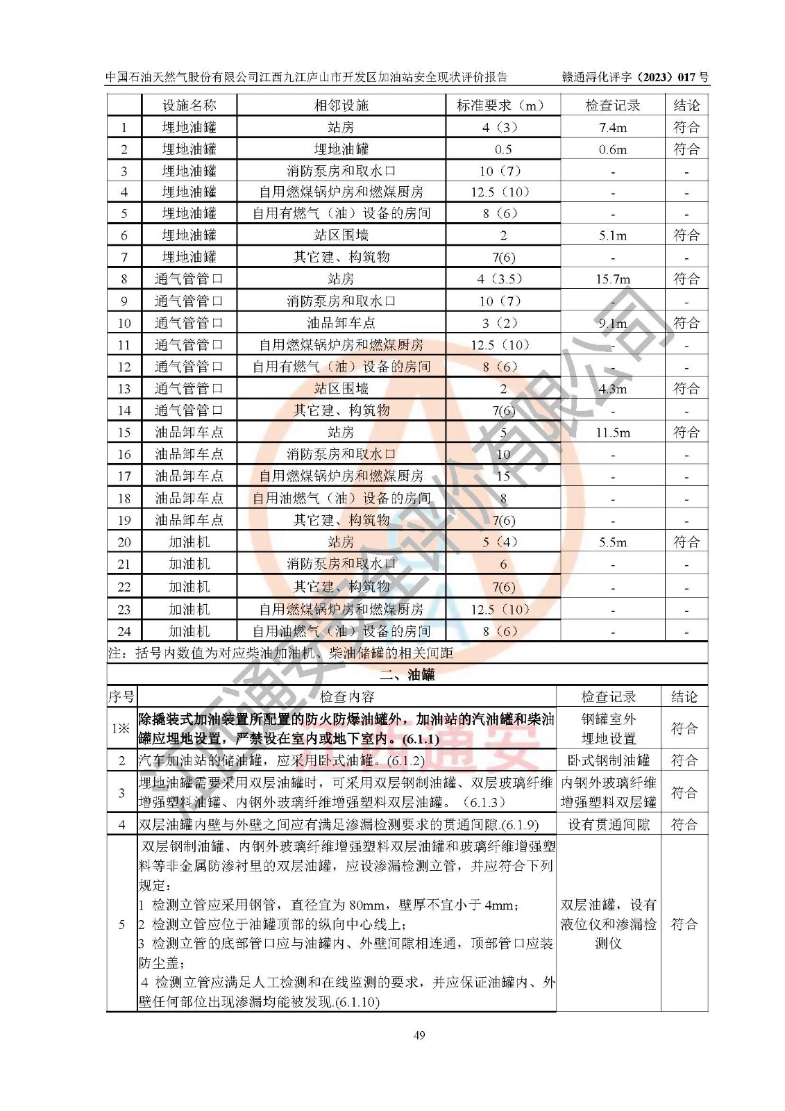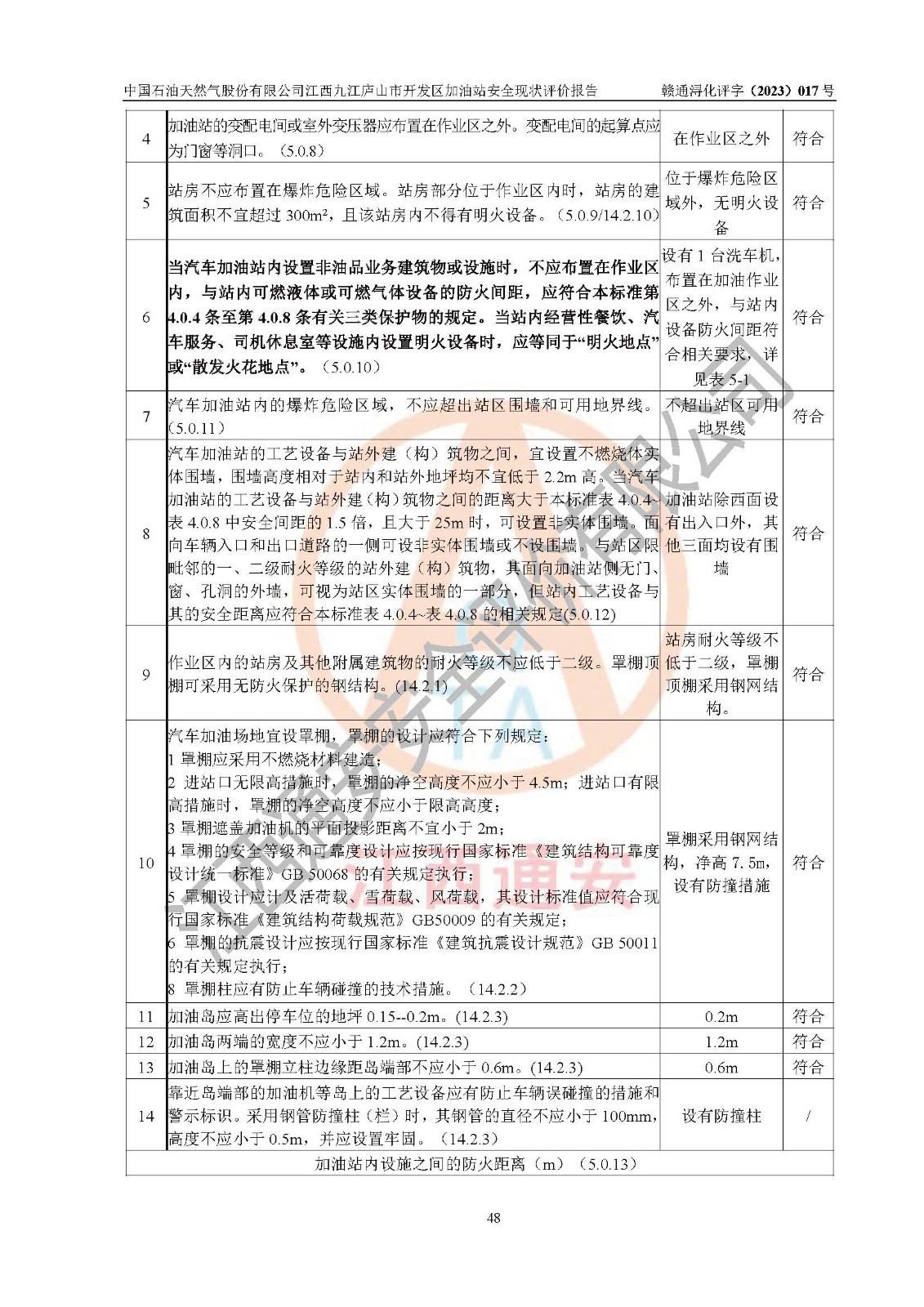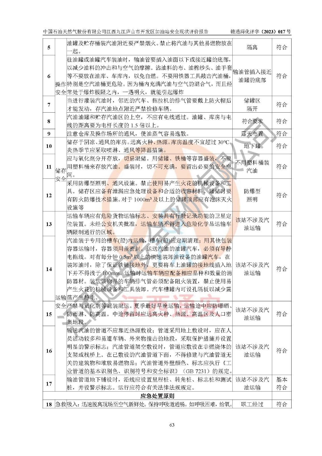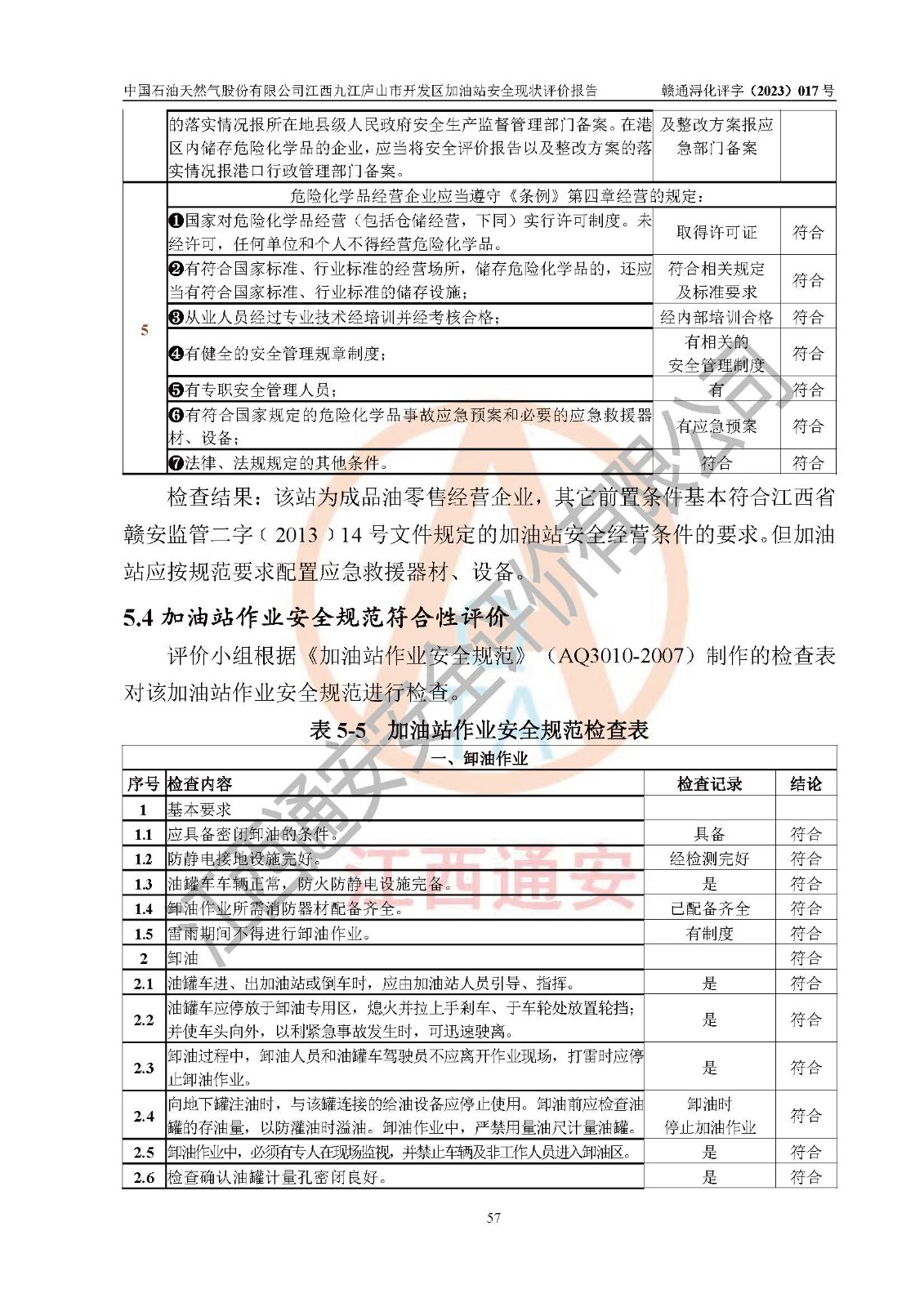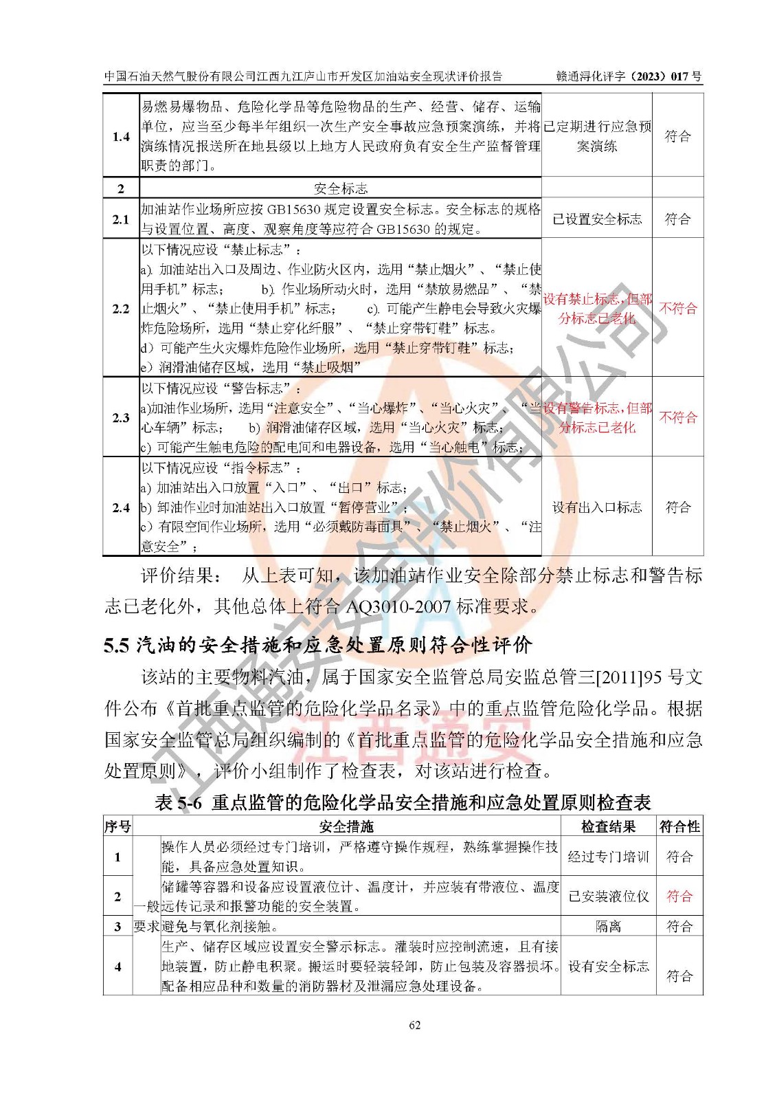 評(píng)價(jià)結(jié)論 | 中國石油天然氣股份有限公司江西九江廬山市開發(fā)區(qū)加油站涉及的安全條件、安全經(jīng)營條件、安全生產(chǎn)管理符合《危險(xiǎn)化學(xué)品經(jīng)營許可證管理辦法》、《汽車加油加氣加氫站技術(shù)標(biāo)準(zhǔn)》等**有關(guān)法規(guī)、標(biāo)準(zhǔn)、規(guī)范要求,能滿足危險(xiǎn)化學(xué)品經(jīng)營安全條件。 | |||