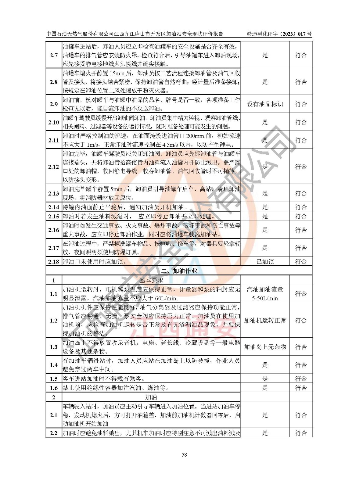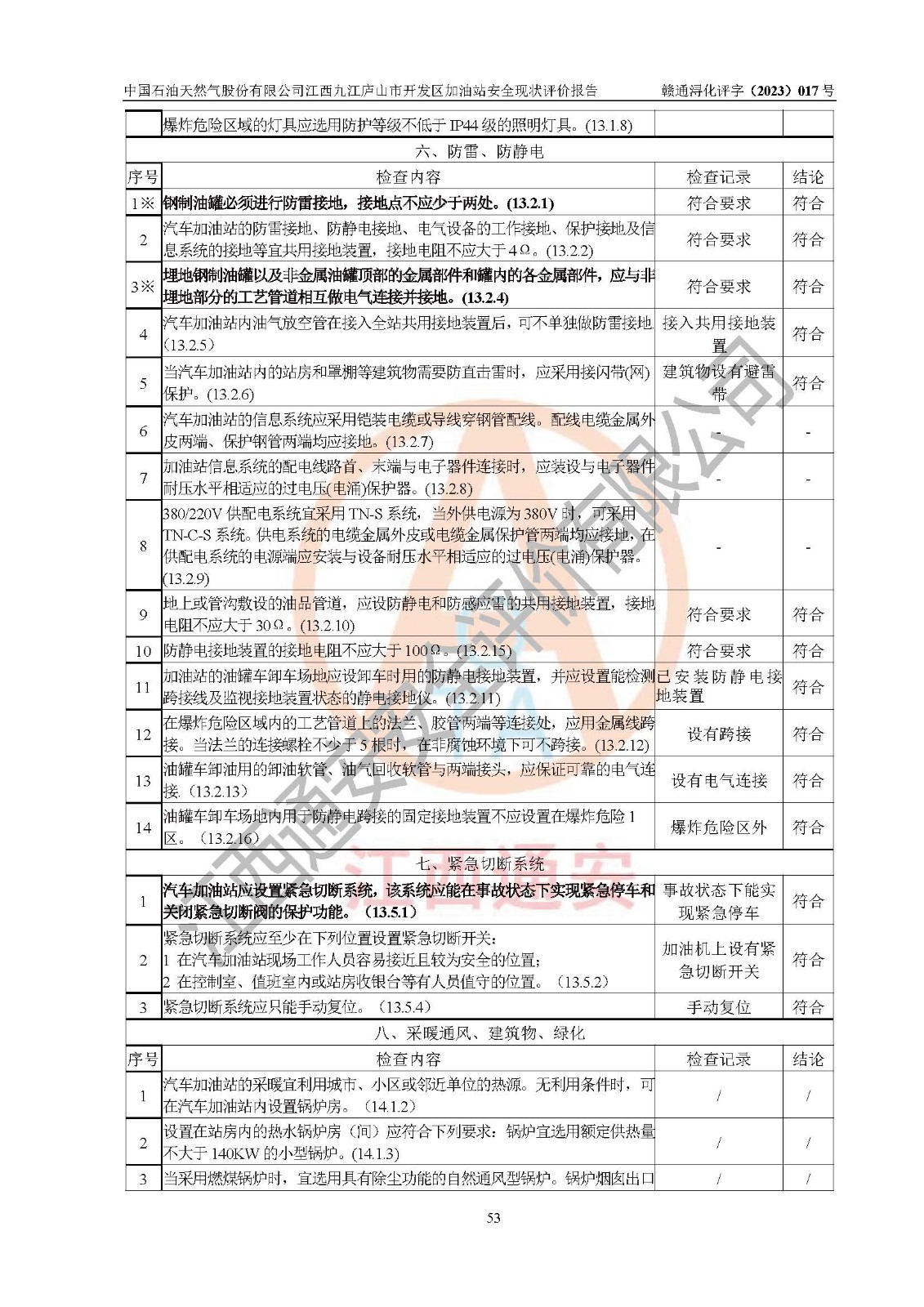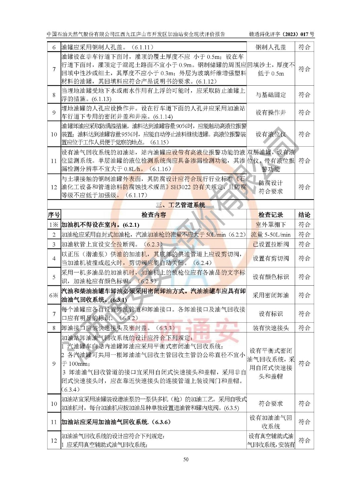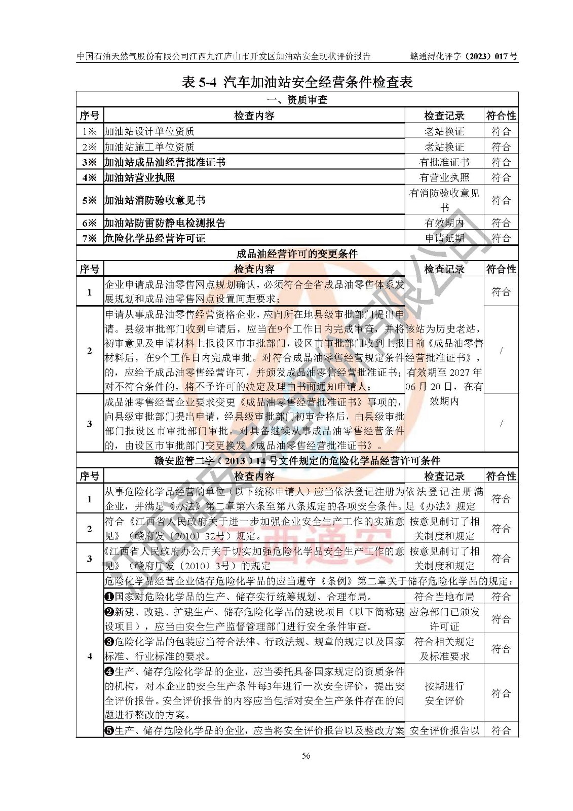 評(píng)價(jià)結(jié)論 | 中國石油天然氣股份有限公司江西九江廬山市開發(fā)區(qū)加油站涉及的安全條件、安全經(jīng)營條件、安全生產(chǎn)管理符合《危險(xiǎn)化學(xué)品經(jīng)營許可證管理辦法》、《汽車加油加氣加氫站技術(shù)標(biāo)準(zhǔn)》等**有關(guān)法規(guī)、標(biāo)準(zhǔn)、規(guī)范要求,能滿足危險(xiǎn)化學(xué)品經(jīng)營安全條件。 | |||