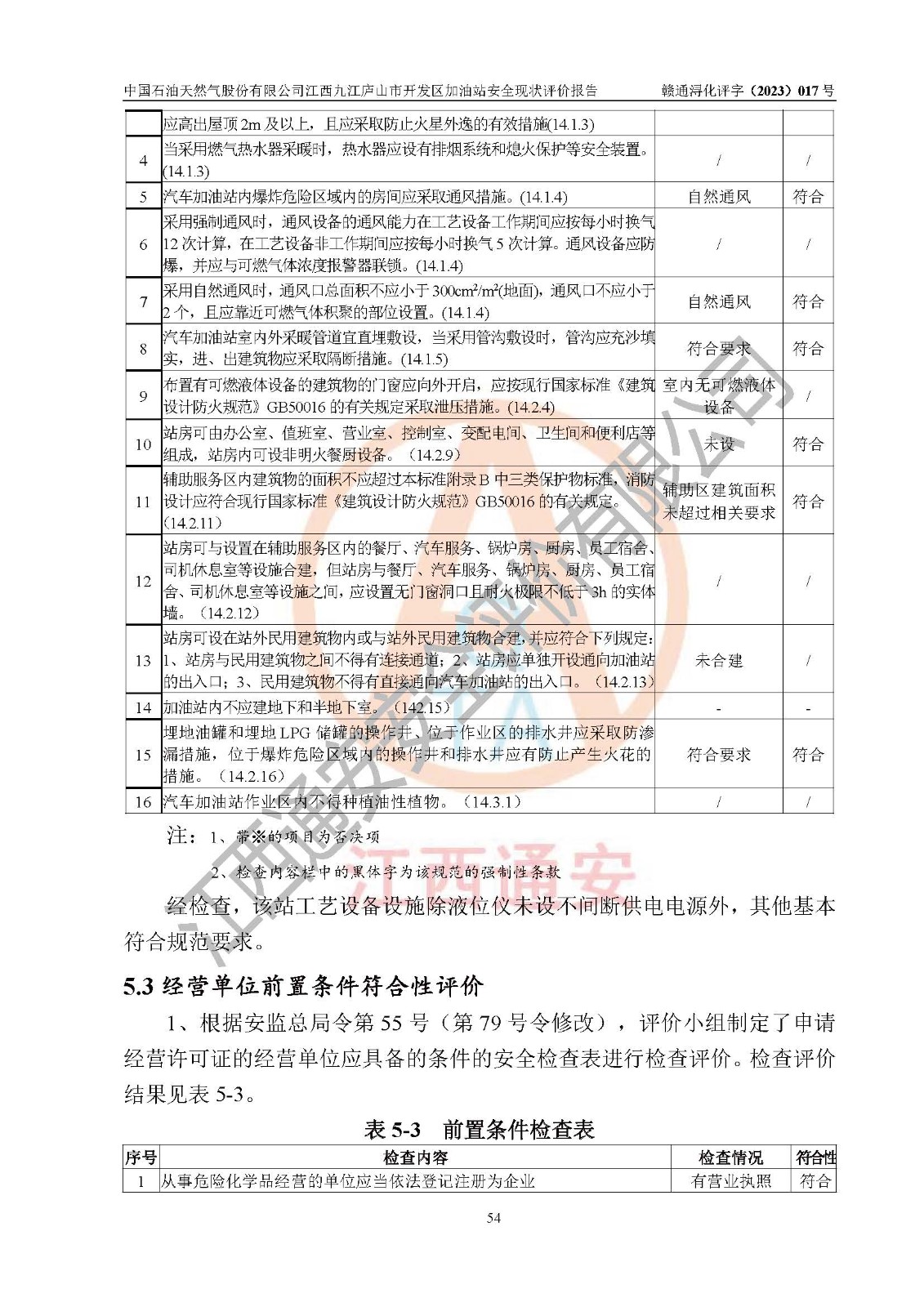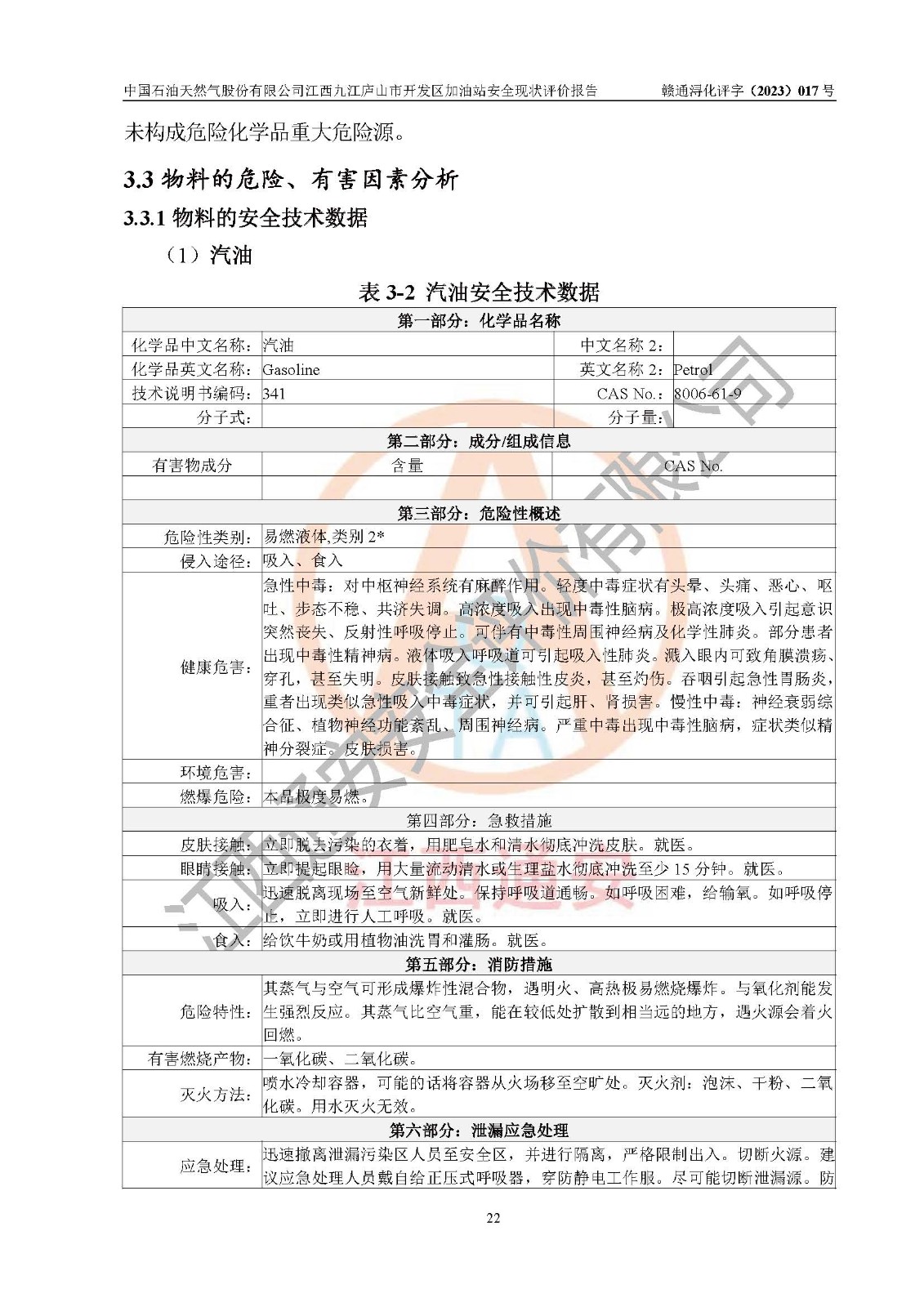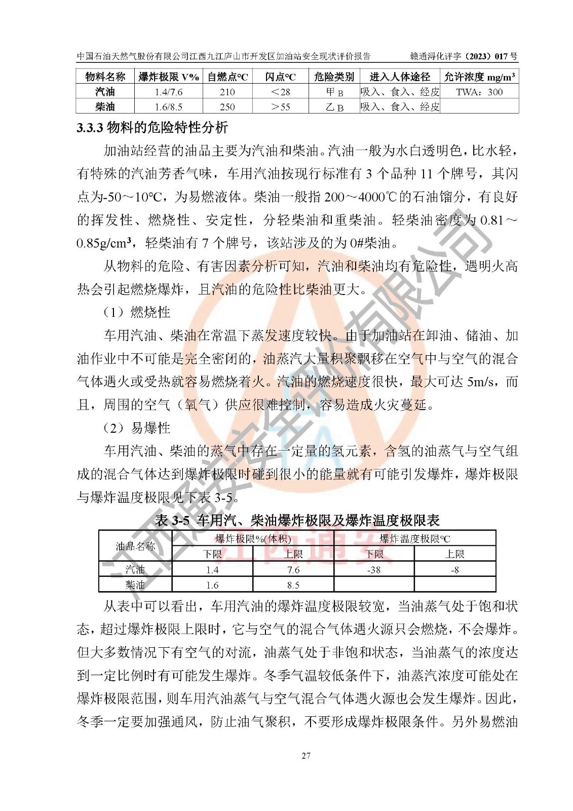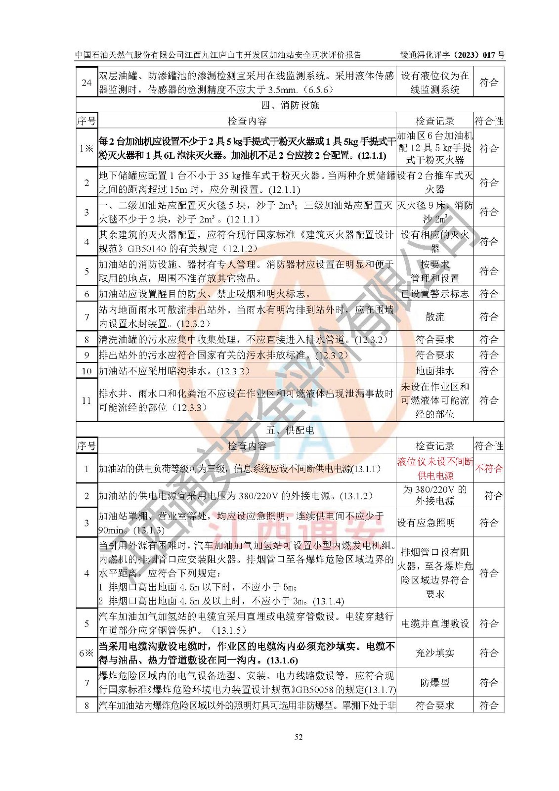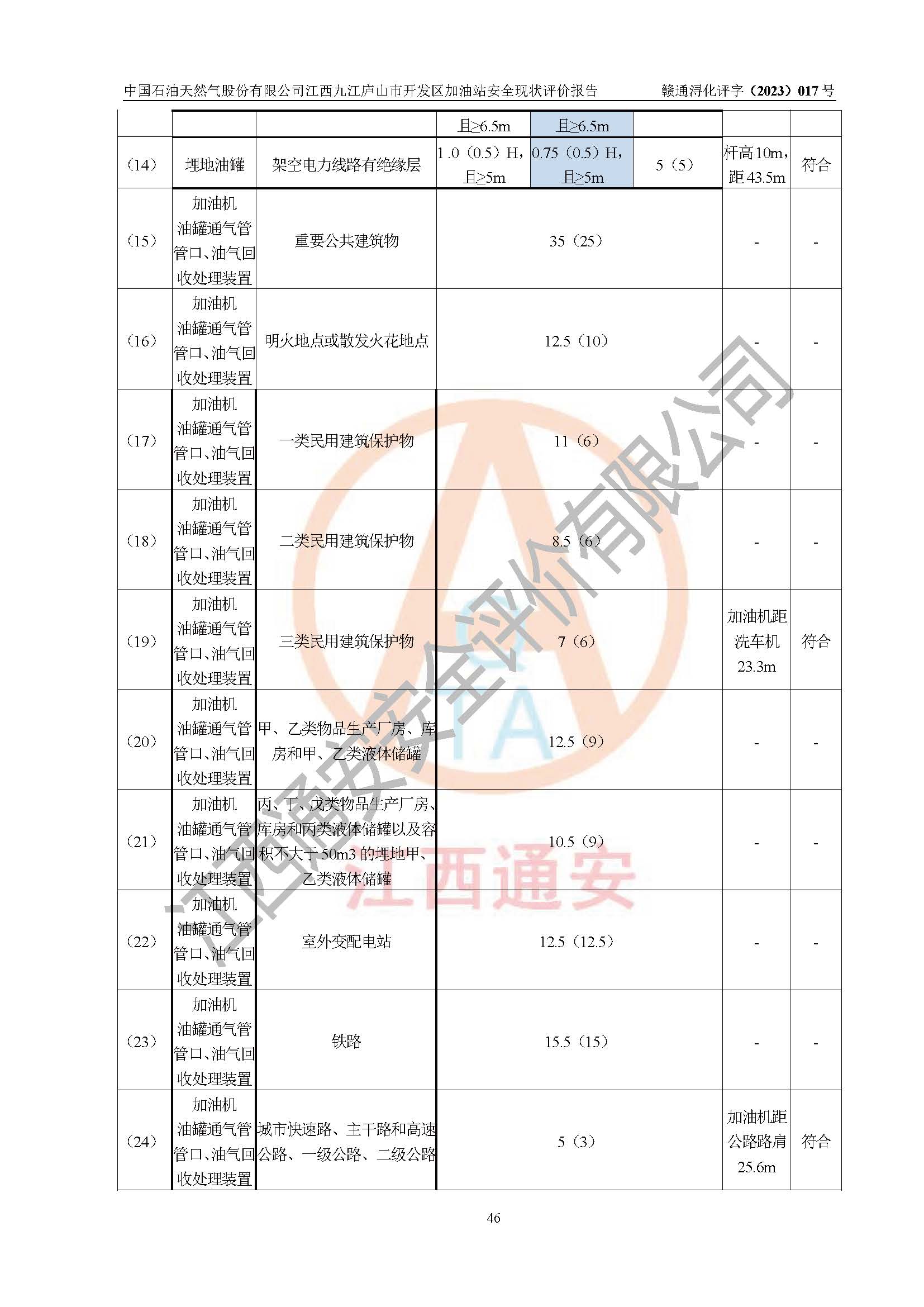 評(píng)價(jià)結(jié)論 | 中國石油天然氣股份有限公司江西九江廬山市開發(fā)區(qū)加油站涉及的安全條件、安全經(jīng)營條件、安全生產(chǎn)管理符合《危險(xiǎn)化學(xué)品經(jīng)營許可證管理辦法》、《汽車加油加氣加氫站技術(shù)標(biāo)準(zhǔn)》等**有關(guān)法規(guī)、標(biāo)準(zhǔn)、規(guī)范要求,能滿足危險(xiǎn)化學(xué)品經(jīng)營安全條件。 | |||
