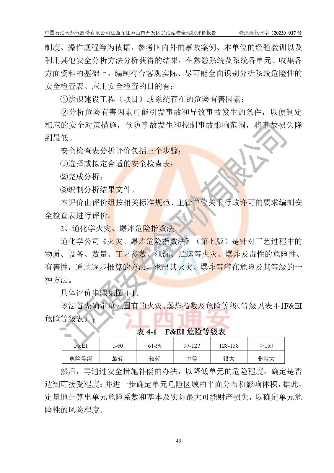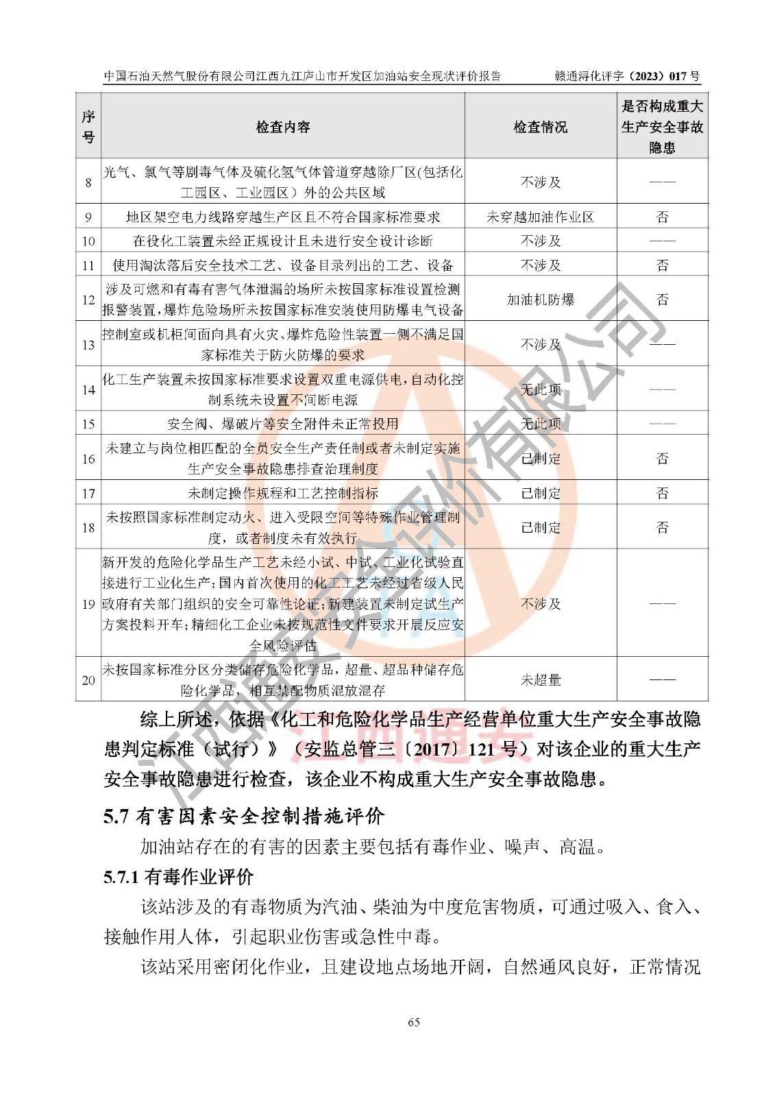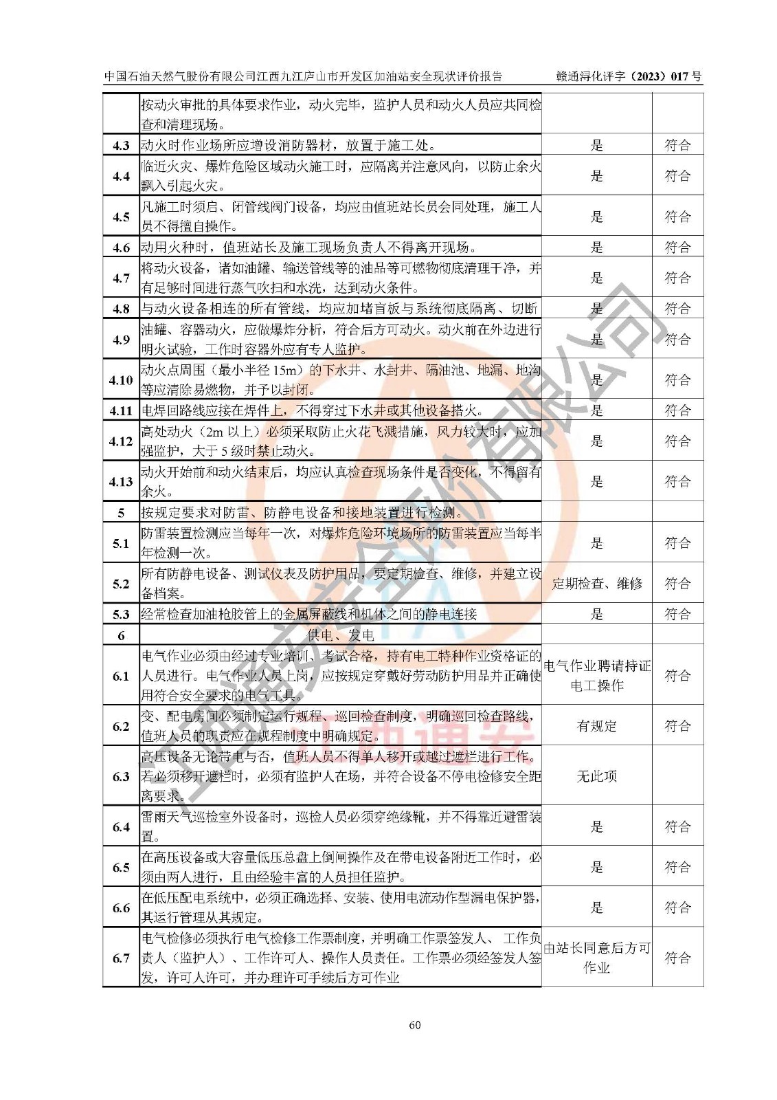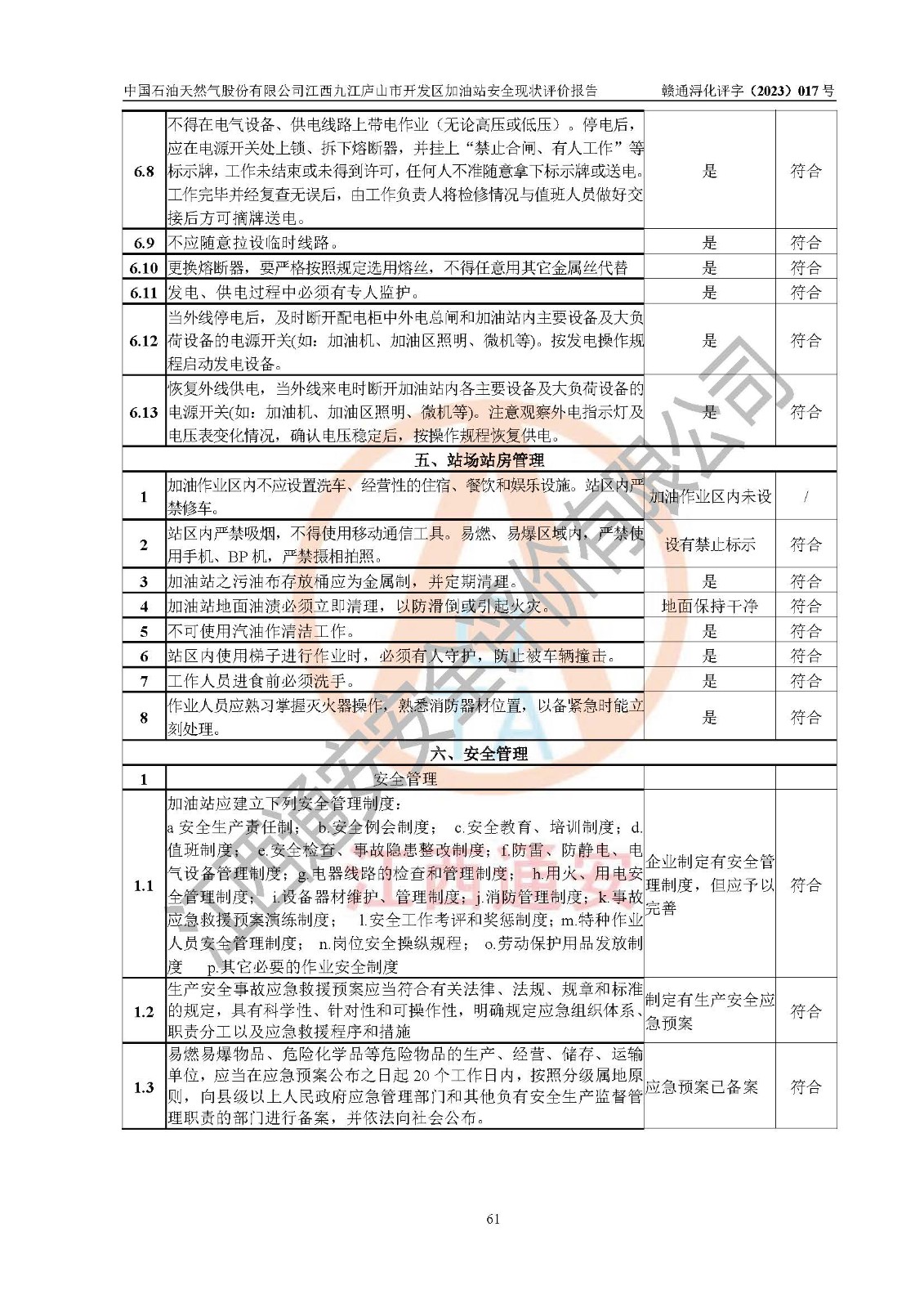 評(píng)價(jià)結(jié)論 | 中國石油天然氣股份有限公司江西九江廬山市開發(fā)區(qū)加油站涉及的安全條件、安全經(jīng)營條件、安全生產(chǎn)管理符合《危險(xiǎn)化學(xué)品經(jīng)營許可證管理辦法》、《汽車加油加氣加氫站技術(shù)標(biāo)準(zhǔn)》等**有關(guān)法規(guī)、標(biāo)準(zhǔn)、規(guī)范要求,能滿足危險(xiǎn)化學(xué)品經(jīng)營安全條件。 | |||