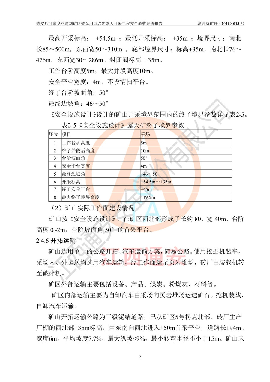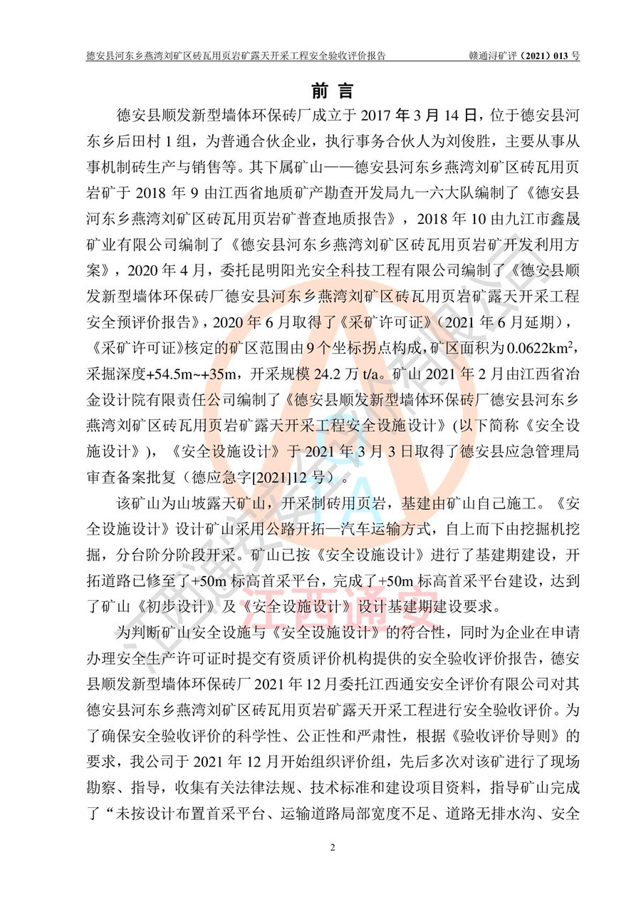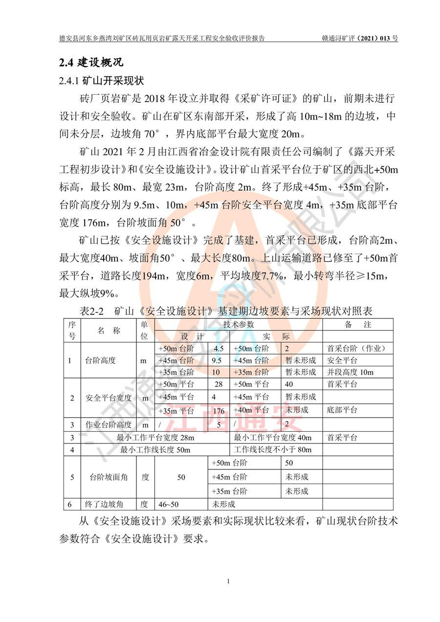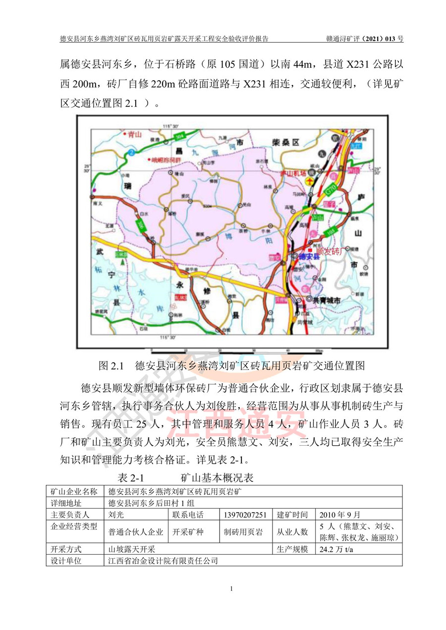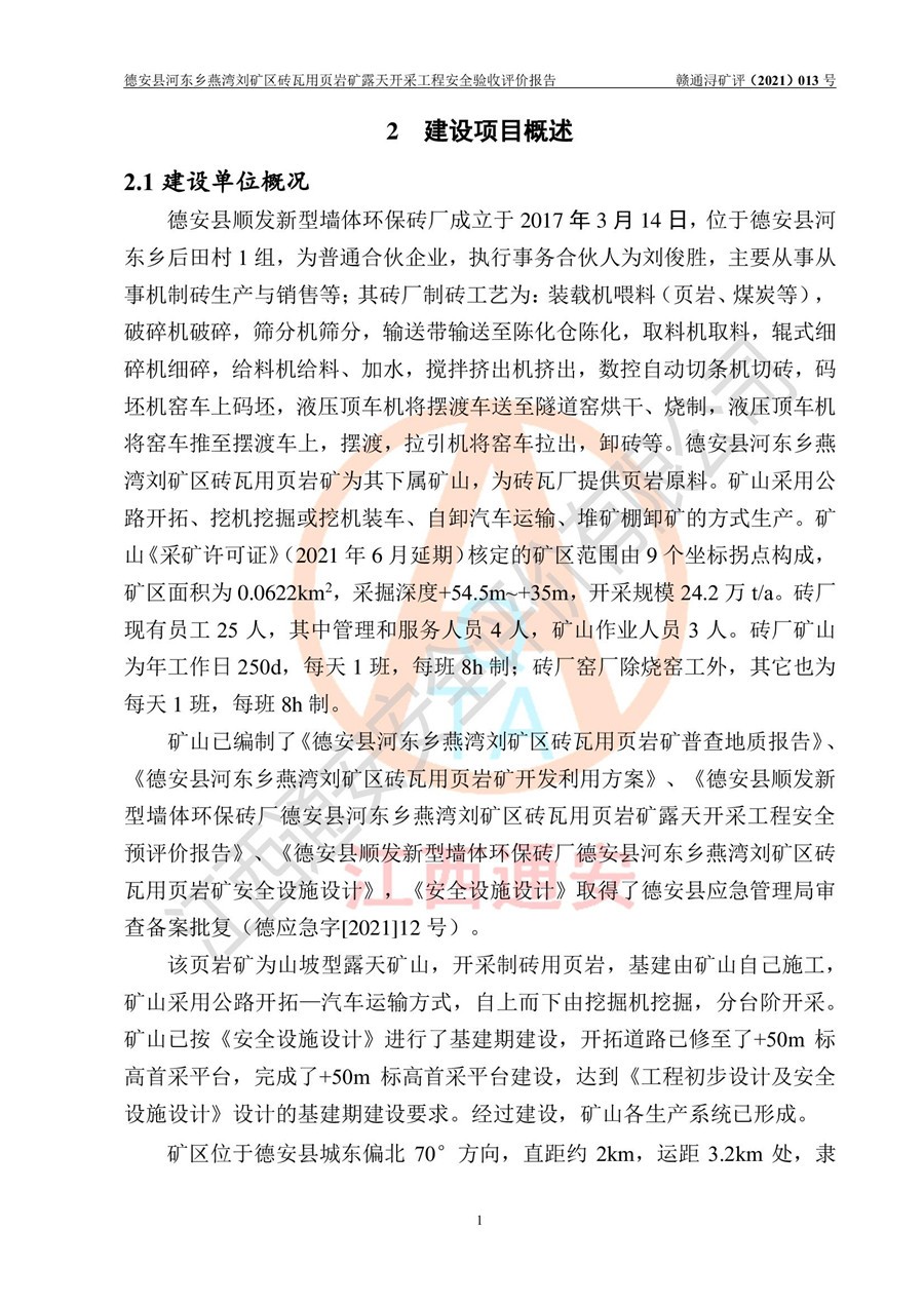 德安縣順發(fā)新型墻體**磚廠成立于2017年3月14日,位于德安縣河?xùn)|鄉(xiāng)后田村1組,為普通合伙企業(yè),執(zhí)行事務(wù)合伙人為劉俊勝,主要從事從事機(jī)制磚生產(chǎn)與銷售等。其下屬礦山——德安縣河?xùn)|鄉(xiāng)燕灣劉礦區(qū)磚瓦用頁巖礦于2018年9由江西省地質(zhì)礦產(chǎn)勘查開發(fā)局九一六大隊(duì)編制了《德安縣河?xùn)|鄉(xiāng)燕灣劉礦區(qū)磚瓦用頁巖礦普查地質(zhì)報(bào)告》,2018年10由九江市鑫晟礦業(yè)有限公司編制了《德安縣河?xùn)|鄉(xiāng)燕灣劉礦區(qū)磚瓦用頁巖礦開發(fā)利用方案》,2020年4月,委托昆明陽光安全科技工程有限公司編制了《德安縣順發(fā)新型墻體**磚廠德安縣河?xùn)|鄉(xiāng)燕灣劉礦區(qū)磚瓦用頁巖礦露天開采工程安全預(yù)評(píng)價(jià)報(bào)告》,2020年6月取得了《采礦許可證》(2021年6月延期),《采礦許可證》核定的礦區(qū)范圍由9個(gè)坐標(biāo)拐點(diǎn)構(gòu)成,礦區(qū)面積為0.0622km2,采掘深度+54.5m~+35m,開采規(guī)模24.2萬t/a。礦山2021年2月由江西省冶金設(shè)計(jì)院有限責(zé)任公司編制了《德安縣順發(fā)新型墻體**磚廠德安縣河?xùn)|鄉(xiāng)燕灣劉礦區(qū)磚瓦用頁巖礦露天開采工程安全設(shè)施設(shè)計(jì)》(以下簡稱《安全設(shè)施設(shè)計(jì)》),《安全設(shè)施設(shè)計(jì)》于2021年3月3日取得了德安縣應(yīng)急管理局審查備案批復(fù)(德應(yīng)急字[2021]12號(hào))。 該礦山為山坡露天礦山,開采制磚用頁巖,基建由礦山自己施工?!栋踩O(shè)施設(shè)計(jì)》設(shè)計(jì)礦山采用公路開拓—汽車運(yùn)輸方式,自上而下由挖掘機(jī)挖掘,分臺(tái)階分階段開采。礦山已按《安全設(shè)施設(shè)計(jì)》進(jìn)行了基建期建設(shè),開拓道路已修至了+50m標(biāo)高首采平臺(tái),完成了+50m標(biāo)高首采平臺(tái)建設(shè),達(dá)到了礦山《初步設(shè)計(jì)》及《安全設(shè)施設(shè)計(jì)》設(shè)計(jì)基建期建設(shè)要求 |