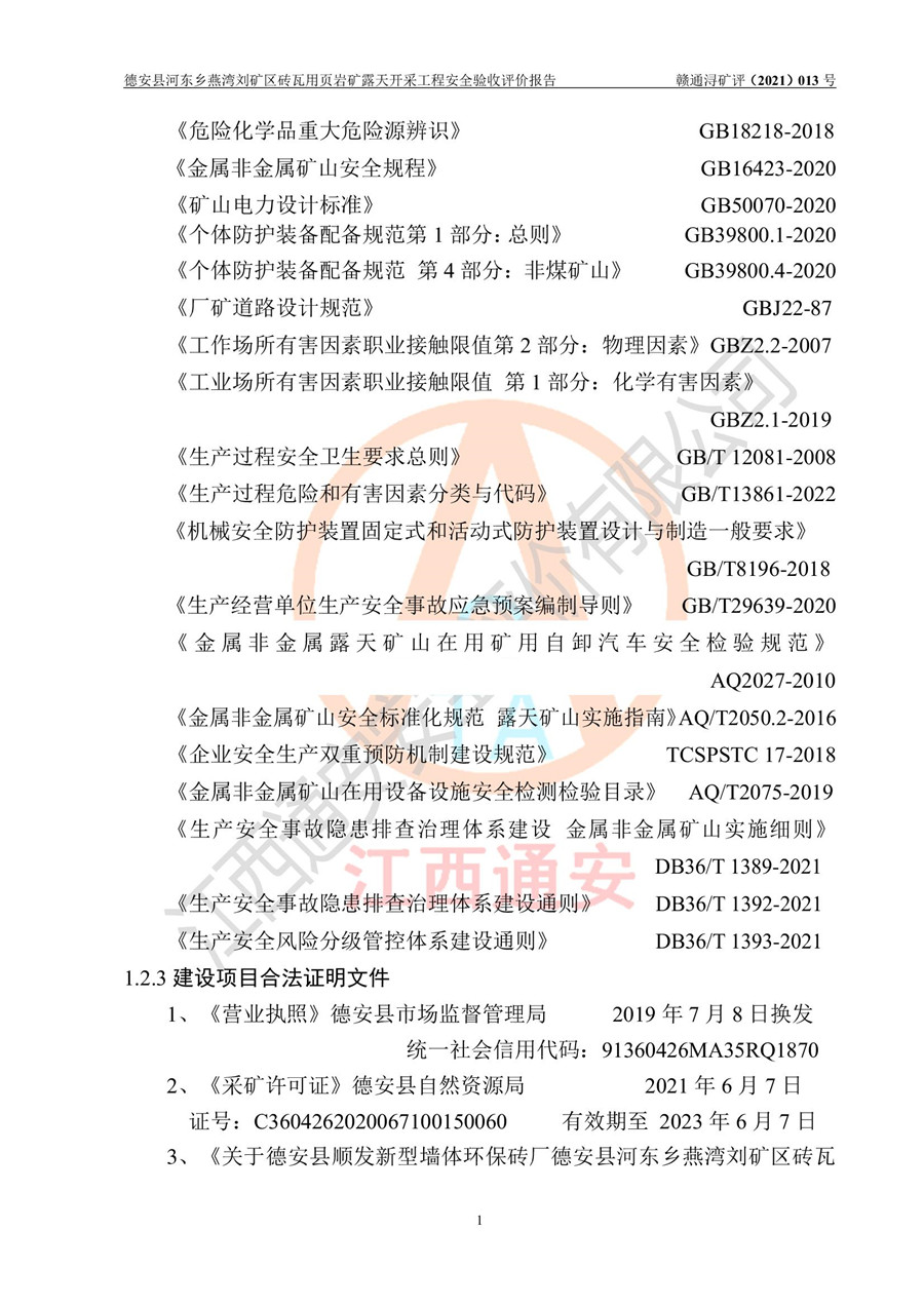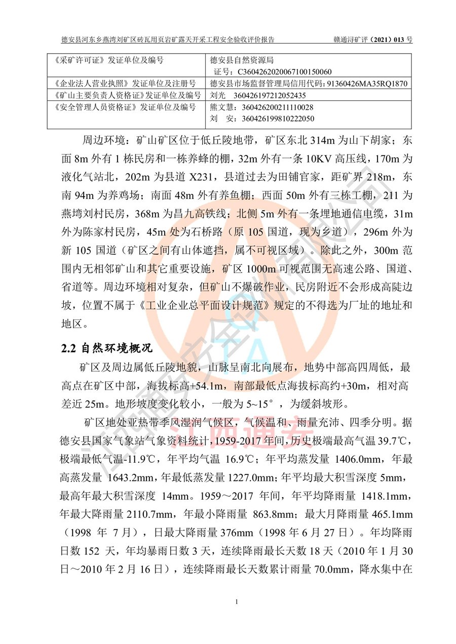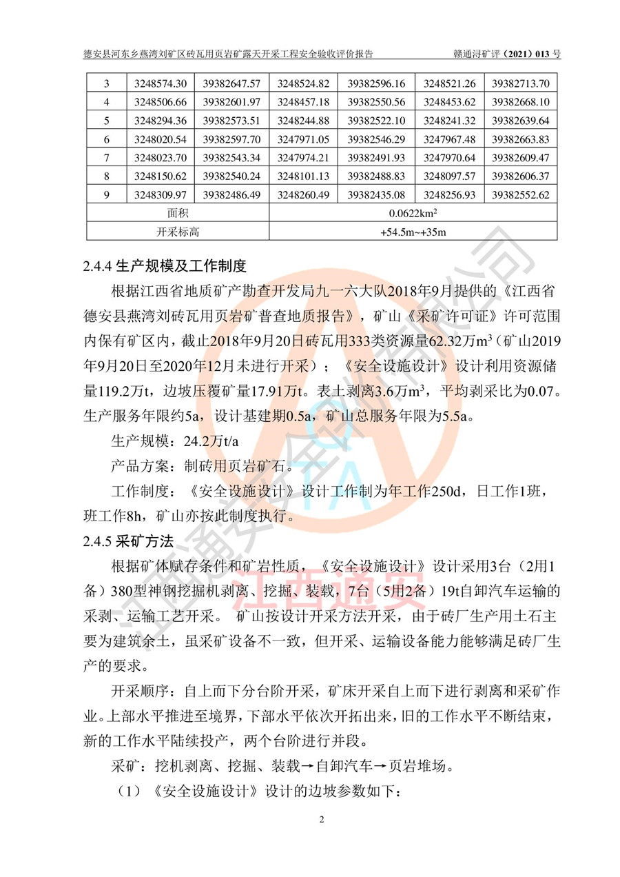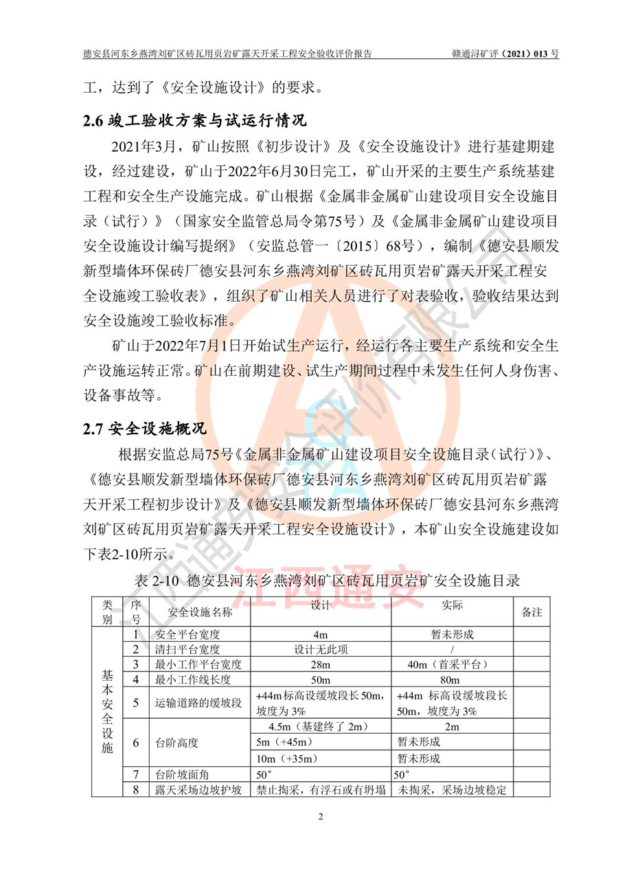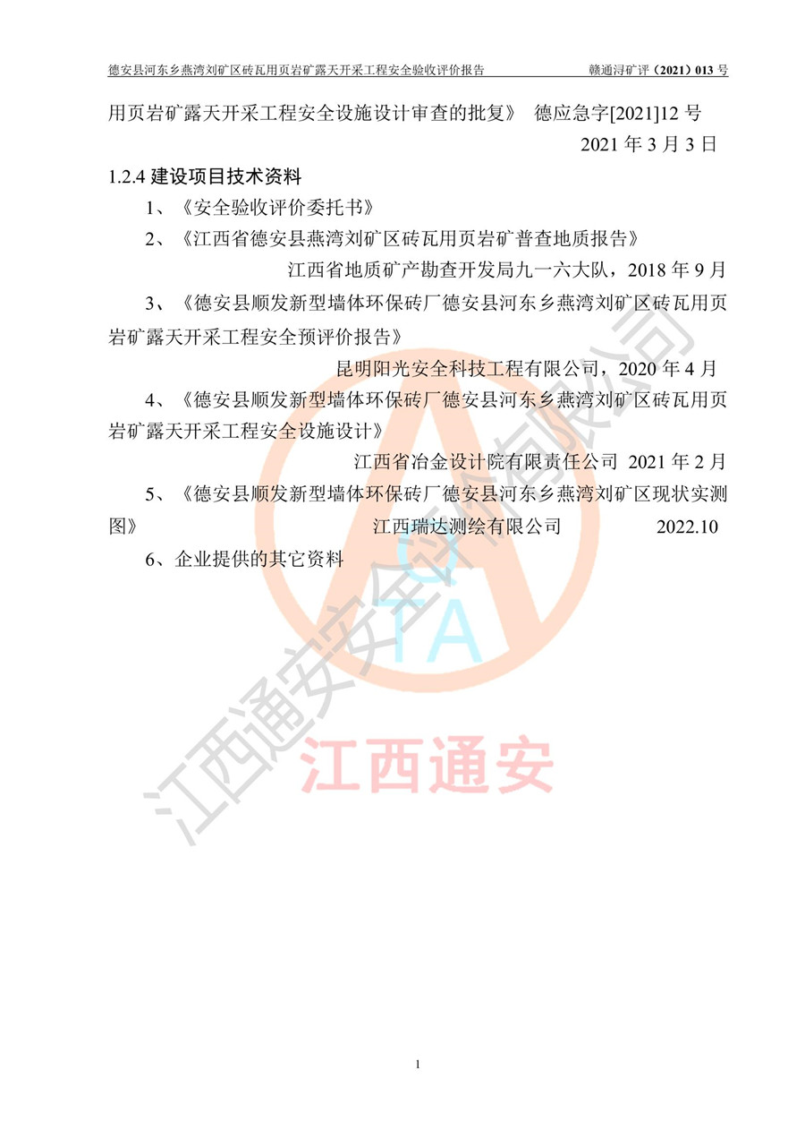 德安縣順發(fā)新型墻體**磚廠成立于2017年3月14日,位于德安縣河?xùn)|鄉(xiāng)后田村1組,為普通合伙企業(yè),執(zhí)行事務(wù)合伙人為劉俊勝,主要從事從事機(jī)制磚生產(chǎn)與銷售等。其下屬礦山——德安縣河?xùn)|鄉(xiāng)燕灣劉礦區(qū)磚瓦用頁巖礦于2018年9由江西省地質(zhì)礦產(chǎn)勘查開發(fā)局九一六大隊(duì)編制了《德安縣河?xùn)|鄉(xiāng)燕灣劉礦區(qū)磚瓦用頁巖礦普查地質(zhì)報(bào)告》,2018年10由九江市鑫晟礦業(yè)有限公司編制了《德安縣河?xùn)|鄉(xiāng)燕灣劉礦區(qū)磚瓦用頁巖礦開發(fā)利用方案》,2020年4月,委托昆明陽光安全科技工程有限公司編制了《德安縣順發(fā)新型墻體**磚廠德安縣河?xùn)|鄉(xiāng)燕灣劉礦區(qū)磚瓦用頁巖礦露天開采工程安全預(yù)評(píng)價(jià)報(bào)告》,2020年6月取得了《采礦許可證》(2021年6月延期),《采礦許可證》核定的礦區(qū)范圍由9個(gè)坐標(biāo)拐點(diǎn)構(gòu)成,礦區(qū)面積為0.0622km2,采掘深度+54.5m~+35m,開采規(guī)模24.2萬t/a。礦山2021年2月由江西省冶金設(shè)計(jì)院有限責(zé)任公司編制了《德安縣順發(fā)新型墻體**磚廠德安縣河?xùn)|鄉(xiāng)燕灣劉礦區(qū)磚瓦用頁巖礦露天開采工程安全設(shè)施設(shè)計(jì)》(以下簡稱《安全設(shè)施設(shè)計(jì)》),《安全設(shè)施設(shè)計(jì)》于2021年3月3日取得了德安縣應(yīng)急管理局審查備案批復(fù)(德應(yīng)急字[2021]12號(hào))。 該礦山為山坡露天礦山,開采制磚用頁巖,基建由礦山自己施工?!栋踩O(shè)施設(shè)計(jì)》設(shè)計(jì)礦山采用公路開拓—汽車運(yùn)輸方式,自上而下由挖掘機(jī)挖掘,分臺(tái)階分階段開采。礦山已按《安全設(shè)施設(shè)計(jì)》進(jìn)行了基建期建設(shè),開拓道路已修至了+50m標(biāo)高首采平臺(tái),完成了+50m標(biāo)高首采平臺(tái)建設(shè),達(dá)到了礦山《初步設(shè)計(jì)》及《安全設(shè)施設(shè)計(jì)》設(shè)計(jì)基建期建設(shè)要求 |