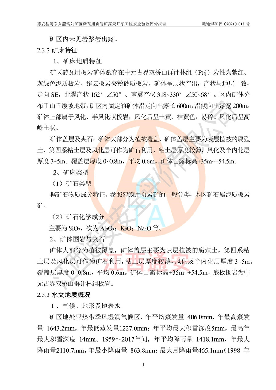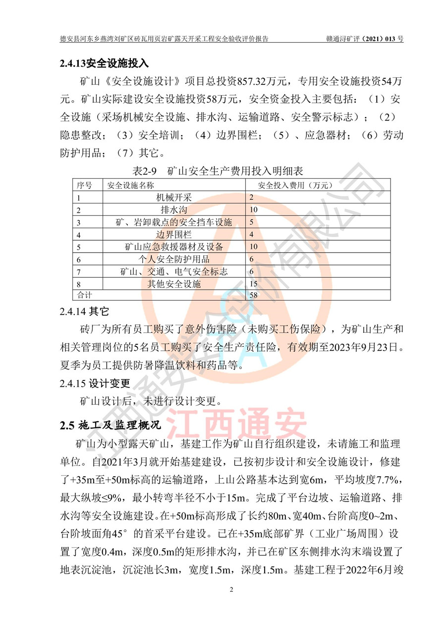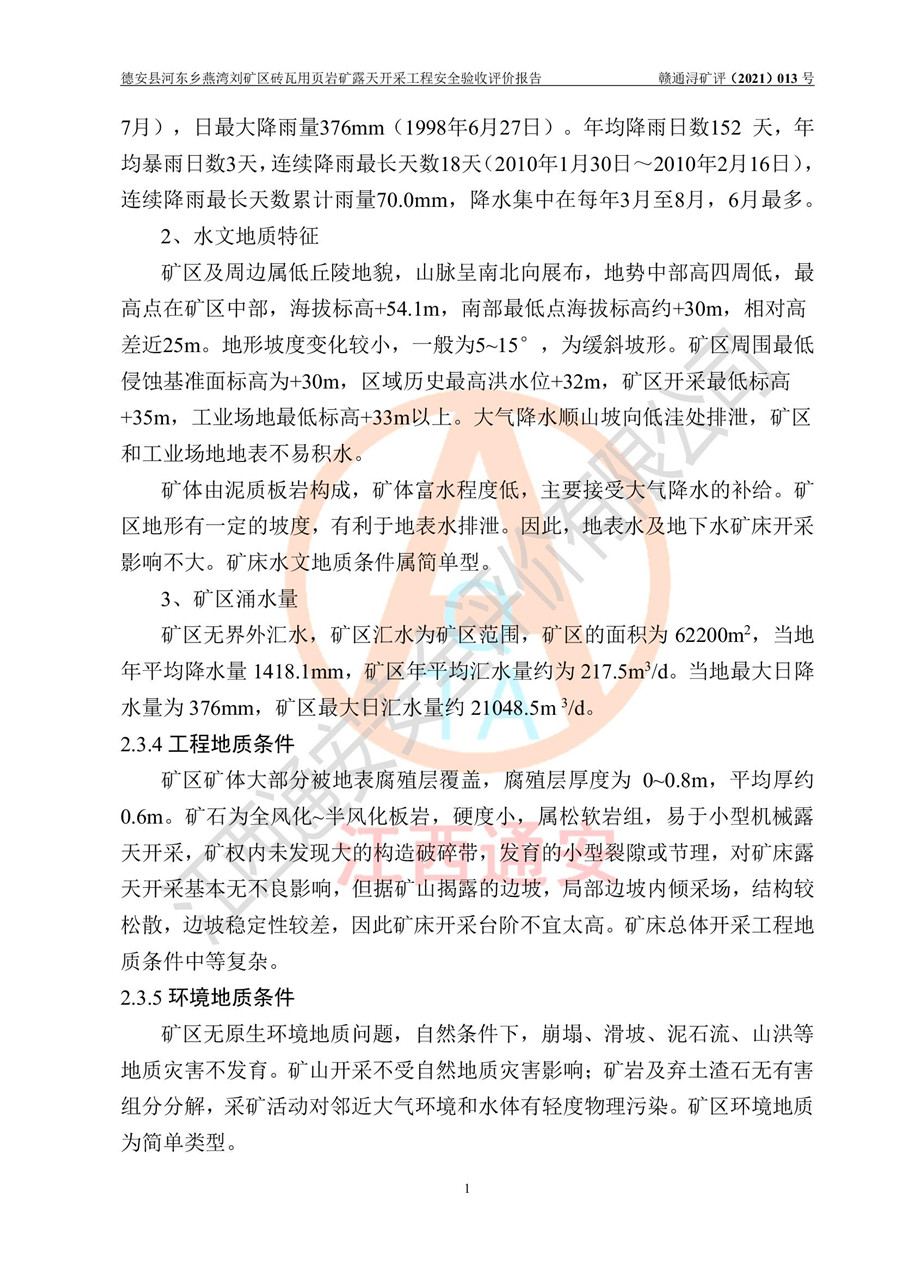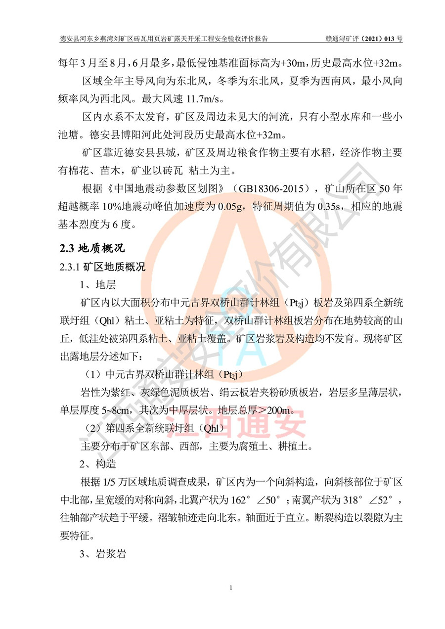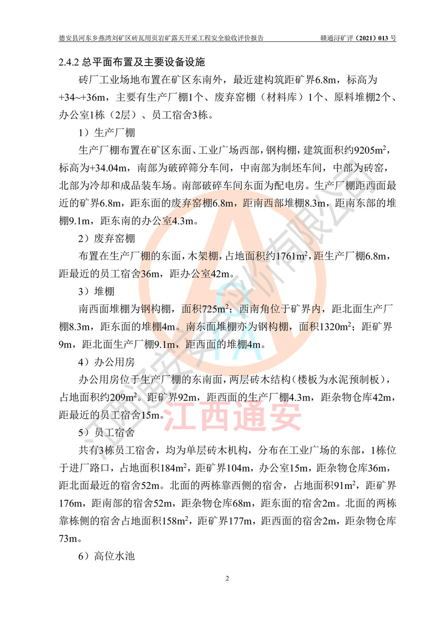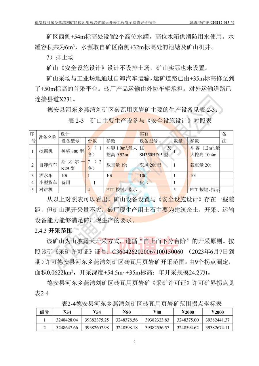 德安縣順發(fā)新型墻體**磚廠成立于2017年3月14日,位于德安縣河?xùn)|鄉(xiāng)后田村1組,為普通合伙企業(yè),執(zhí)行事務(wù)合伙人為劉俊勝,主要從事從事機(jī)制磚生產(chǎn)與銷售等。其下屬礦山——德安縣河?xùn)|鄉(xiāng)燕灣劉礦區(qū)磚瓦用頁巖礦于2018年9由江西省地質(zhì)礦產(chǎn)勘查開發(fā)局九一六大隊(duì)編制了《德安縣河?xùn)|鄉(xiāng)燕灣劉礦區(qū)磚瓦用頁巖礦普查地質(zhì)報(bào)告》,2018年10由九江市鑫晟礦業(yè)有限公司編制了《德安縣河?xùn)|鄉(xiāng)燕灣劉礦區(qū)磚瓦用頁巖礦開發(fā)利用方案》,2020年4月,委托昆明陽光安全科技工程有限公司編制了《德安縣順發(fā)新型墻體**磚廠德安縣河?xùn)|鄉(xiāng)燕灣劉礦區(qū)磚瓦用頁巖礦露天開采工程安全預(yù)評(píng)價(jià)報(bào)告》,2020年6月取得了《采礦許可證》(2021年6月延期),《采礦許可證》核定的礦區(qū)范圍由9個(gè)坐標(biāo)拐點(diǎn)構(gòu)成,礦區(qū)面積為0.0622km2,采掘深度+54.5m~+35m,開采規(guī)模24.2萬t/a。礦山2021年2月由江西省冶金設(shè)計(jì)院有限責(zé)任公司編制了《德安縣順發(fā)新型墻體**磚廠德安縣河?xùn)|鄉(xiāng)燕灣劉礦區(qū)磚瓦用頁巖礦露天開采工程安全設(shè)施設(shè)計(jì)》(以下簡稱《安全設(shè)施設(shè)計(jì)》),《安全設(shè)施設(shè)計(jì)》于2021年3月3日取得了德安縣應(yīng)急管理局審查備案批復(fù)(德應(yīng)急字[2021]12號(hào))。 該礦山為山坡露天礦山,開采制磚用頁巖,基建由礦山自己施工?!栋踩O(shè)施設(shè)計(jì)》設(shè)計(jì)礦山采用公路開拓—汽車運(yùn)輸方式,自上而下由挖掘機(jī)挖掘,分臺(tái)階分階段開采。礦山已按《安全設(shè)施設(shè)計(jì)》進(jìn)行了基建期建設(shè),開拓道路已修至了+50m標(biāo)高首采平臺(tái),完成了+50m標(biāo)高首采平臺(tái)建設(shè),達(dá)到了礦山《初步設(shè)計(jì)》及《安全設(shè)施設(shè)計(jì)》設(shè)計(jì)基建期建設(shè)要求 |