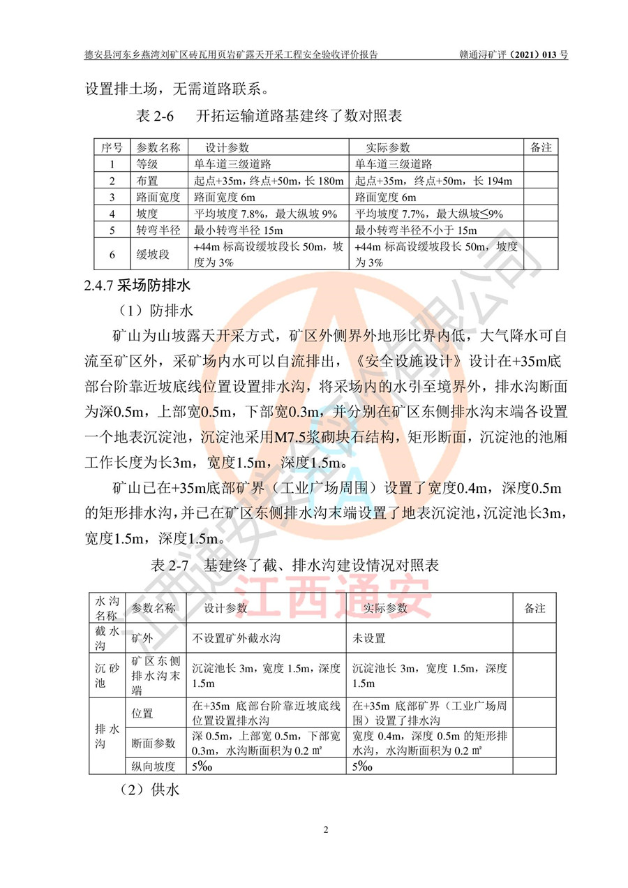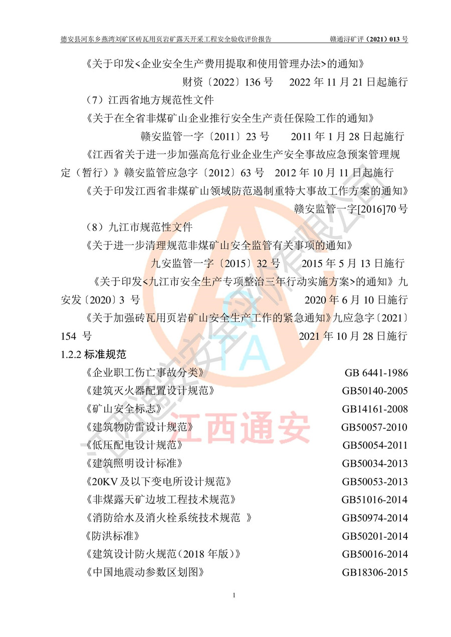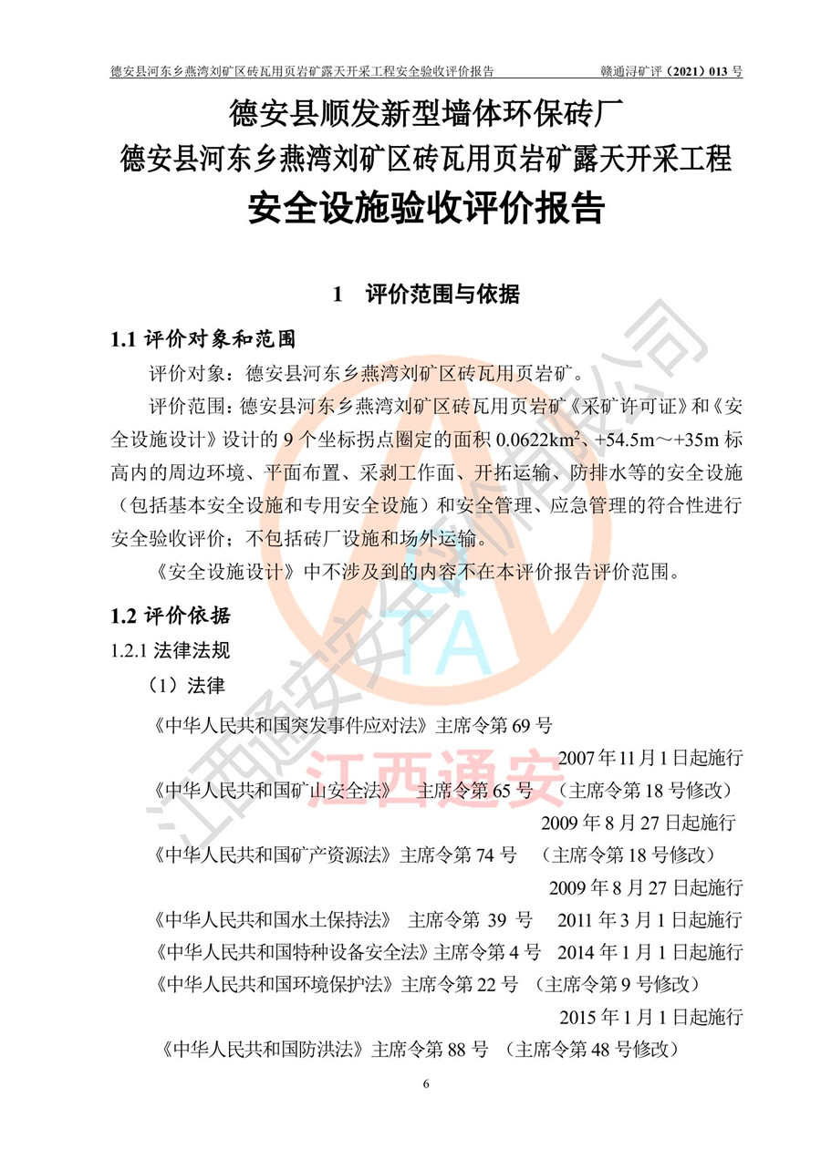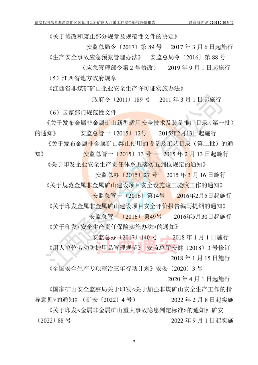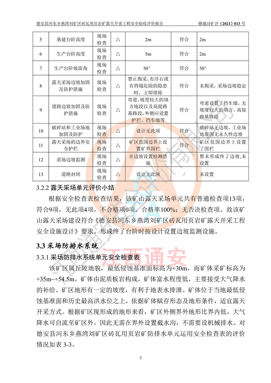 德安縣順發(fā)新型墻體**磚廠成立于2017年3月14日,位于德安縣河?xùn)|鄉(xiāng)后田村1組,為普通合伙企業(yè),執(zhí)行事務(wù)合伙人為劉俊勝,主要從事從事機(jī)制磚生產(chǎn)與銷售等。其下屬礦山——德安縣河?xùn)|鄉(xiāng)燕灣劉礦區(qū)磚瓦用頁巖礦于2018年9由江西省地質(zhì)礦產(chǎn)勘查開發(fā)局九一六大隊(duì)編制了《德安縣河?xùn)|鄉(xiāng)燕灣劉礦區(qū)磚瓦用頁巖礦普查地質(zhì)報(bào)告》,2018年10由九江市鑫晟礦業(yè)有限公司編制了《德安縣河?xùn)|鄉(xiāng)燕灣劉礦區(qū)磚瓦用頁巖礦開發(fā)利用方案》,2020年4月,委托昆明陽光安全科技工程有限公司編制了《德安縣順發(fā)新型墻體**磚廠德安縣河?xùn)|鄉(xiāng)燕灣劉礦區(qū)磚瓦用頁巖礦露天開采工程安全預(yù)評(píng)價(jià)報(bào)告》,2020年6月取得了《采礦許可證》(2021年6月延期),《采礦許可證》核定的礦區(qū)范圍由9個(gè)坐標(biāo)拐點(diǎn)構(gòu)成,礦區(qū)面積為0.0622km2,采掘深度+54.5m~+35m,開采規(guī)模24.2萬t/a。礦山2021年2月由江西省冶金設(shè)計(jì)院有限責(zé)任公司編制了《德安縣順發(fā)新型墻體**磚廠德安縣河?xùn)|鄉(xiāng)燕灣劉礦區(qū)磚瓦用頁巖礦露天開采工程安全設(shè)施設(shè)計(jì)》(以下簡稱《安全設(shè)施設(shè)計(jì)》),《安全設(shè)施設(shè)計(jì)》于2021年3月3日取得了德安縣應(yīng)急管理局審查備案批復(fù)(德應(yīng)急字[2021]12號(hào))。 該礦山為山坡露天礦山,開采制磚用頁巖,基建由礦山自己施工?!栋踩O(shè)施設(shè)計(jì)》設(shè)計(jì)礦山采用公路開拓—汽車運(yùn)輸方式,自上而下由挖掘機(jī)挖掘,分臺(tái)階分階段開采。礦山已按《安全設(shè)施設(shè)計(jì)》進(jìn)行了基建期建設(shè),開拓道路已修至了+50m標(biāo)高首采平臺(tái),完成了+50m標(biāo)高首采平臺(tái)建設(shè),達(dá)到了礦山《初步設(shè)計(jì)》及《安全設(shè)施設(shè)計(jì)》設(shè)計(jì)基建期建設(shè)要求 |
