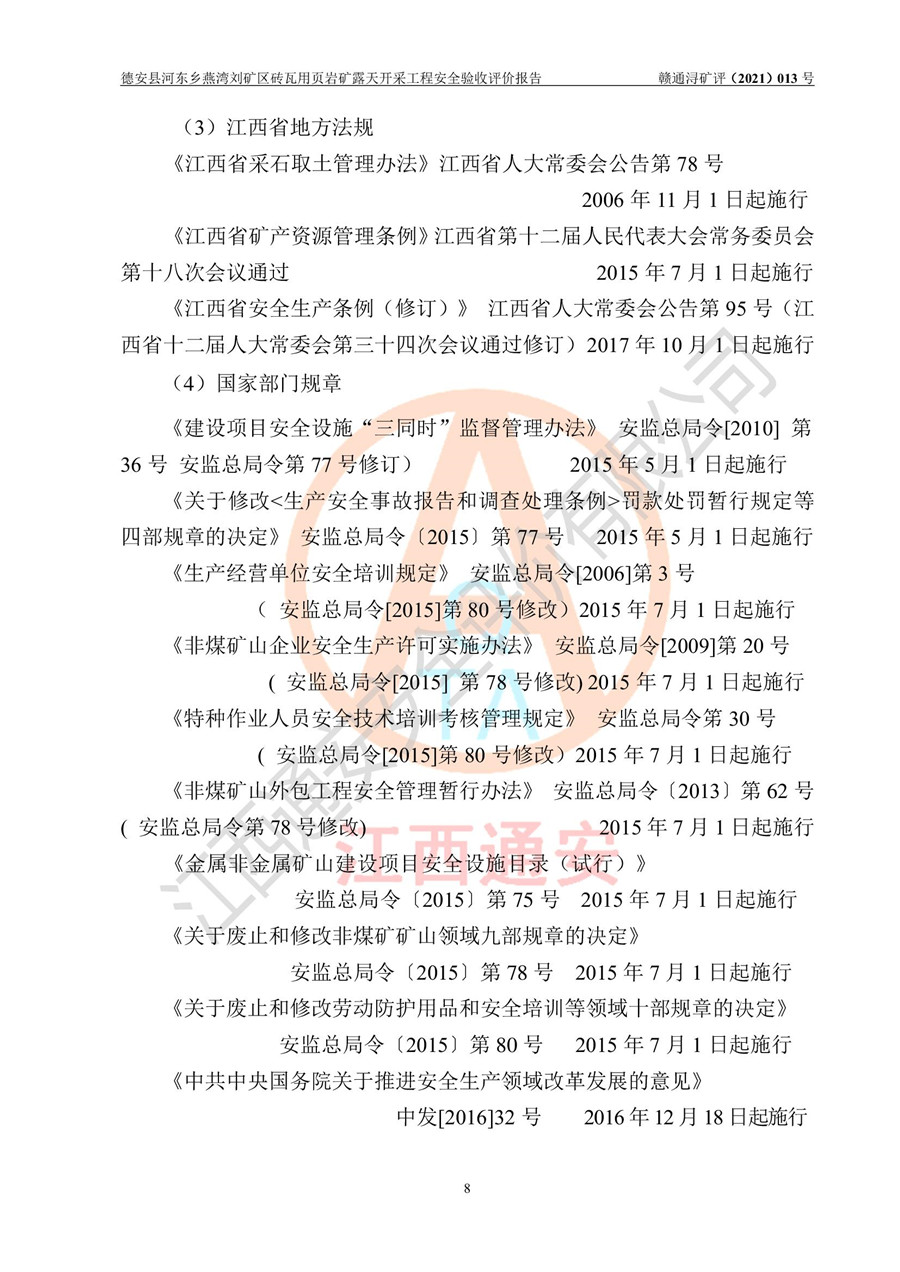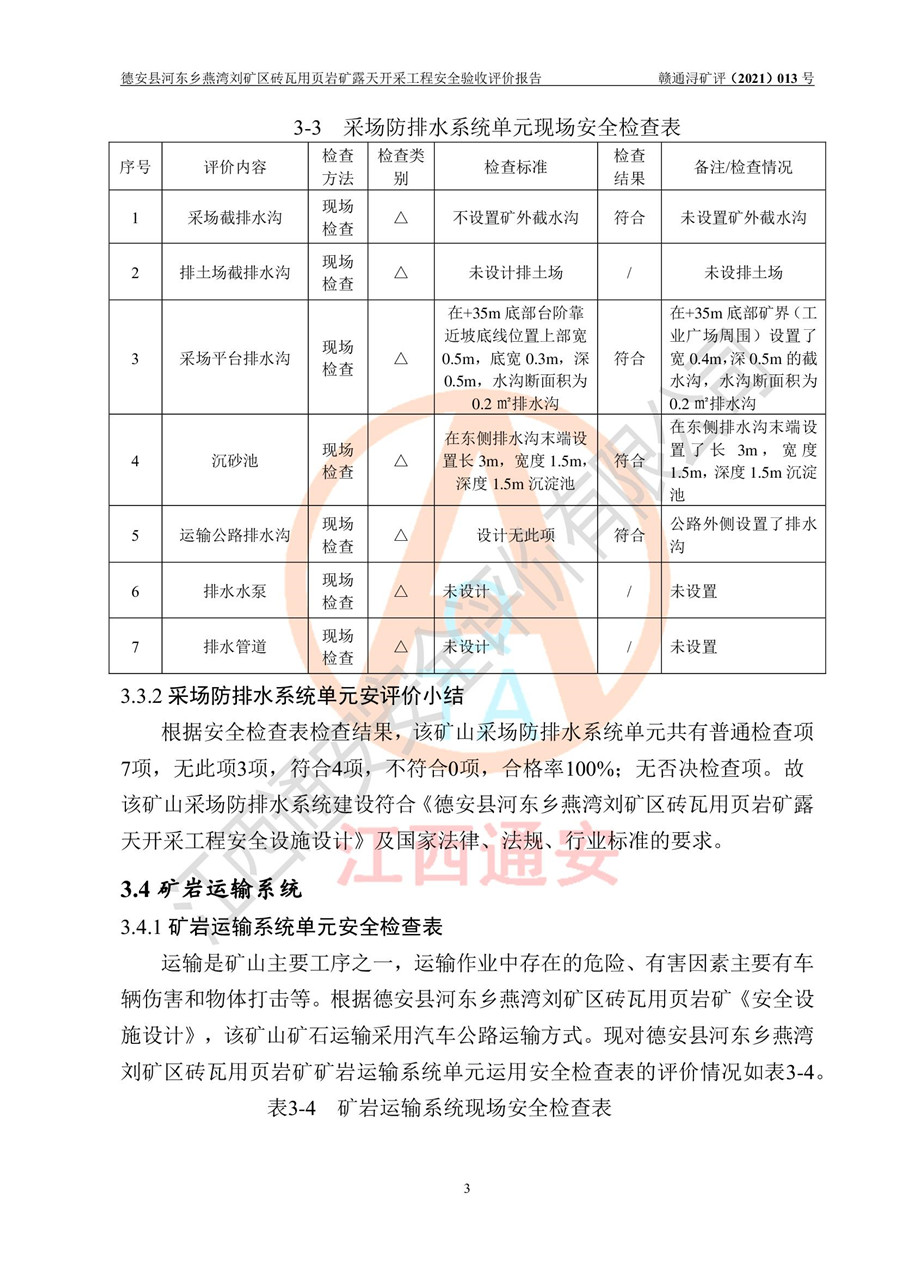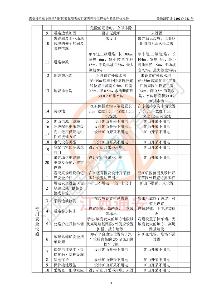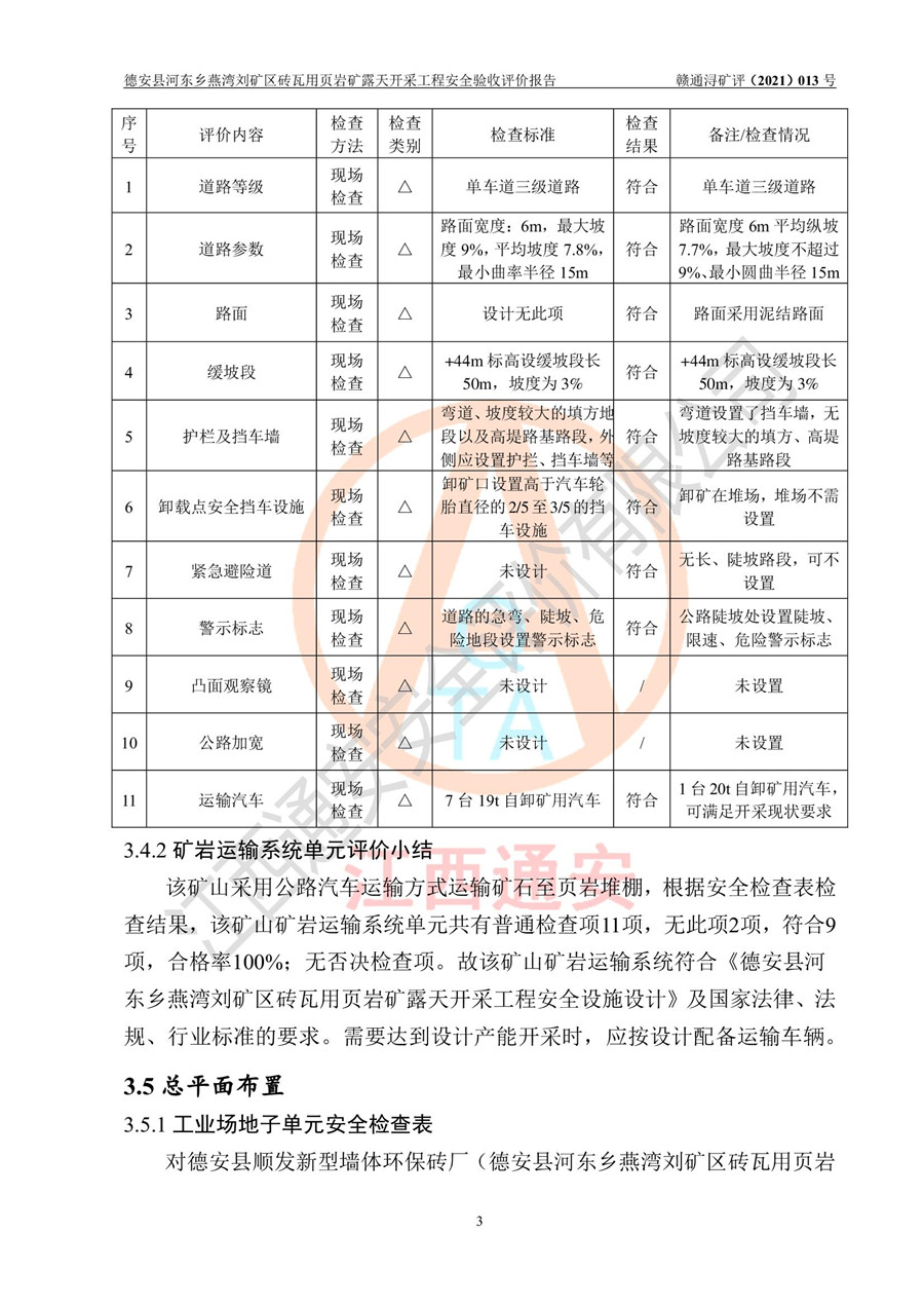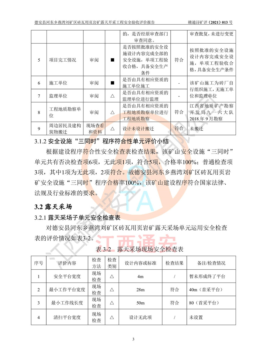 德安縣順發(fā)新型墻體**磚廠成立于2017年3月14日,位于德安縣河?xùn)|鄉(xiāng)后田村1組,為普通合伙企業(yè),執(zhí)行事務(wù)合伙人為劉俊勝,主要從事從事機(jī)制磚生產(chǎn)與銷售等。其下屬礦山——德安縣河?xùn)|鄉(xiāng)燕灣劉礦區(qū)磚瓦用頁巖礦于2018年9由江西省地質(zhì)礦產(chǎn)勘查開發(fā)局九一六大隊(duì)編制了《德安縣河?xùn)|鄉(xiāng)燕灣劉礦區(qū)磚瓦用頁巖礦普查地質(zhì)報(bào)告》,2018年10由九江市鑫晟礦業(yè)有限公司編制了《德安縣河?xùn)|鄉(xiāng)燕灣劉礦區(qū)磚瓦用頁巖礦開發(fā)利用方案》,2020年4月,委托昆明陽光安全科技工程有限公司編制了《德安縣順發(fā)新型墻體**磚廠德安縣河?xùn)|鄉(xiāng)燕灣劉礦區(qū)磚瓦用頁巖礦露天開采工程安全預(yù)評(píng)價(jià)報(bào)告》,2020年6月取得了《采礦許可證》(2021年6月延期),《采礦許可證》核定的礦區(qū)范圍由9個(gè)坐標(biāo)拐點(diǎn)構(gòu)成,礦區(qū)面積為0.0622km2,采掘深度+54.5m~+35m,開采規(guī)模24.2萬t/a。礦山2021年2月由江西省冶金設(shè)計(jì)院有限責(zé)任公司編制了《德安縣順發(fā)新型墻體**磚廠德安縣河?xùn)|鄉(xiāng)燕灣劉礦區(qū)磚瓦用頁巖礦露天開采工程安全設(shè)施設(shè)計(jì)》(以下簡稱《安全設(shè)施設(shè)計(jì)》),《安全設(shè)施設(shè)計(jì)》于2021年3月3日取得了德安縣應(yīng)急管理局審查備案批復(fù)(德應(yīng)急字[2021]12號(hào))。 該礦山為山坡露天礦山,開采制磚用頁巖,基建由礦山自己施工?!栋踩O(shè)施設(shè)計(jì)》設(shè)計(jì)礦山采用公路開拓—汽車運(yùn)輸方式,自上而下由挖掘機(jī)挖掘,分臺(tái)階分階段開采。礦山已按《安全設(shè)施設(shè)計(jì)》進(jìn)行了基建期建設(shè),開拓道路已修至了+50m標(biāo)高首采平臺(tái),完成了+50m標(biāo)高首采平臺(tái)建設(shè),達(dá)到了礦山《初步設(shè)計(jì)》及《安全設(shè)施設(shè)計(jì)》設(shè)計(jì)基建期建設(shè)要求 |